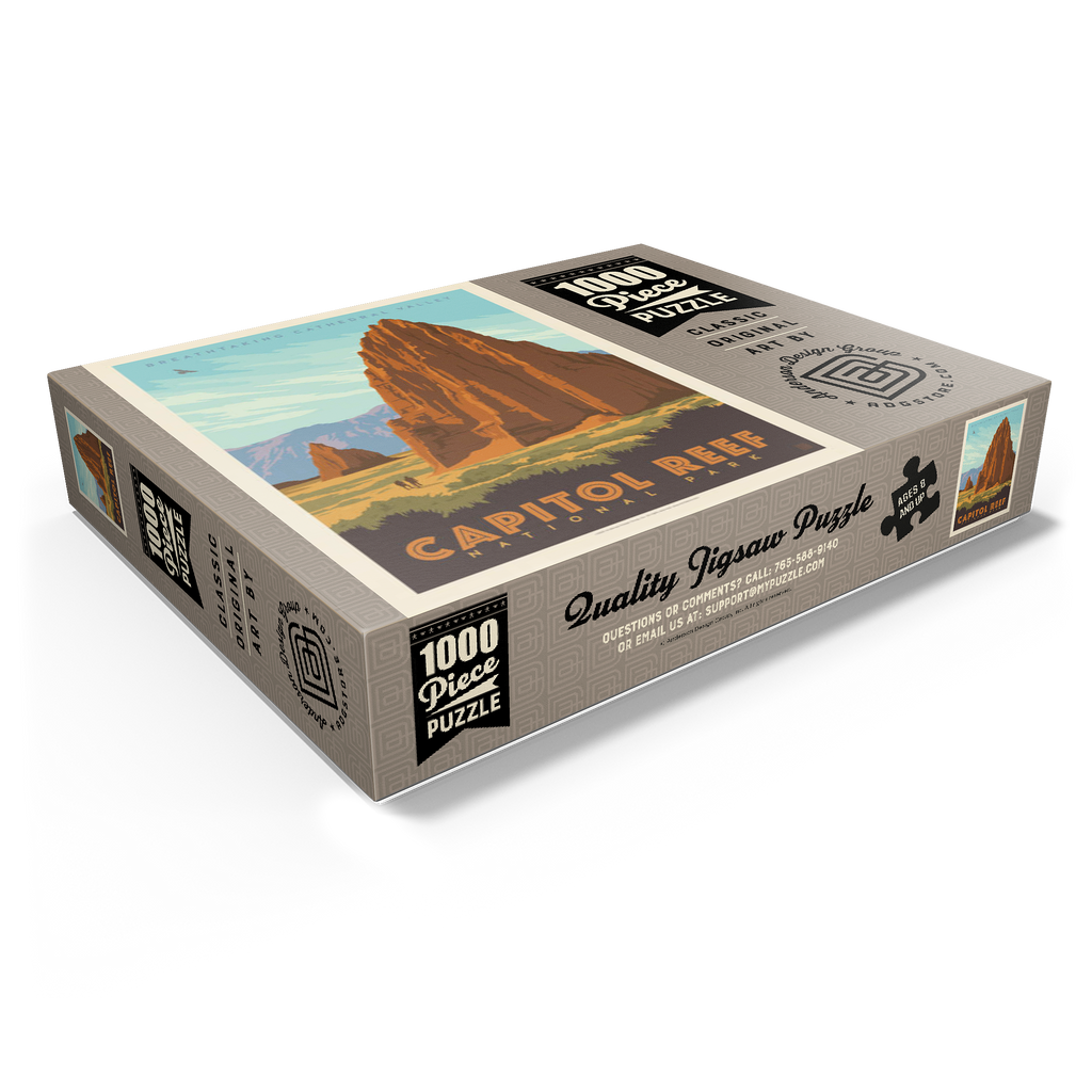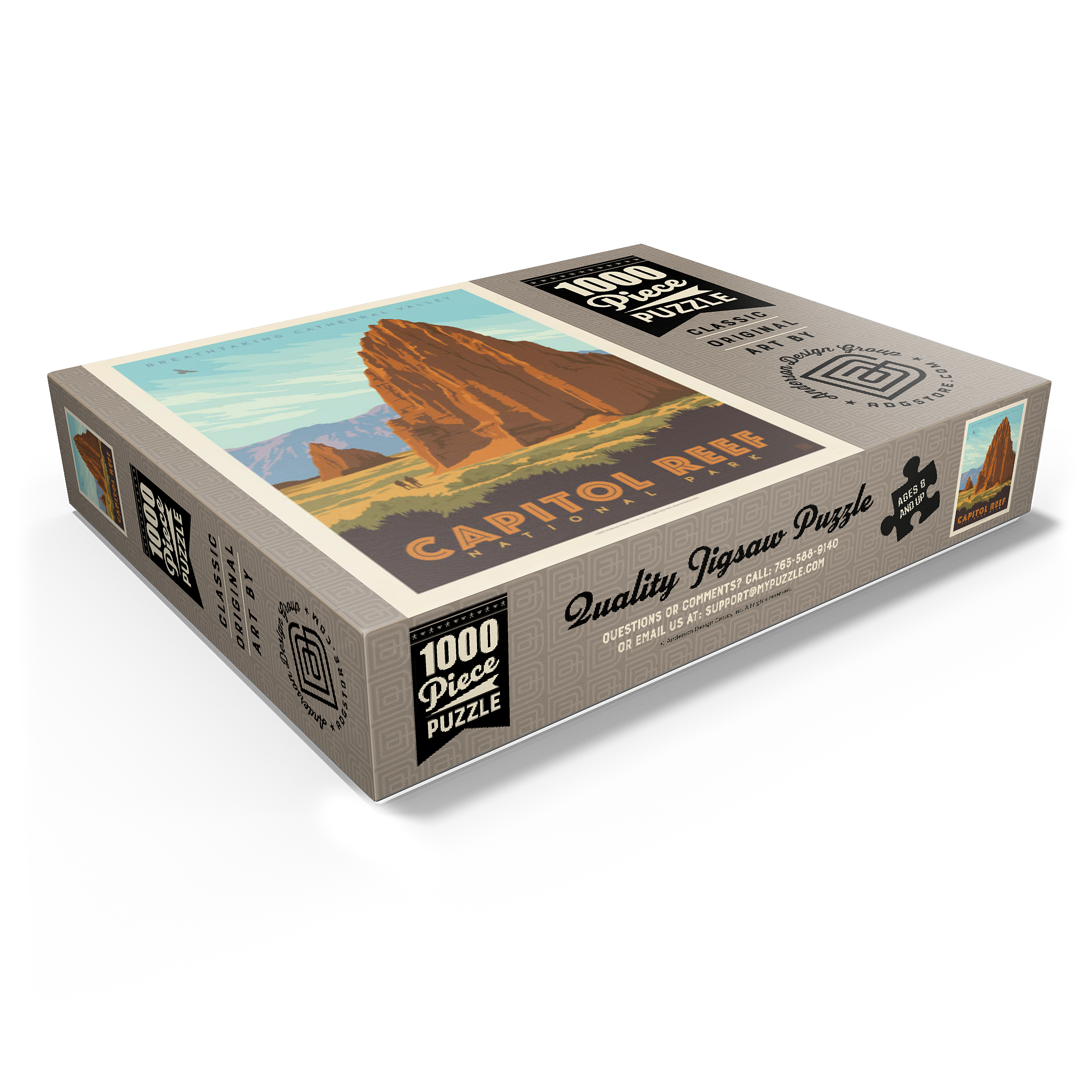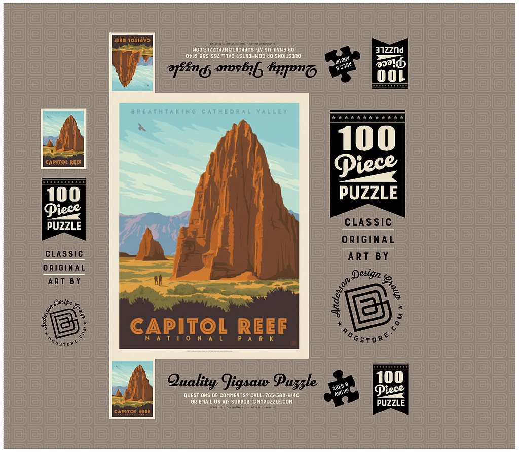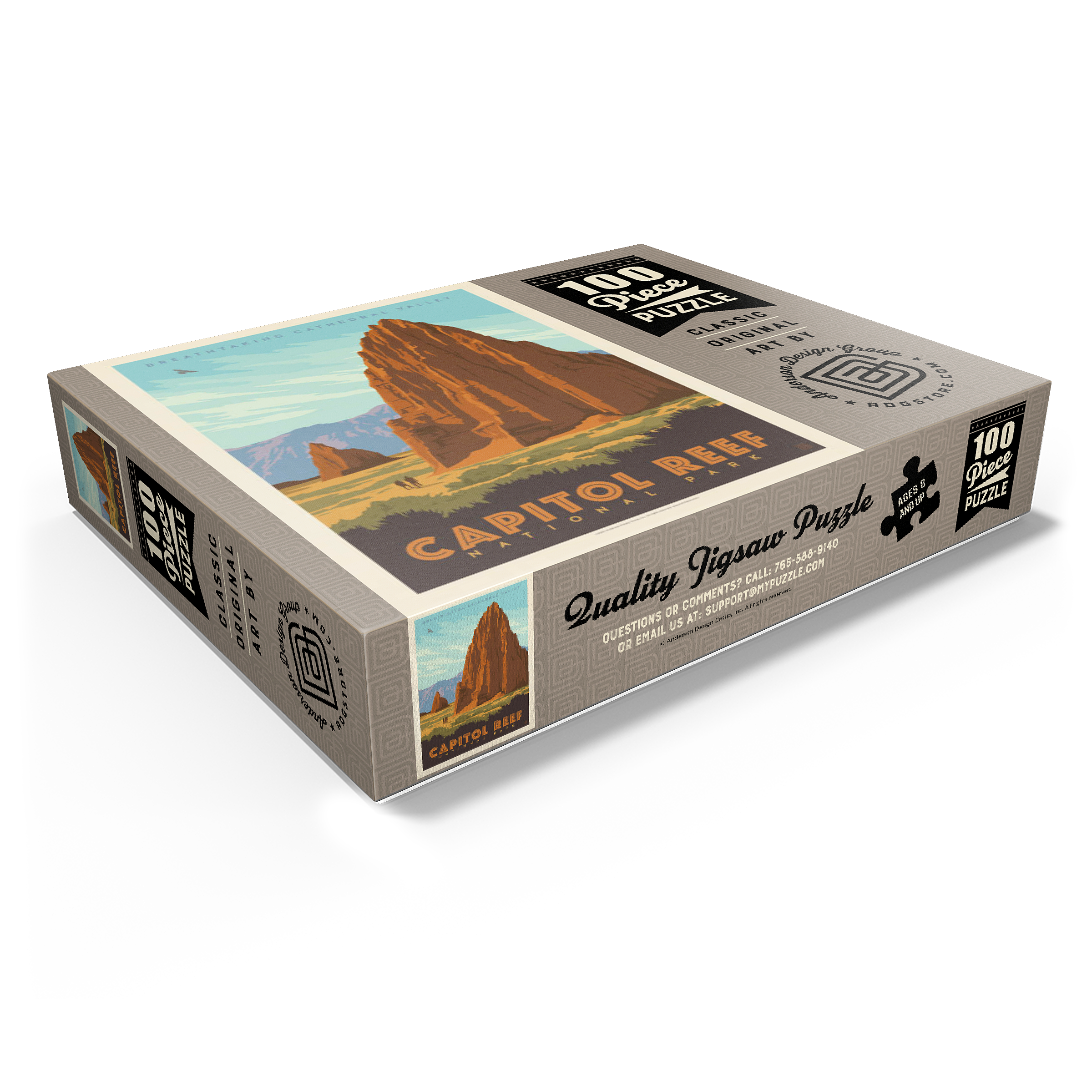 Cathedral Valley in Capitol Reef National Park, Utah, features towering monolithic sandstone formations that rise dramatically from the desert floor. This stylized depiction captures the iconic Temple of the Sun and Temple of the Moon under a wide blue sky, with two hikers walking through the vast, open landscape. The scene highlights the valley's stark beauty, sculpted by erosion and time, and showcases the remote grandeur that defines Capitol Reef. Known for its geologic wonders, solitude, and panoramic desert views, Cathedral Valley is a must-visit for adventurers and photographers drawn to Utah's rugged red rock country.