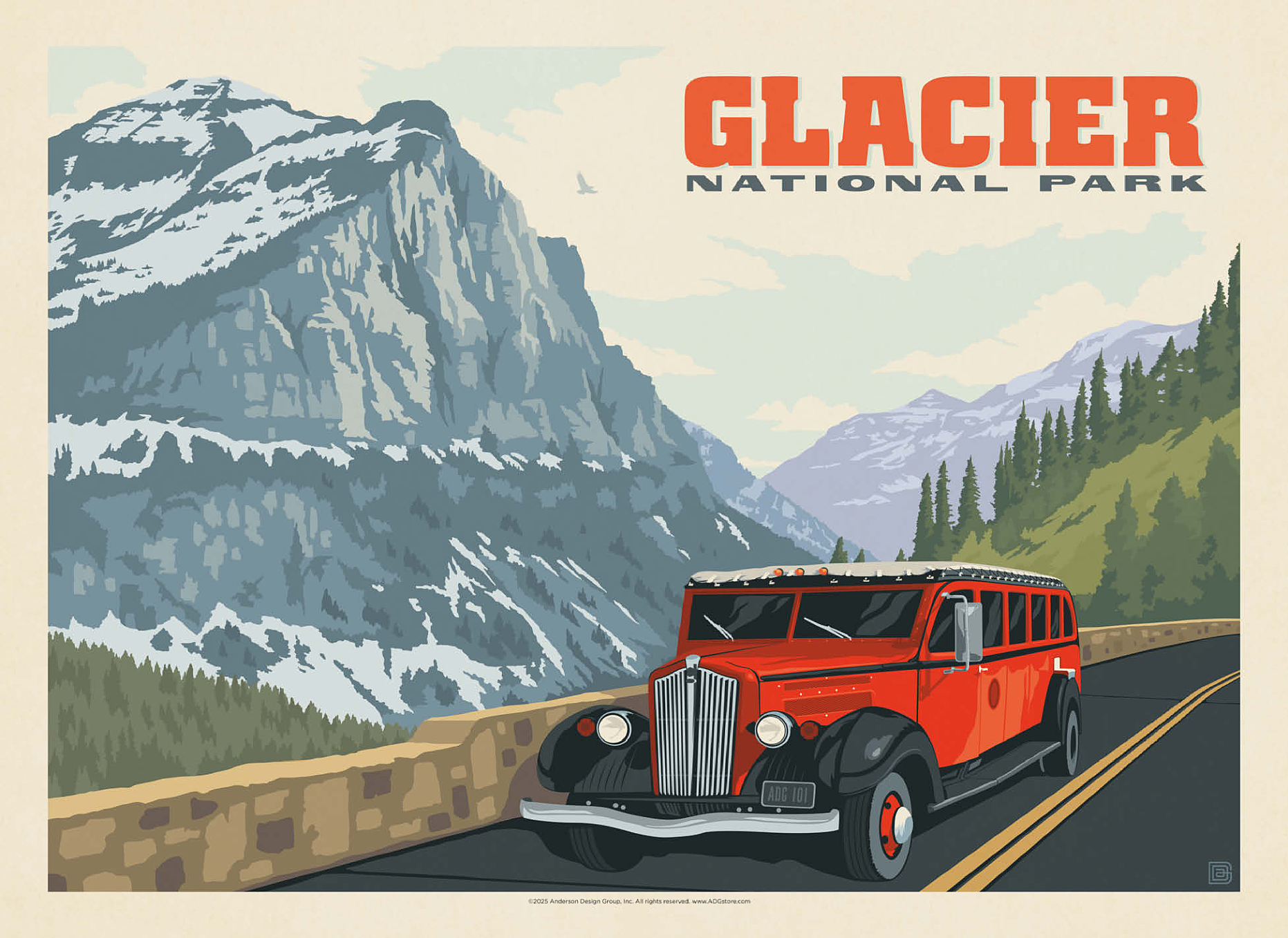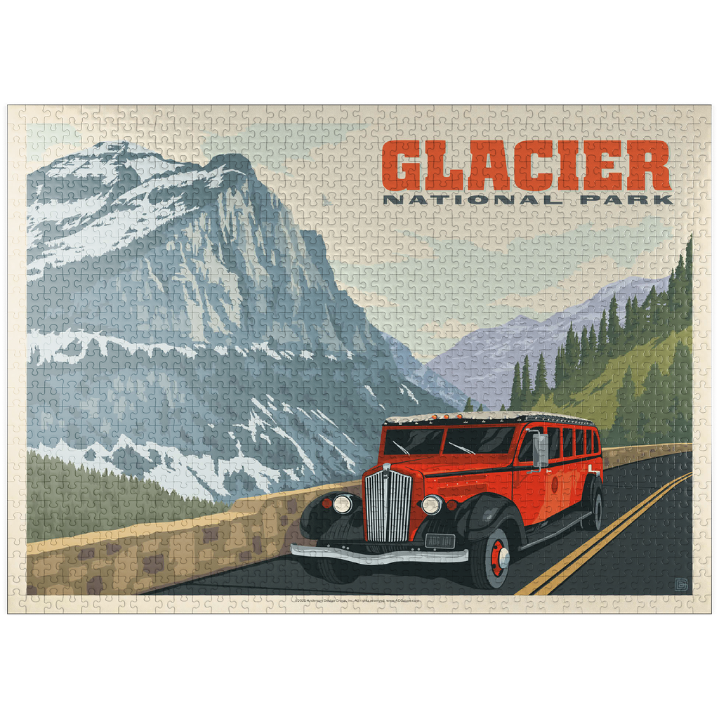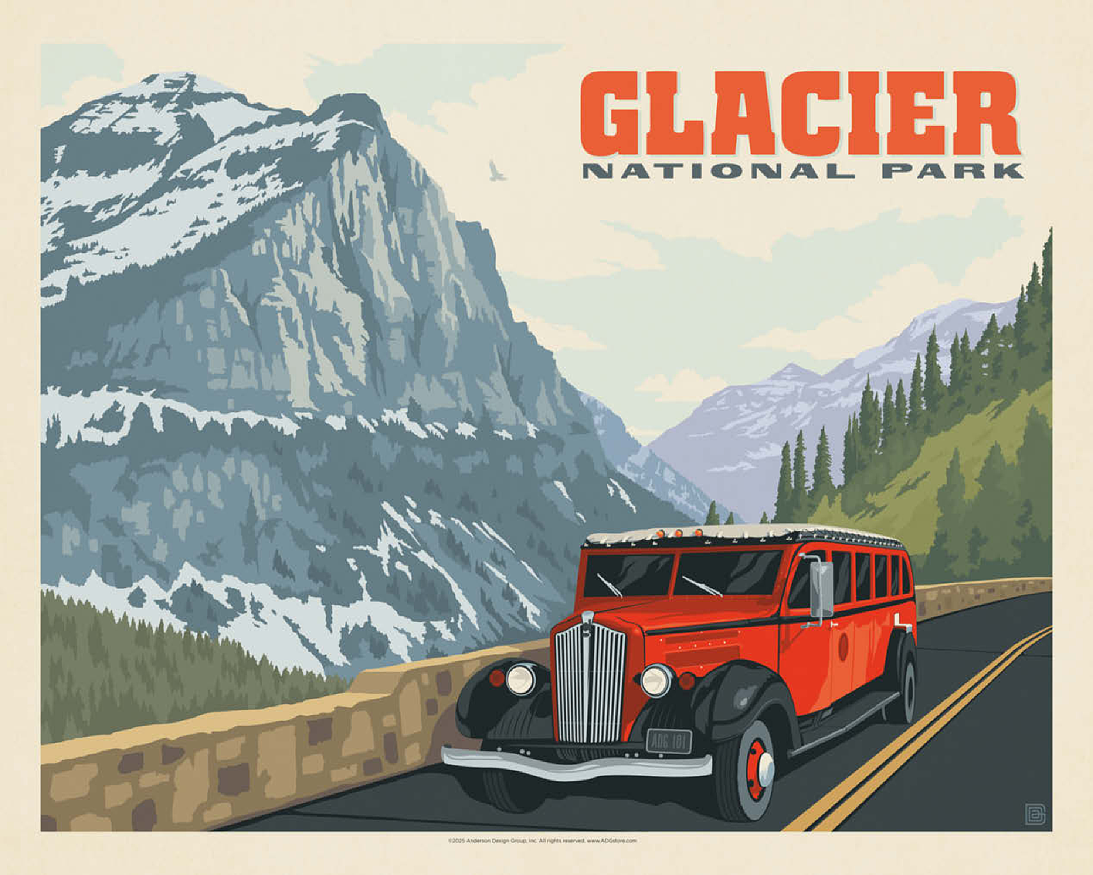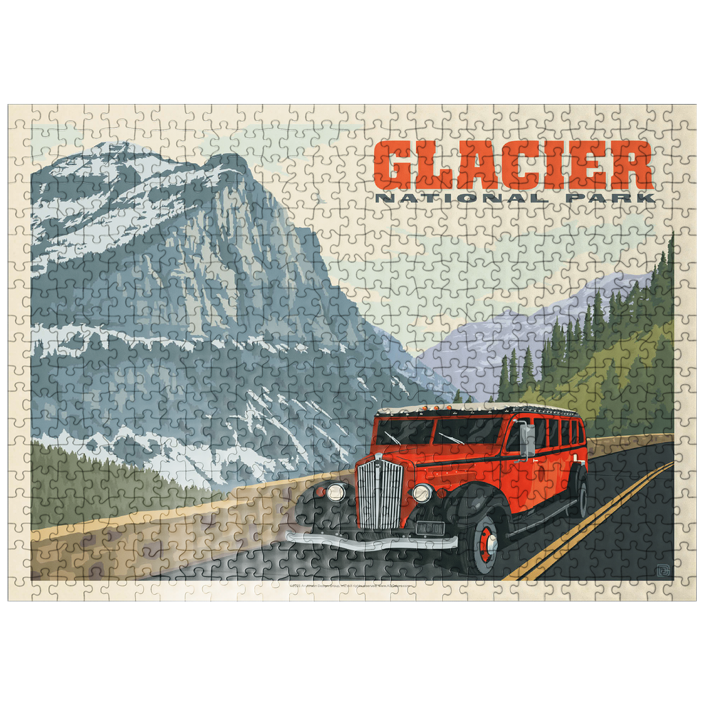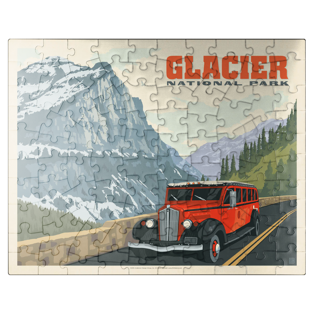 Glacier National Park in Montana is known for its towering peaks, pristine wilderness, and alpine scenery, with the iconic red tour buses offering a classic experience. This artwork shows a red bus on the Going-to-the-Sun Road, framed by snow-capped mountains and forested valleys. Called the Crown of the Continent, the park spans over a million acres of lakes, waterfalls, meadows, and wildlife. The red buses, known as Jammers, have carried visitors since the 1930s and remain a beloved tradition on its winding mountain roads.
