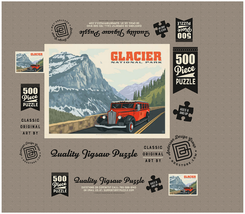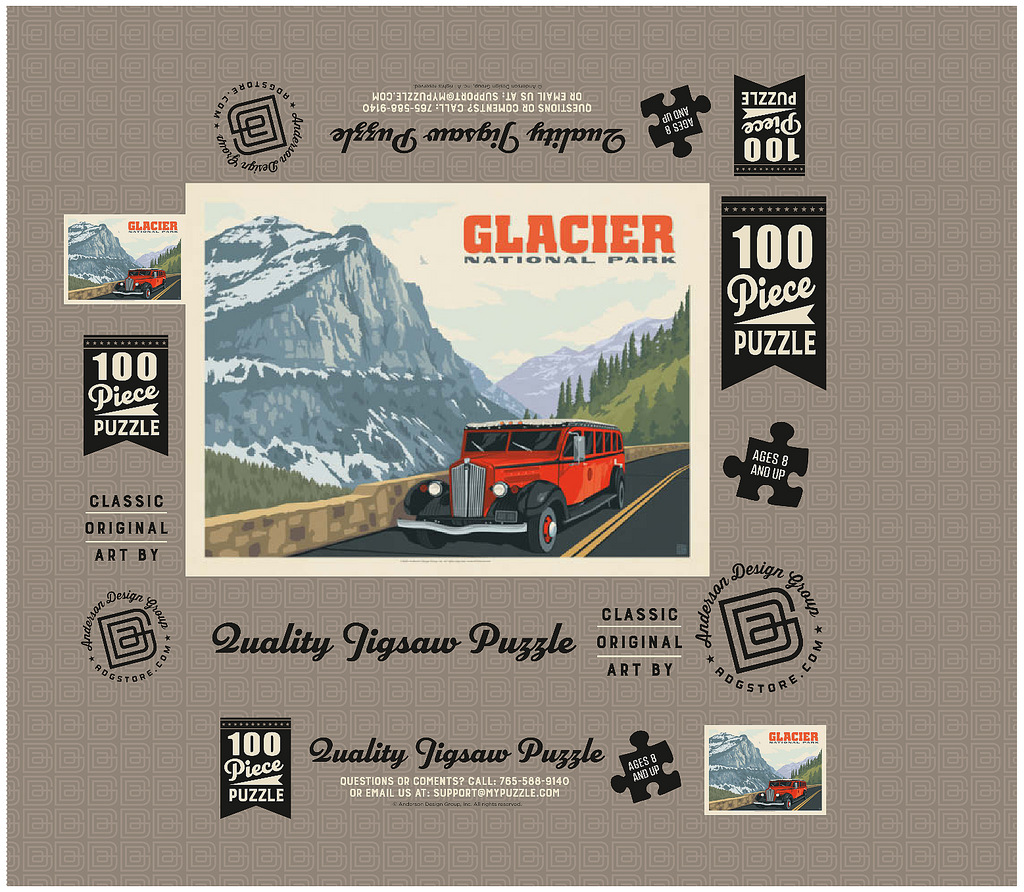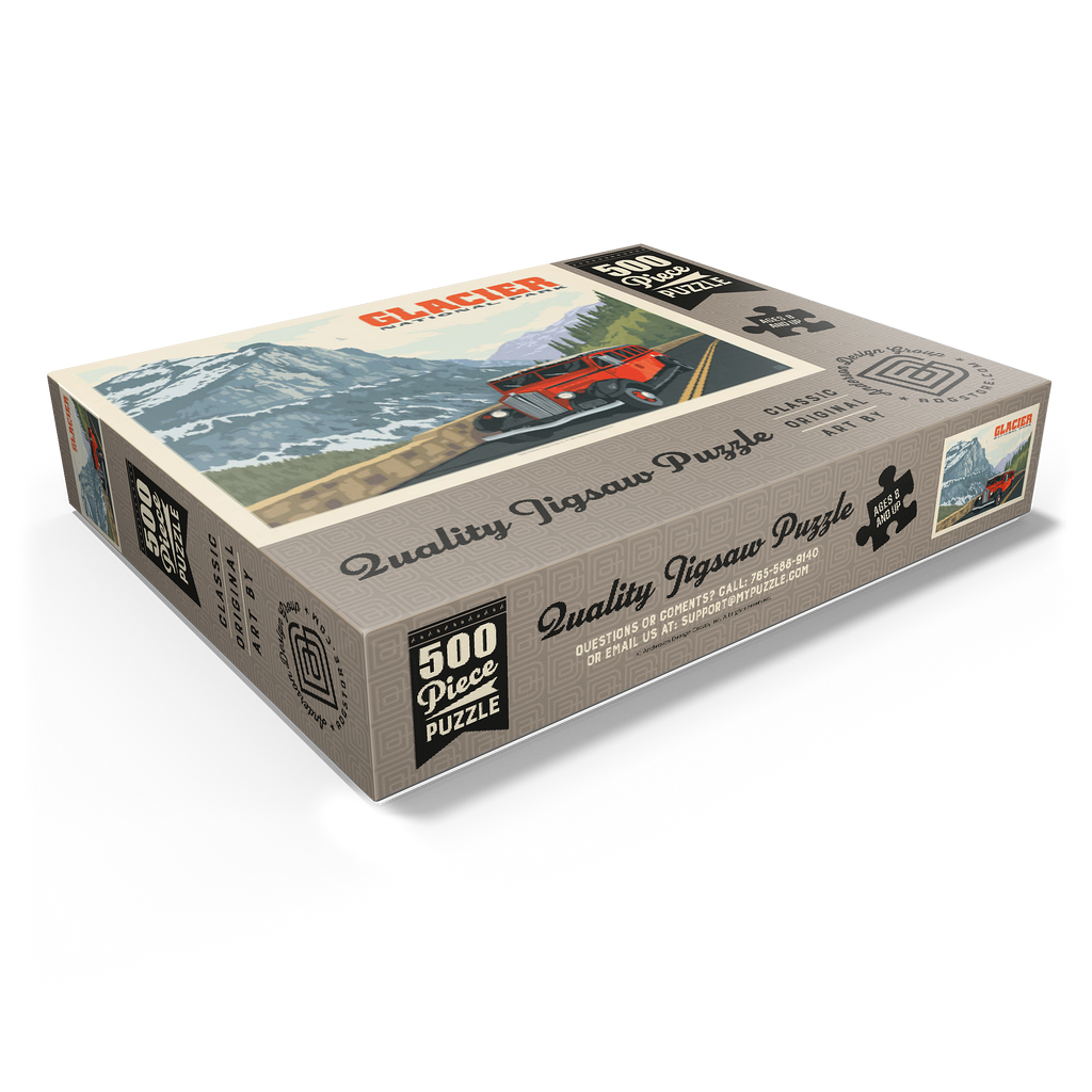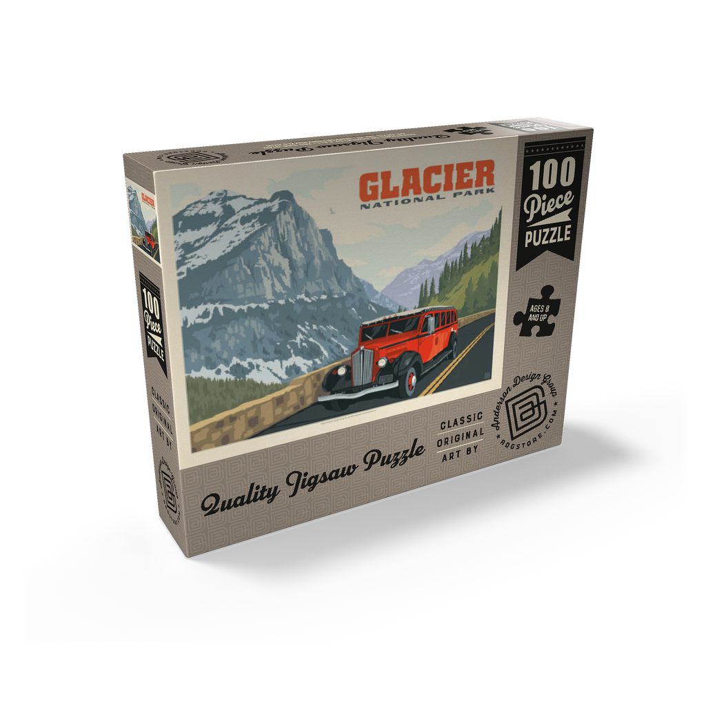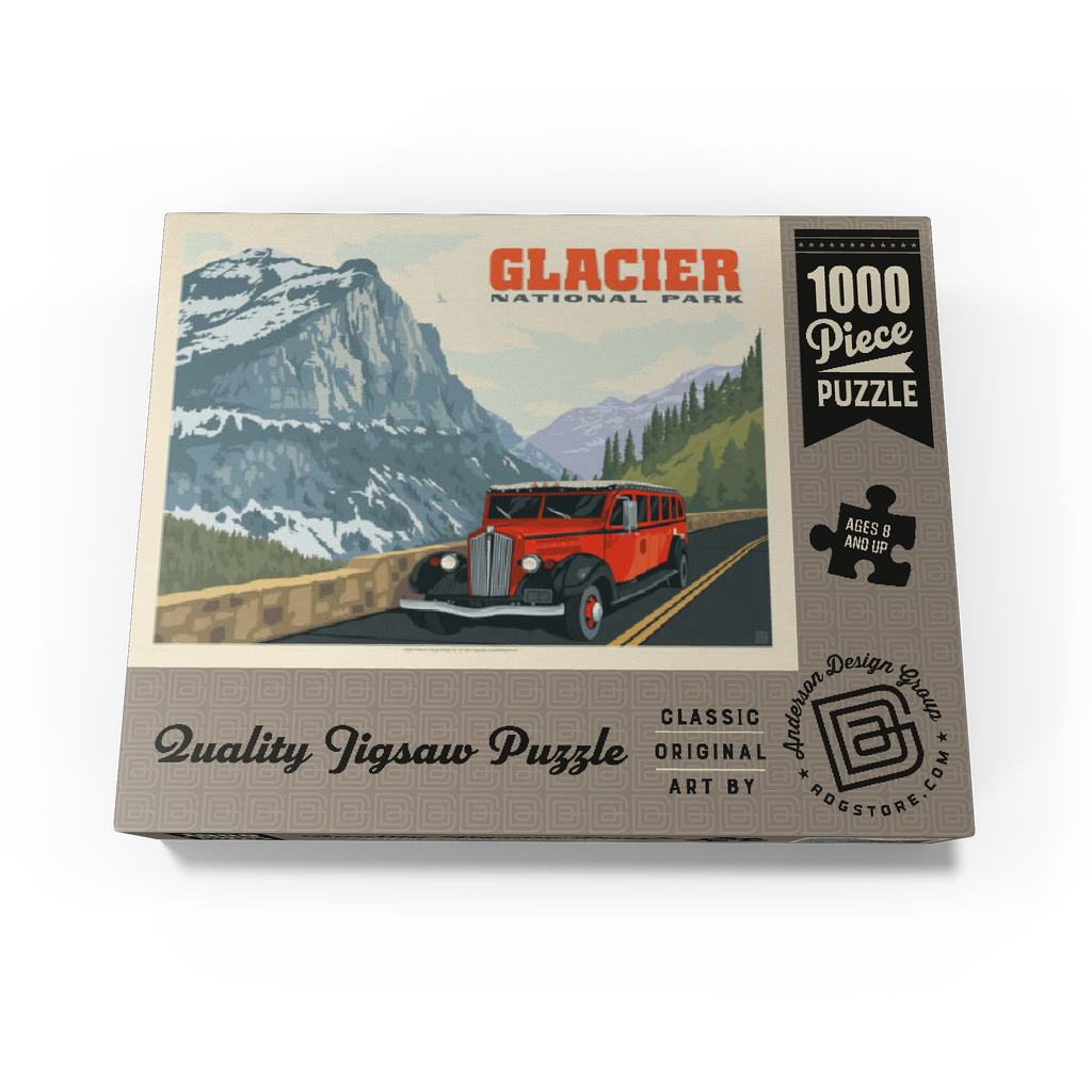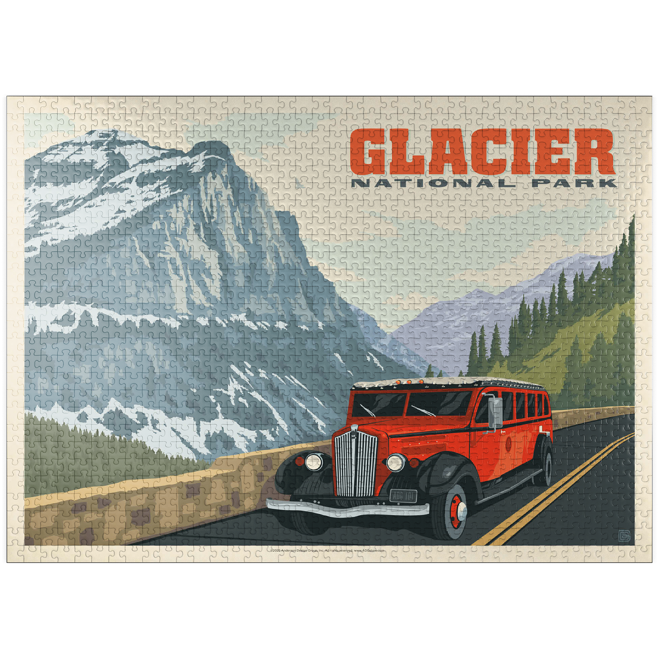 Glacier National Park in Montana is known for its towering peaks, pristine wilderness, and alpine scenery, with the iconic red tour buses offering a classic experience. This artwork shows a red bus on the Going-to-the-Sun Road, framed by snow-capped mountains and forested valleys. Called the Crown of the Continent, the park spans over a million acres of lakes, waterfalls, meadows, and wildlife. The red buses, known as Jammers, have carried visitors since the 1930s and remain a beloved tradition on its winding mountain roads.