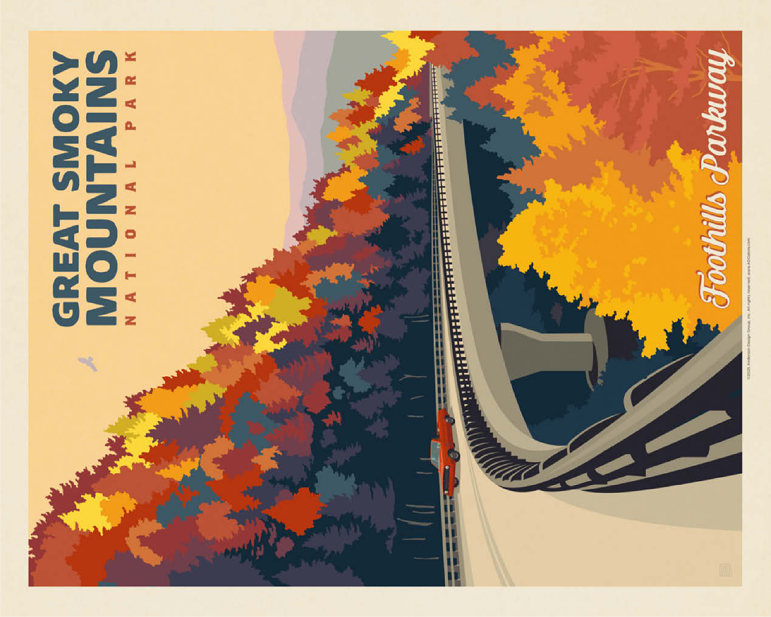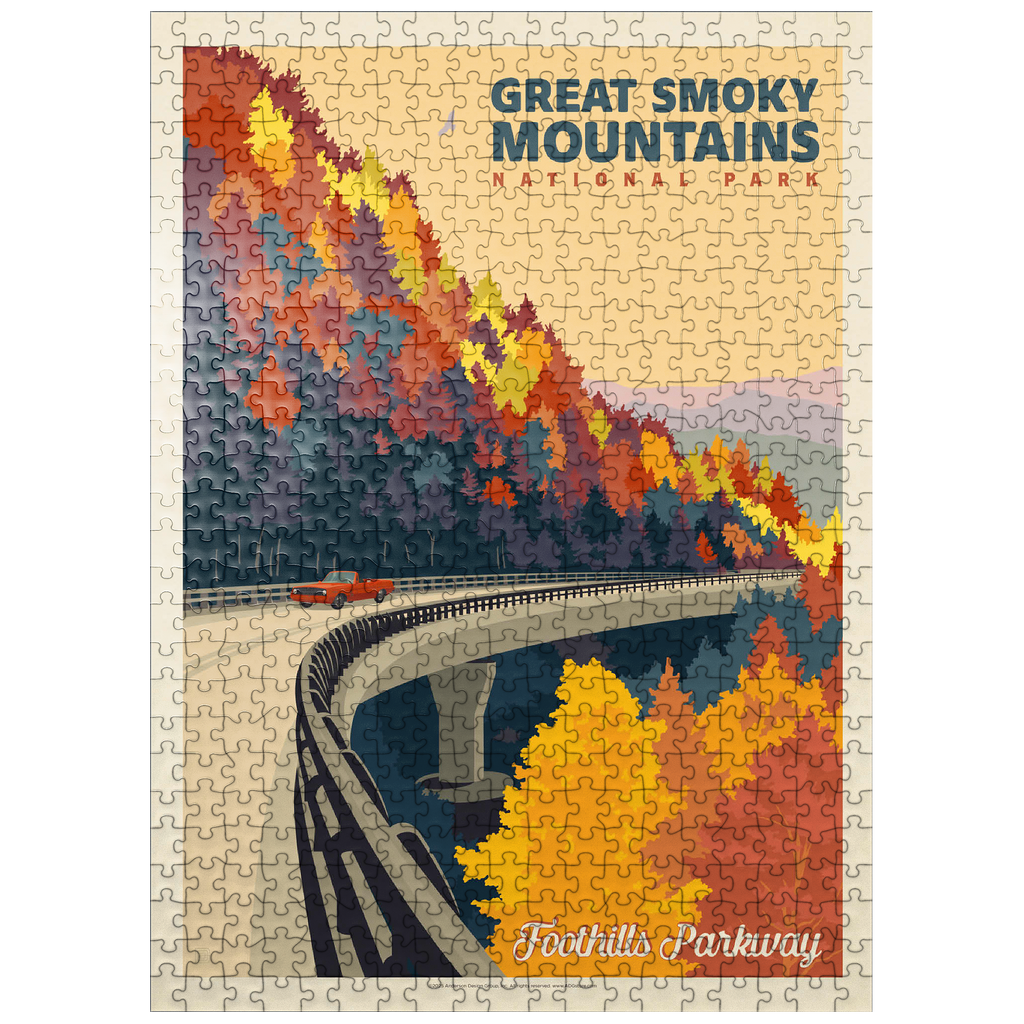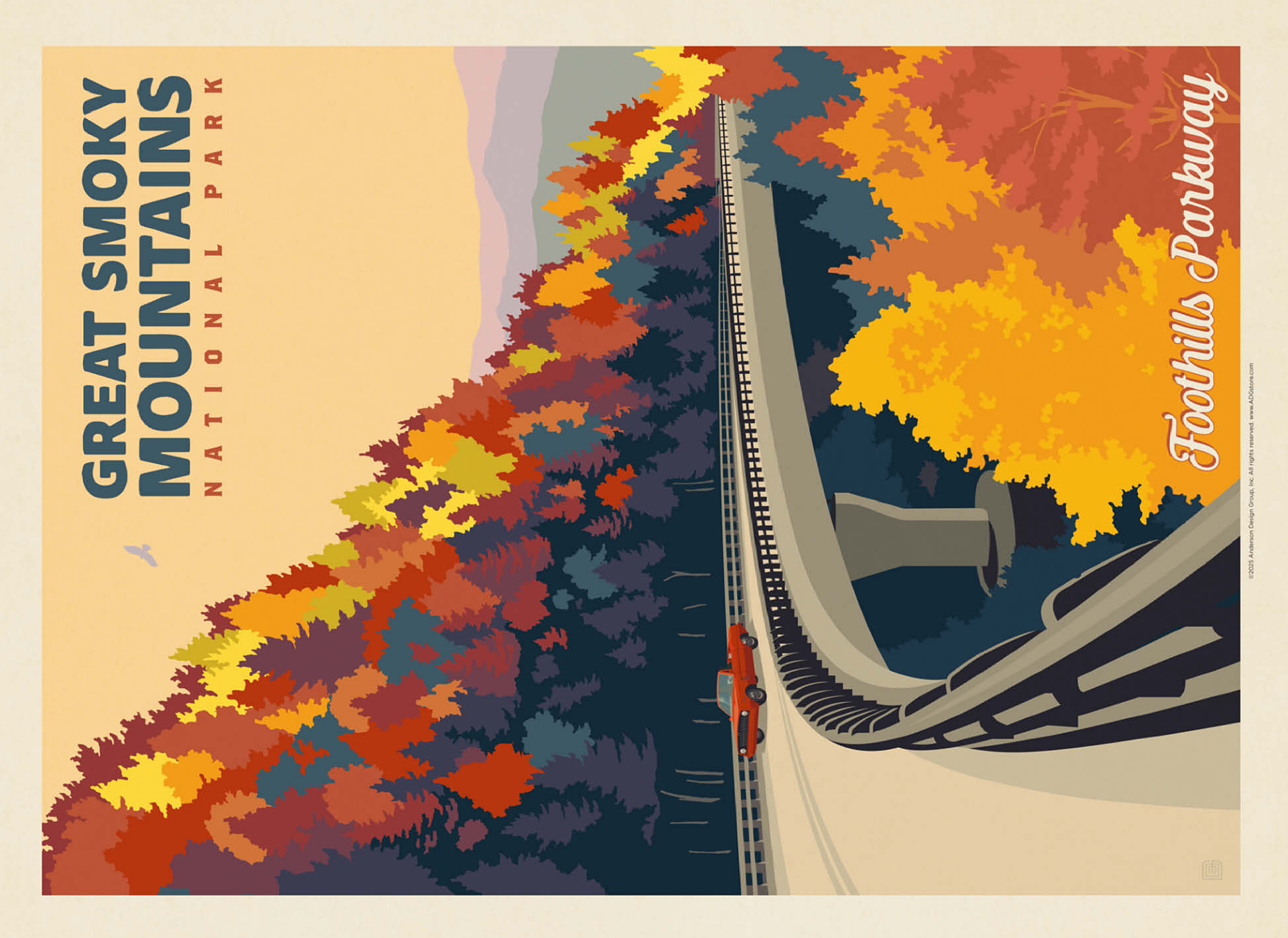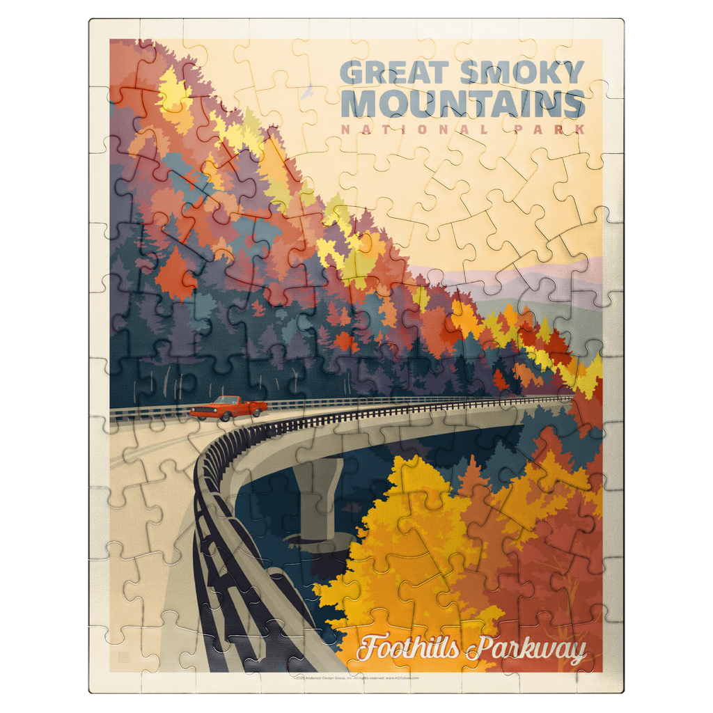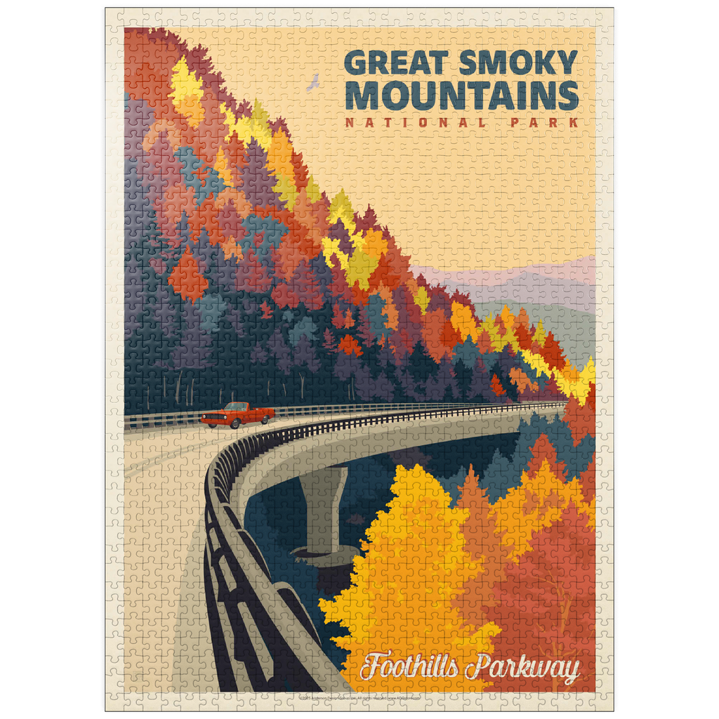The Great Smoky Mountains National Park in Tennessee is beautifully represented through this autumn view of the Foothills Parkway. Brilliant fall foliage in shades of gold, orange, and crimson cascades down the mountainsides, creating a breathtaking contrast with the winding elevated roadway. A classic red car adds a nostalgic touch as it travels along the scenic byway, which is renowned for its sweeping mountain vistas and vibrant seasonal colors. Established in 1934, the Great Smoky Mountains is the most visited national park in the United States, offering endless opportunities to explore its rolling peaks, lush forests, and famous misty horizons.