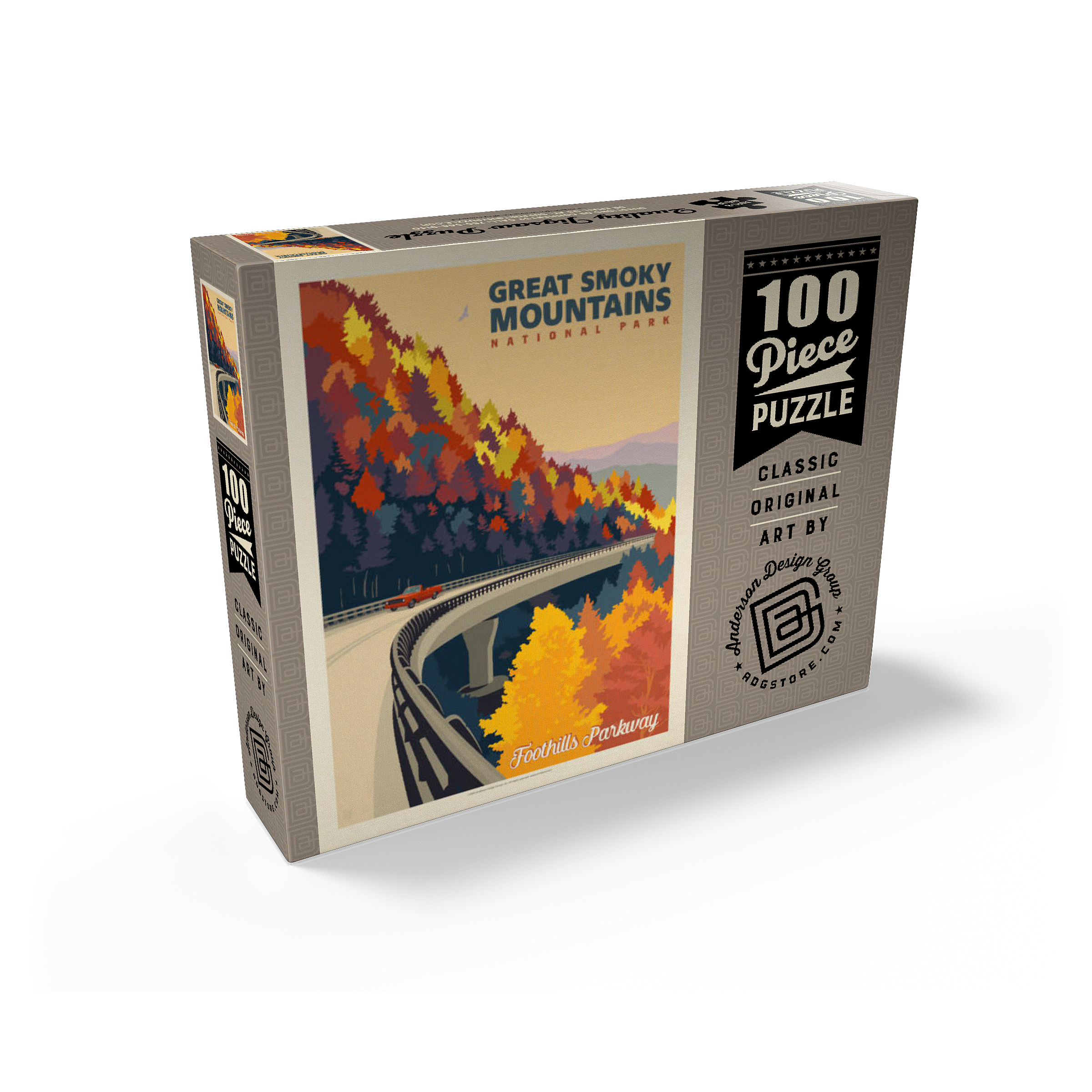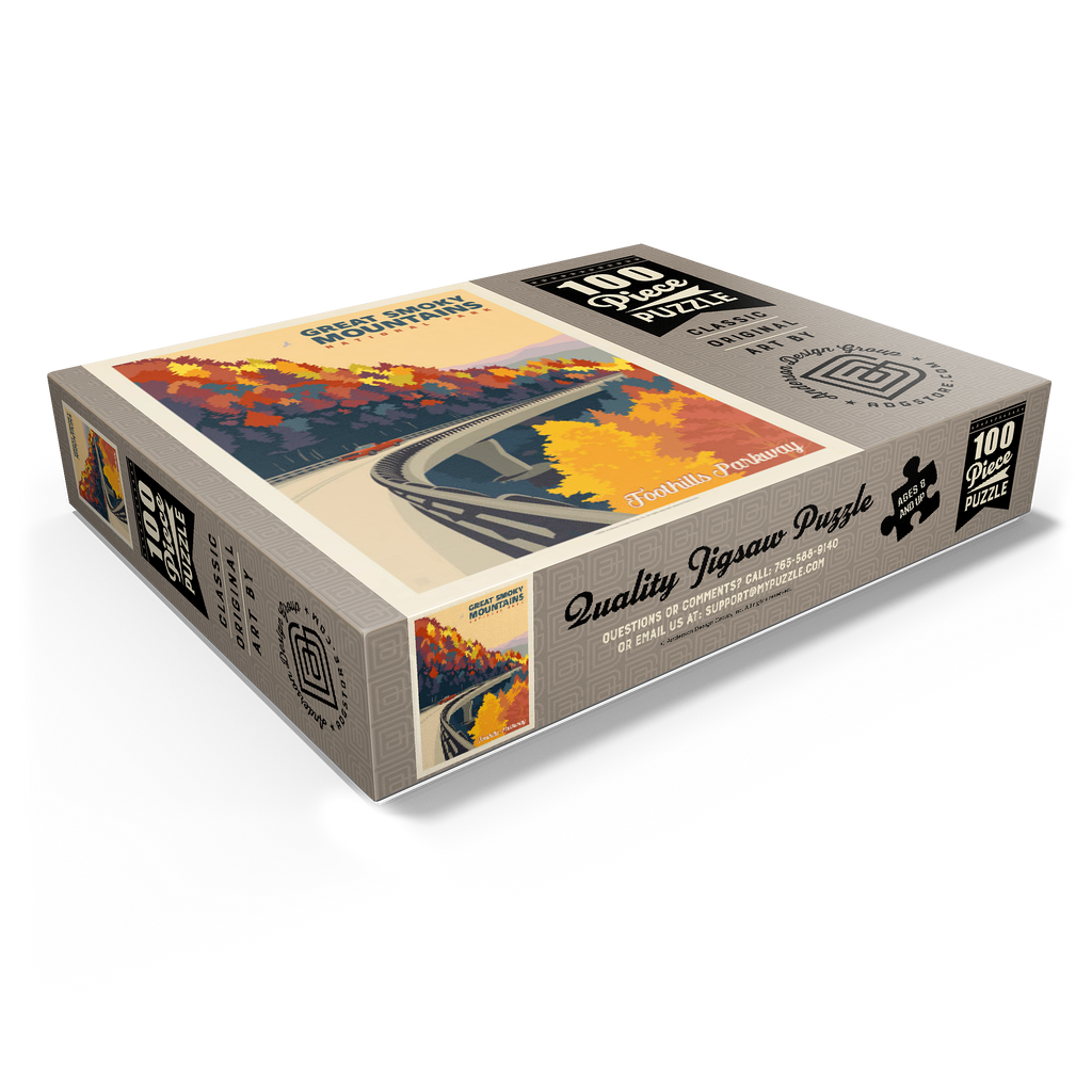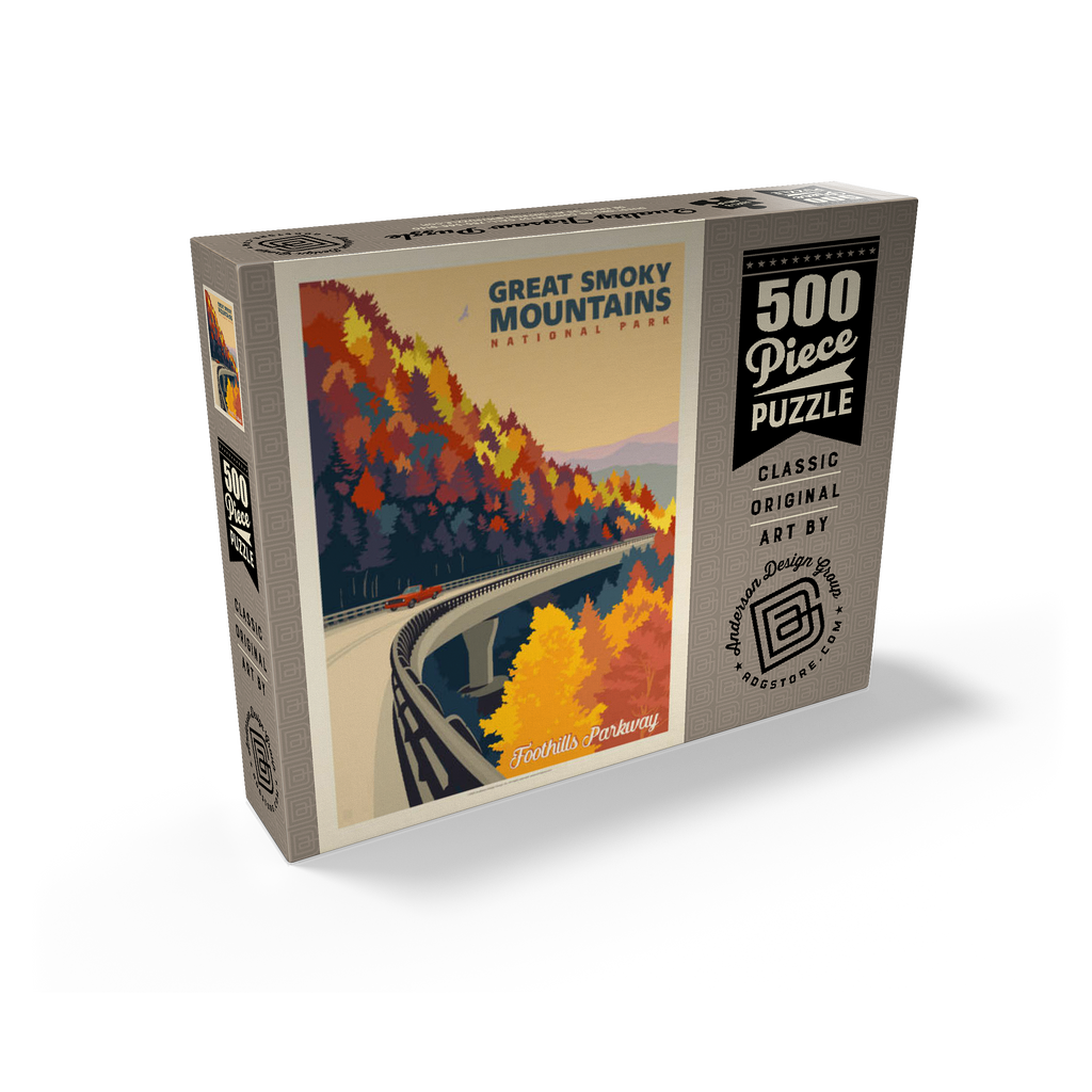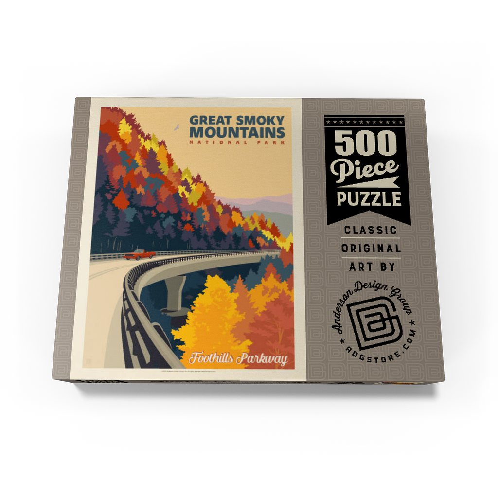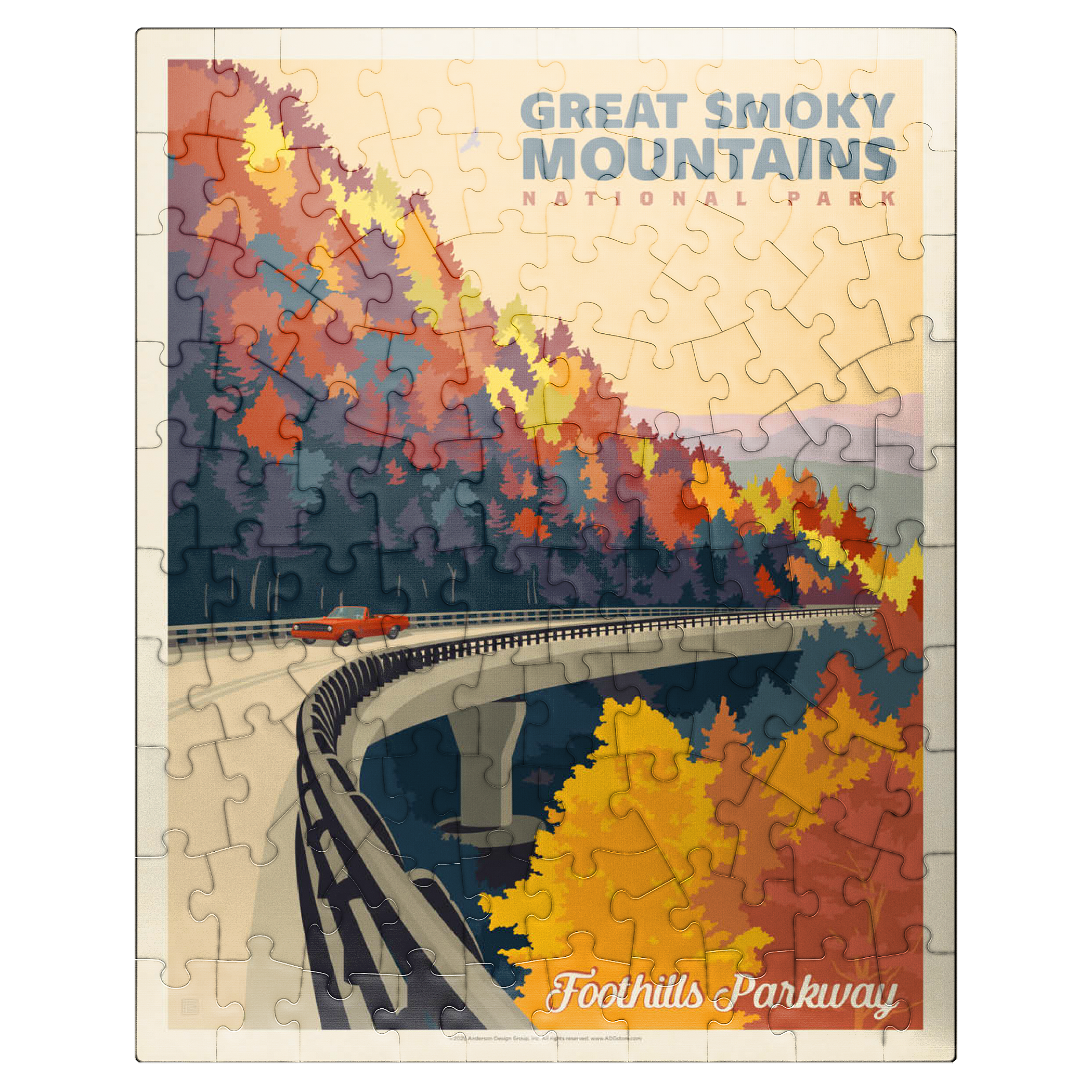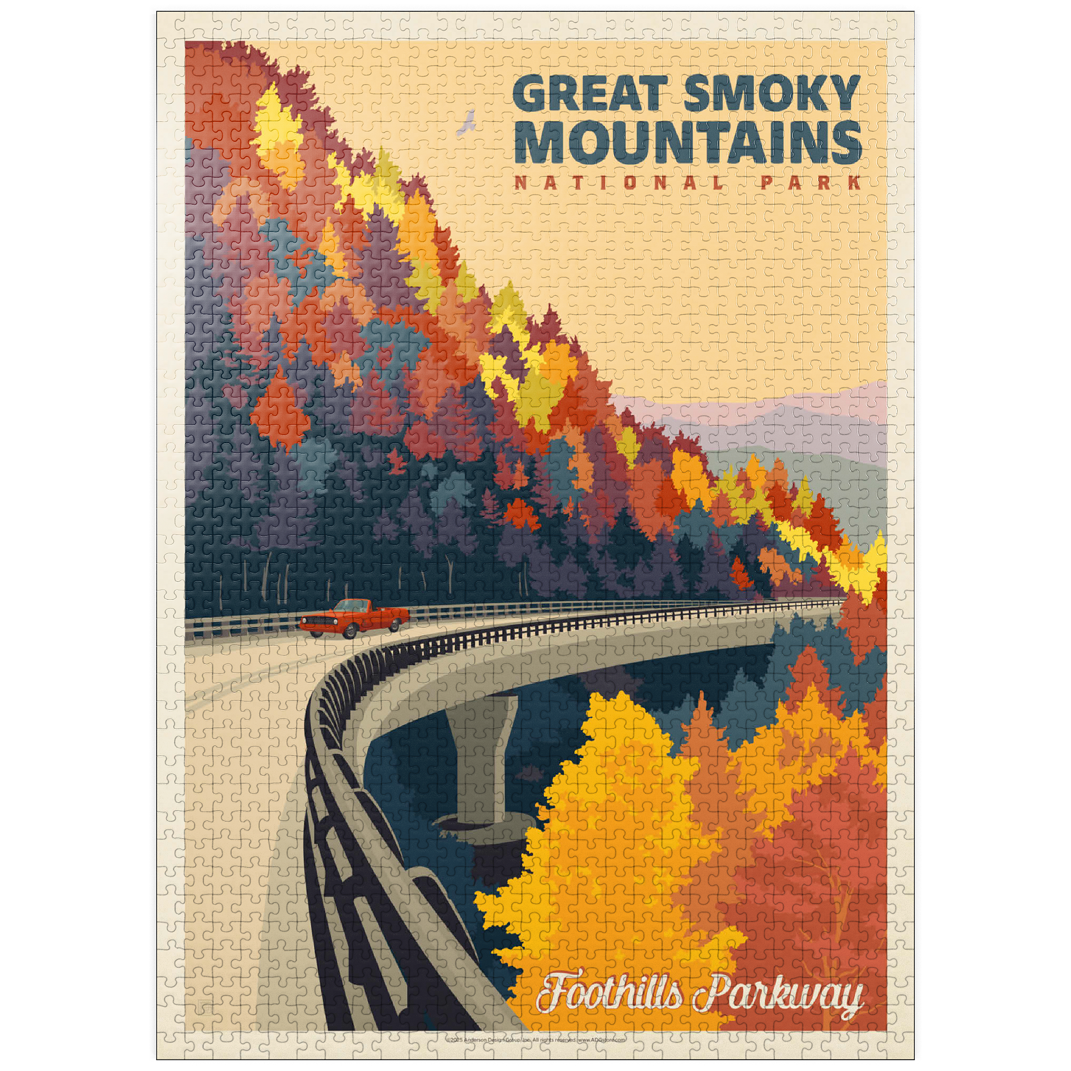 The Great Smoky Mountains National Park in Tennessee is beautifully represented through this autumn view of the Foothills Parkway. Brilliant fall foliage in shades of gold, orange, and crimson cascades down the mountainsides, creating a breathtaking contrast with the winding elevated roadway. A classic red car adds a nostalgic touch as it travels along the scenic byway, which is renowned for its sweeping mountain vistas and vibrant seasonal colors. Established in 1934, the Great Smoky Mountains is the most visited national park in the United States, offering endless opportunities to explore its rolling peaks, lush forests, and famous misty horizons.