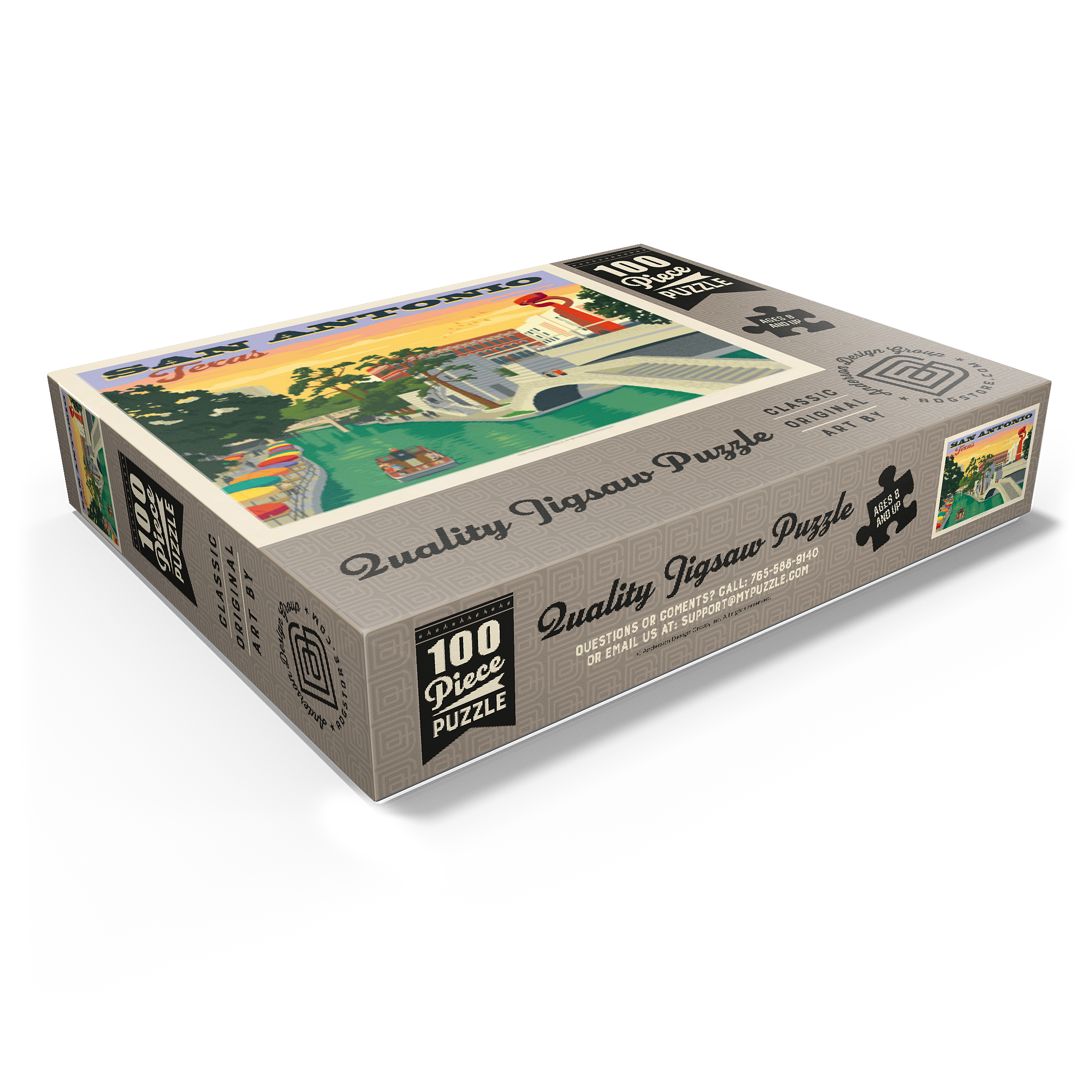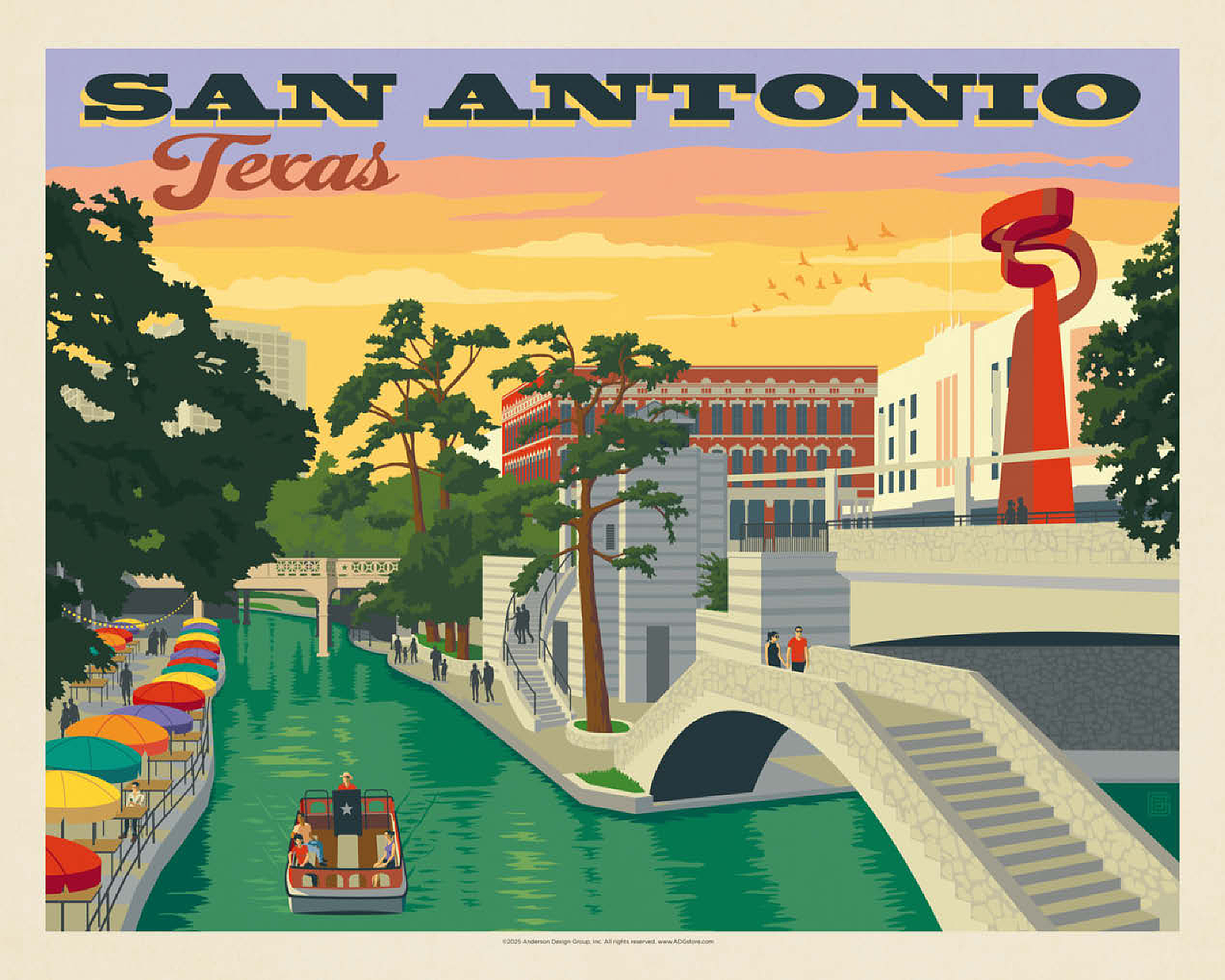 San Antonio, Texas, is one of the most vibrant cities in the United States, blending rich history with cultural charm, and its most famous attraction is the San Antonio River Walk. This artwork captures the lively scene along the River Walk, where colorful umbrellas line the waterside cafes, tour boats glide gently through the canals, and visitors stroll along the shaded pathways. The iconic Torch of Friendship monument rises in the background, symbolizing the city’s welcoming spirit. The River Walk is not only a centerpiece of San Antonio’s tourism but also a hub of dining, shopping, and entertainment, connecting landmarks such as the Alamo, historic missions, and the bustling downtown. Known for its Spanish colonial architecture and cultural festivals, San Antonio offers a unique blend of tradition and modern energy. As one of the fastest-growing cities in the nation, it attracts millions of visitors each year who come to experience its lively atmosphere, historic sites, and warm hospitality.
