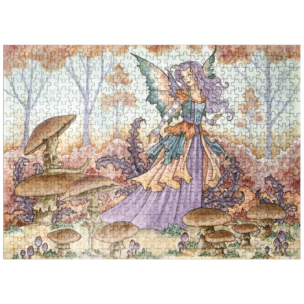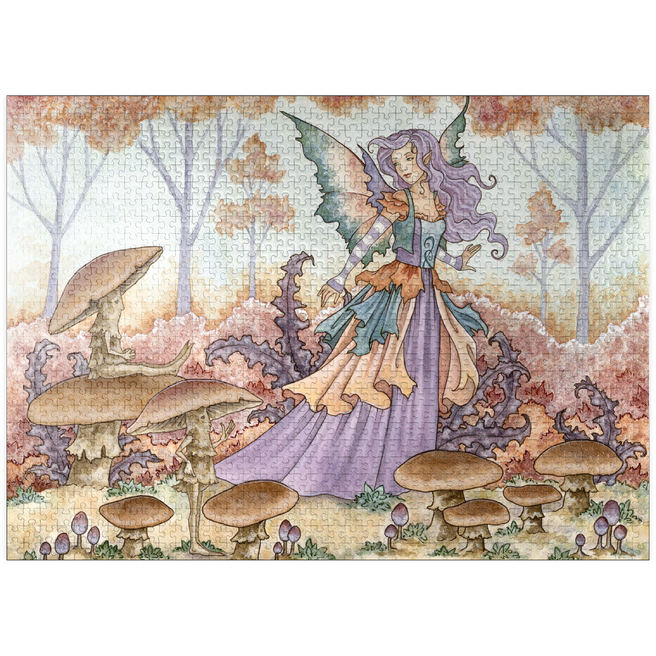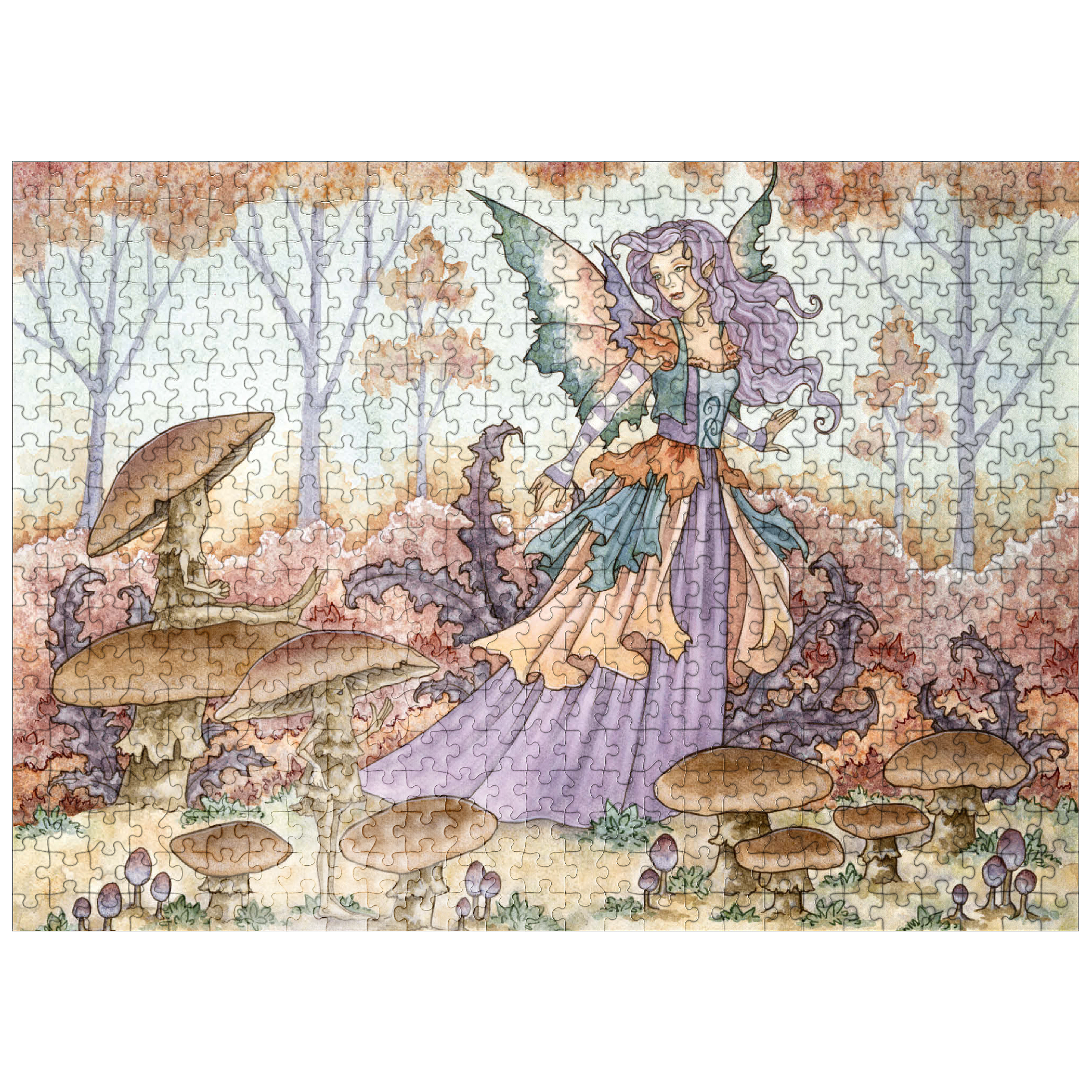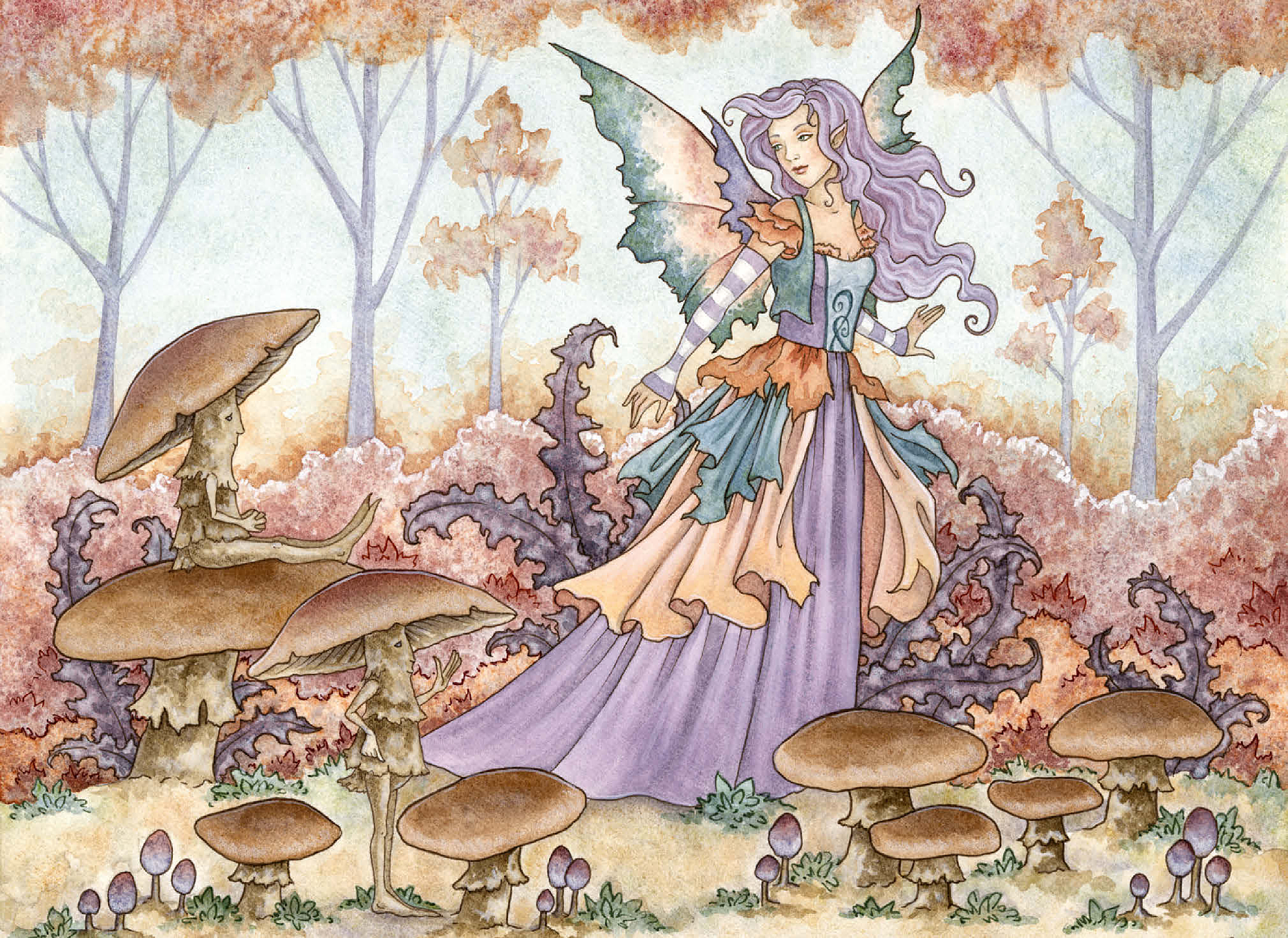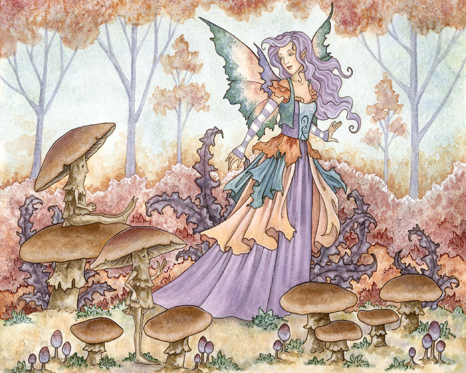 In The Mushroom Folk, a curious fairy wanders through an autumn-hued glade where sentient mushrooms gather like forest dwellers from an old tale. Their quiet presence and her flowing gown create a gentle harmony, as if nature itself is pausing to share a secret.