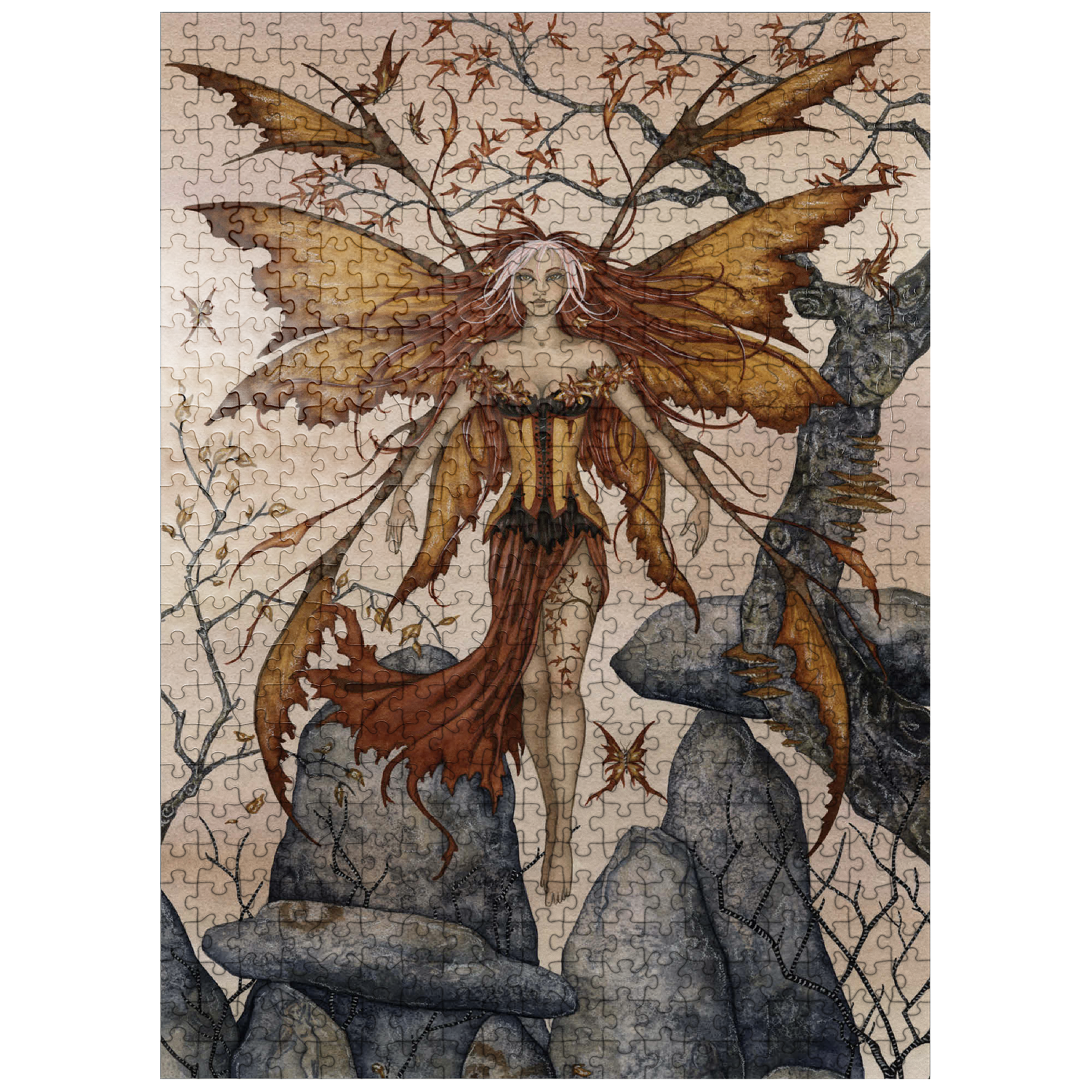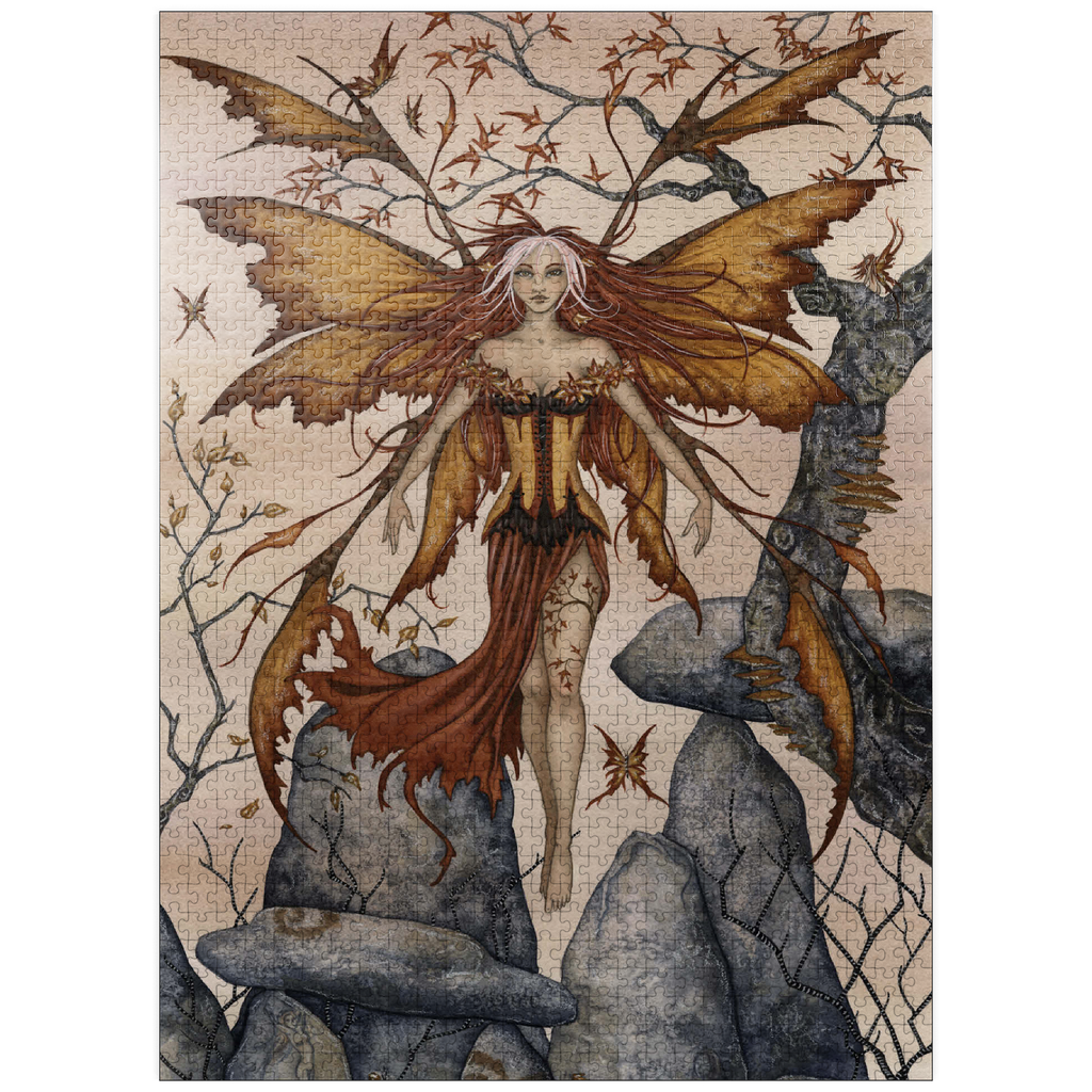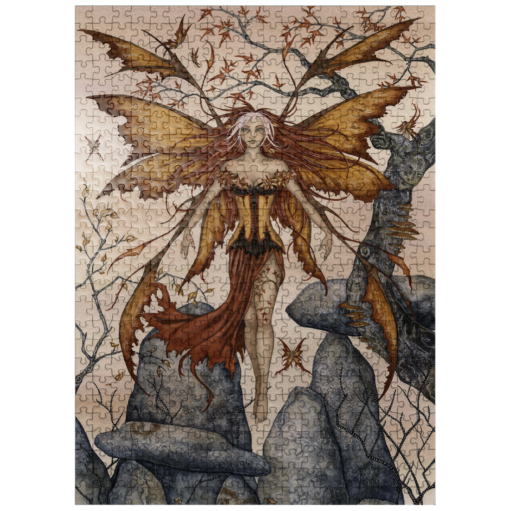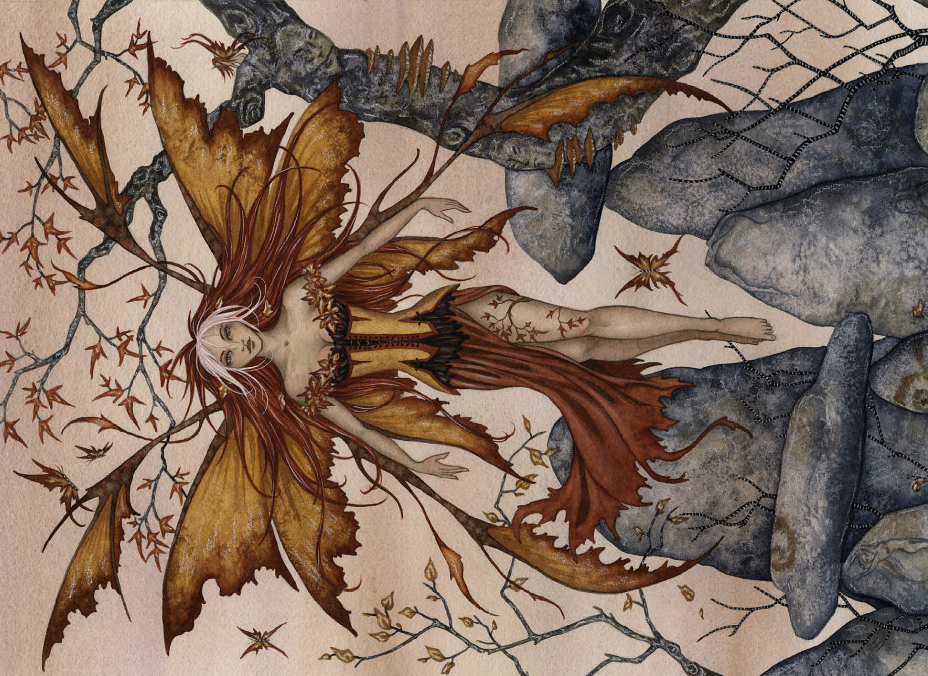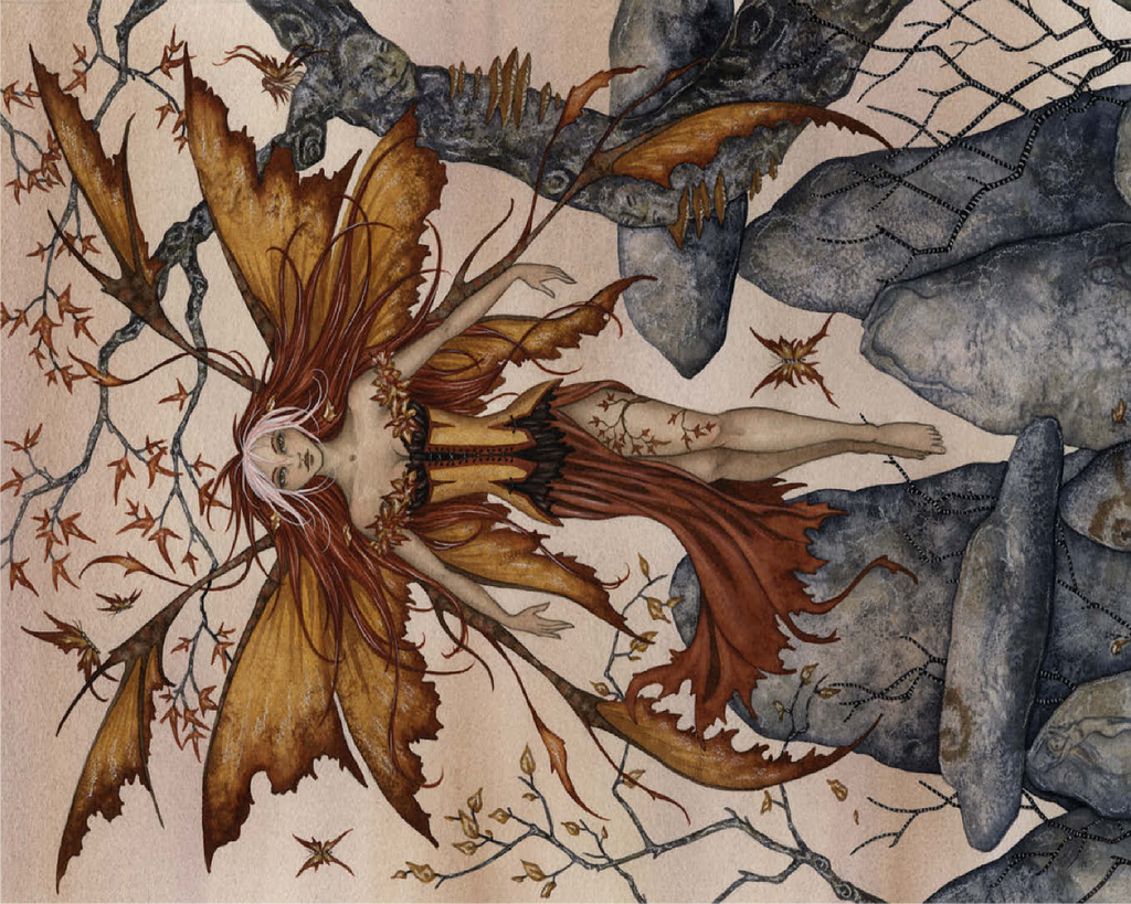 The Arrival, a fierce and graceful autumn faery descends amid ancient stone ruins, her tattered wings and flowing gown echoing the crisp, golden leaves swirling around her. With piercing eyes and an air of solemn power, she brings the changing of the seasons like a spirit summoned from the very heart of fall.