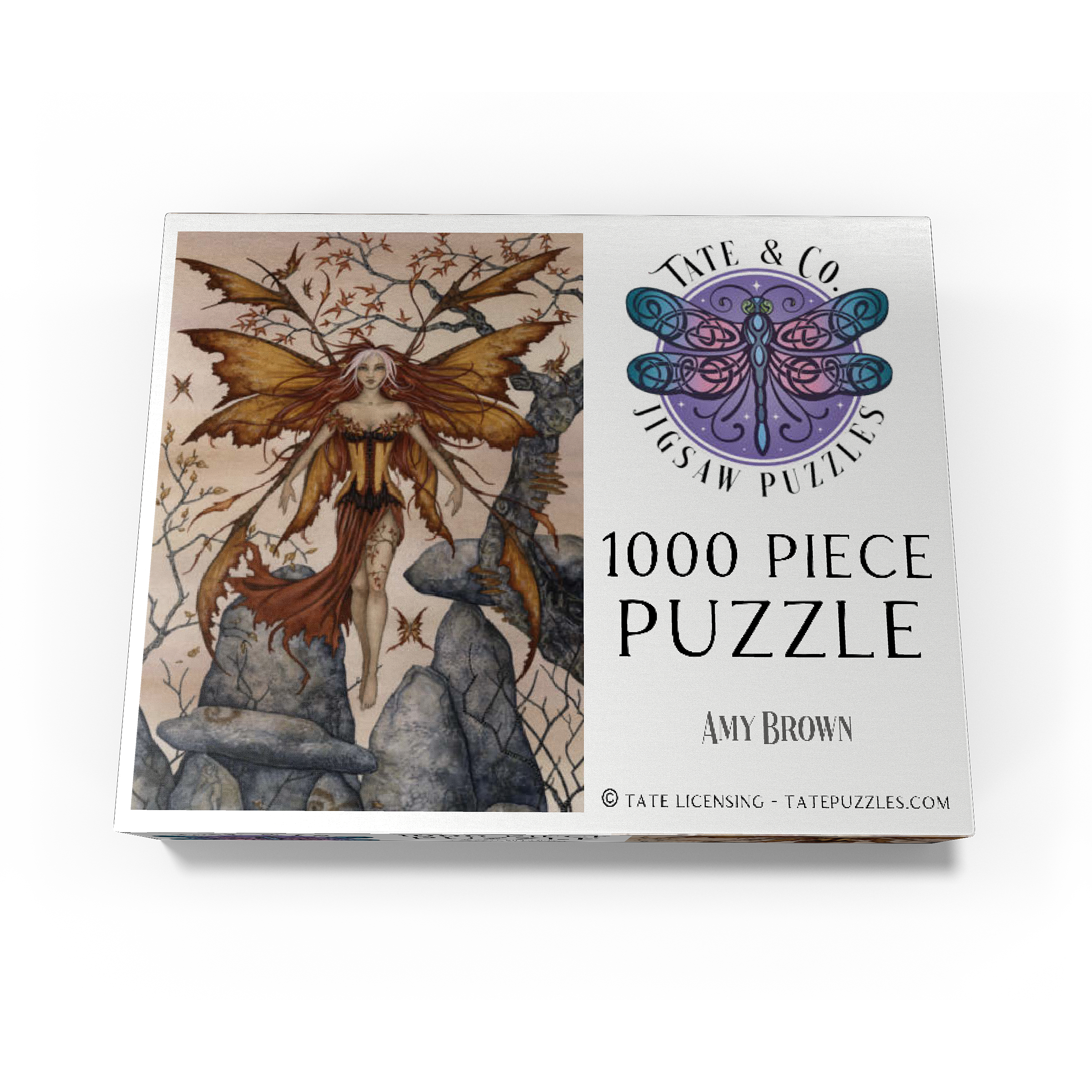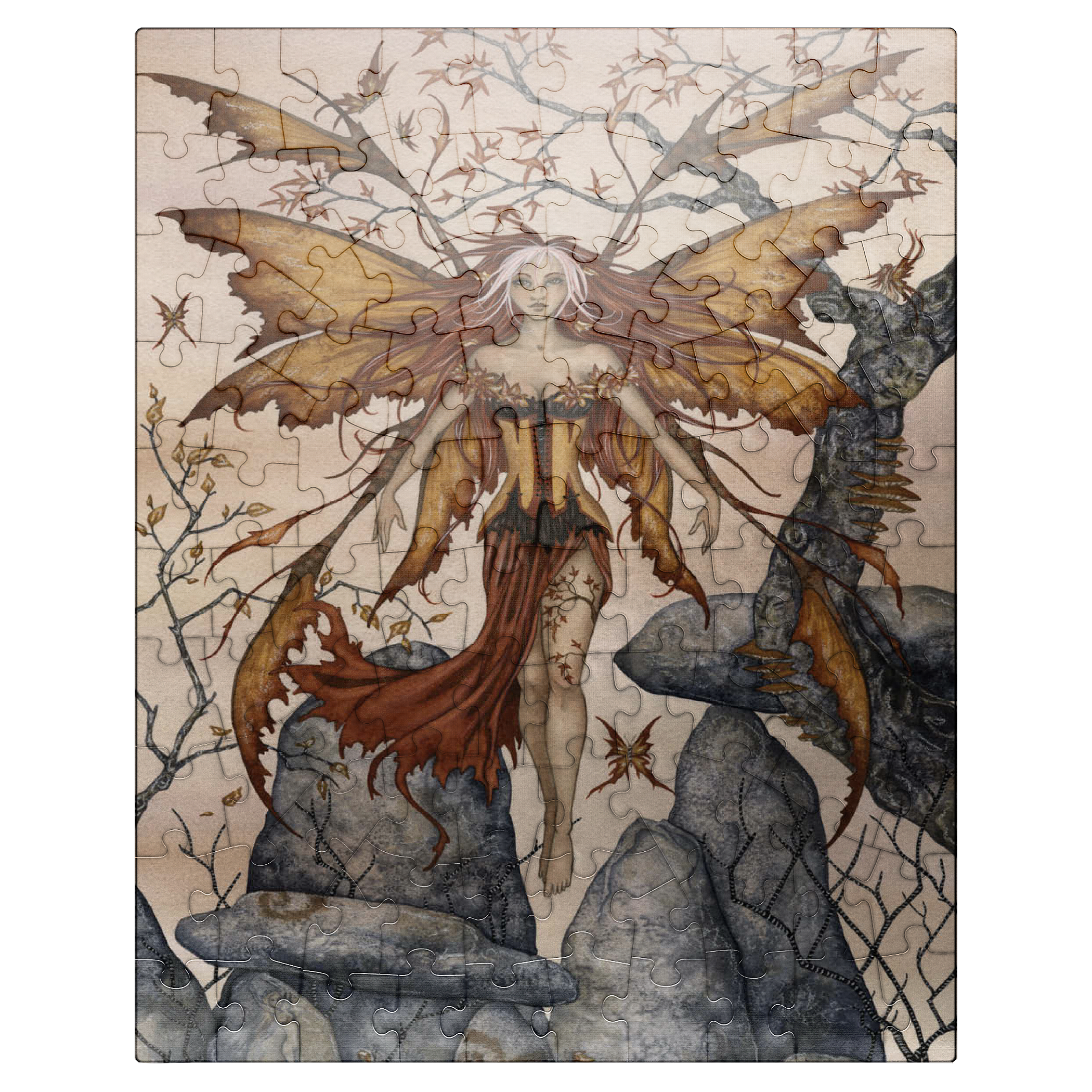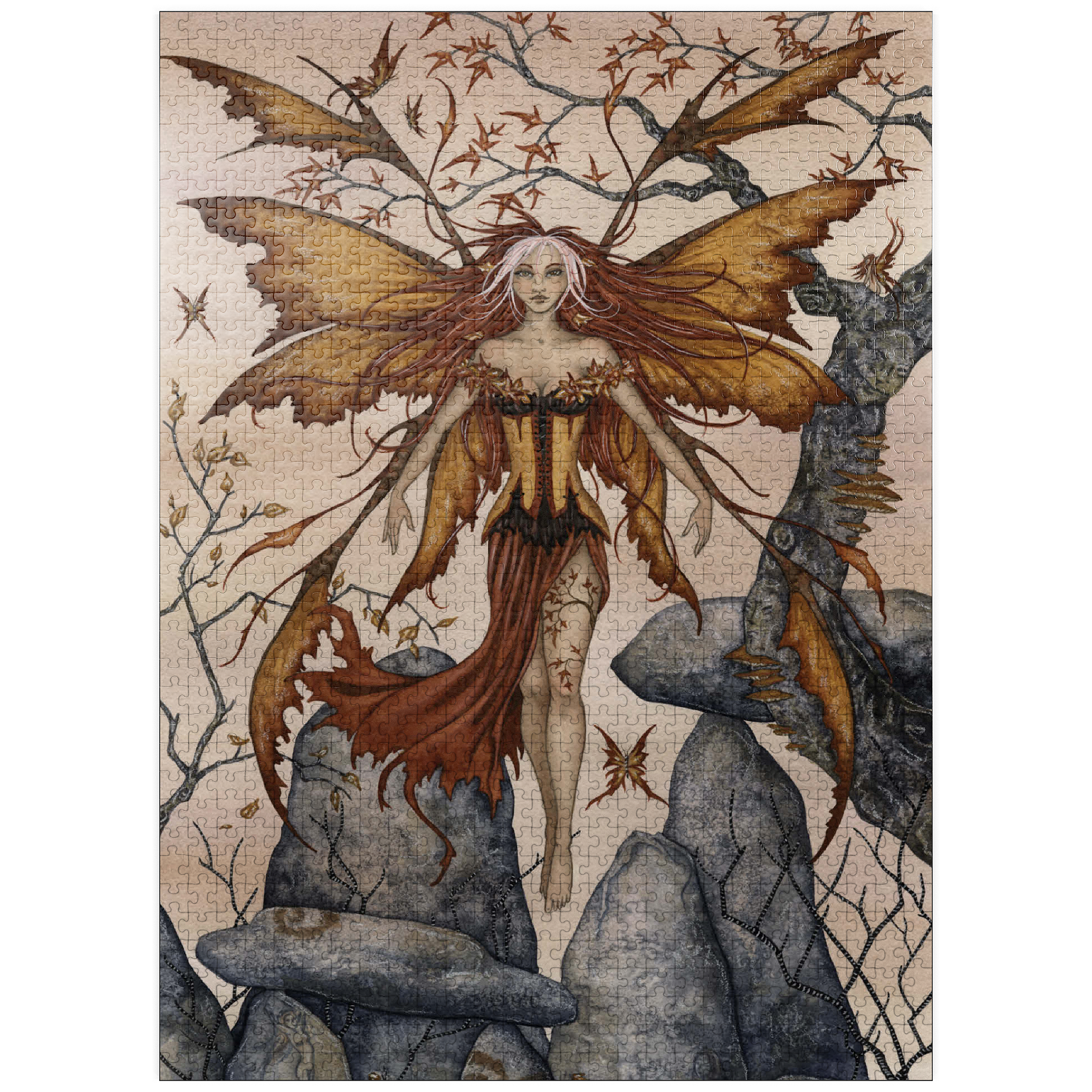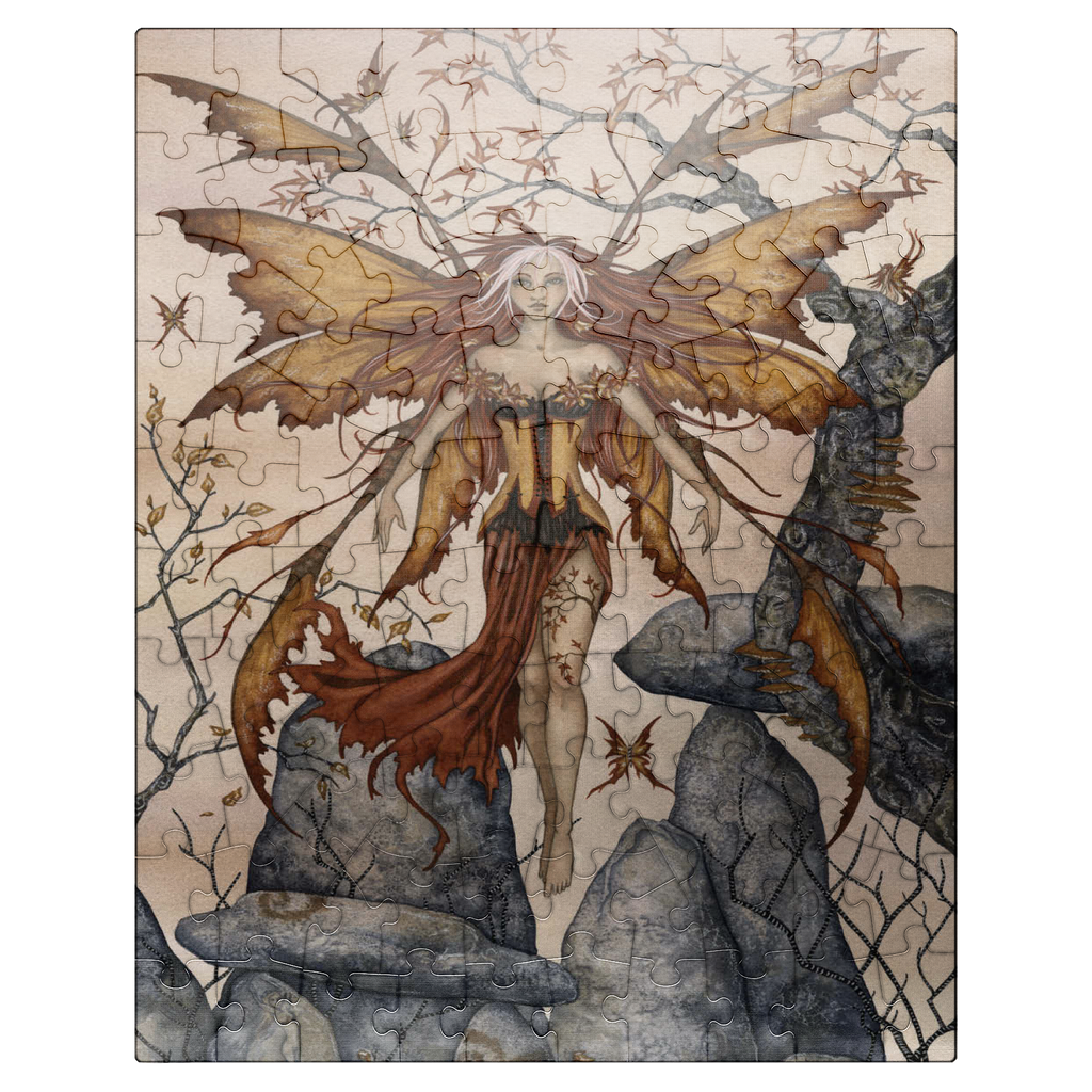 The Arrival, a fierce and graceful autumn faery descends amid ancient stone ruins, her tattered wings and flowing gown echoing the crisp, golden leaves swirling around her. With piercing eyes and an air of solemn power, she brings the changing of the seasons like a spirit summoned from the very heart of fall.
