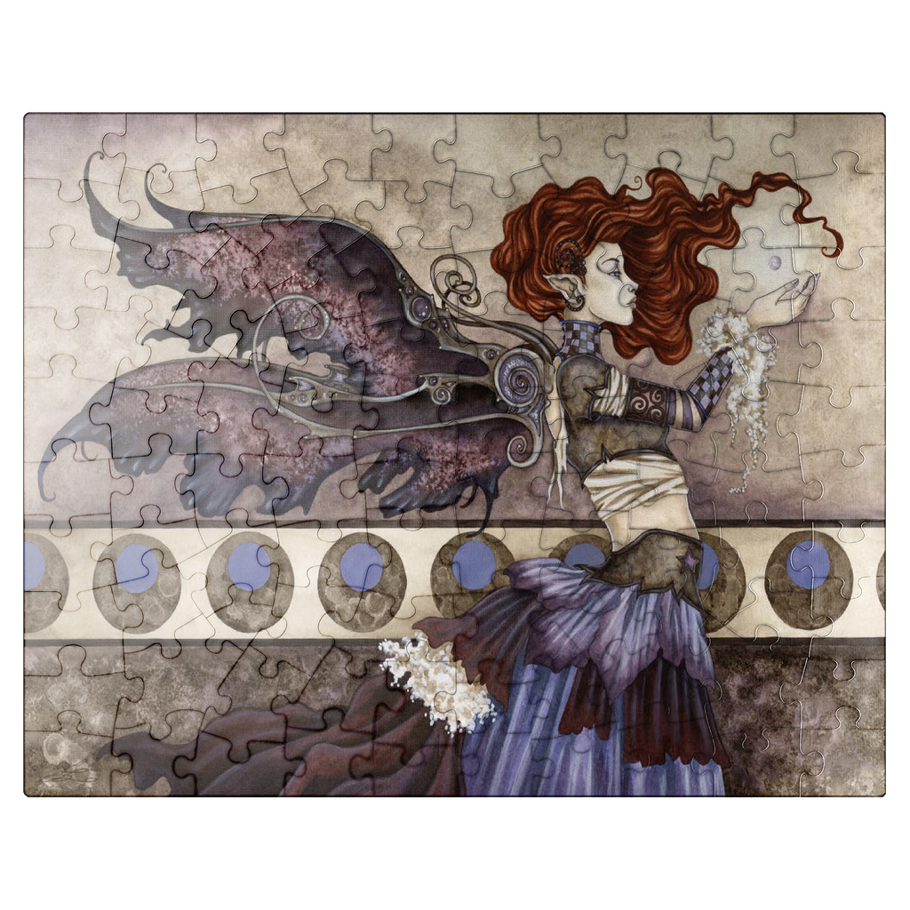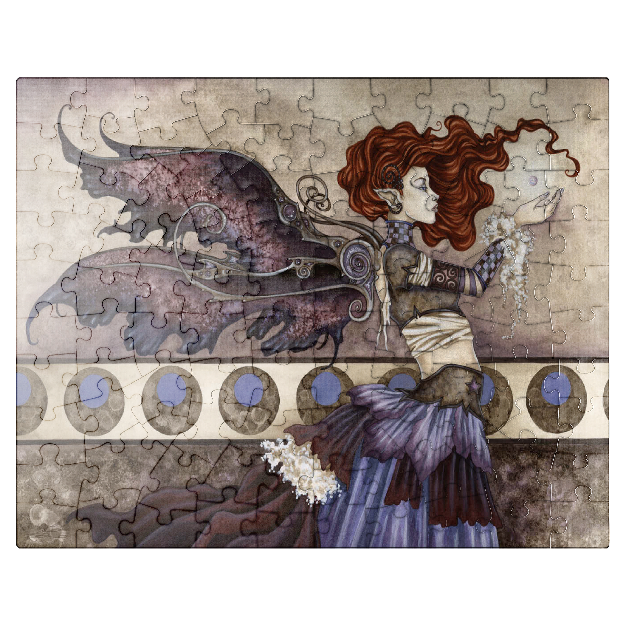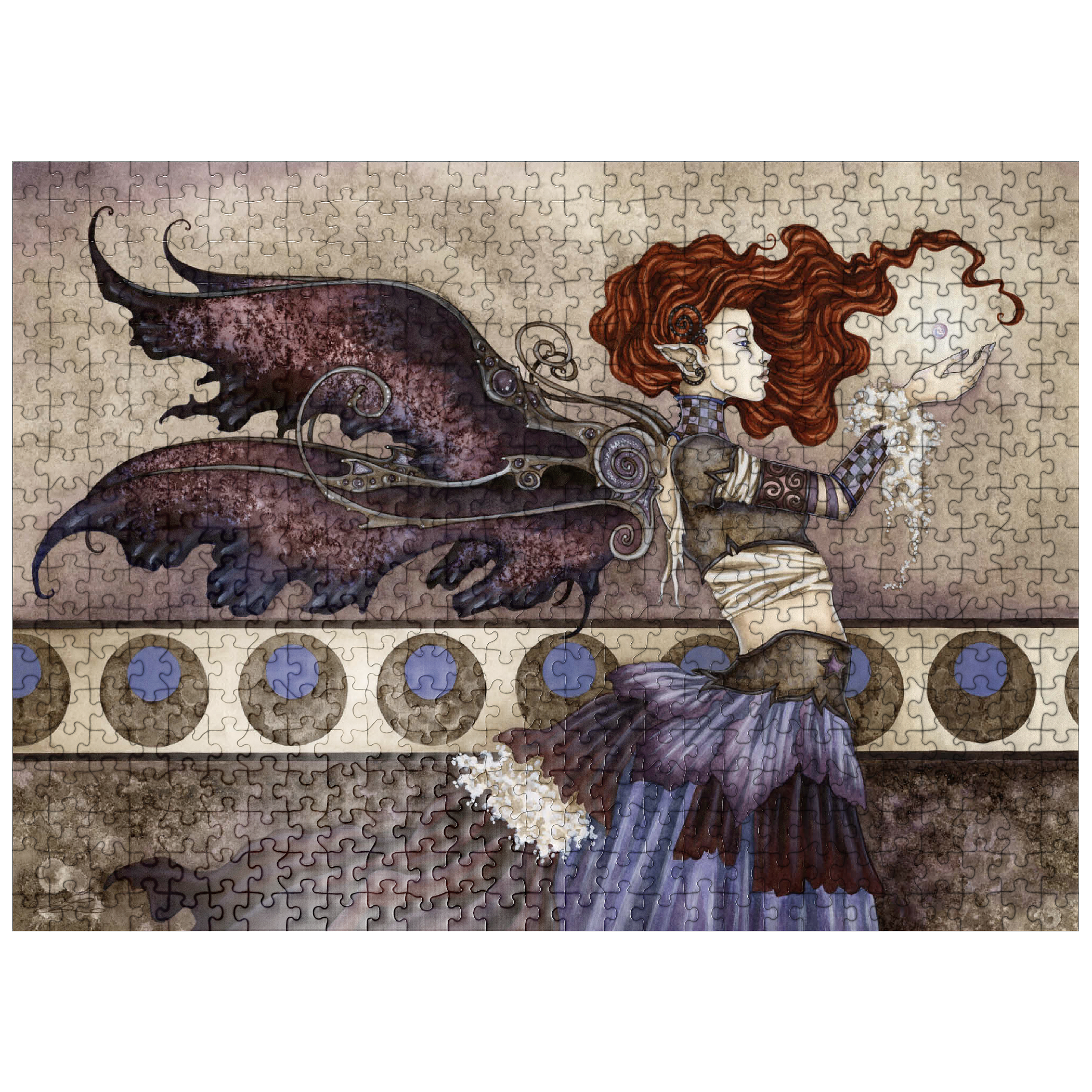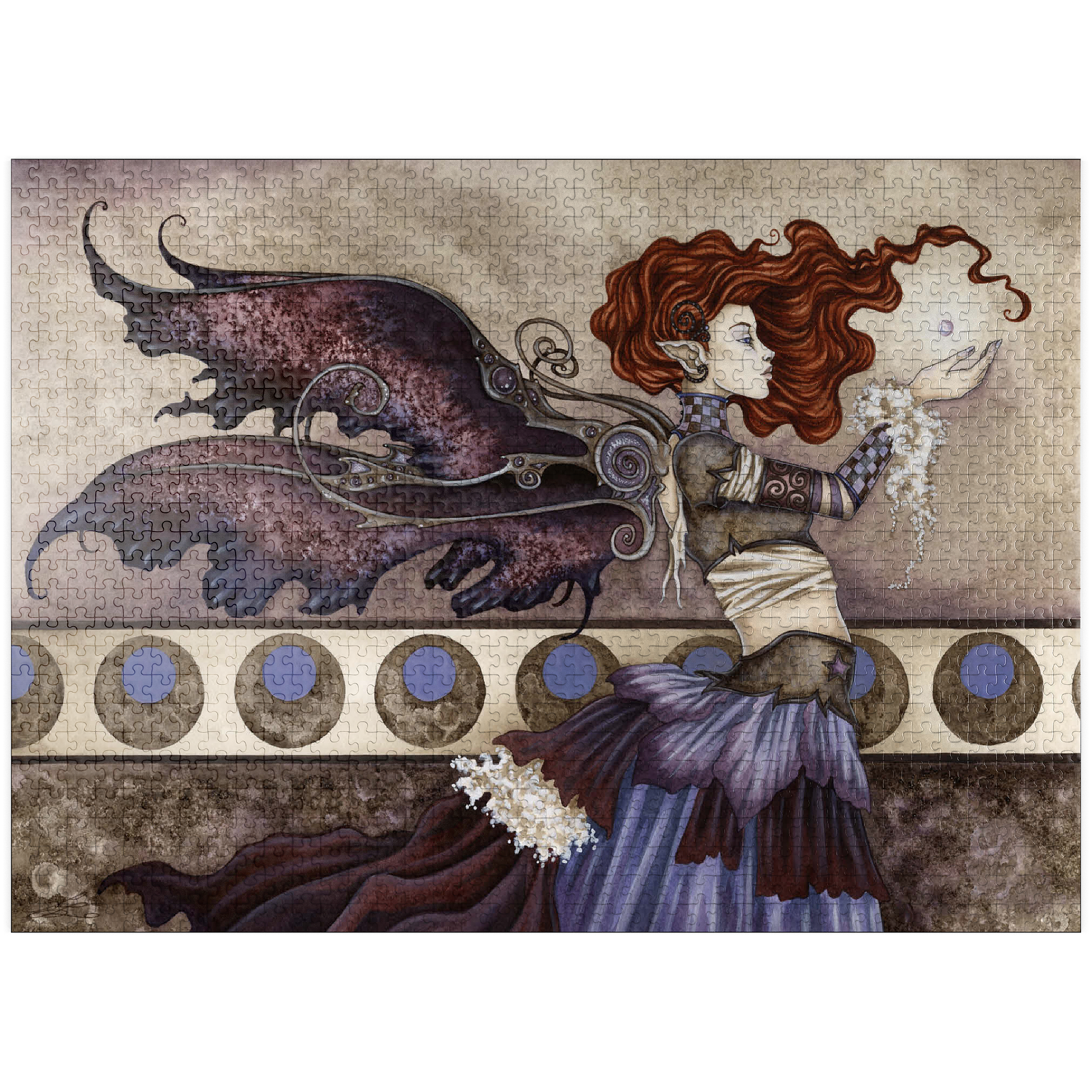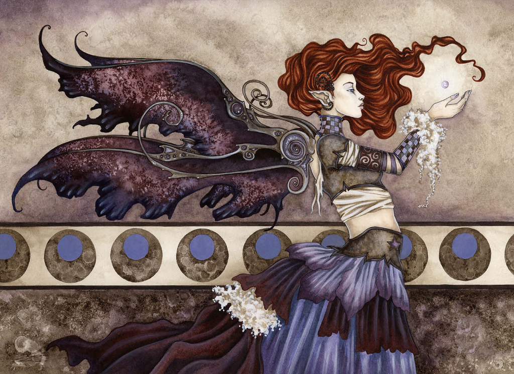 -A Singular Wish- portrays a fiery-haired faery mid-spell, her outstretched hands cradling a glowing orb of magic. With intricate wings and a swirling, layered gown, she stands poised and powerful against a background of moons, caught in a moment of focused enchantment.