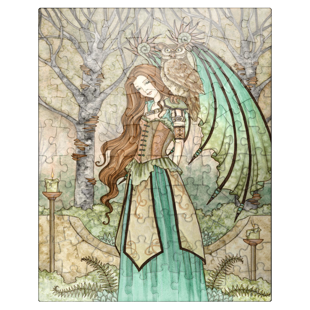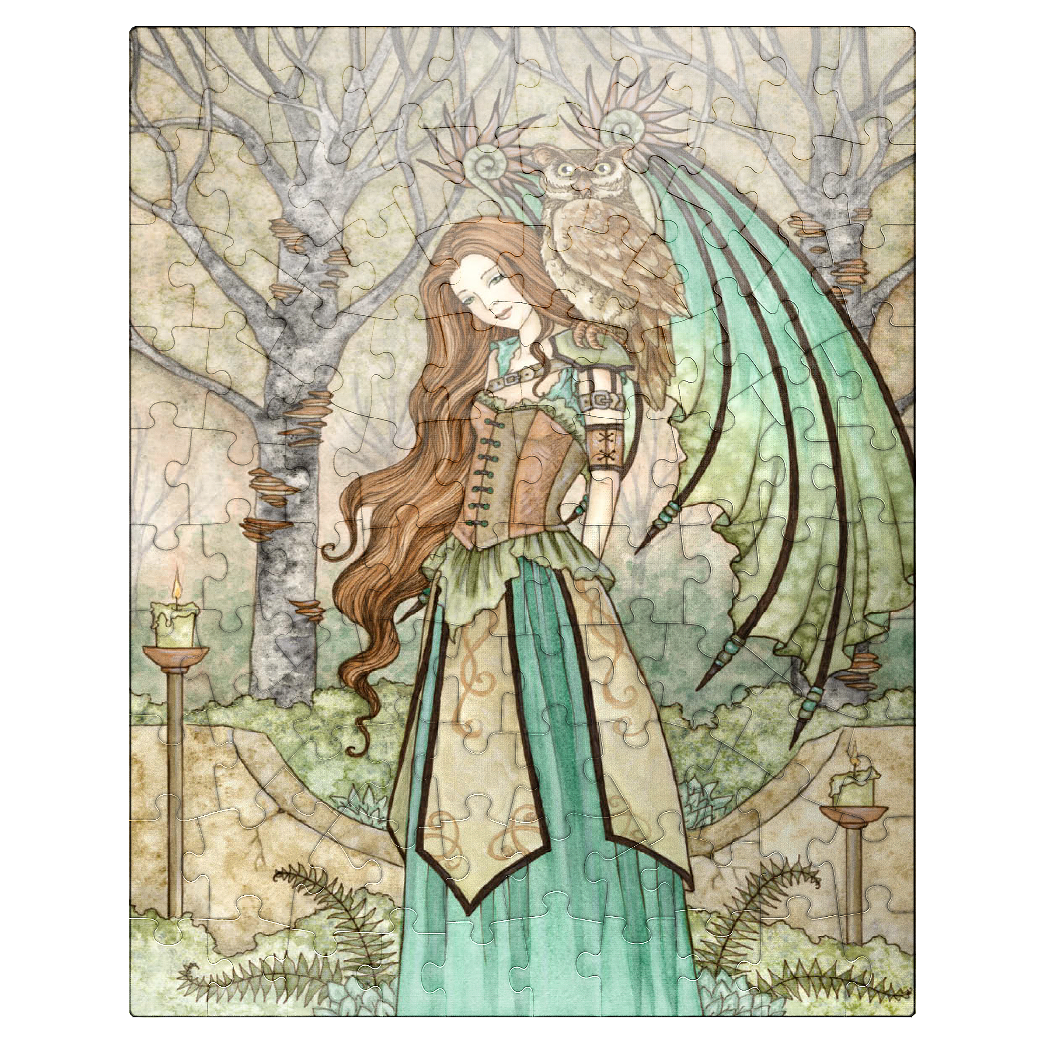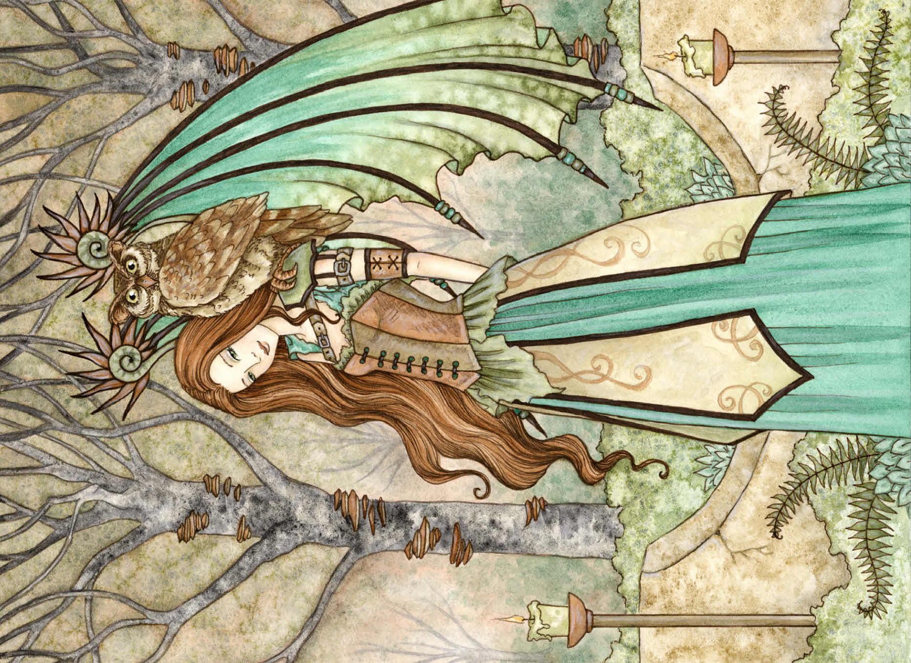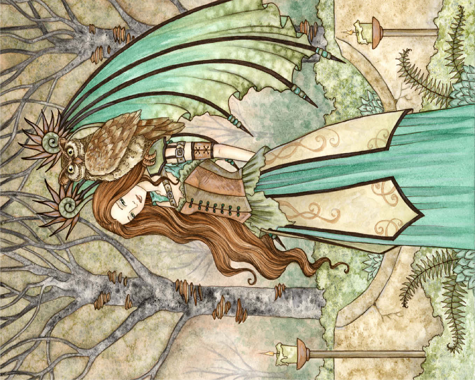 -Garden of Wisdom- shows a serene faery in soft greens and earth tones, her head gently tilted as an owl perches protectively on her shoulder. Surrounded by candles and ferns in a quiet grove, she embodies calm insight and natural harmony.
