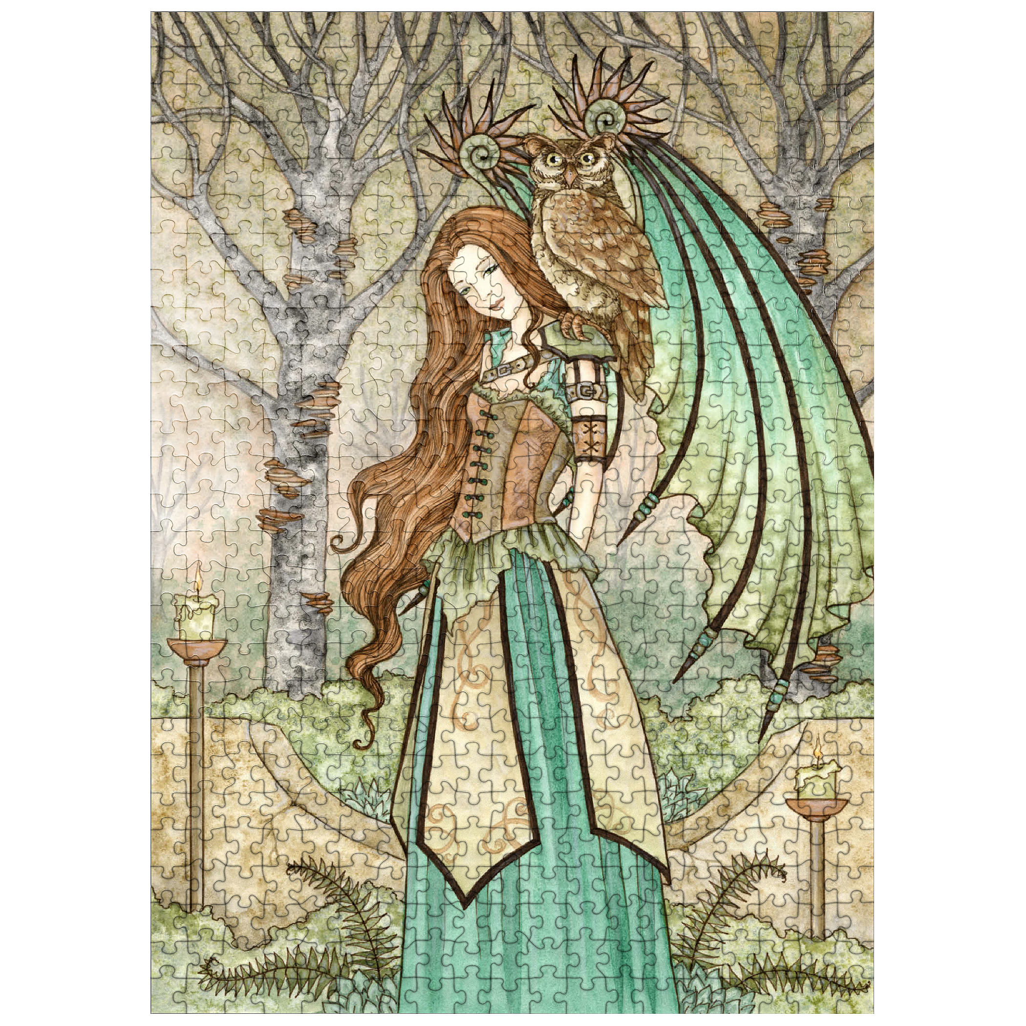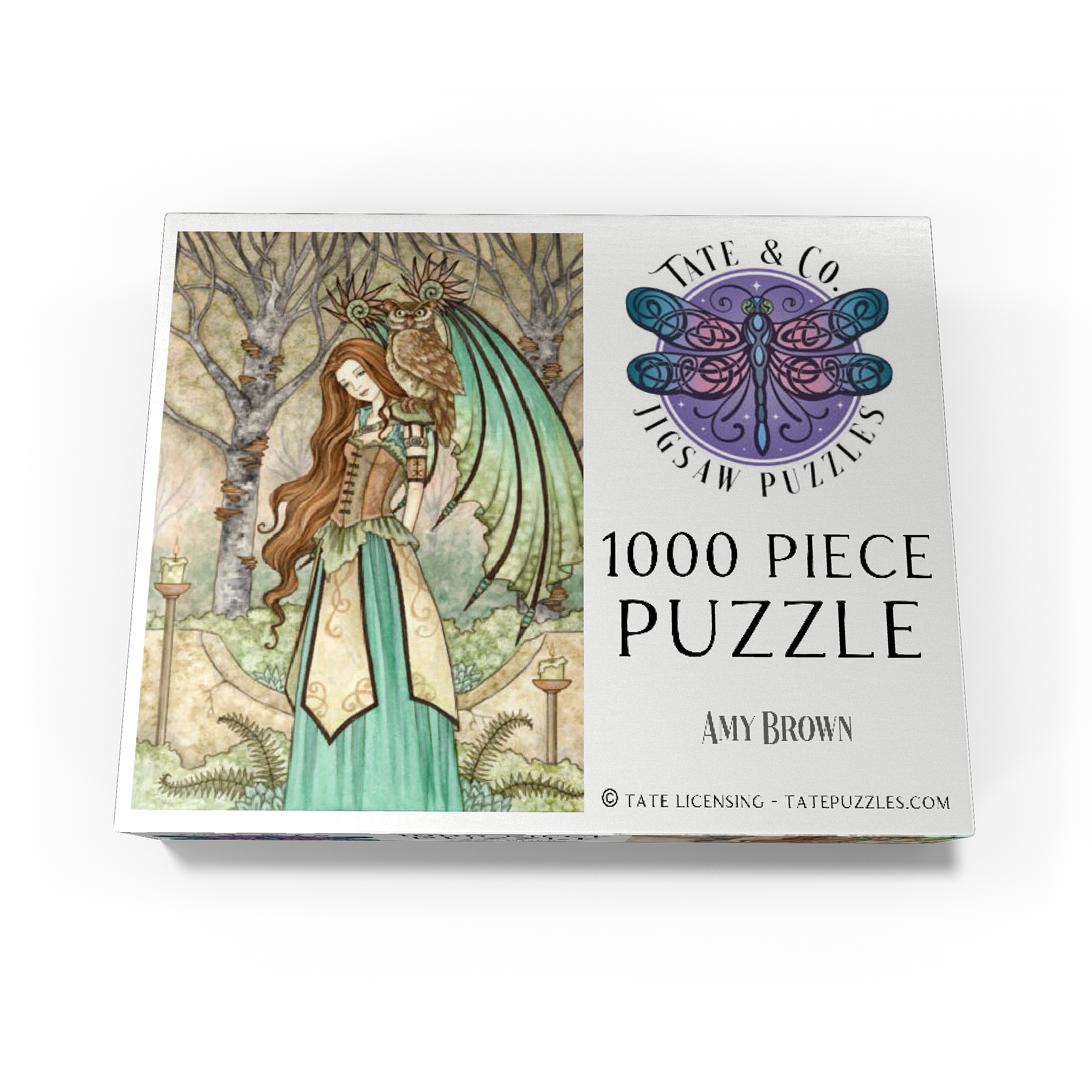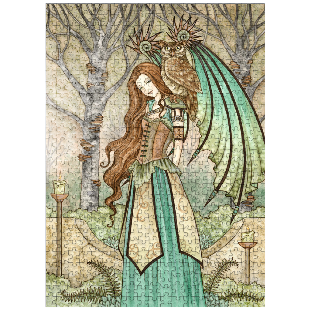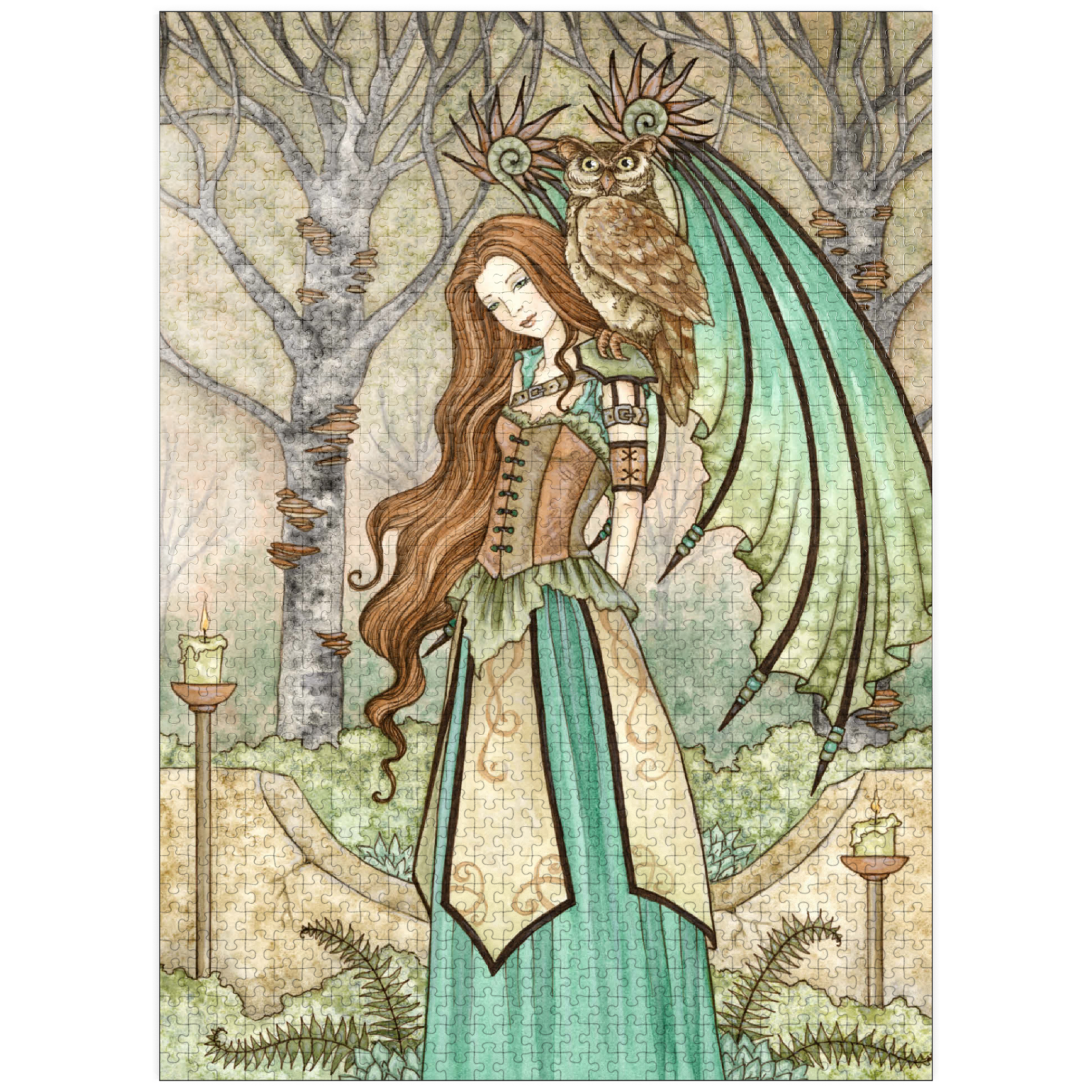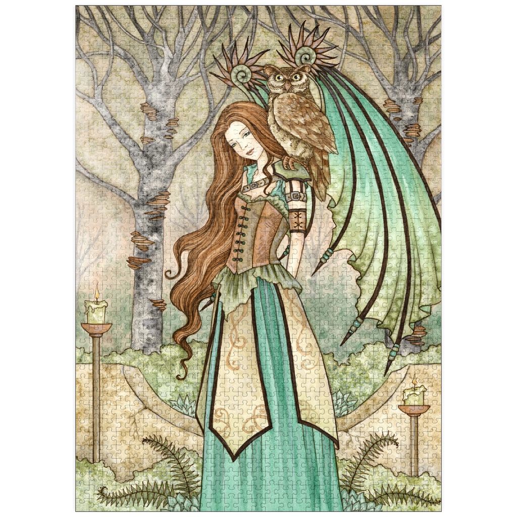-Garden of Wisdom- shows a serene faery in soft greens and earth tones, her head gently tilted as an owl perches protectively on her shoulder. Surrounded by candles and ferns in a quiet grove, she embodies calm insight and natural harmony.