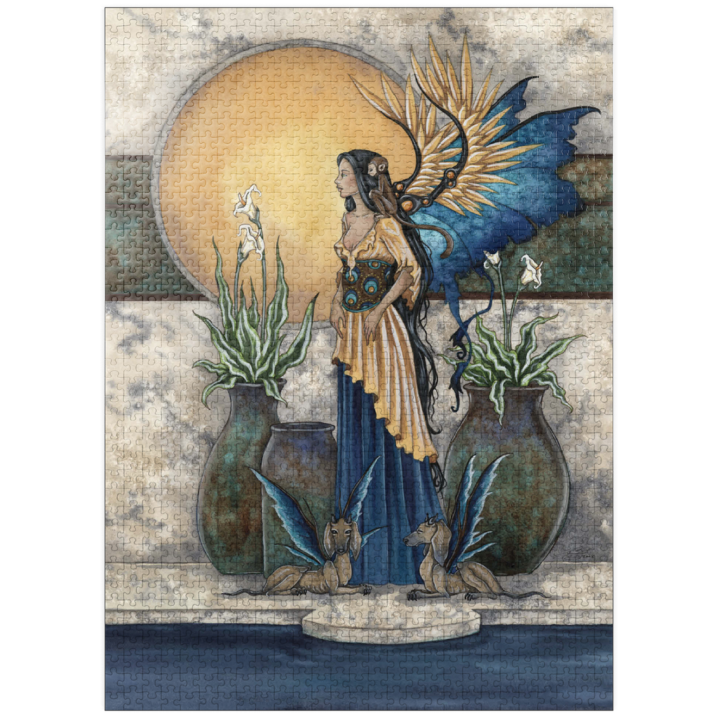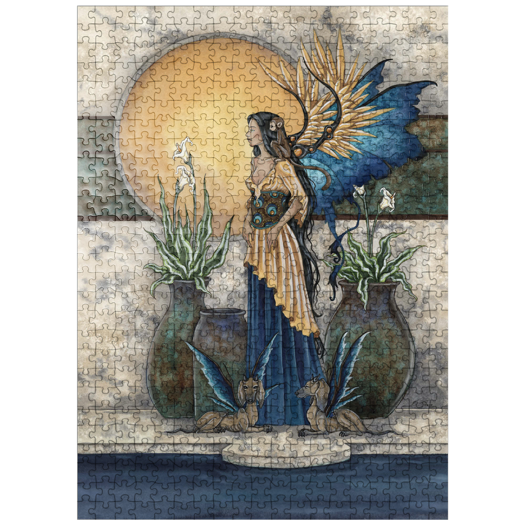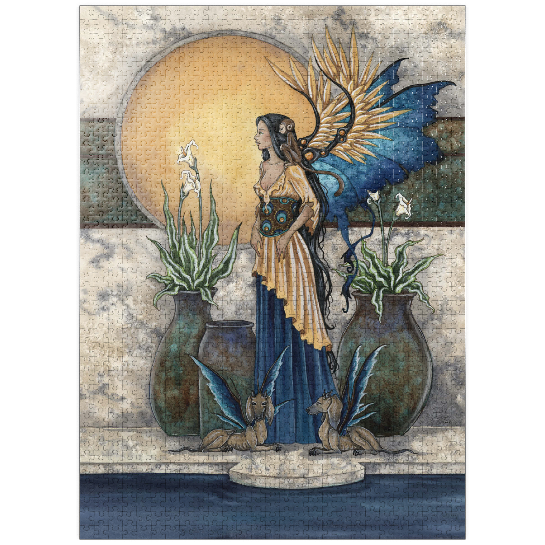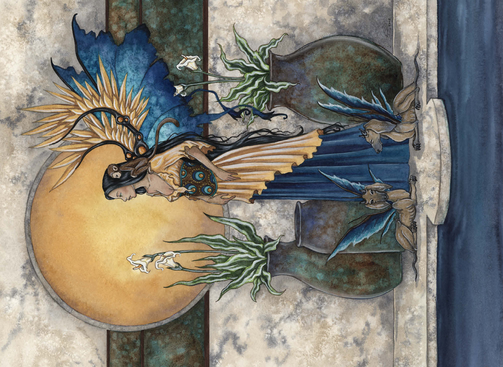 -Tranquility Pool- features a serene faery standing in quiet contemplation between lily-filled vases, her golden and blue wings echoing the sunlit backdrop. At her feet, two small guardian dogs rest by a still pool, completing this portrait of balance, beauty, and calm.