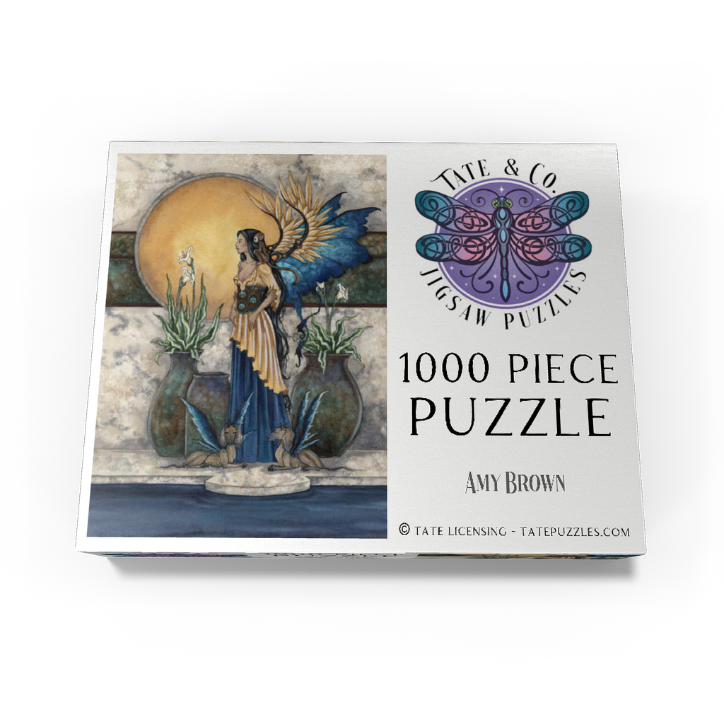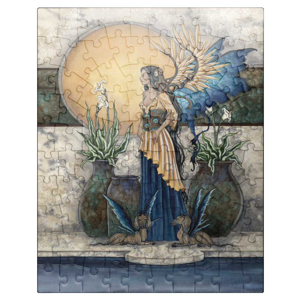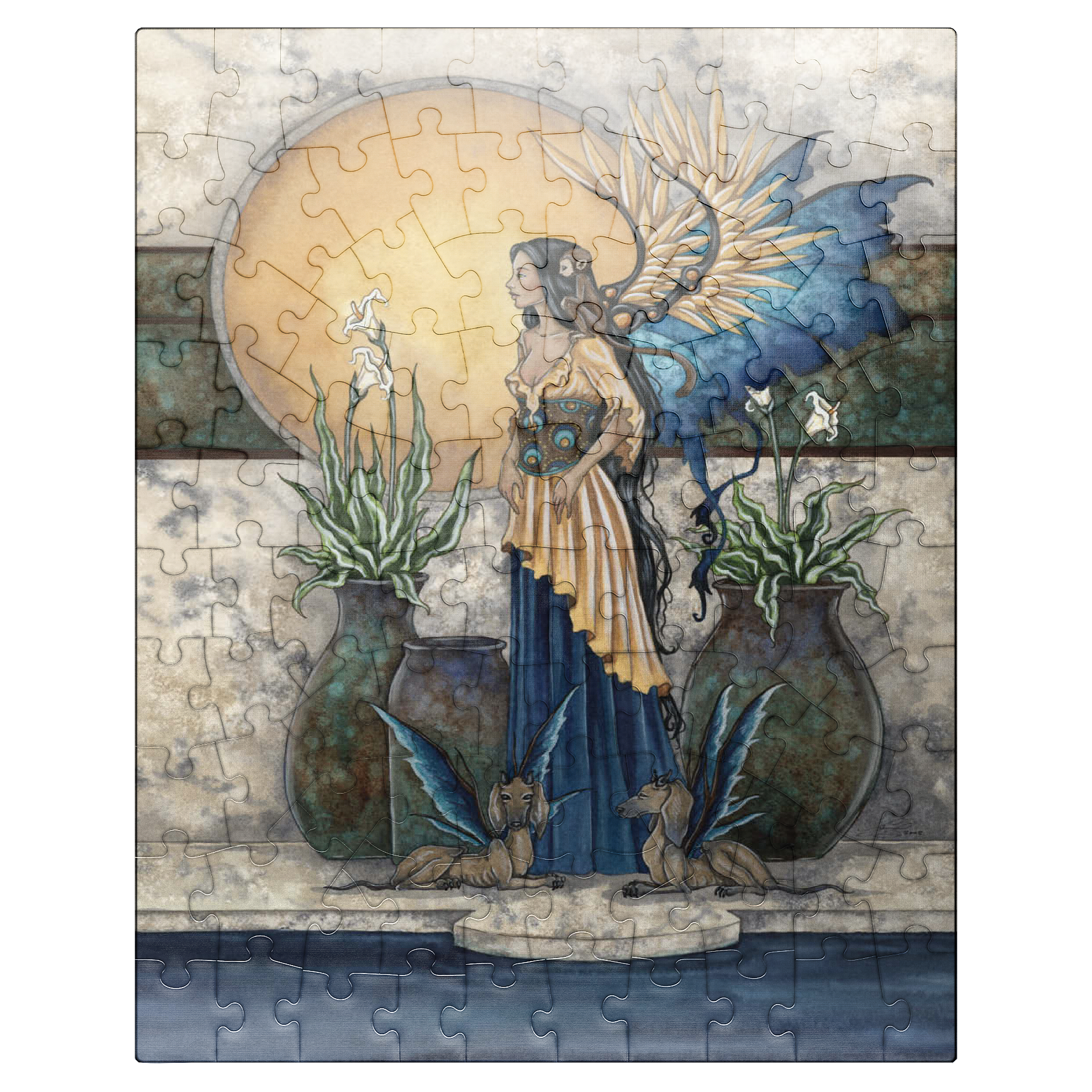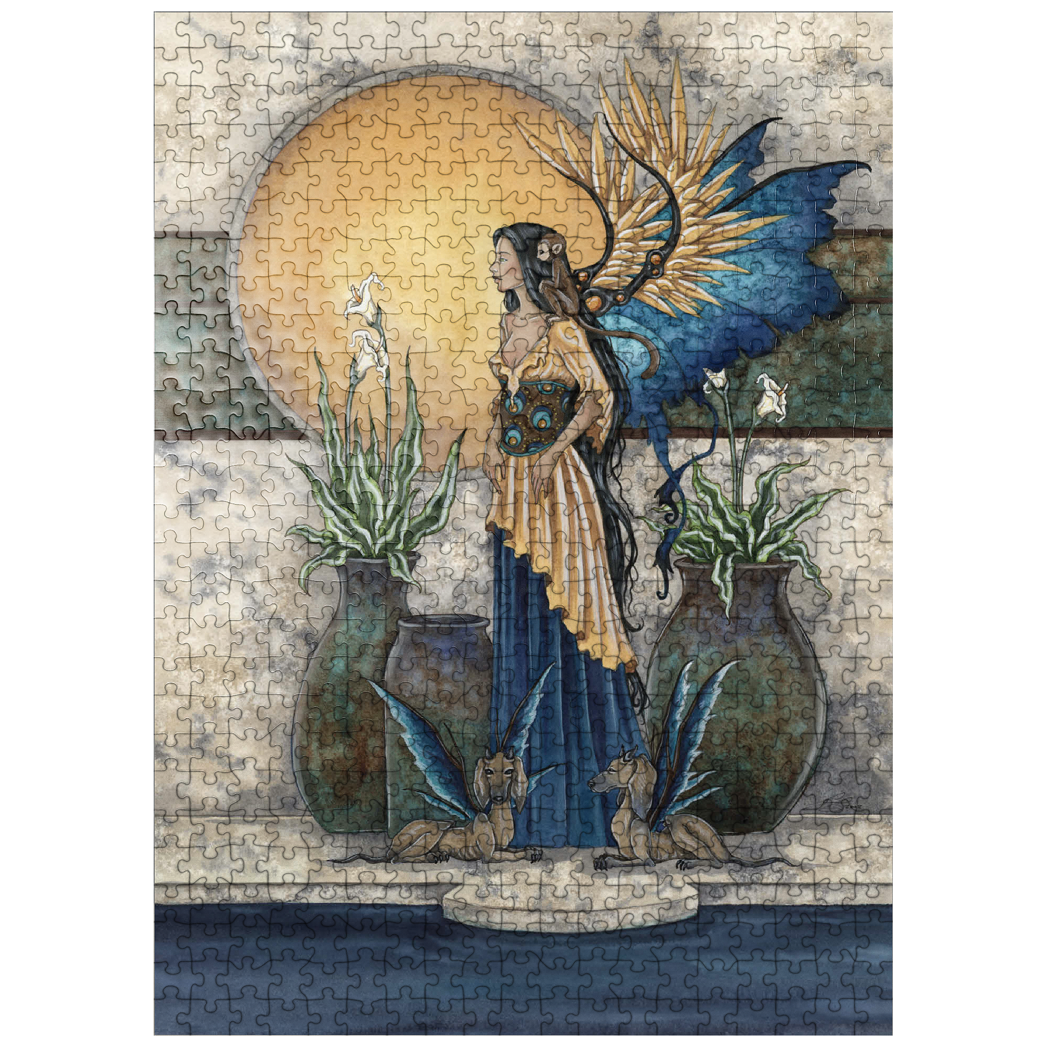 -Tranquility Pool- features a serene faery standing in quiet contemplation between lily-filled vases, her golden and blue wings echoing the sunlit backdrop. At her feet, two small guardian dogs rest by a still pool, completing this portrait of balance, beauty, and calm.