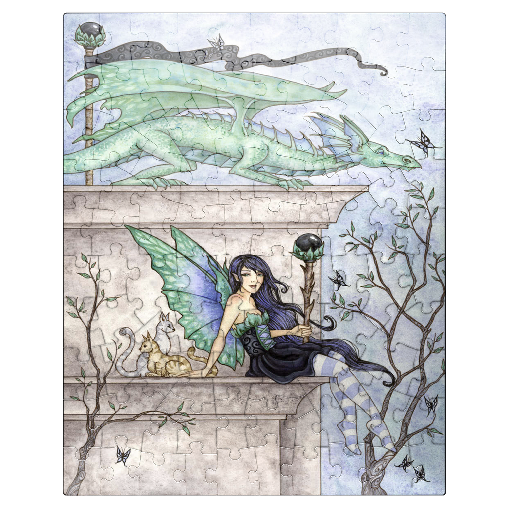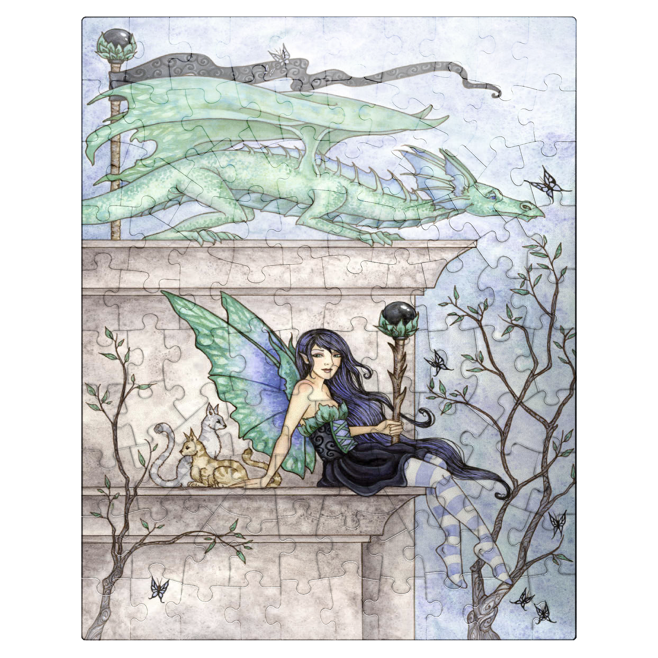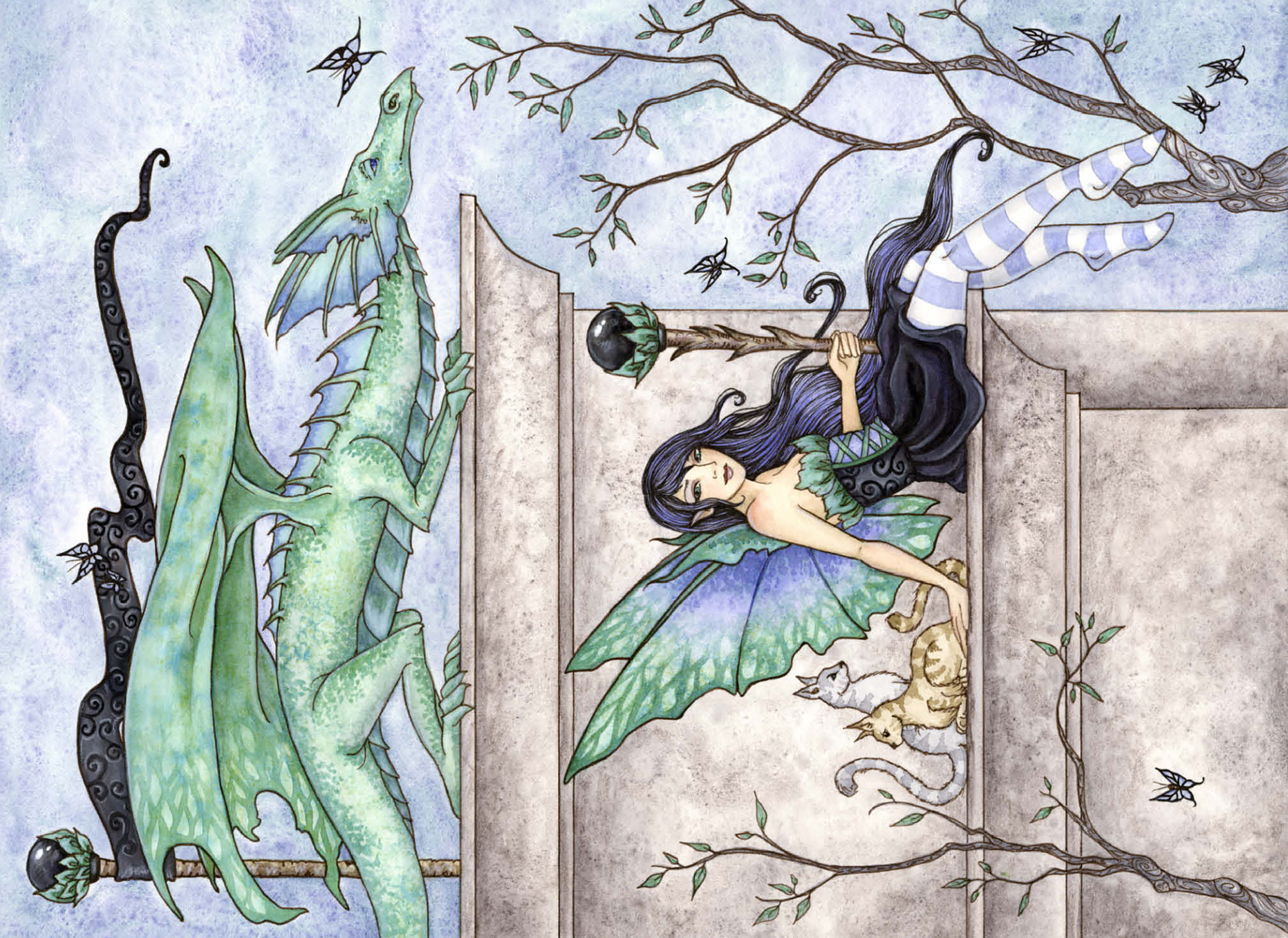 -Wind Watchers- features a faery in striped stockings and shimmering wings perched atop a high ledge, flanked by curious cats and dragon companions. With butterflies drifting by and the breeze tousling her hair, the scene is light, airy, and filled with quiet wonder.