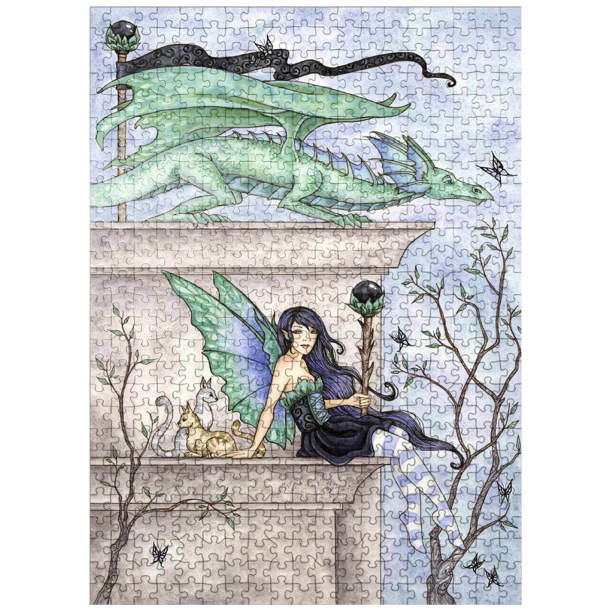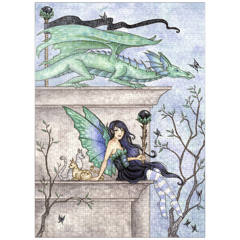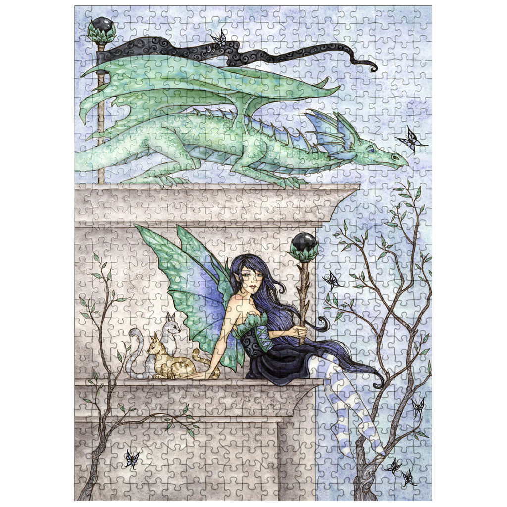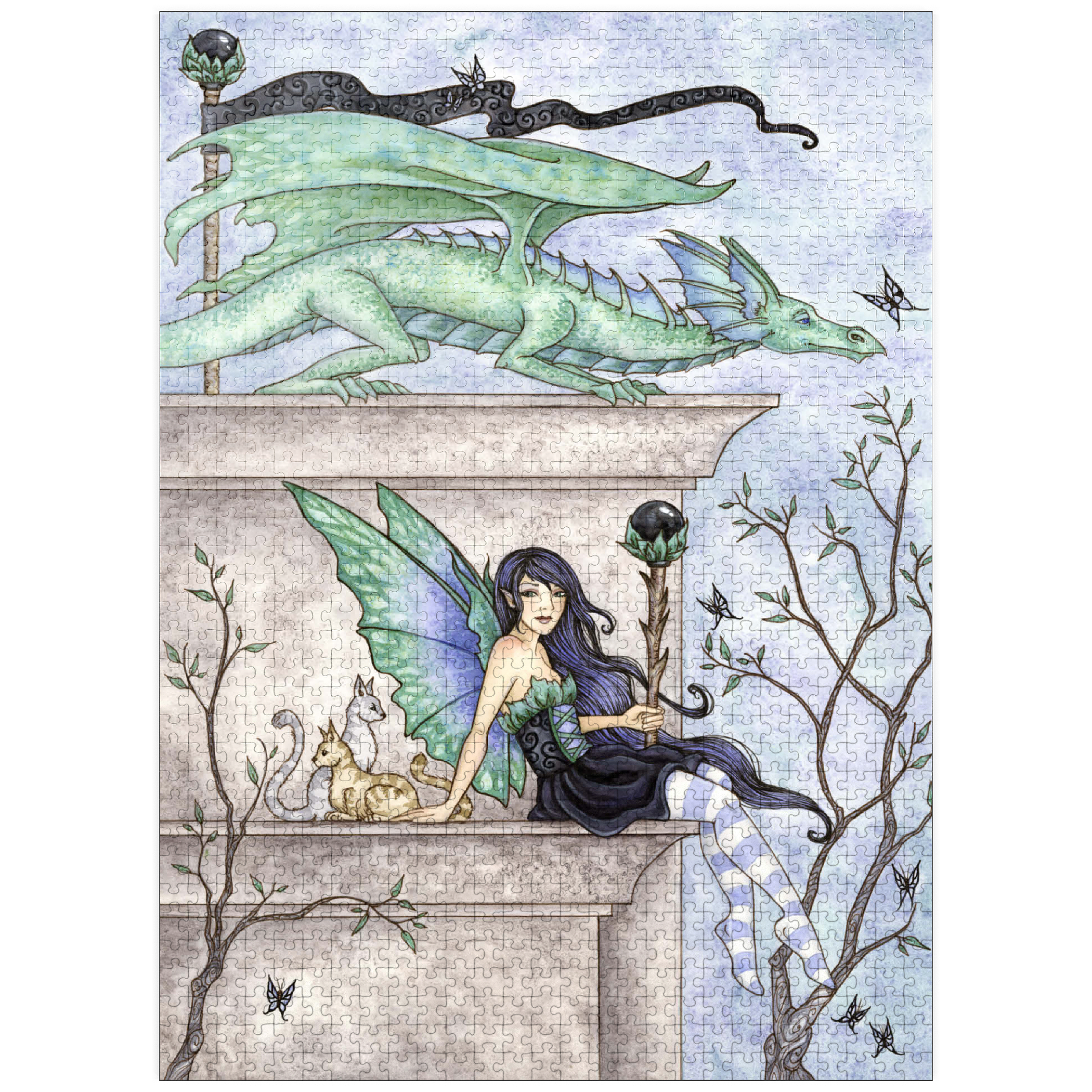 -Wind Watchers- features a faery in striped stockings and shimmering wings perched atop a high ledge, flanked by curious cats and dragon companions. With butterflies drifting by and the breeze tousling her hair, the scene is light, airy, and filled with quiet wonder.
