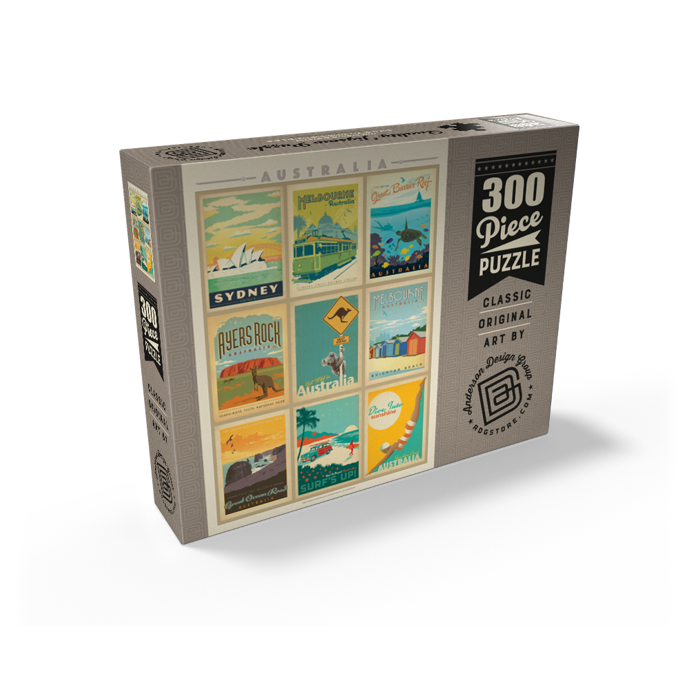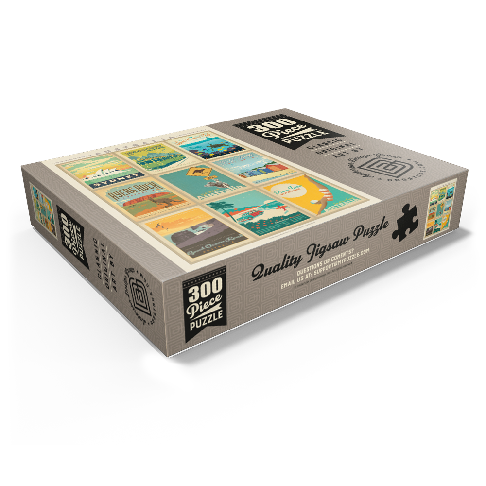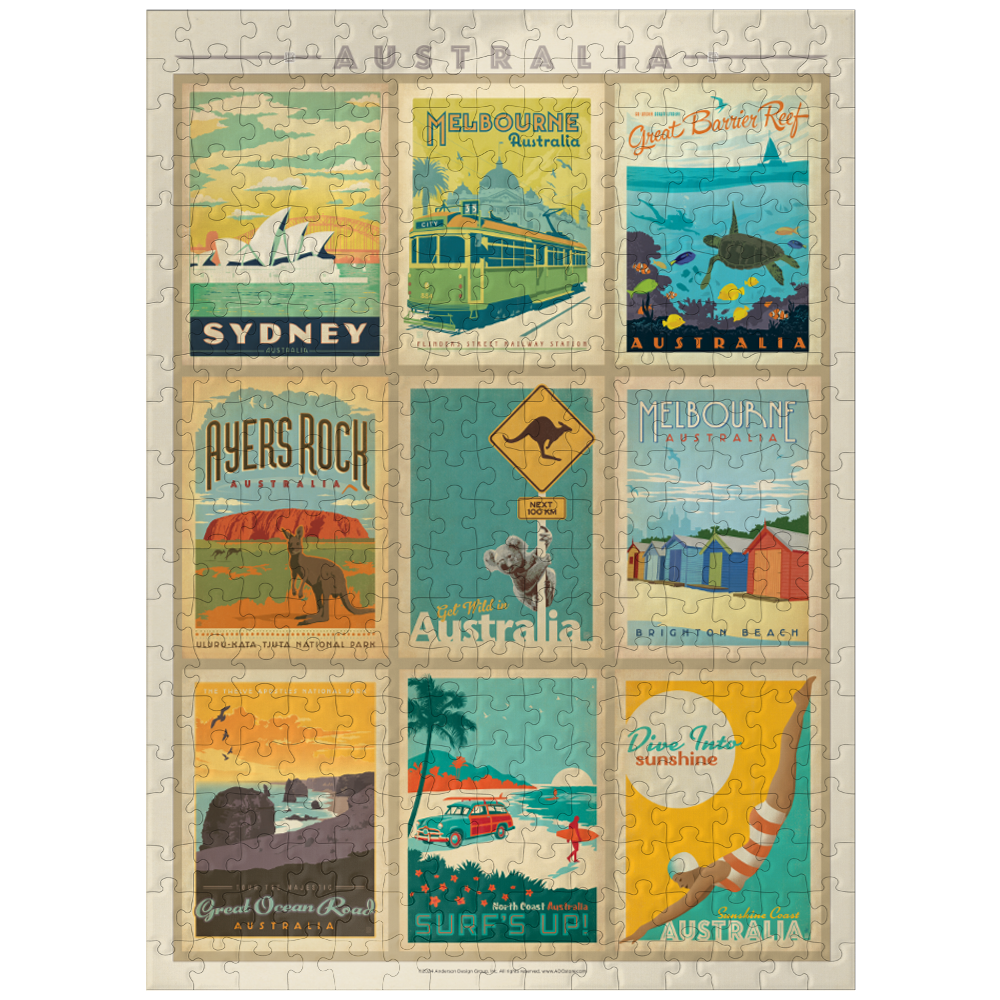 This multi-image print celebrates the diverse and stunning landscapes of Australia, from its vibrant coral reefs to its vast desert outbacks, lush rainforests, and rugged coastlines. Each image captures a unique aspect of Australia's natural beauty