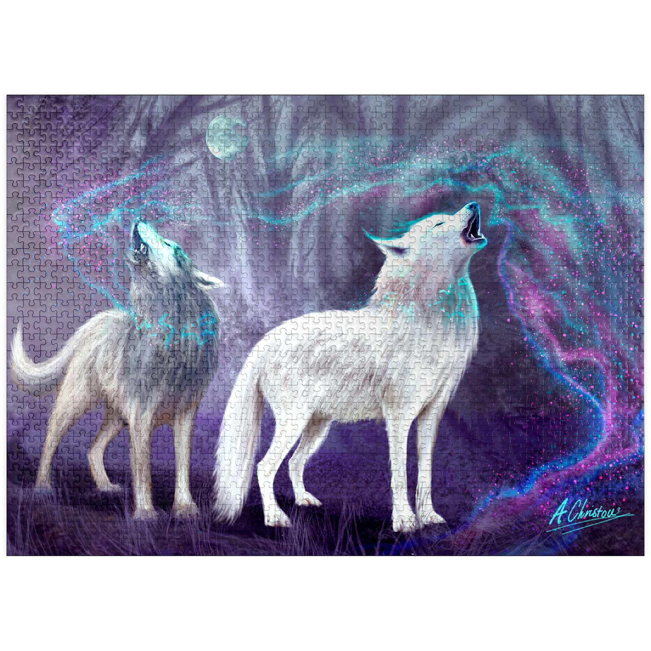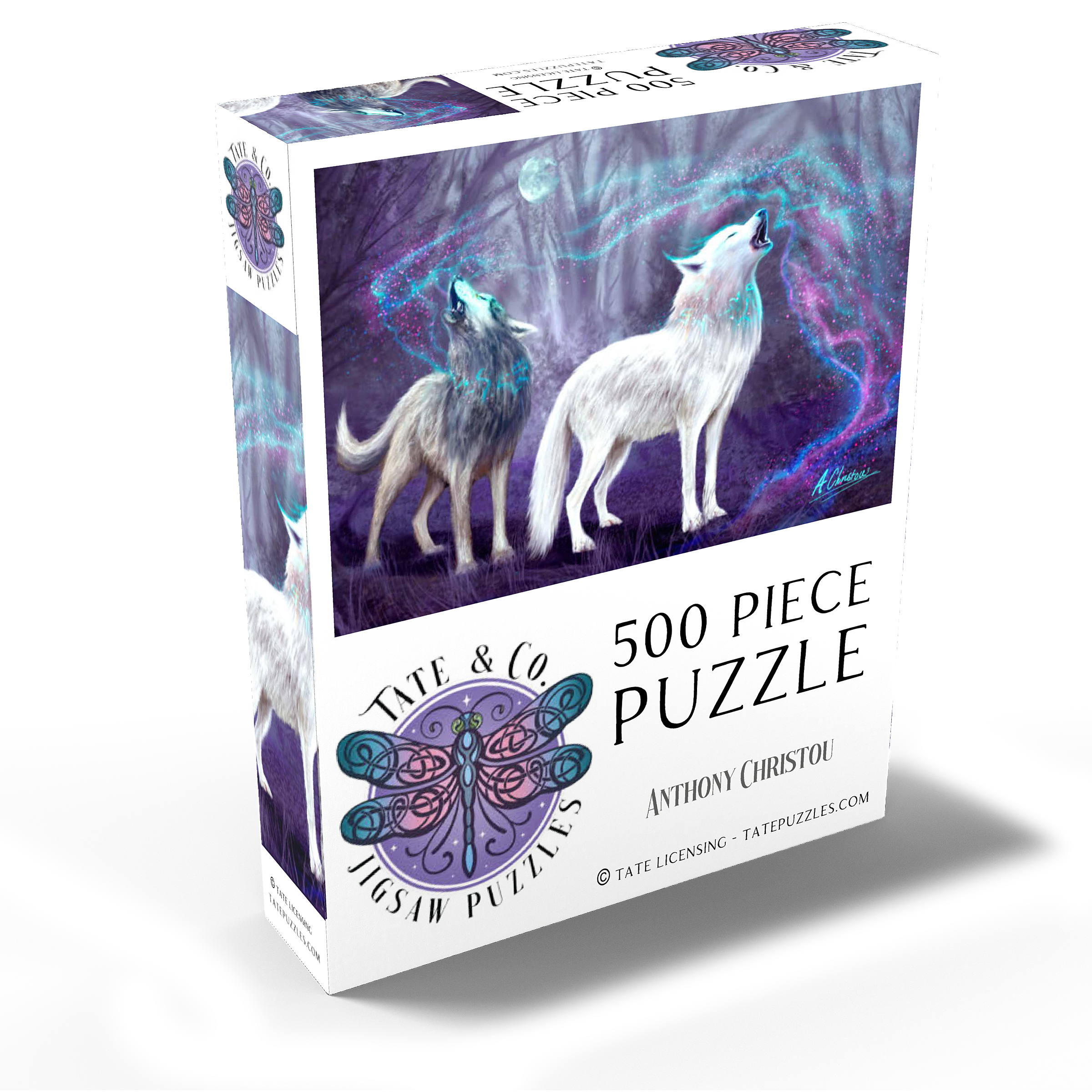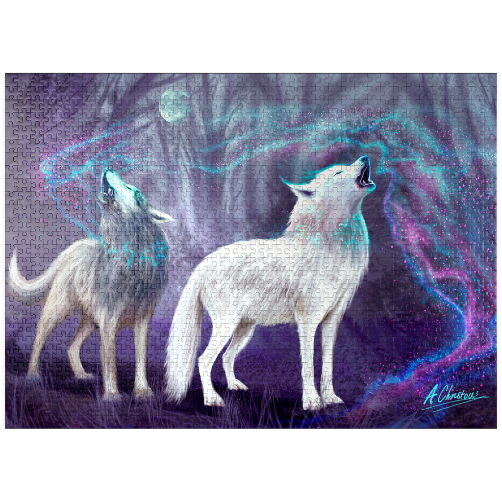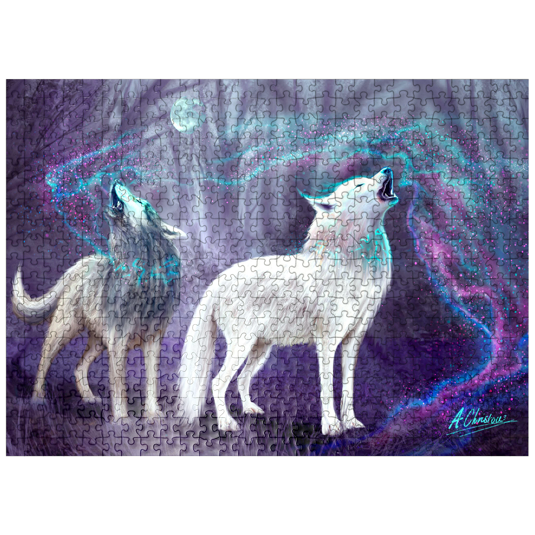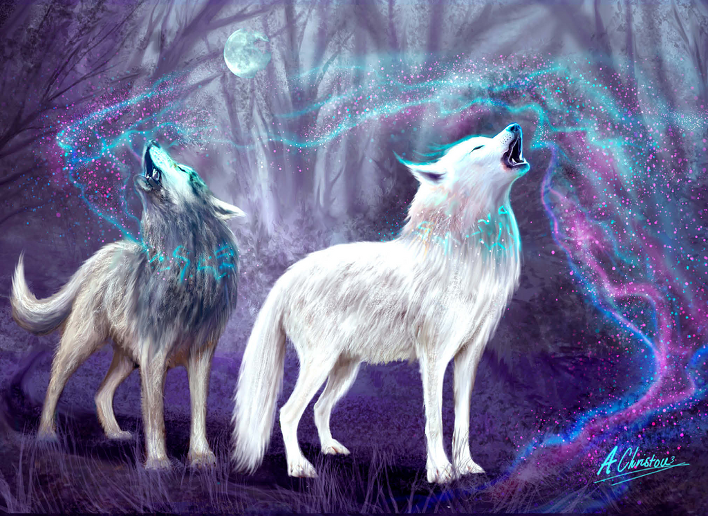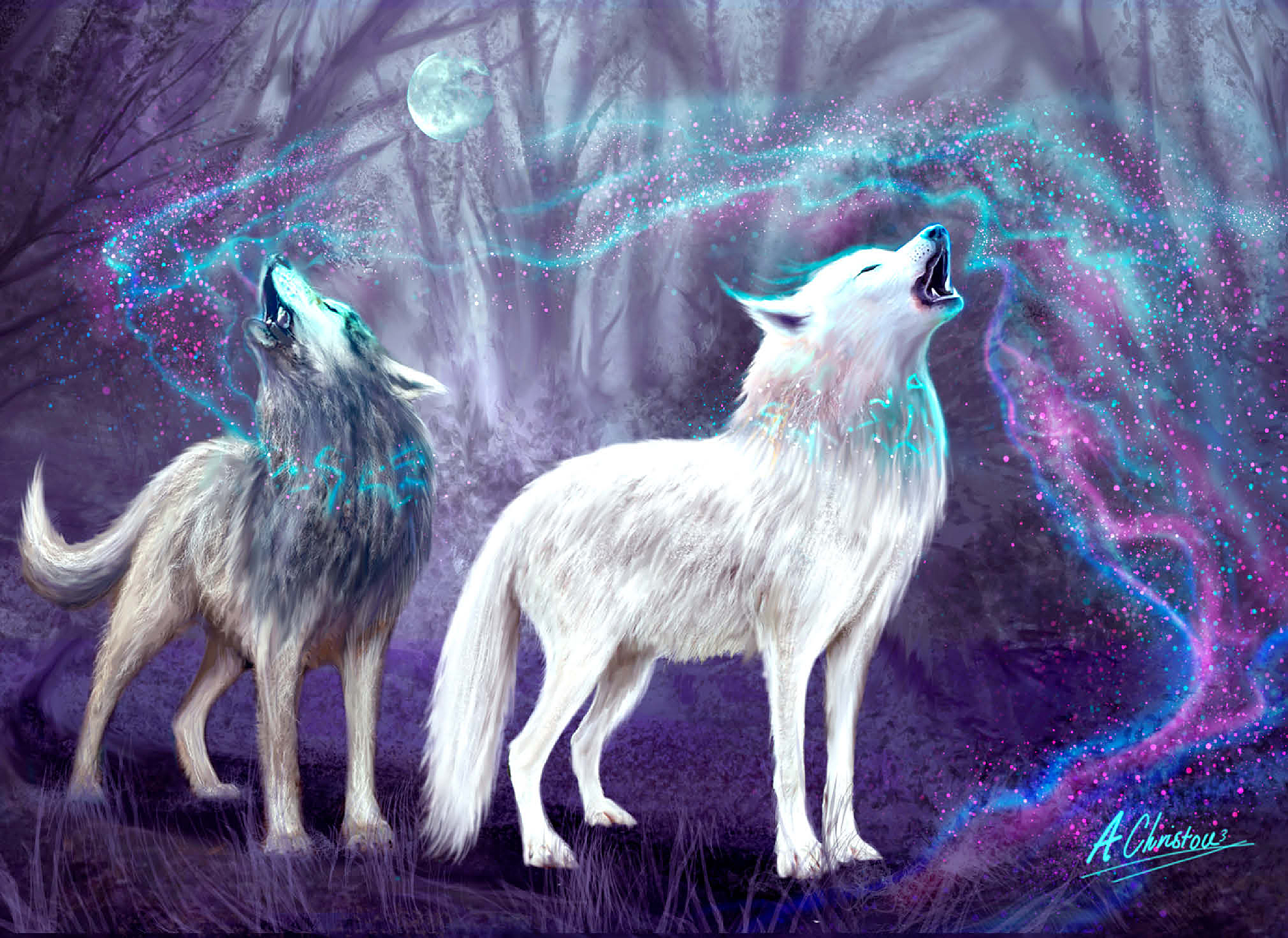 Experience the raw, mystical power of nature with Anthony Christou's -Wolves Howl- This stunning painting captures a breathtaking moment as a majestic white wolf and a fierce gray wolf unleash their calls to the heavens. They stand within a mysterious, purple-lit forest, where an ethereal glow permeates the air. Above them, a luminous full moon bathes the scene in its ancient light, while vibrant magical energy swirls around the wolves, amplifying their powerful song. Christou's artistry beautifully conveys the wild spirit and enchanting allure of these creatures, making -Wolves Howl- a captivating addition to any collection.