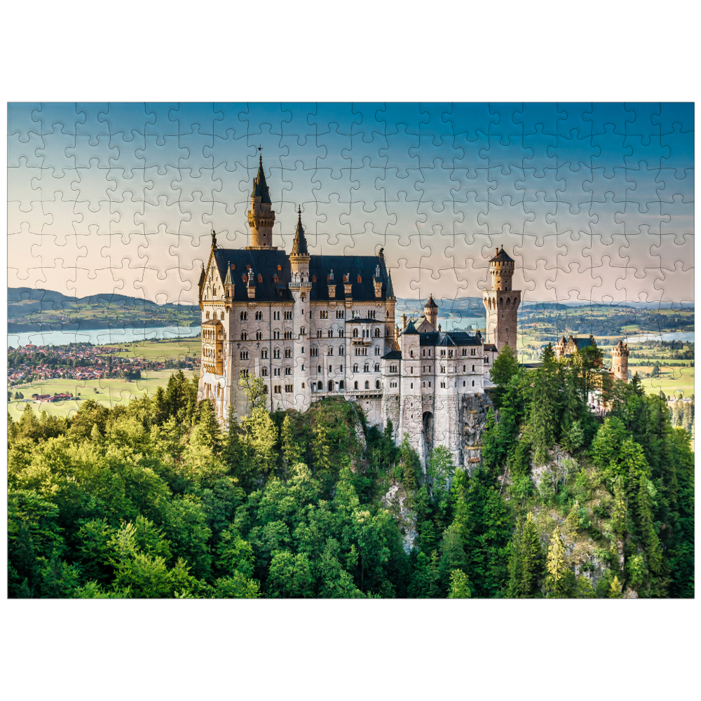 This beautiful jigsaw puzzle features a stunning image of Neuschwanstein Castle in Bavaria, Germany. The iconic castle, with its fairytale-like architecture and stunning surroundings, creates a truly breathtaking vista. The castle sits atop a rocky cliff, surrounded by lush green forests and the majestic Bavarian Alps.