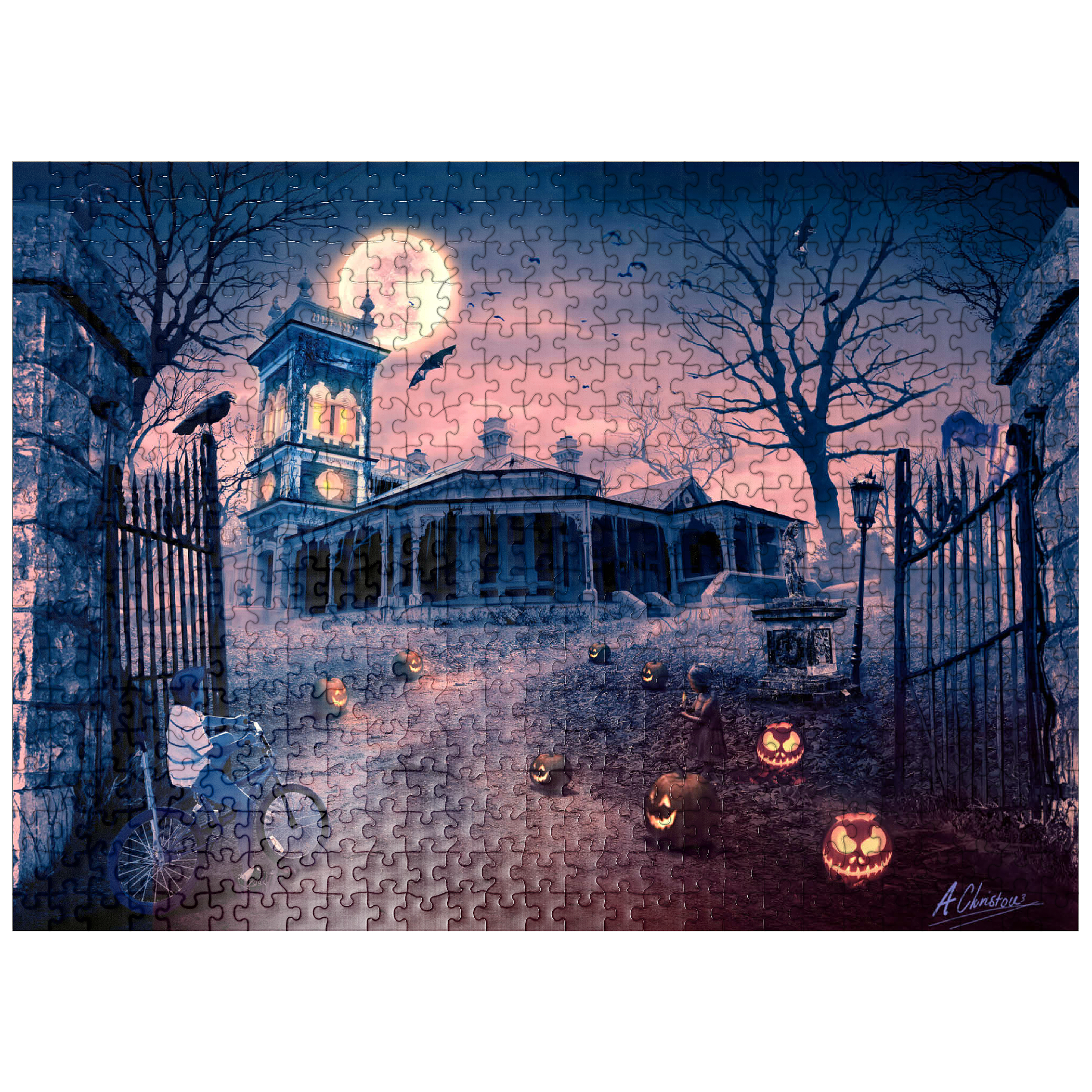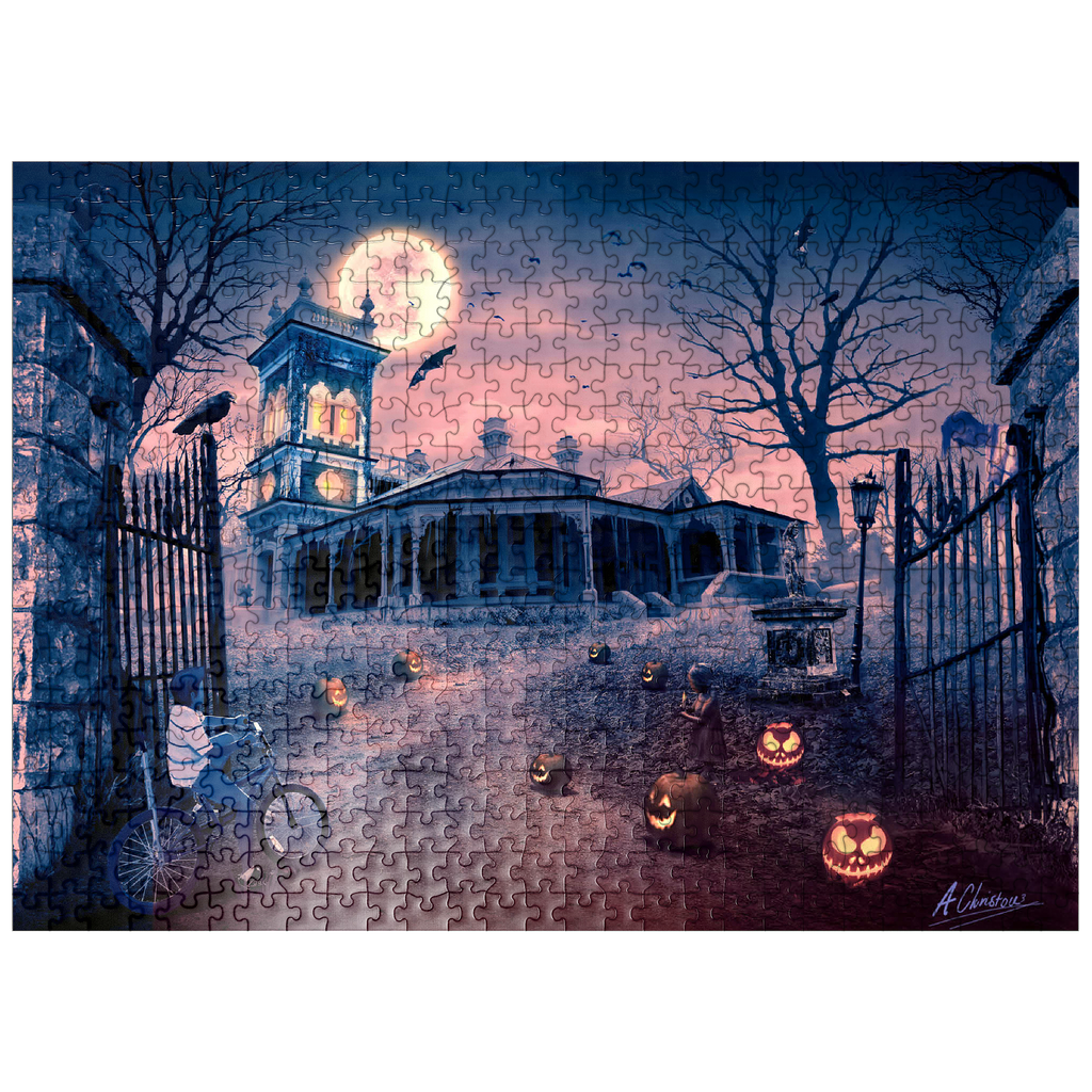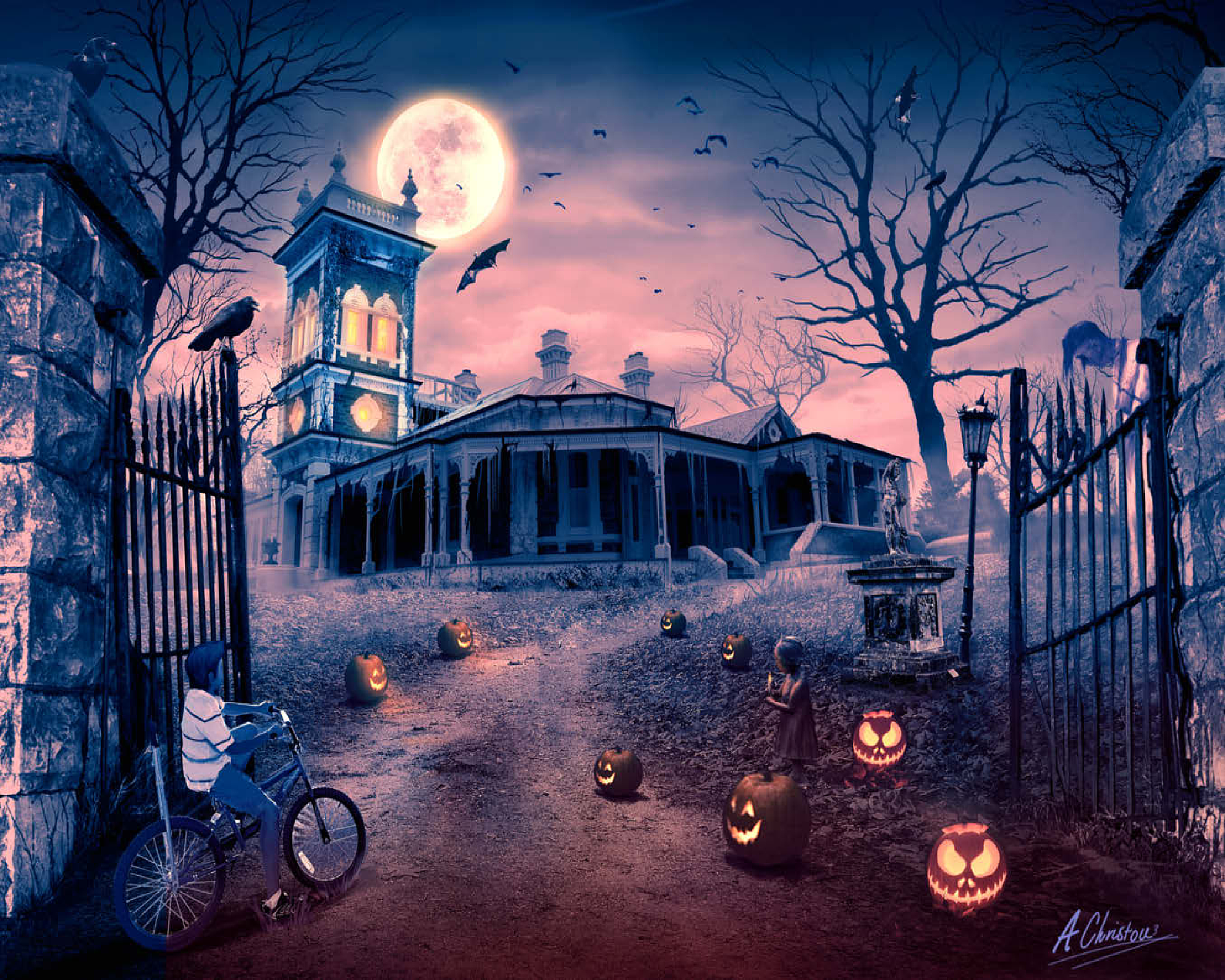 Manor of Madness is a haunting Halloween scene filled with eerie detail and creeping dread. On the left, a lone boy rides his bike past a shadowy, decrepit manor lit only by a glowing full moon. Jack-o'-lanterns flicker with sinister grins along the path, casting twisted shadows. Strange, ghostly figures lurk in the background-watchful, still, and unnerving. Crows perch ominously on crooked branches as bats swirl overhead, adding movement to the chilling stillness. Rendered in moody tones with bursts of orange from the lanterns, this horror-themed painting evokes classic Halloween thrills and unsettling mystery.