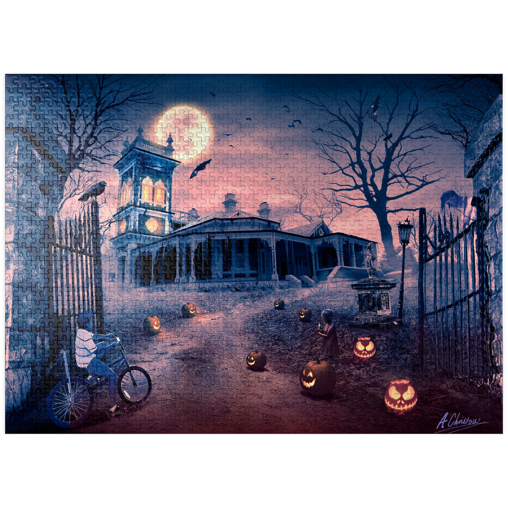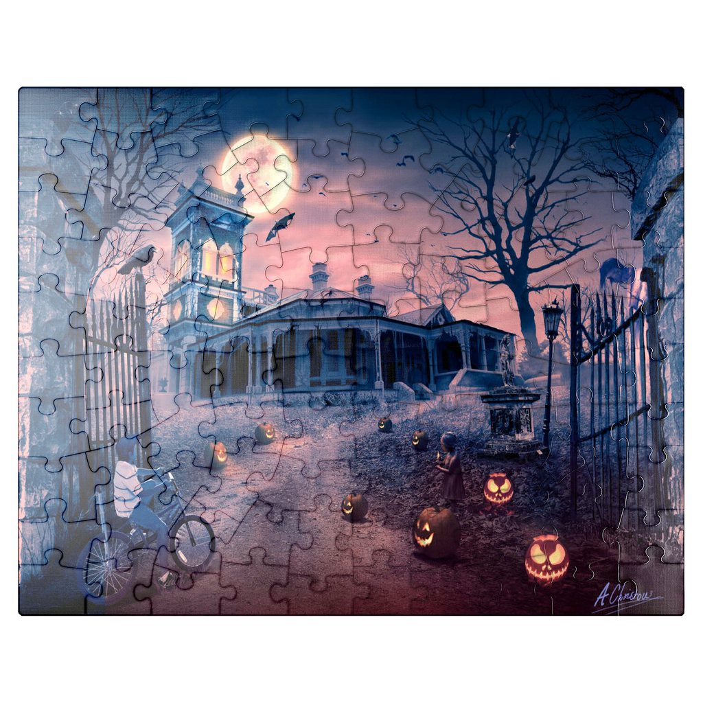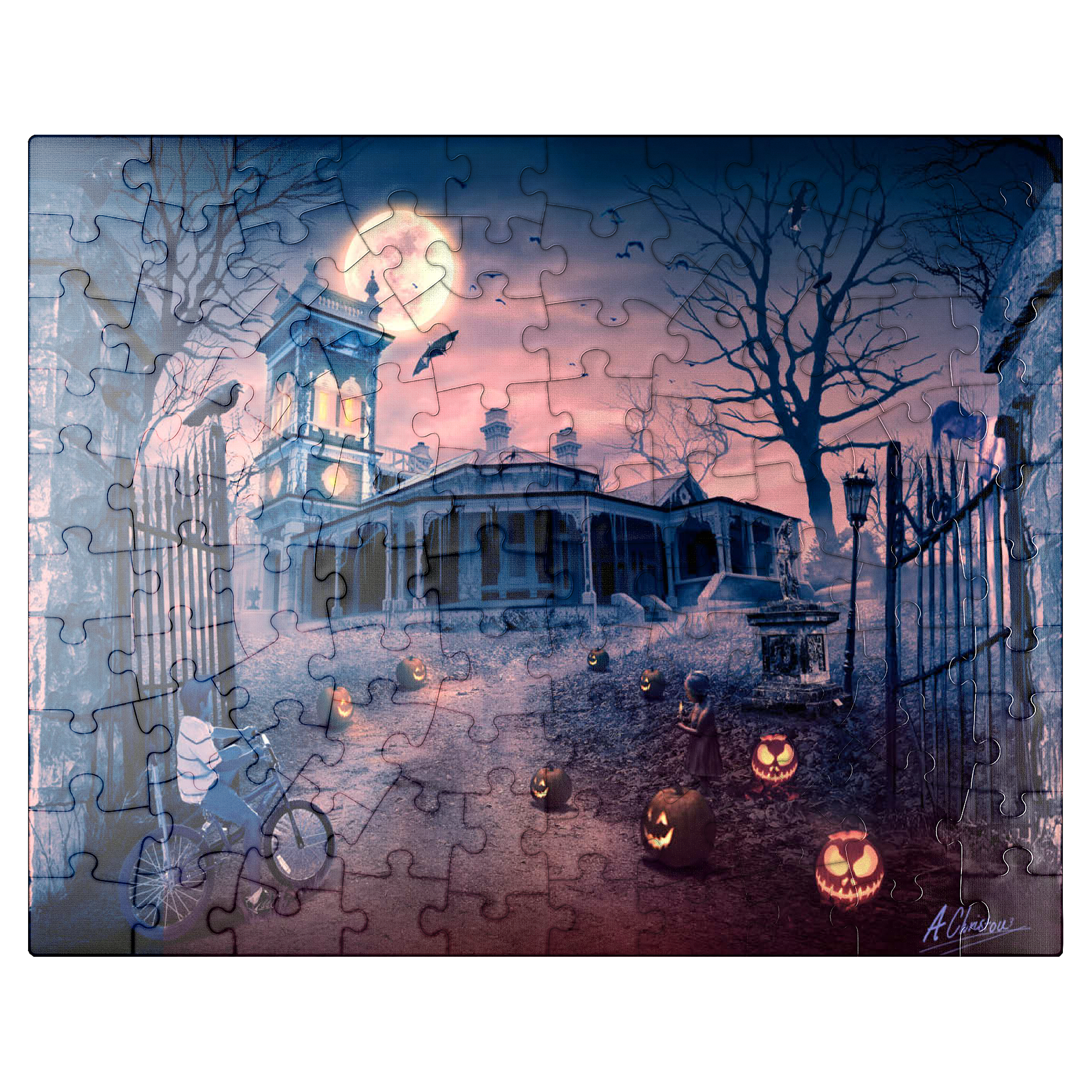 Manor of Madness is a haunting Halloween scene filled with eerie detail and creeping dread. On the left, a lone boy rides his bike past a shadowy, decrepit manor lit only by a glowing full moon. Jack-o'-lanterns flicker with sinister grins along the path, casting twisted shadows. Strange, ghostly figures lurk in the background-watchful, still, and unnerving. Crows perch ominously on crooked branches as bats swirl overhead, adding movement to the chilling stillness. Rendered in moody tones with bursts of orange from the lanterns, this horror-themed painting evokes classic Halloween thrills and unsettling mystery.
