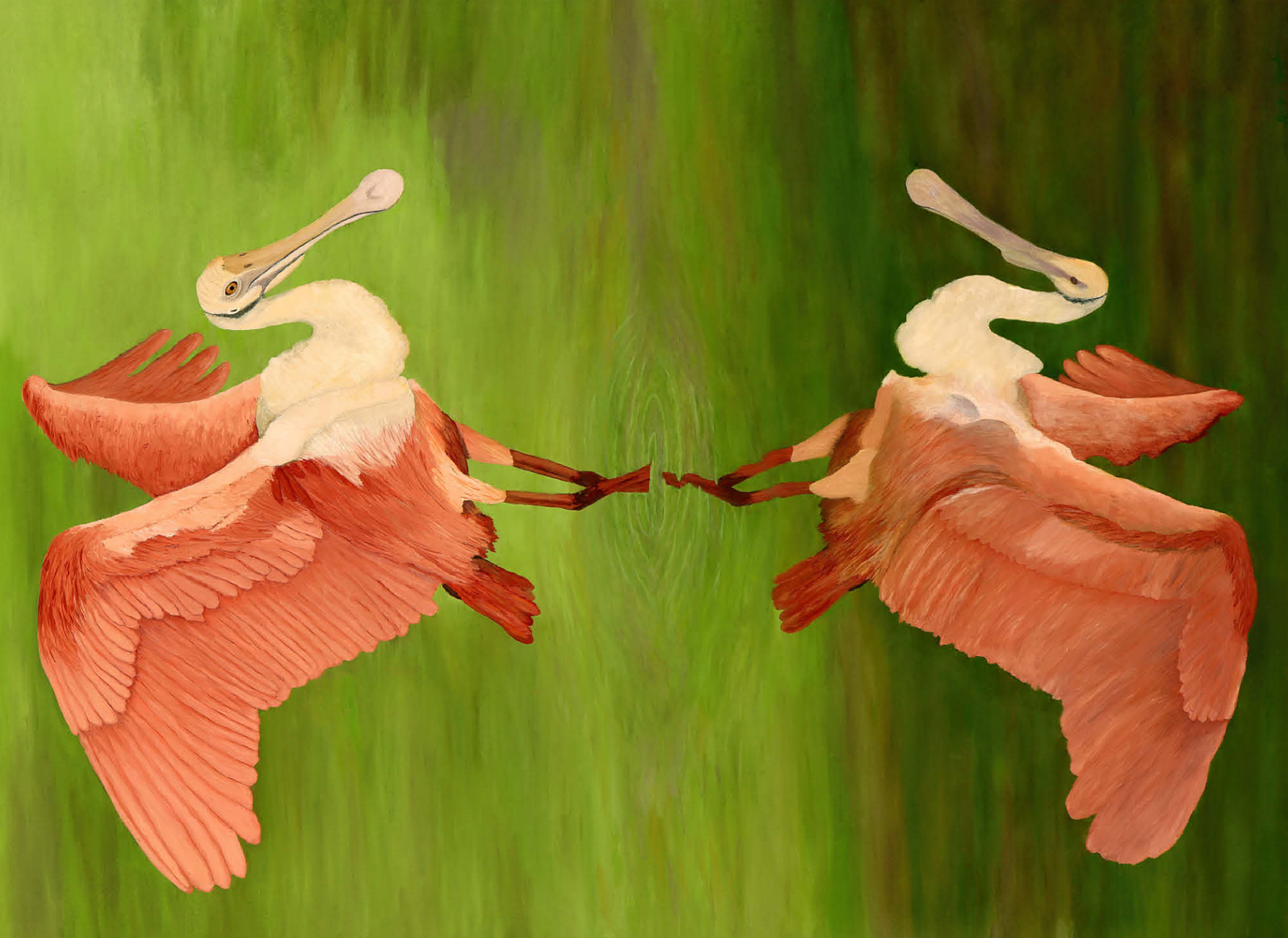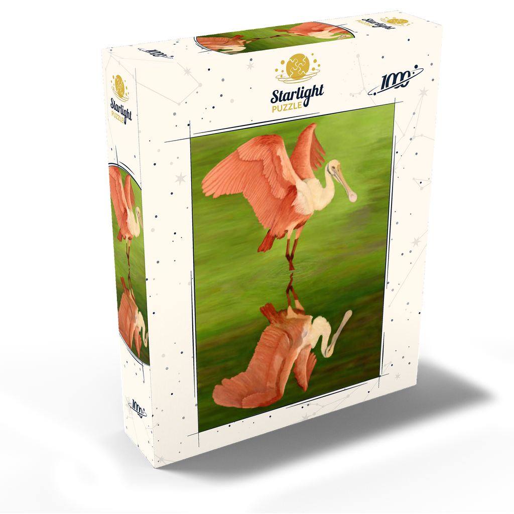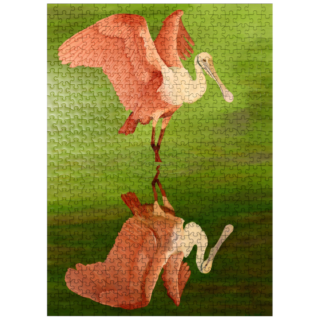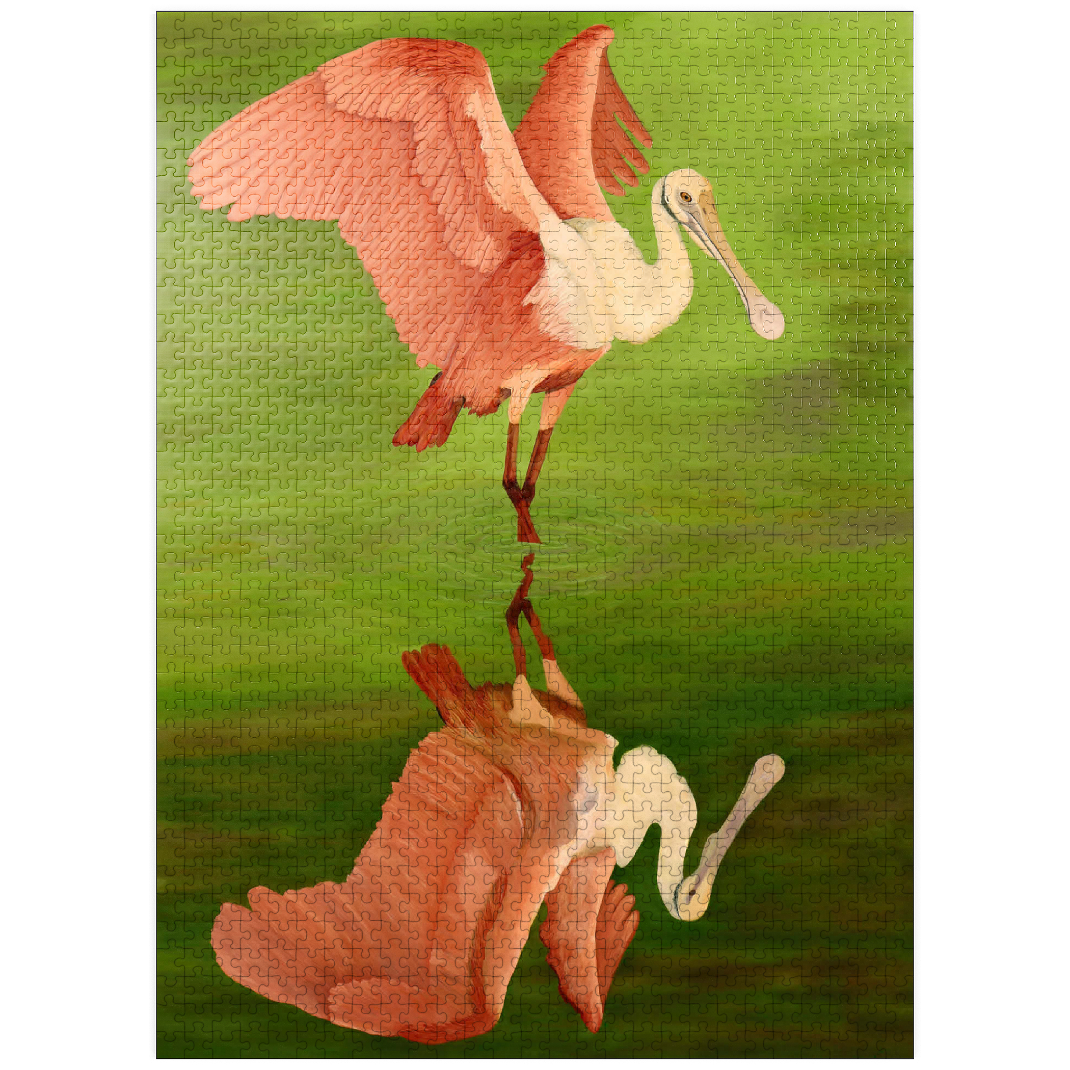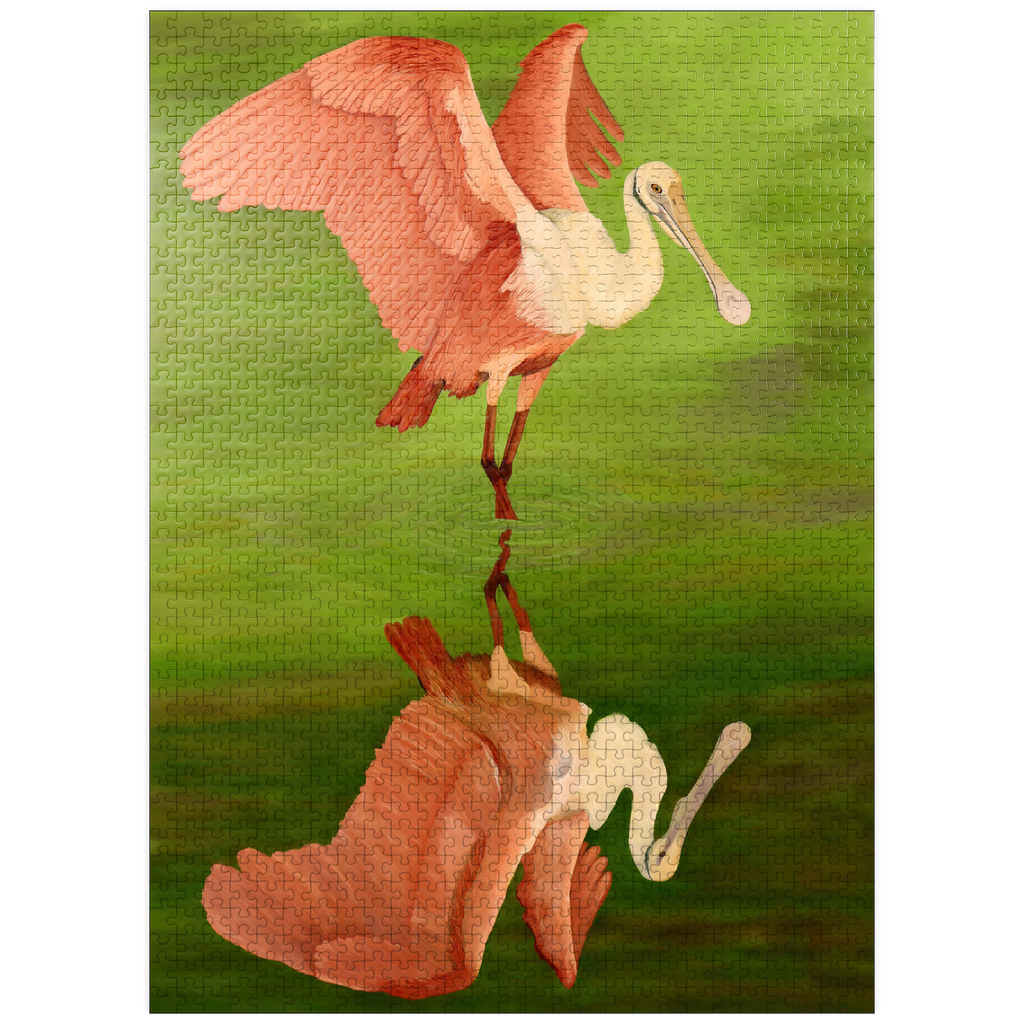 A vibrant depiction of a roseate spoonbill wading gracefully in a calm, green-hued wetland. The bird's striking pink wings are beautifully spread, while its unique spoon-shaped bill adds an elegant touch. Below, the tranquil water perfectly mirrors the spoonbill, creating a stunning symmetrical reflection that enhances the serene atmosphere. This artwork captures the beauty and poise of this iconic wading bird in its natural habitat, celebrating the harmony of nature.