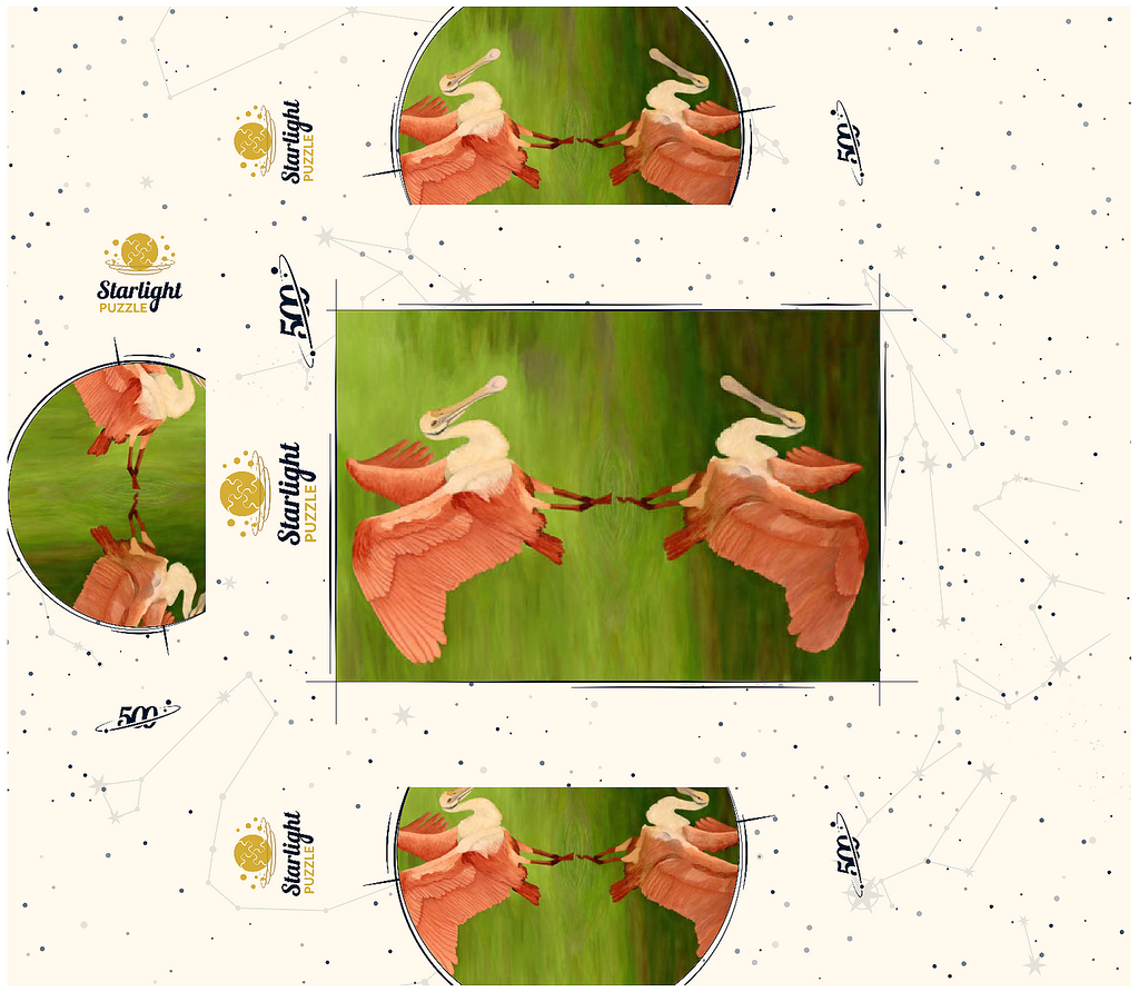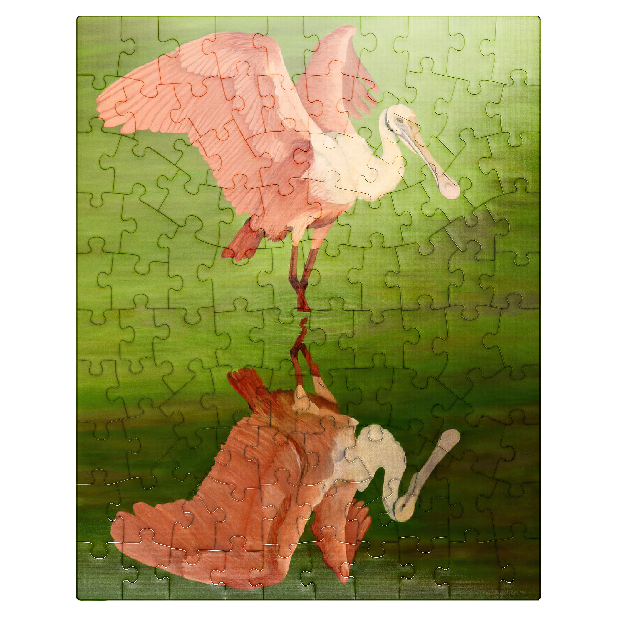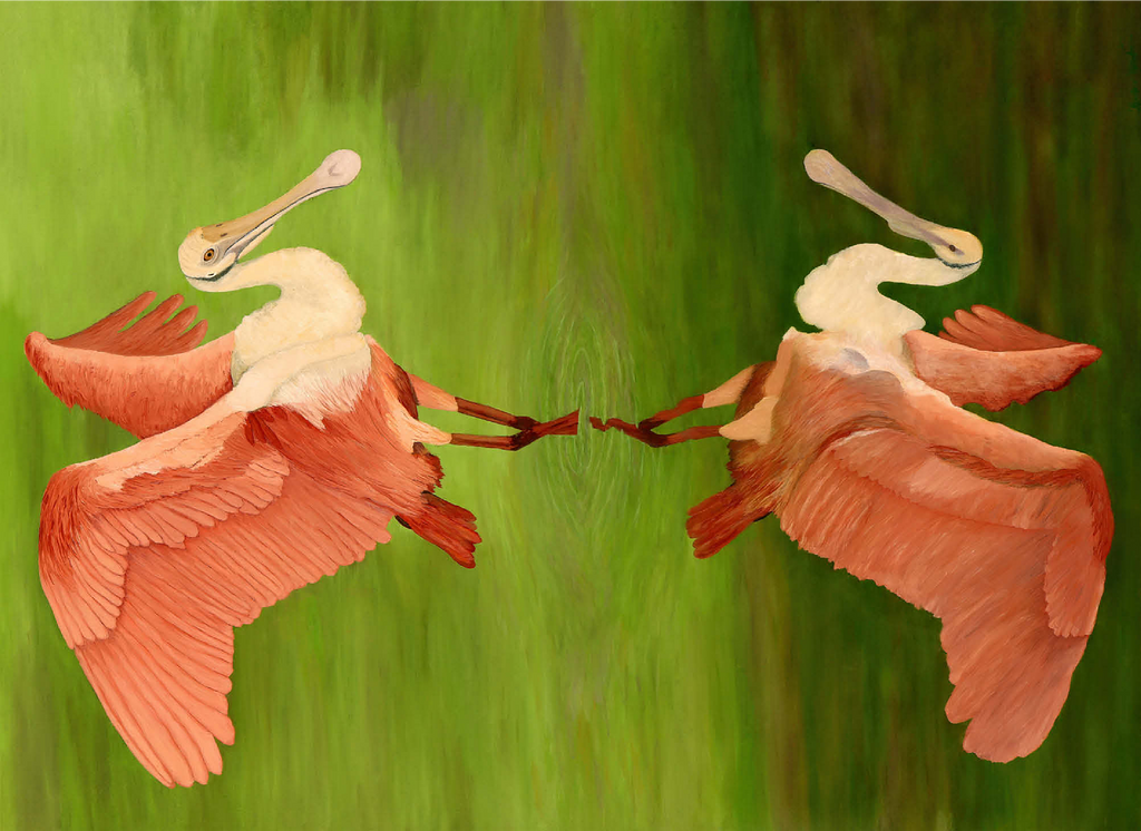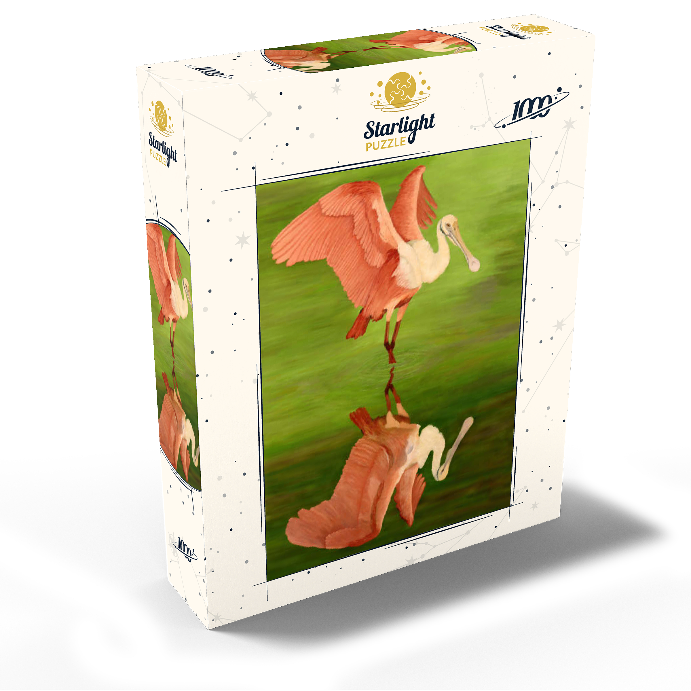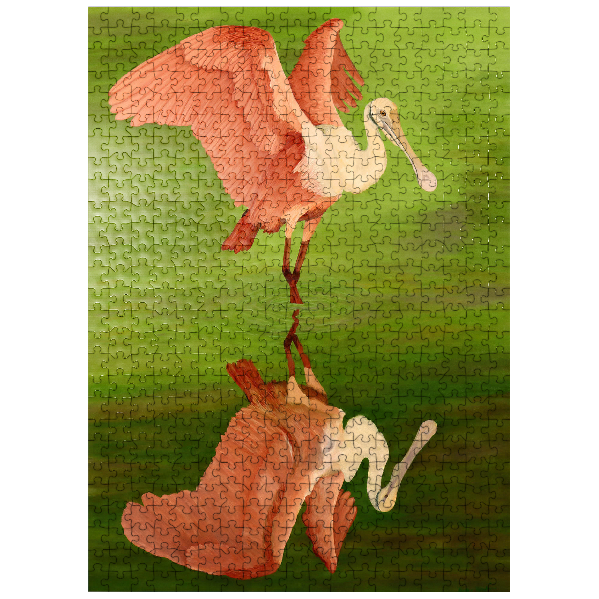 A vibrant depiction of a roseate spoonbill wading gracefully in a calm, green-hued wetland. The bird's striking pink wings are beautifully spread, while its unique spoon-shaped bill adds an elegant touch. Below, the tranquil water perfectly mirrors the spoonbill, creating a stunning symmetrical reflection that enhances the serene atmosphere. This artwork captures the beauty and poise of this iconic wading bird in its natural habitat, celebrating the harmony of nature.
