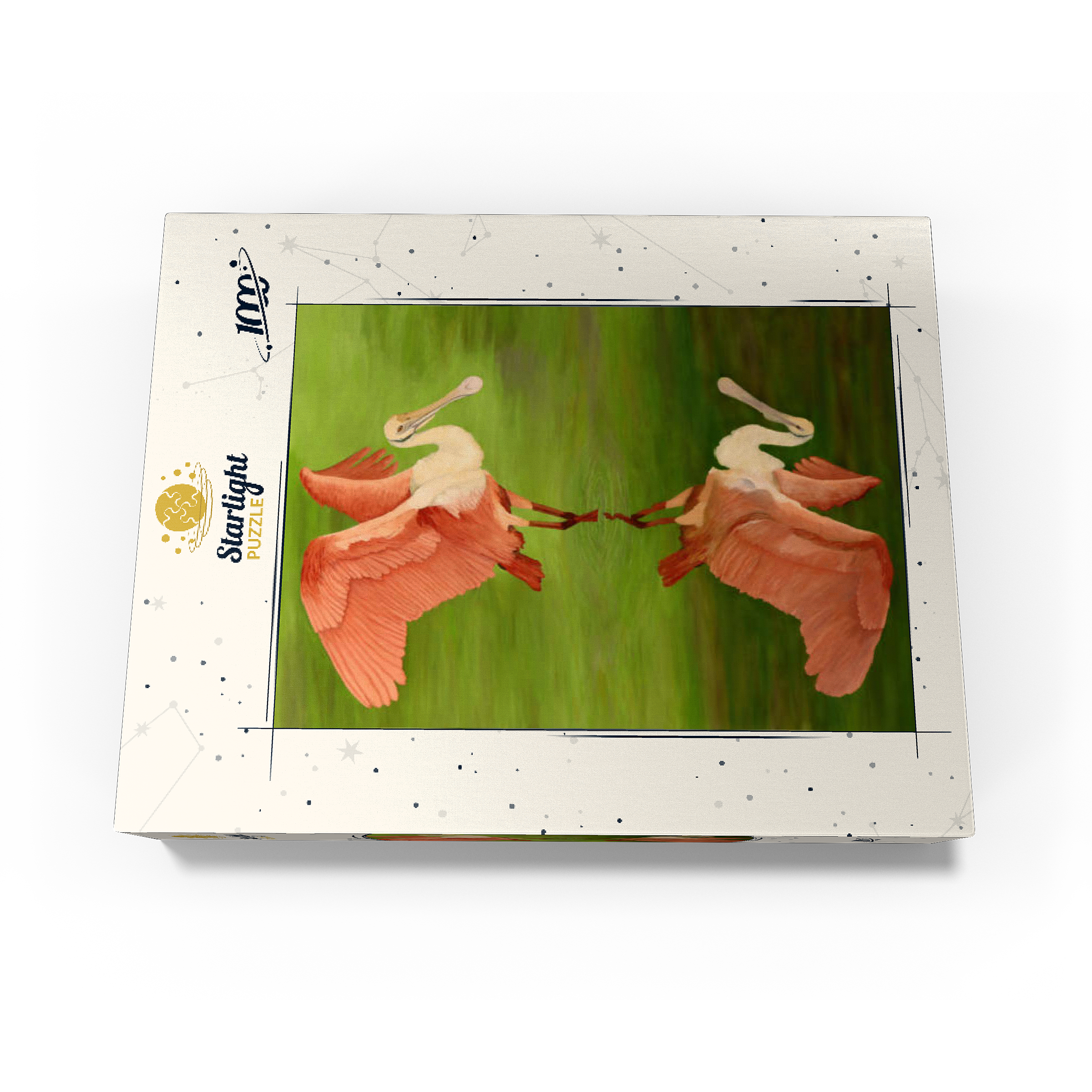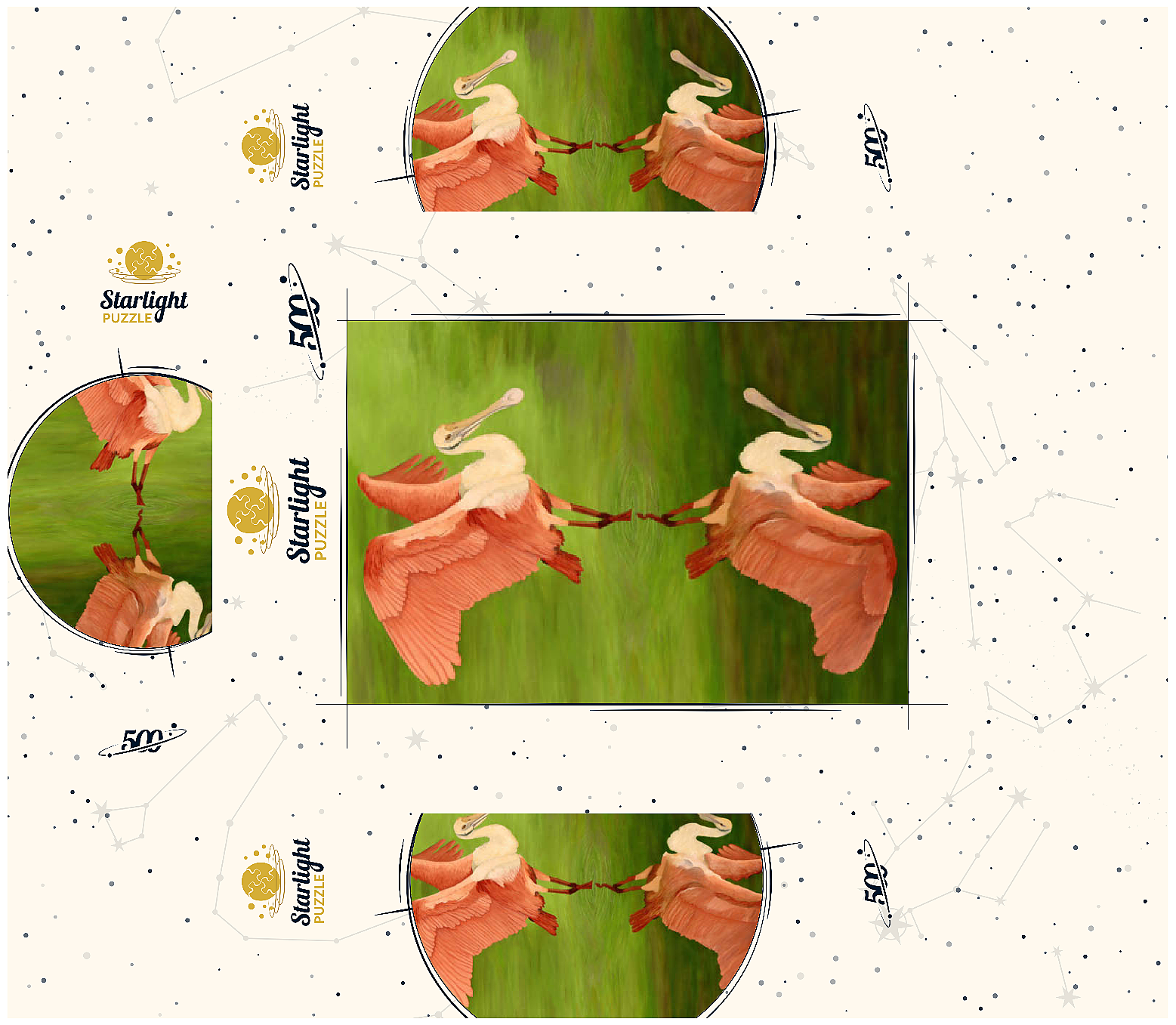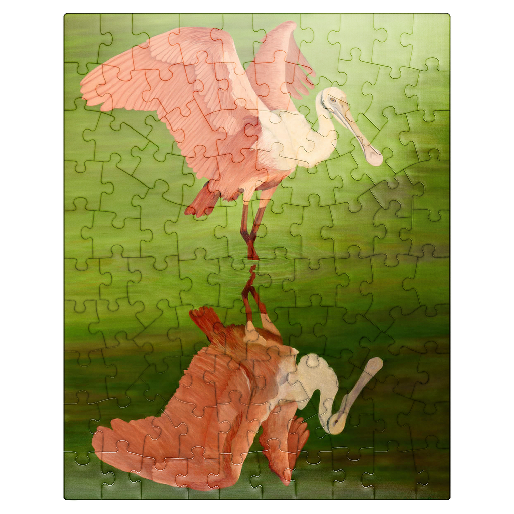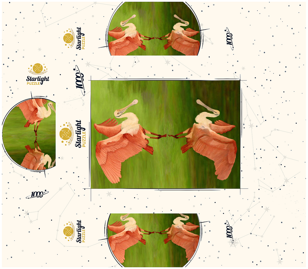 A vibrant depiction of a roseate spoonbill wading gracefully in a calm, green-hued wetland. The bird's striking pink wings are beautifully spread, while its unique spoon-shaped bill adds an elegant touch. Below, the tranquil water perfectly mirrors the spoonbill, creating a stunning symmetrical reflection that enhances the serene atmosphere. This artwork captures the beauty and poise of this iconic wading bird in its natural habitat, celebrating the harmony of nature.