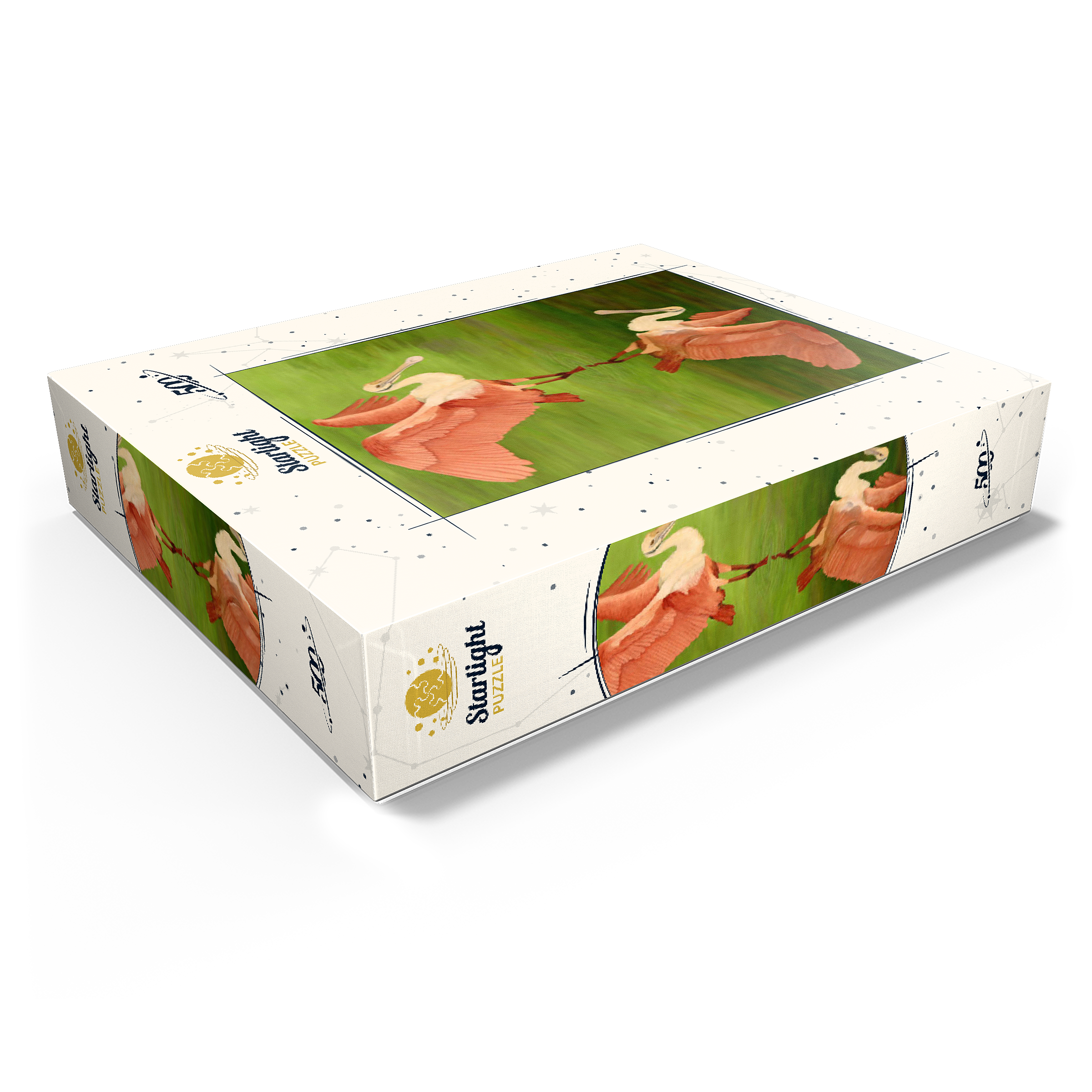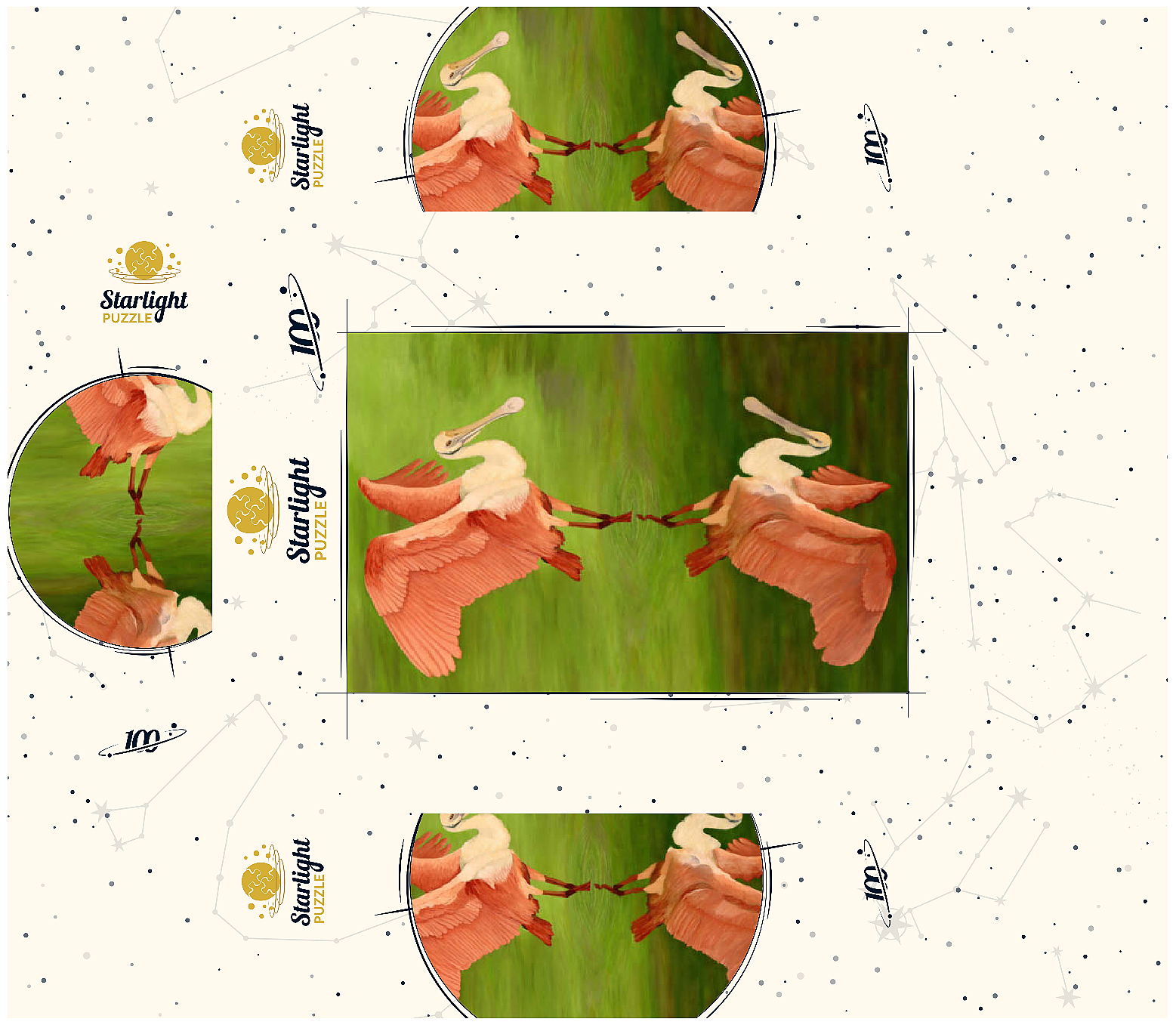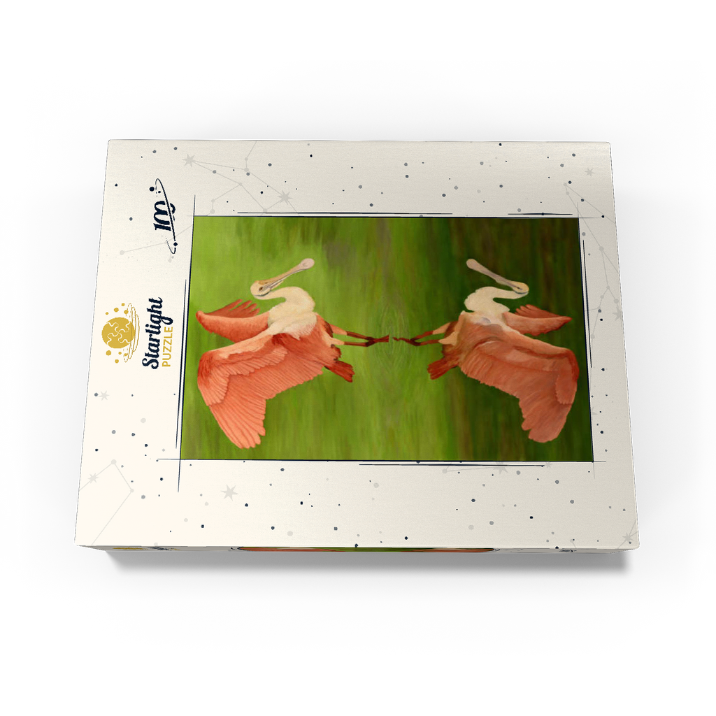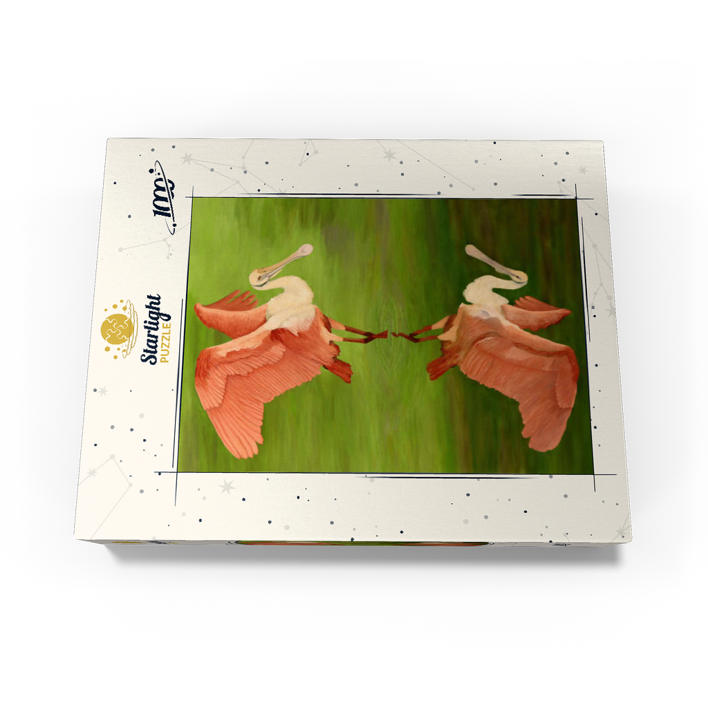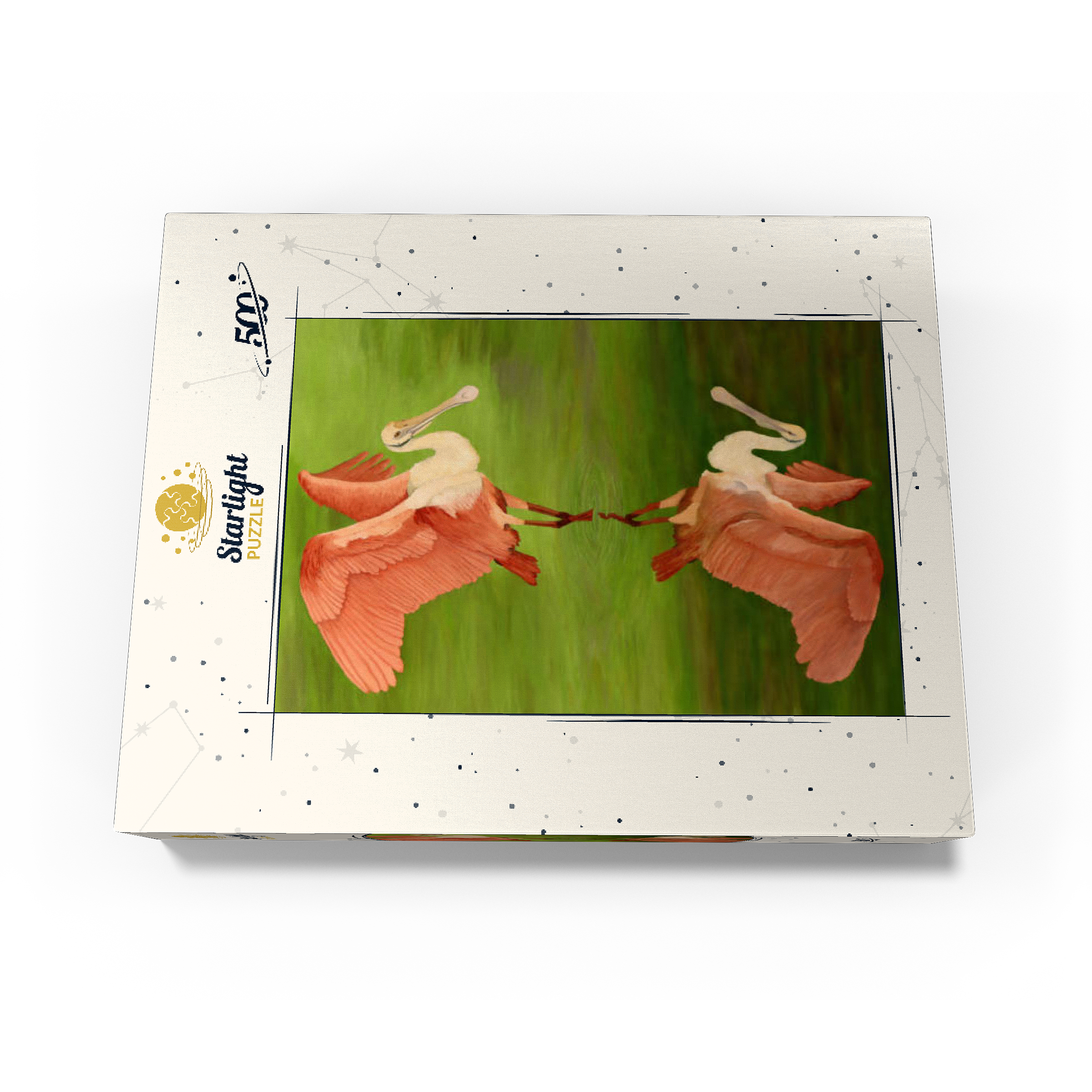 A vibrant depiction of a roseate spoonbill wading gracefully in a calm, green-hued wetland. The bird's striking pink wings are beautifully spread, while its unique spoon-shaped bill adds an elegant touch. Below, the tranquil water perfectly mirrors the spoonbill, creating a stunning symmetrical reflection that enhances the serene atmosphere. This artwork captures the beauty and poise of this iconic wading bird in its natural habitat, celebrating the harmony of nature.