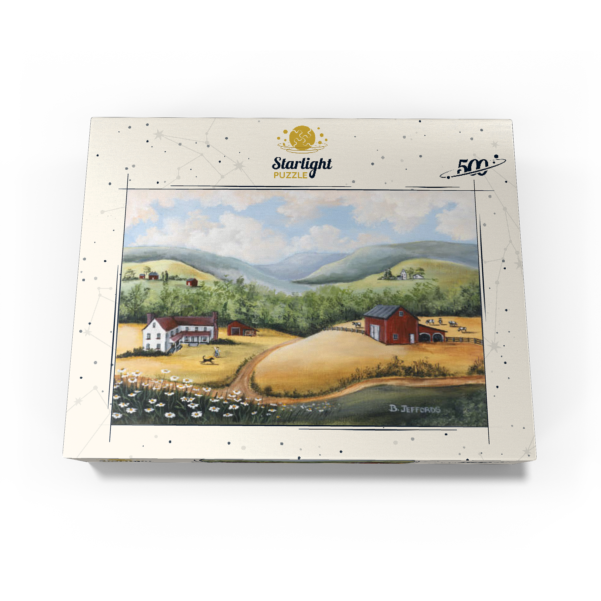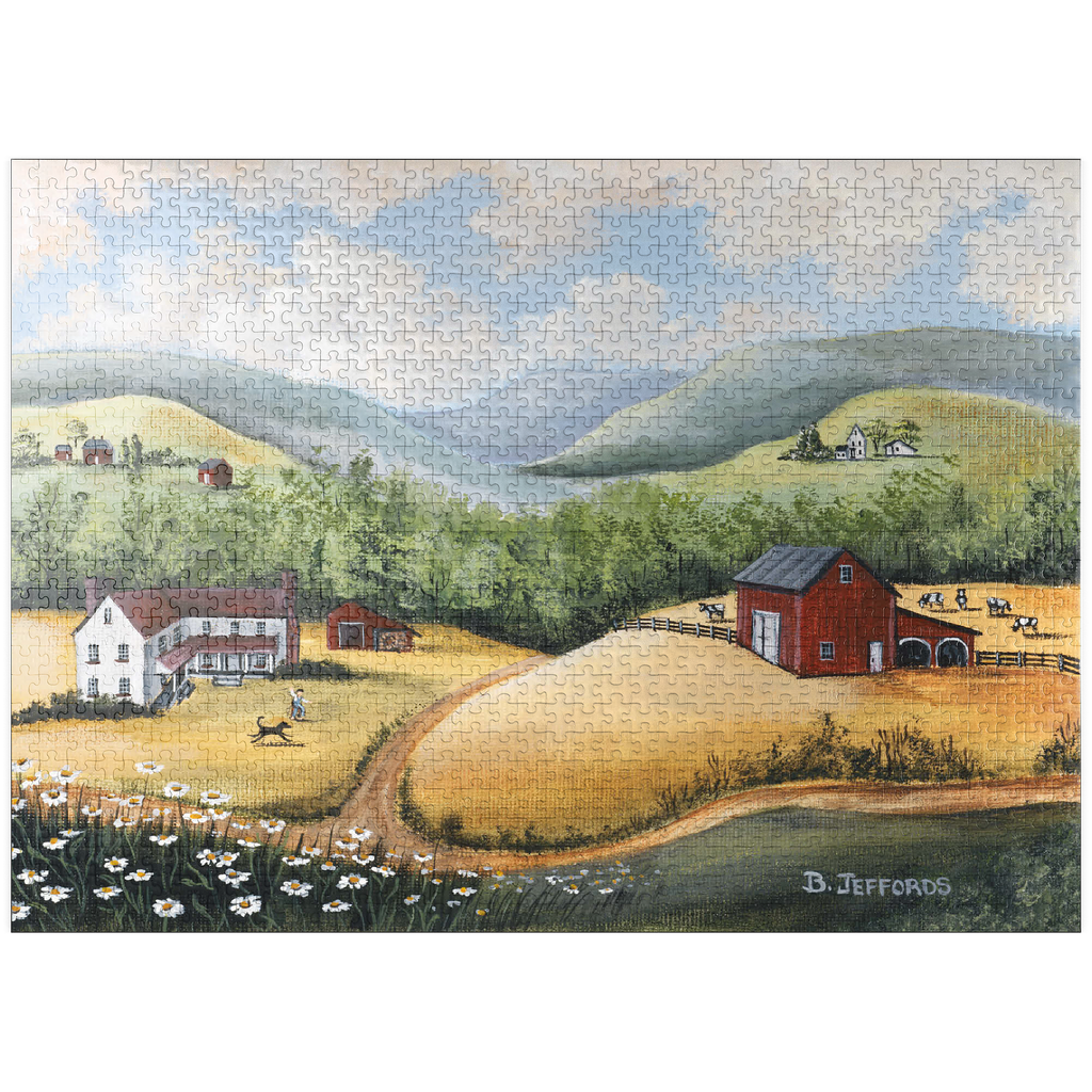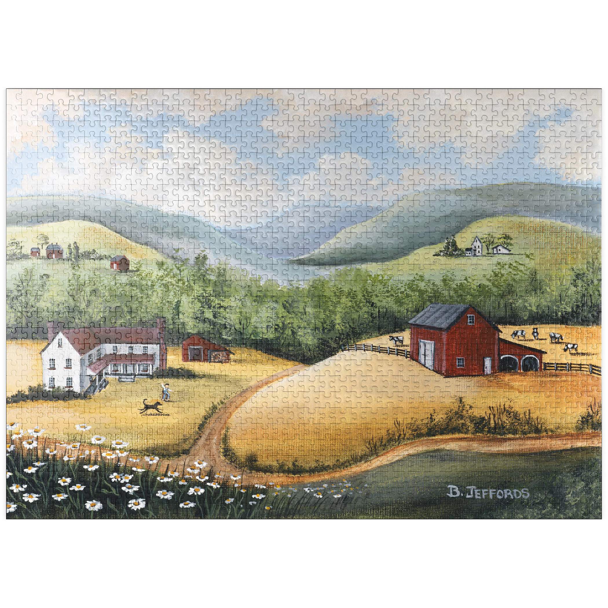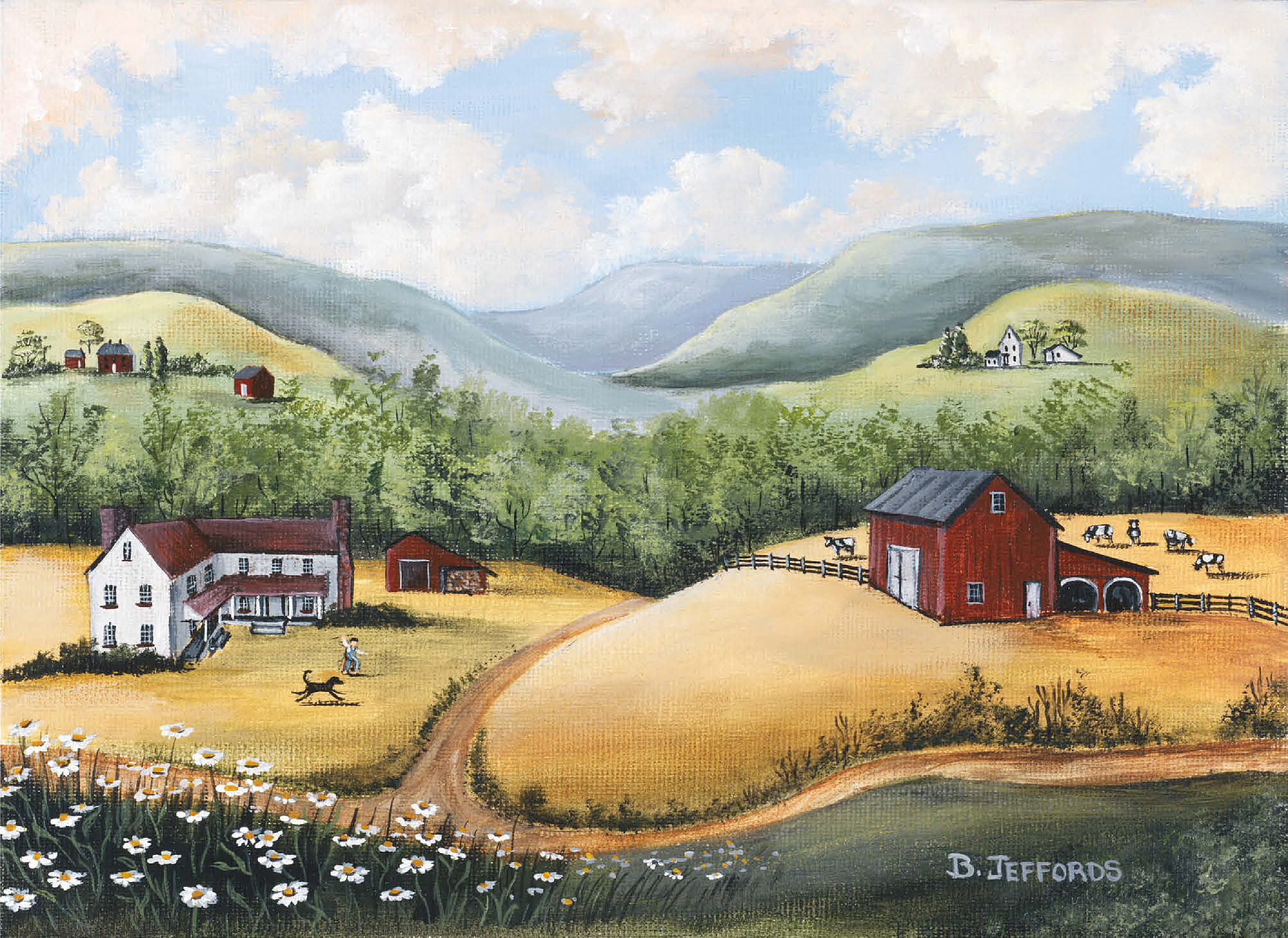 This charming folk art painting captures a peaceful rural farm scene with rolling green hills, a red barn, and a white farmhouse. The golden fields are dotted with grazing cows, quaint farm buildings, and a winding dirt road leading through the idyllic countryside. Delicate wildflowers in the foreground and distant homesteads in the background add to the nostalgic and timeless feel of early American farm life. The soft colors and detailed brushstrokes create a warm and inviting atmosphere, making this artwork a perfect addition to farmhouse décor or folk art collections.