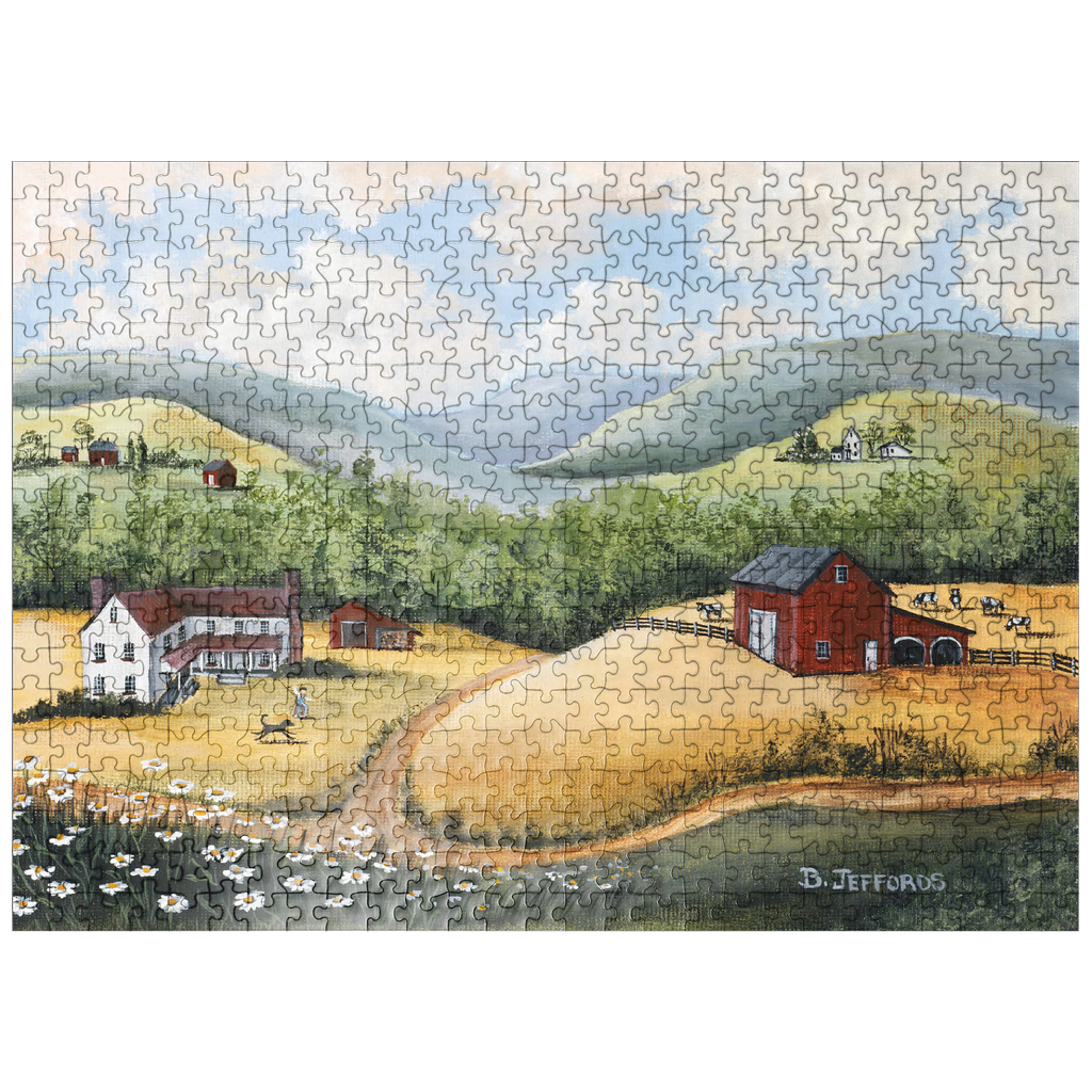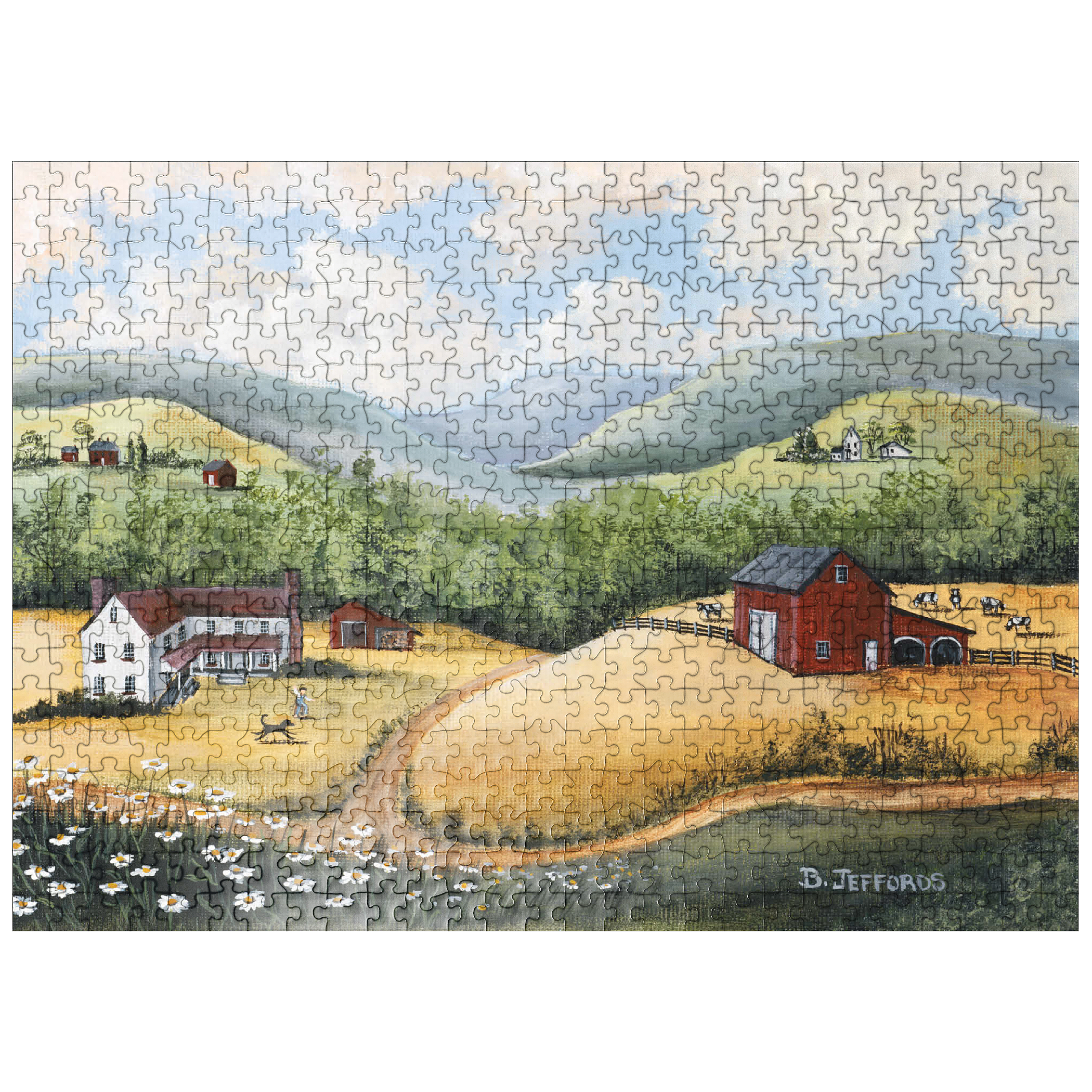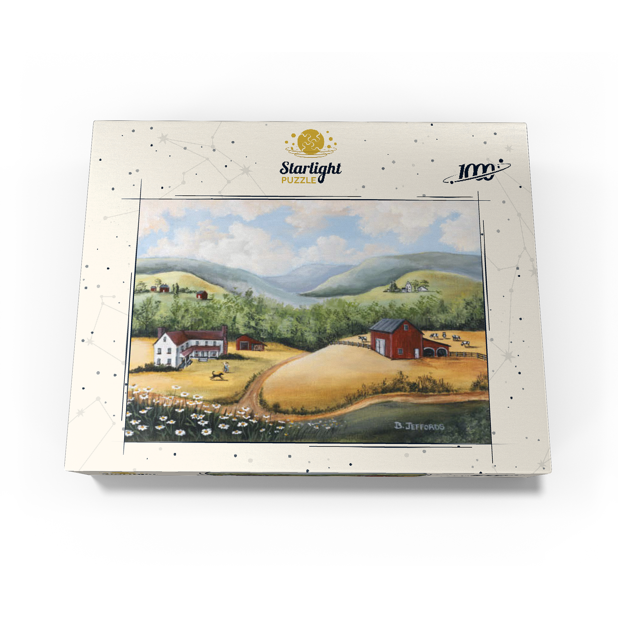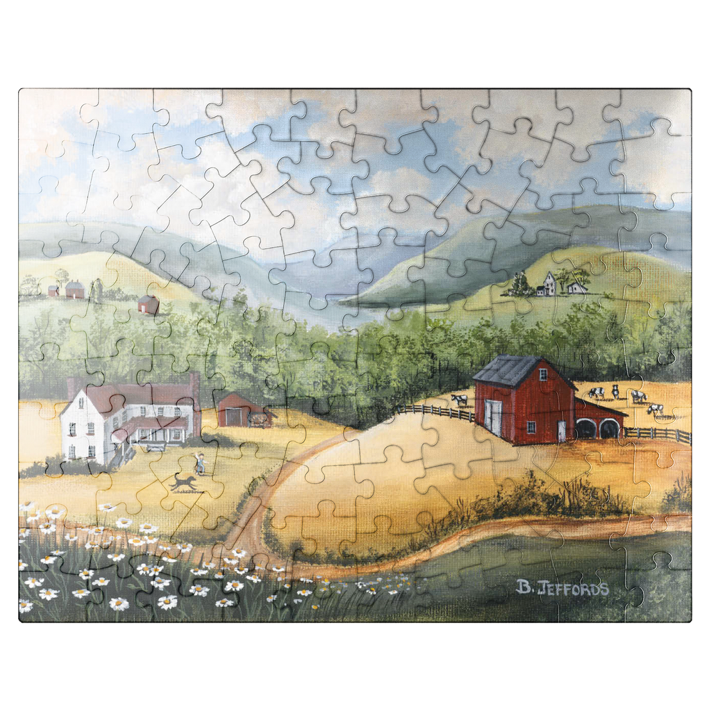 This charming folk art painting captures a peaceful rural farm scene with rolling green hills, a red barn, and a white farmhouse. The golden fields are dotted with grazing cows, quaint farm buildings, and a winding dirt road leading through the idyllic countryside. Delicate wildflowers in the foreground and distant homesteads in the background add to the nostalgic and timeless feel of early American farm life. The soft colors and detailed brushstrokes create a warm and inviting atmosphere, making this artwork a perfect addition to farmhouse décor or folk art collections.