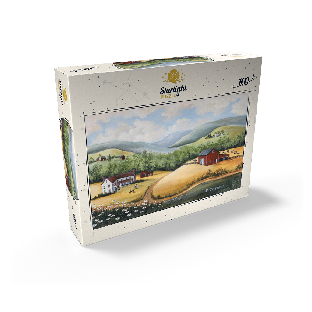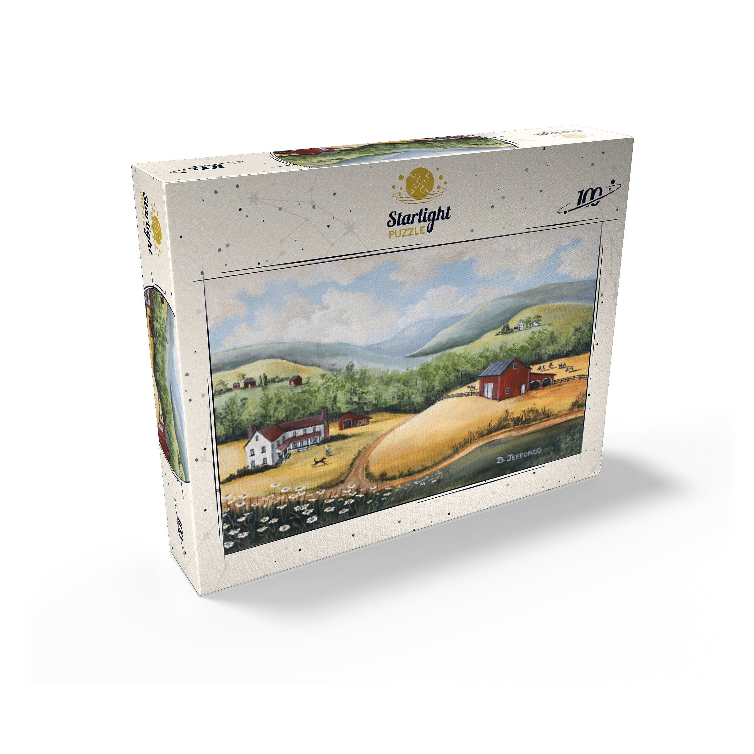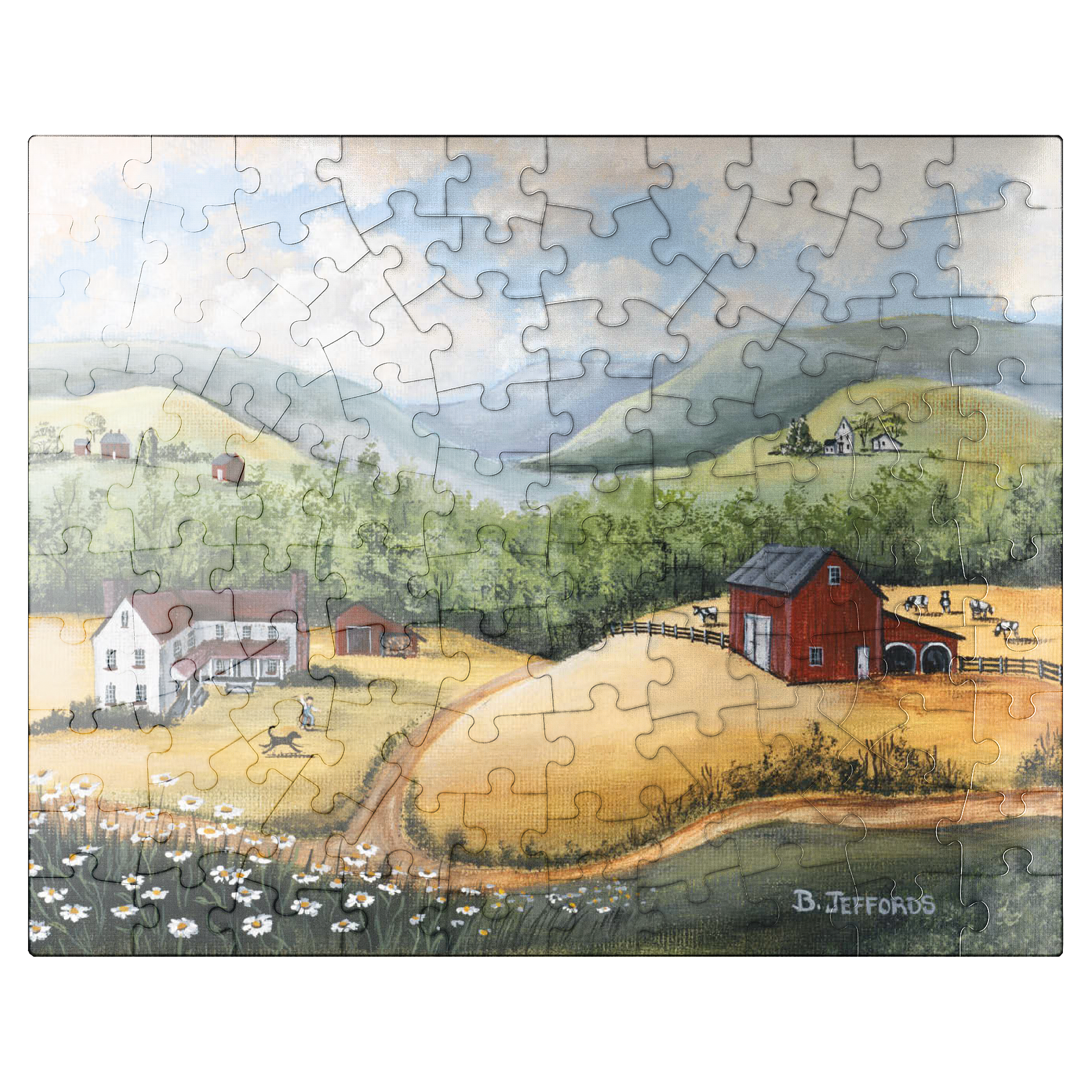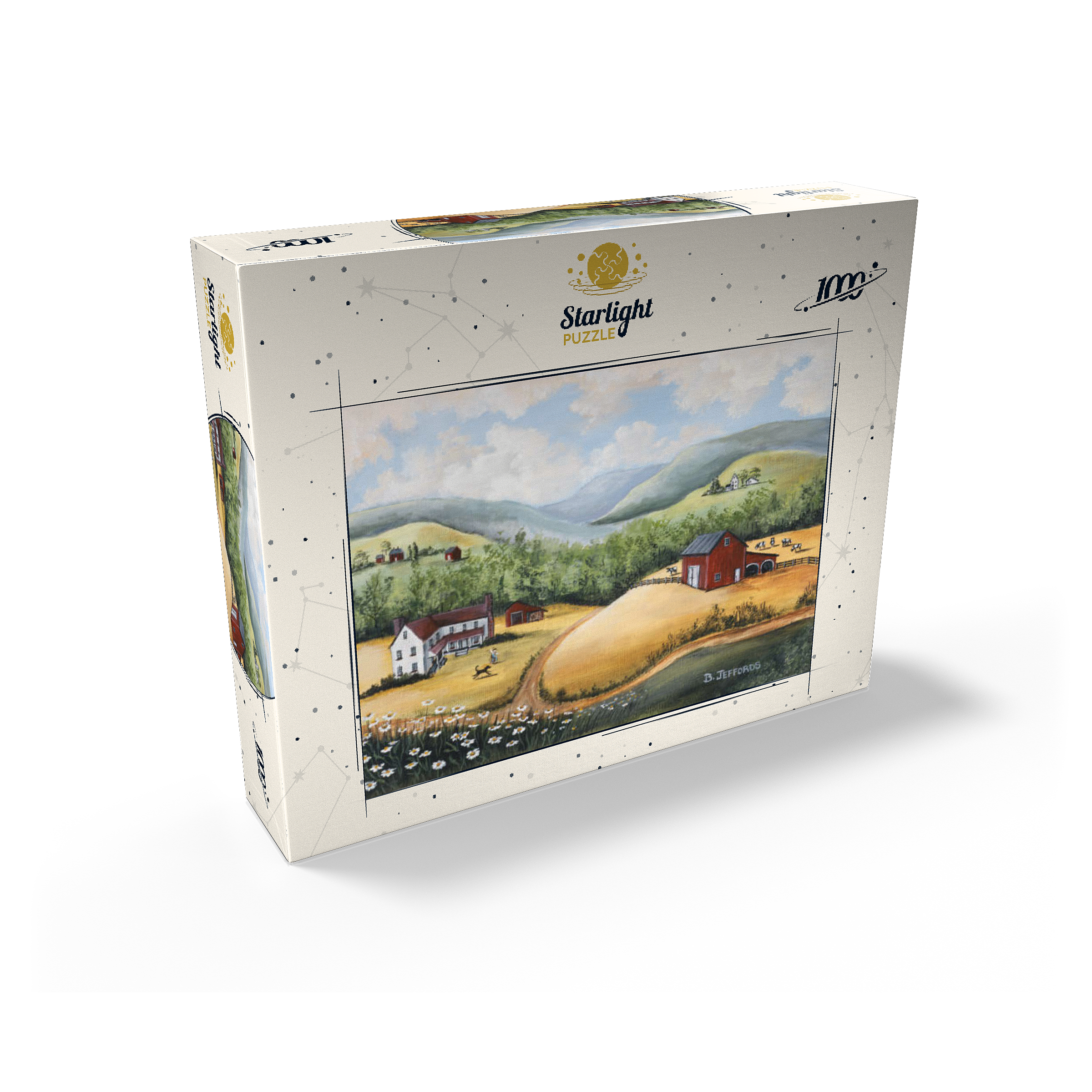 This charming folk art painting captures a peaceful rural farm scene with rolling green hills, a red barn, and a white farmhouse. The golden fields are dotted with grazing cows, quaint farm buildings, and a winding dirt road leading through the idyllic countryside. Delicate wildflowers in the foreground and distant homesteads in the background add to the nostalgic and timeless feel of early American farm life. The soft colors and detailed brushstrokes create a warm and inviting atmosphere, making this artwork a perfect addition to farmhouse décor or folk art collections.