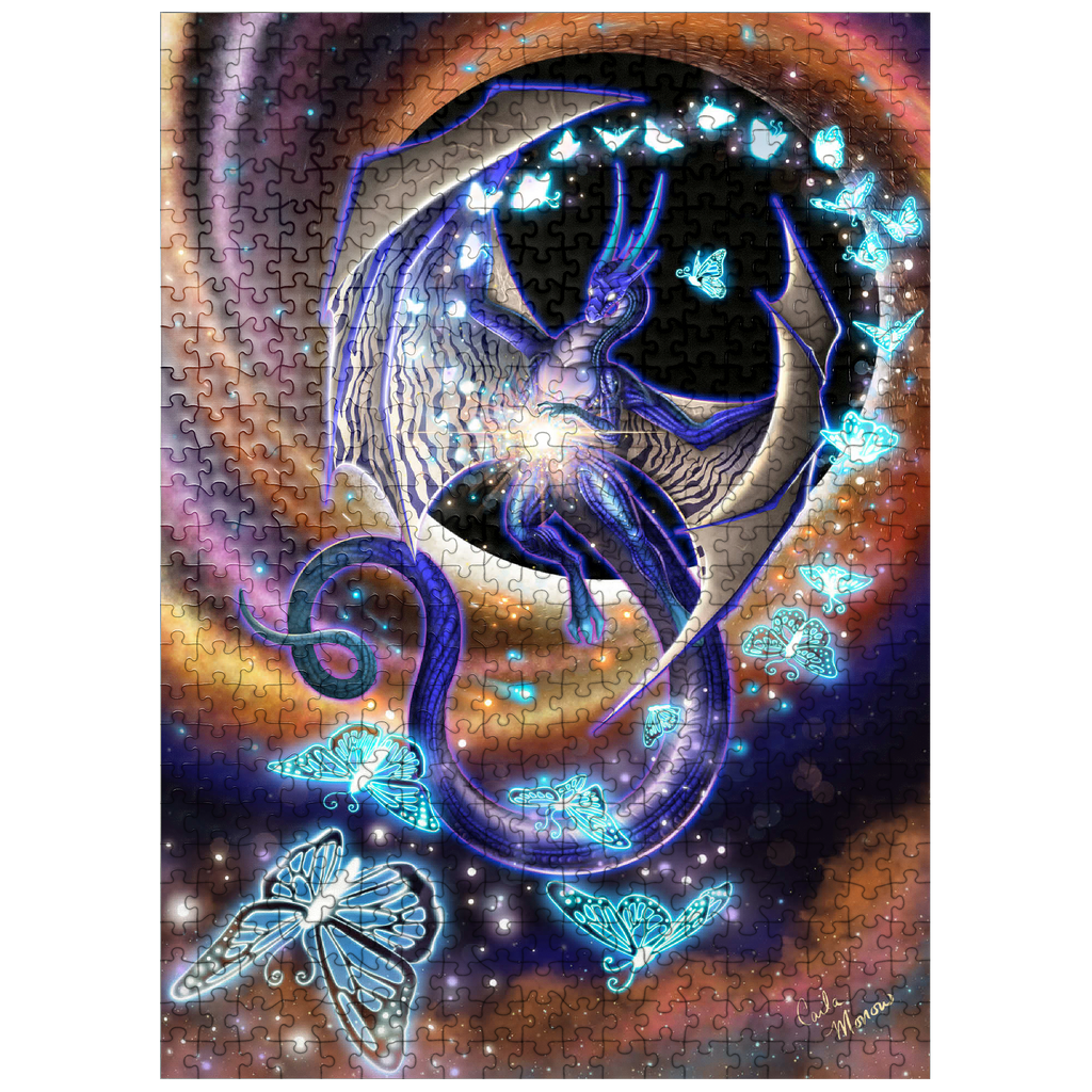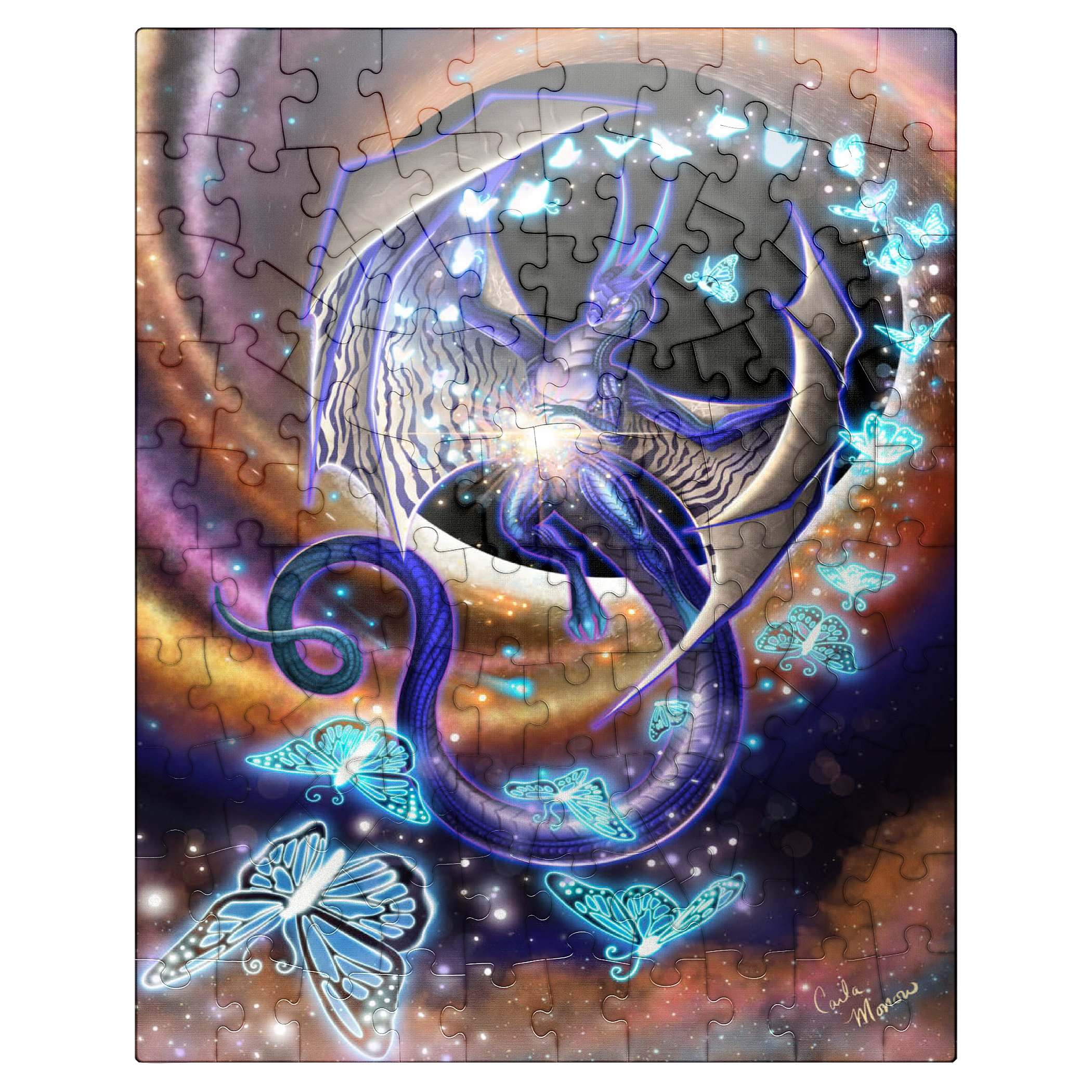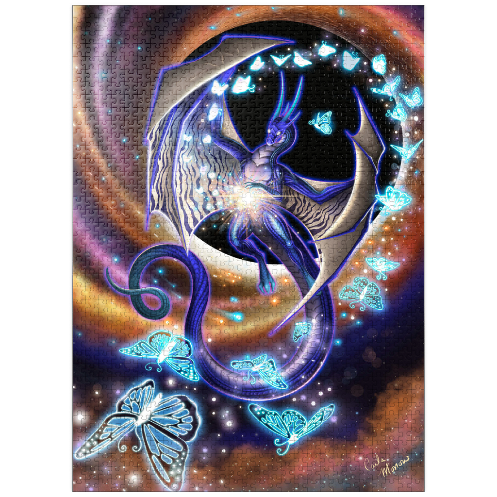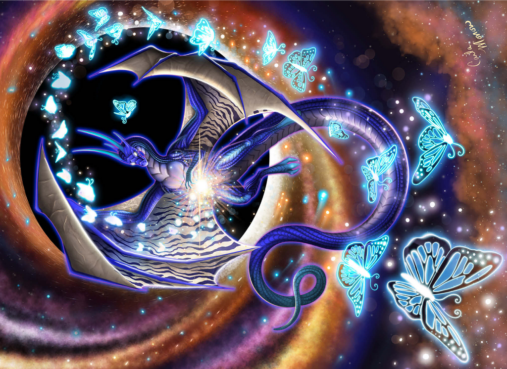 Chaos of Creation by Carla Morrow, depicts a radiant dragon emerging from the heart of a swirling cosmic vortex. Rendered in deep blues and shimmering violets, the dragon appears both ethereal and powerful, its wings stretched wide as it births luminous butterflies from a burst of energy at its core. These glowing butterflies, symbols of the beauty of creation that bursts forth from chaos, spiral outward into the galaxy, scattering light across the surrounding darkness. The background pulses with motion-golden and rose hues spiraling into the blackness of space-suggesting a moment of cosmic genesis. The dragon, both creator and guardian, stands as a divine force within the ever-turning wheel of existence.