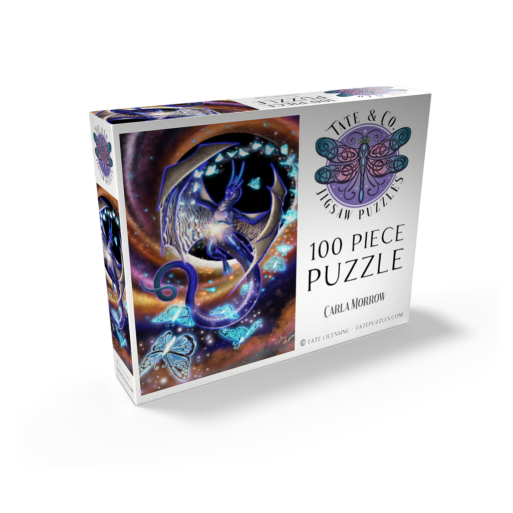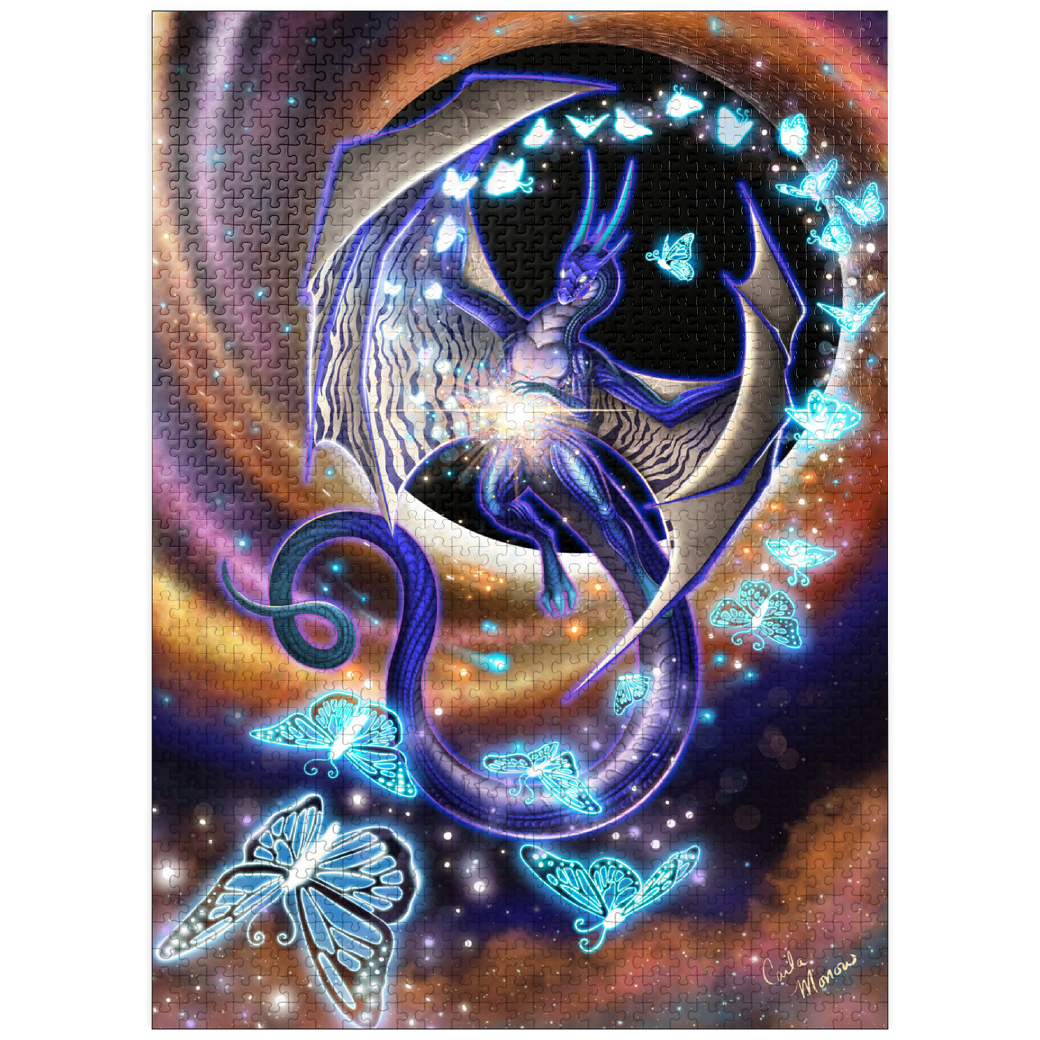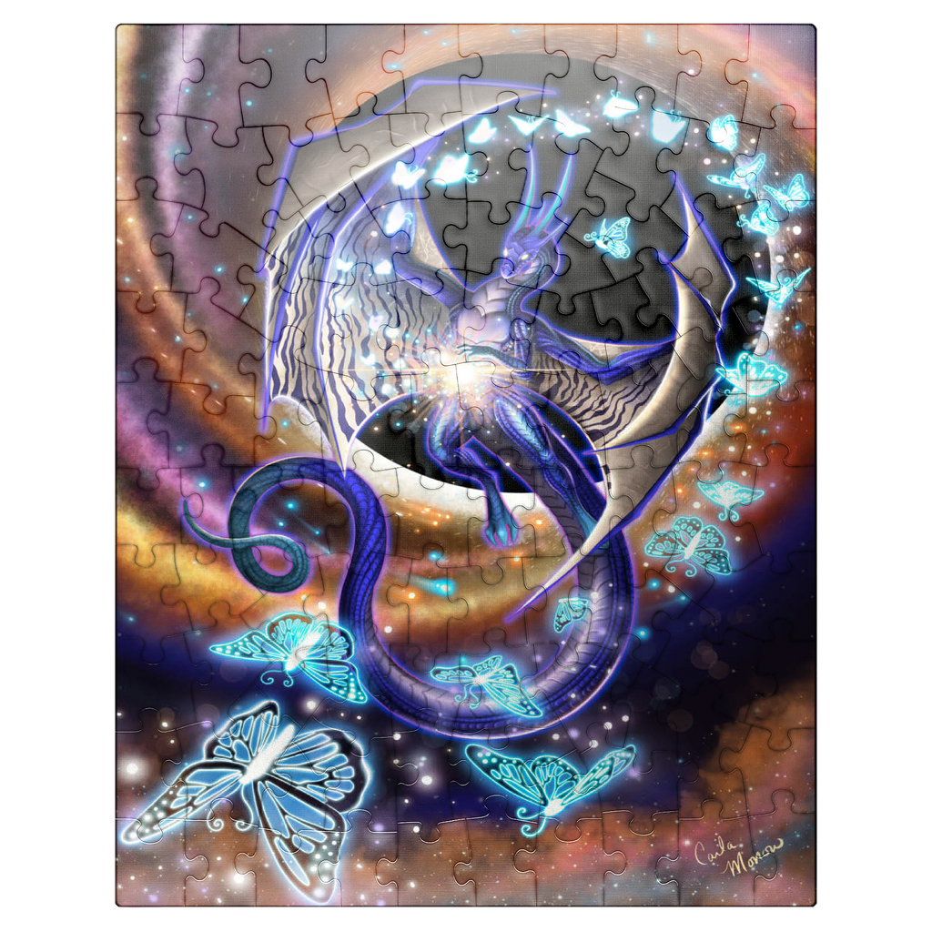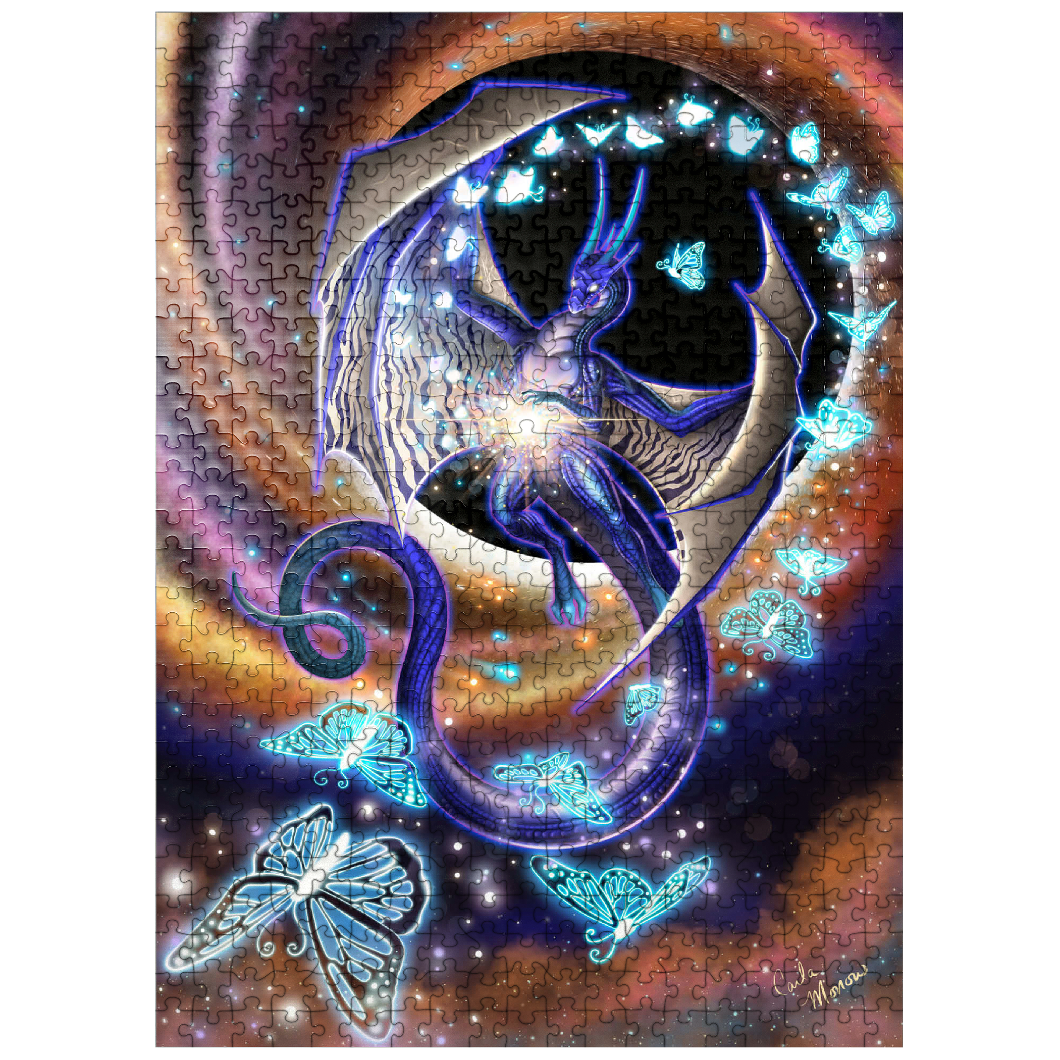 Chaos of Creation by Carla Morrow, depicts a radiant dragon emerging from the heart of a swirling cosmic vortex. Rendered in deep blues and shimmering violets, the dragon appears both ethereal and powerful, its wings stretched wide as it births luminous butterflies from a burst of energy at its core. These glowing butterflies, symbols of the beauty of creation that bursts forth from chaos, spiral outward into the galaxy, scattering light across the surrounding darkness. The background pulses with motion-golden and rose hues spiraling into the blackness of space-suggesting a moment of cosmic genesis. The dragon, both creator and guardian, stands as a divine force within the ever-turning wheel of existence.