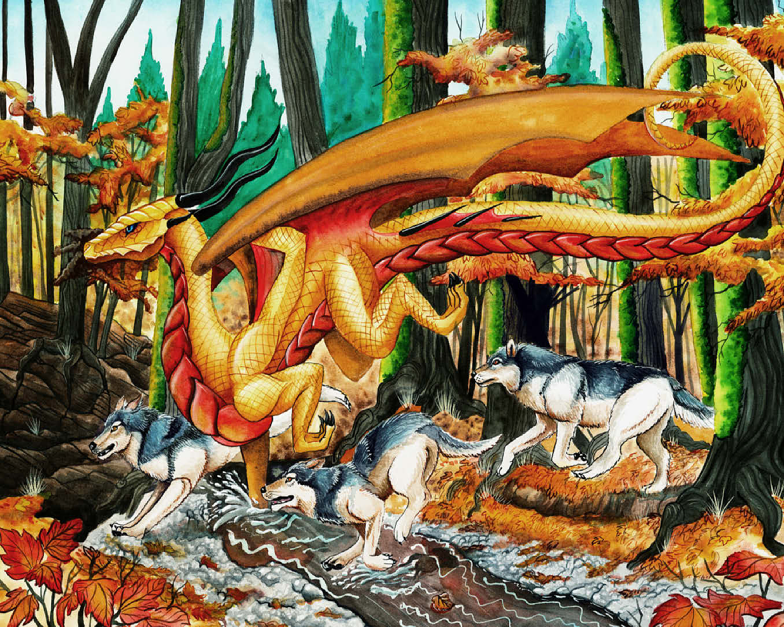 A rush of reds and golds and cool autumn wind streaming past. Brothers and sisters at your side, running through the trees and over streams. The bond of the pack is one of the strongest in nature, and these beings are all the matters in this moment. The mind is clear and the heart soars. The pack moves as one creature, one living entity. The freedom of the run.