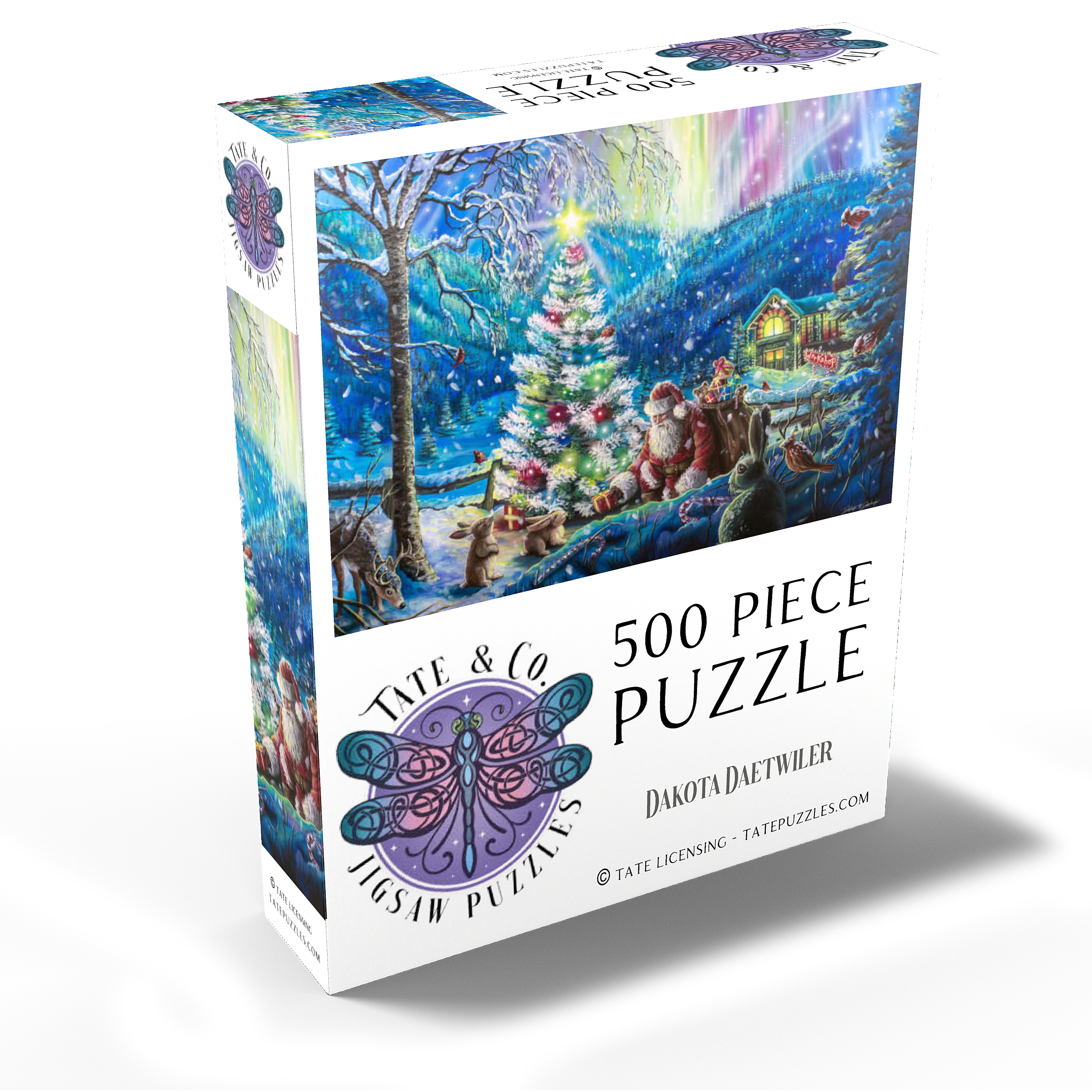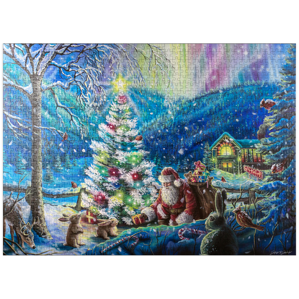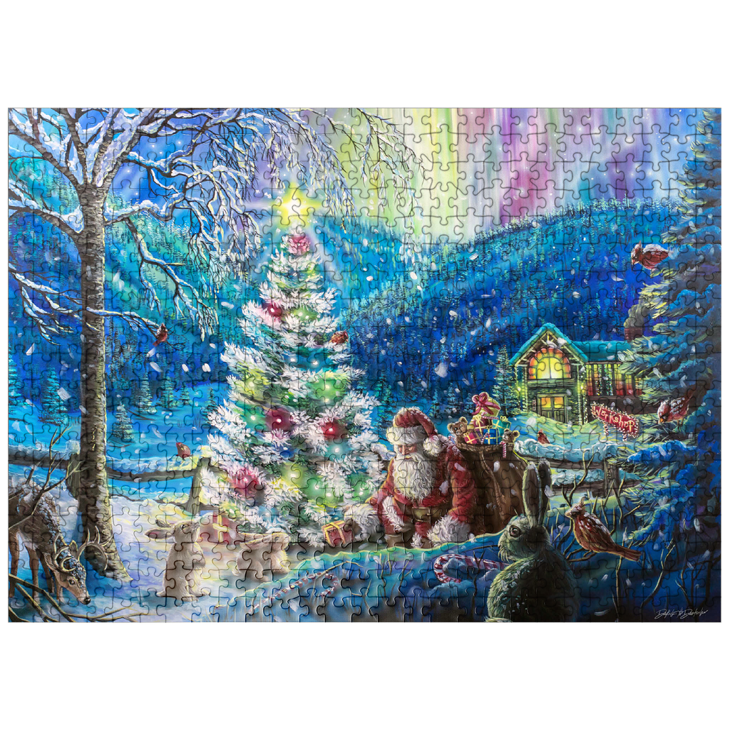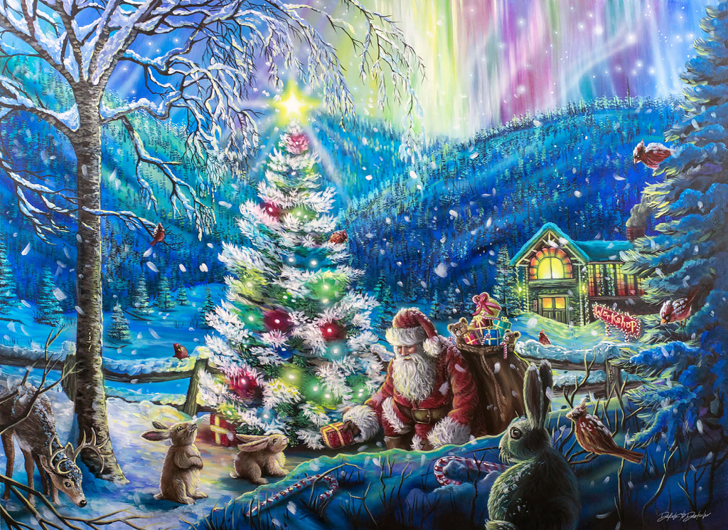 Painting by Dakota Daetwiler of Santa kneeling down to hand a present to the forest animals. Behind them you can see the magical sky with the Northern Lights, snow, and glowing stars.