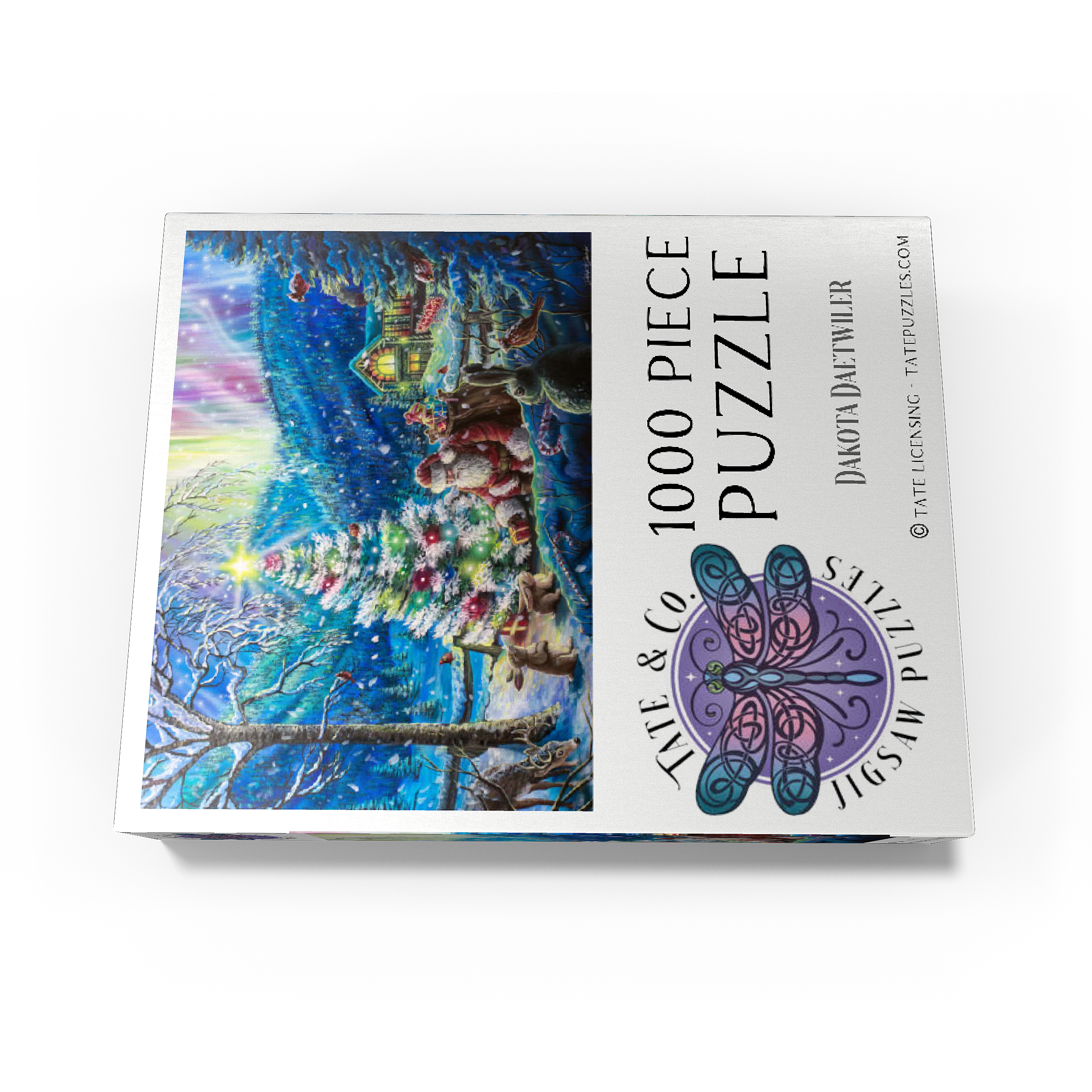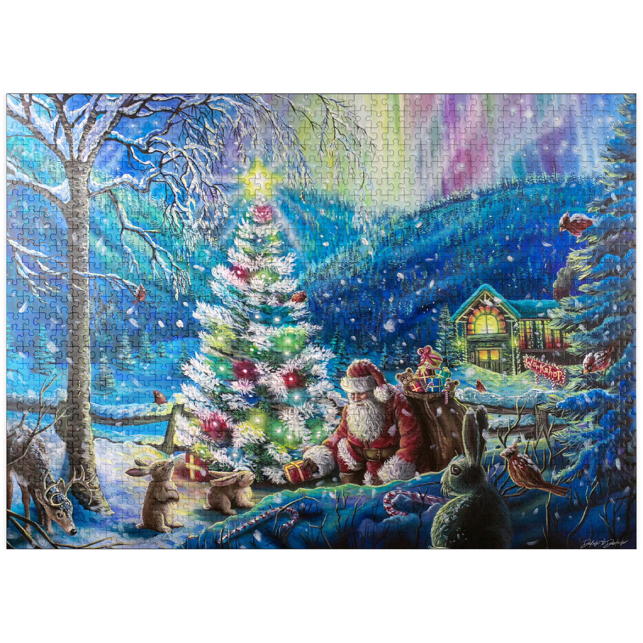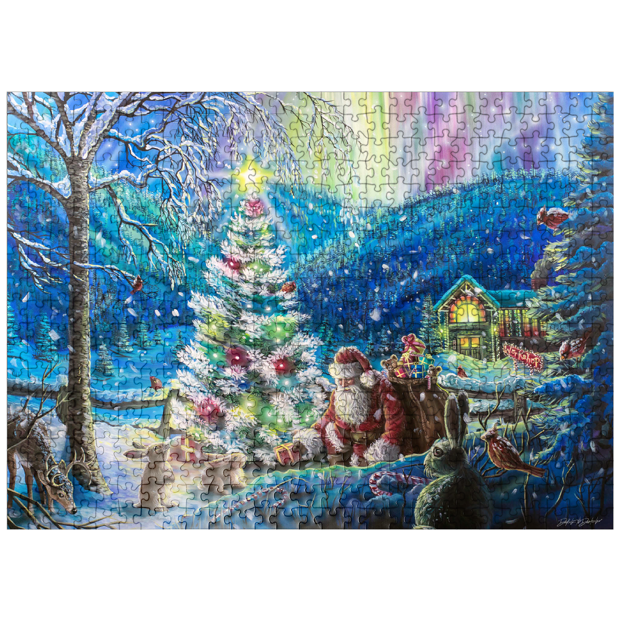 Painting by Dakota Daetwiler of Santa kneeling down to hand a present to the forest animals. Behind them you can see the magical sky with the Northern Lights, snow, and glowing stars.