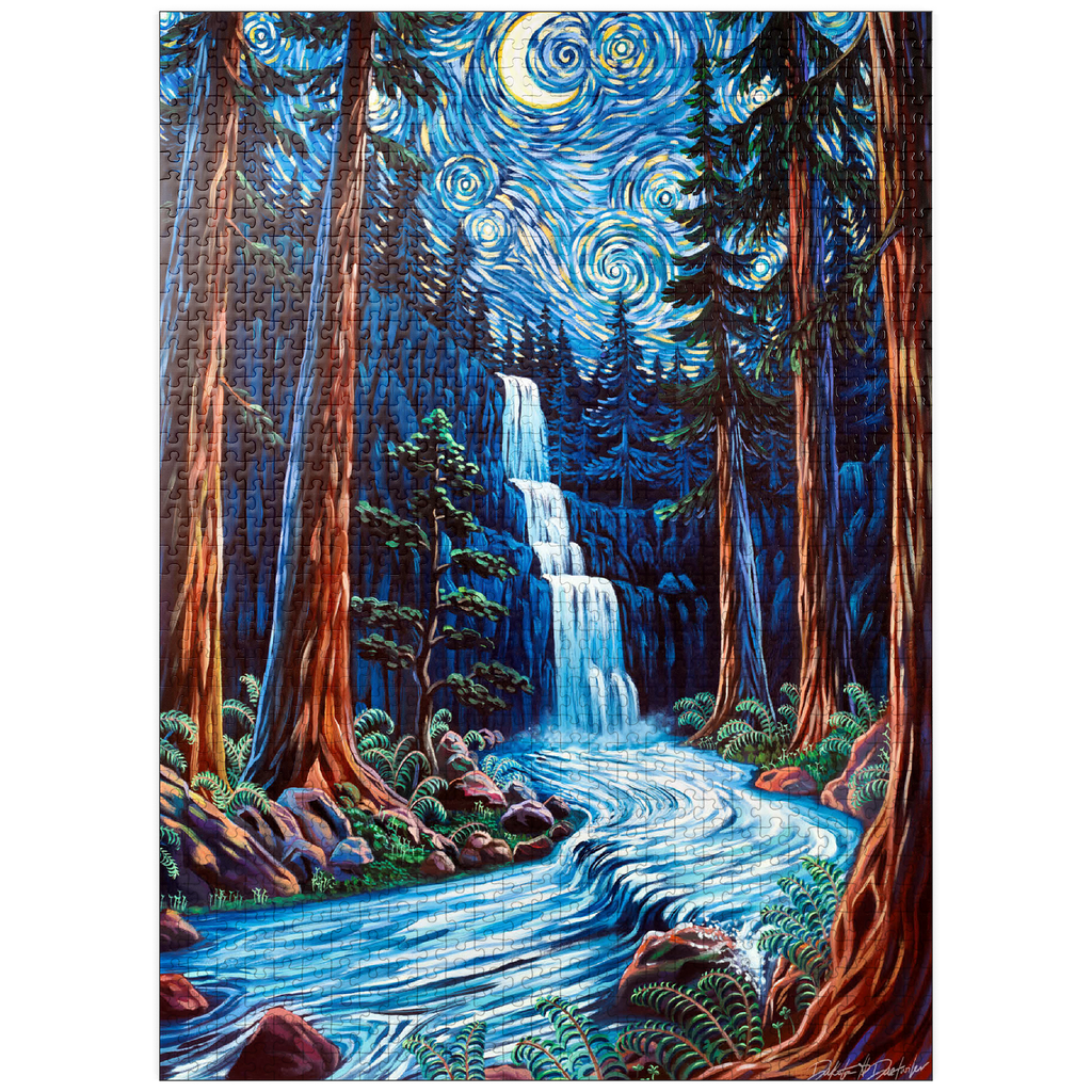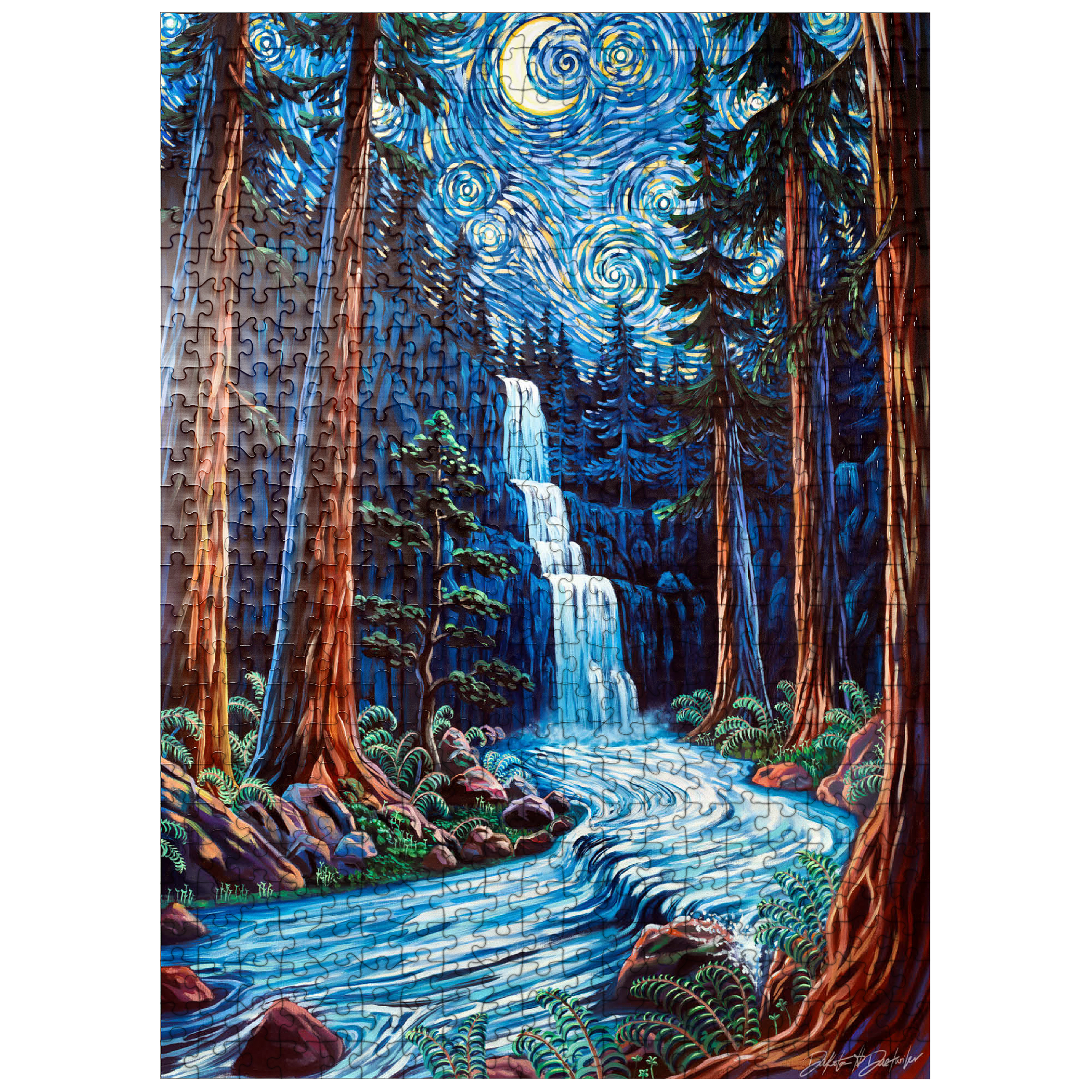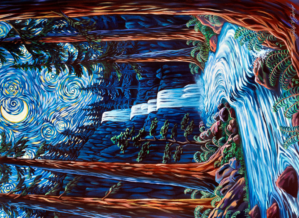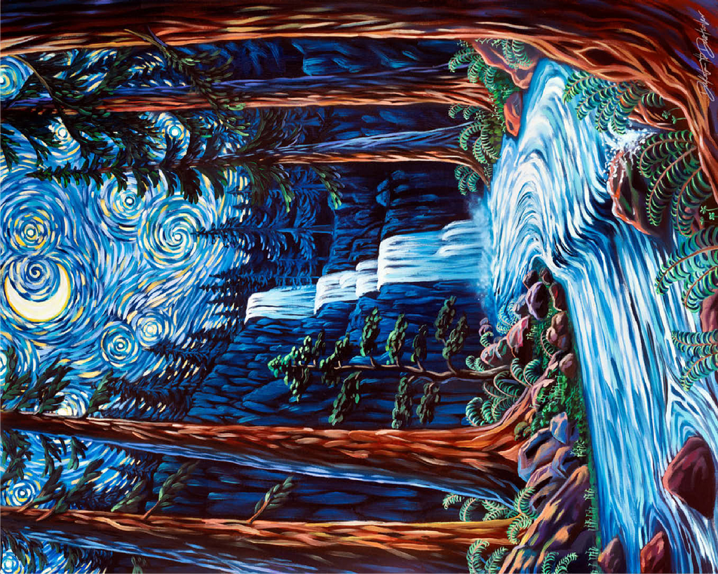 Painting by Dakota Daetwiler of the Northern California redwood forest depicted in a loose and colorful swirly style. A crescent moon and stars adorn the top of the painting, along with a waterfall and a river running in between the redwood trees.