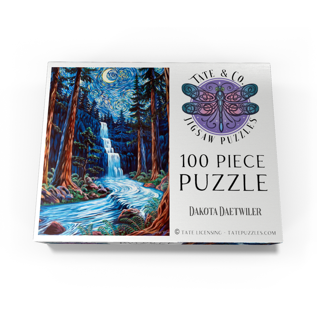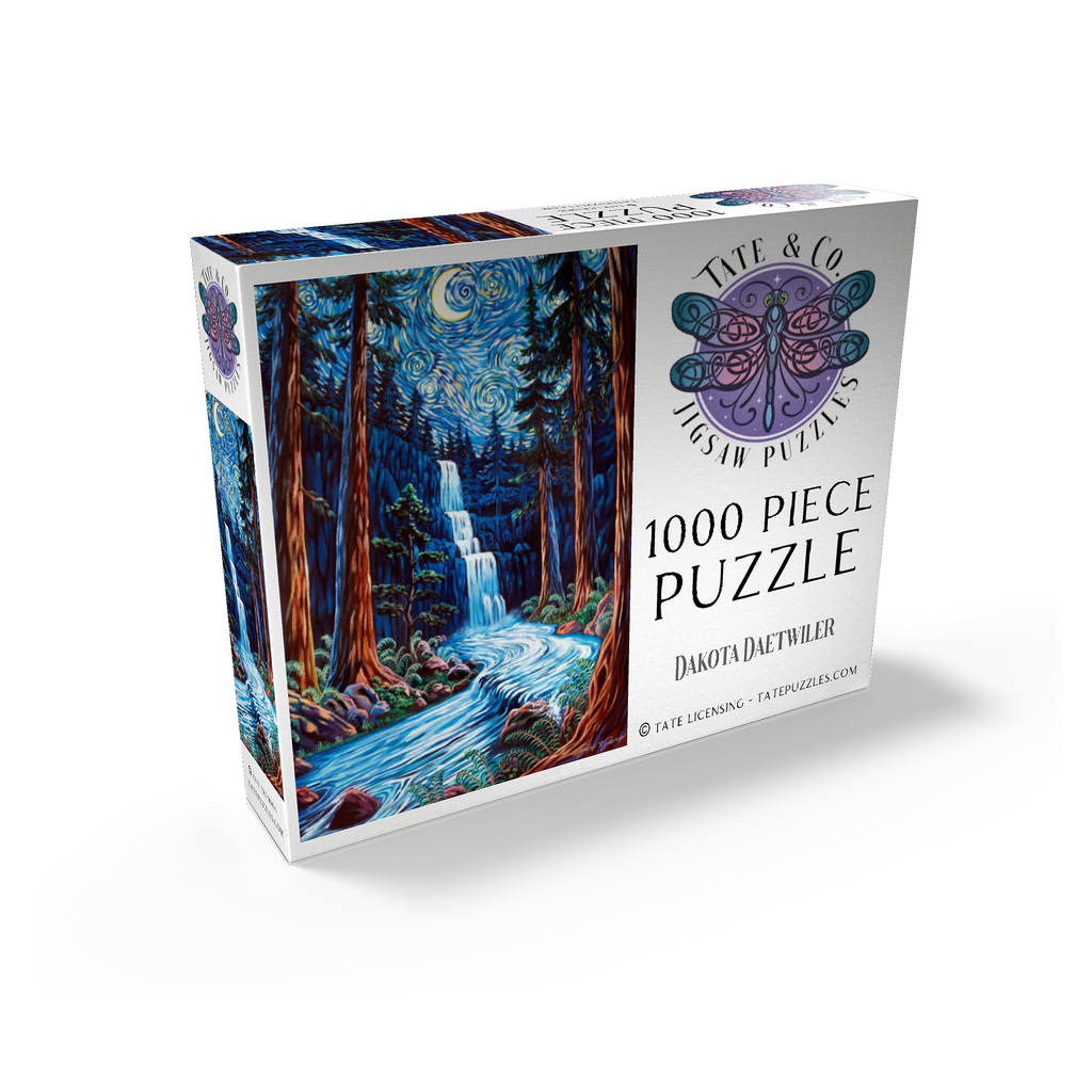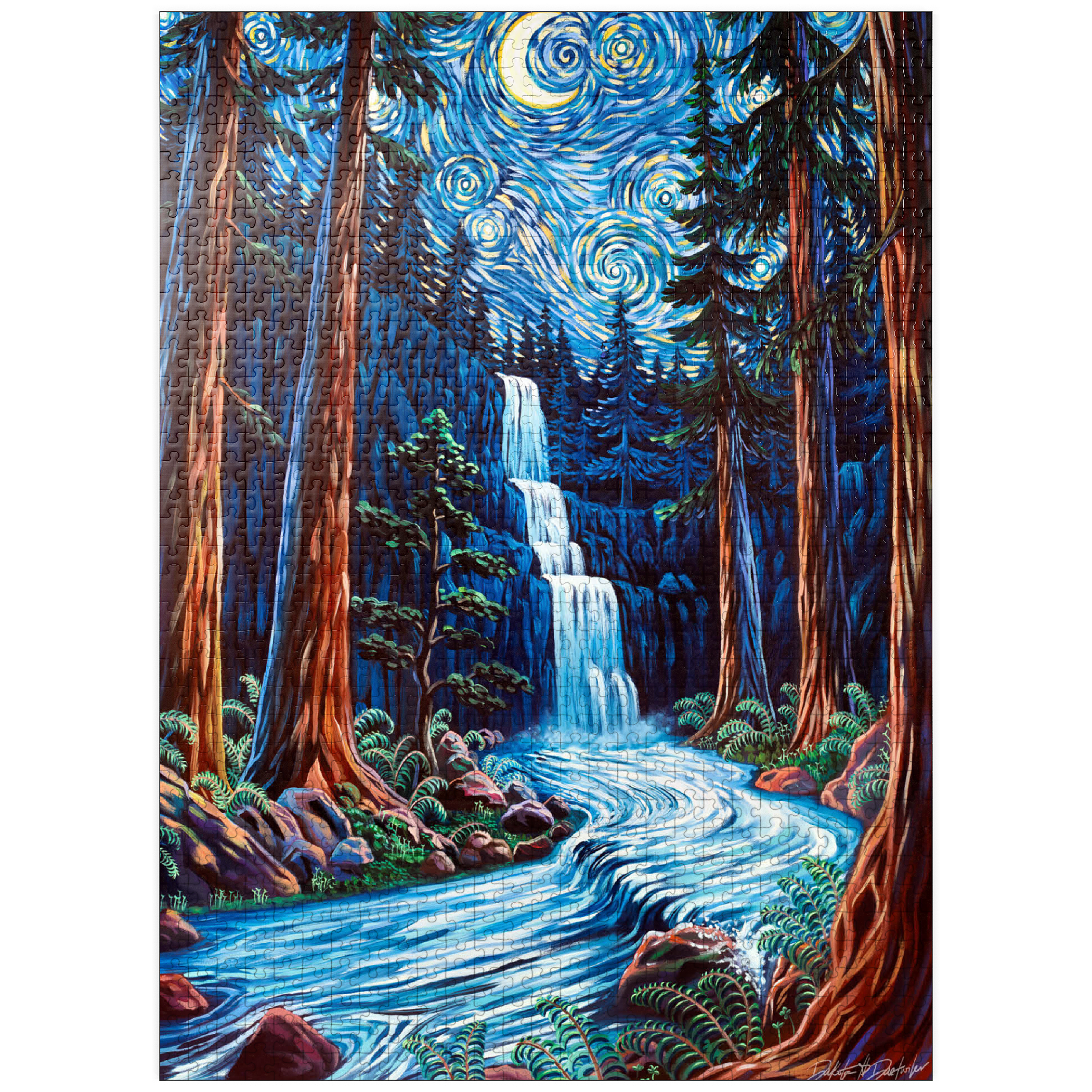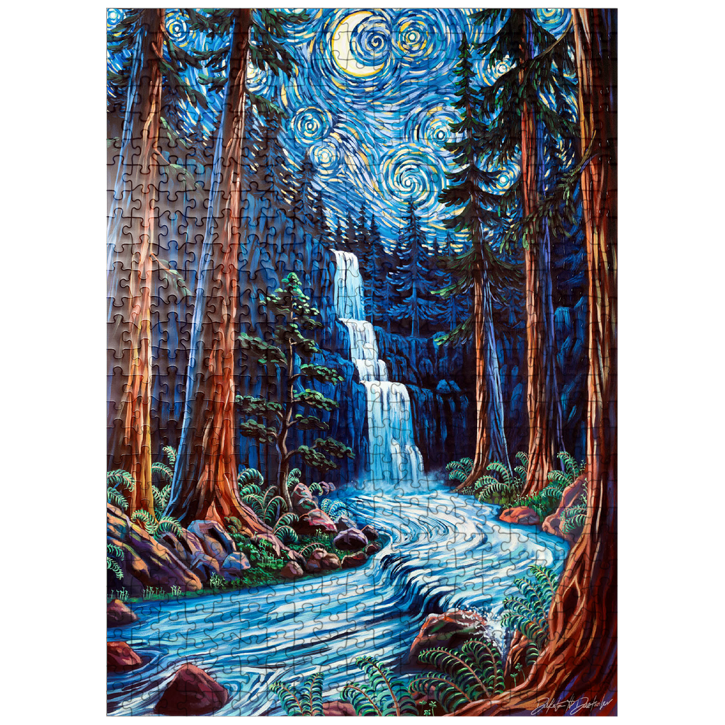 Painting by Dakota Daetwiler of the Northern California redwood forest depicted in a loose and colorful swirly style. A crescent moon and stars adorn the top of the painting, along with a waterfall and a river running in between the redwood trees.