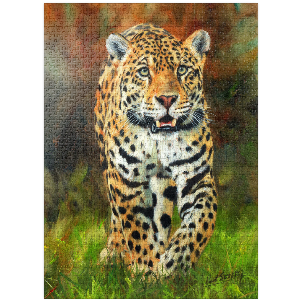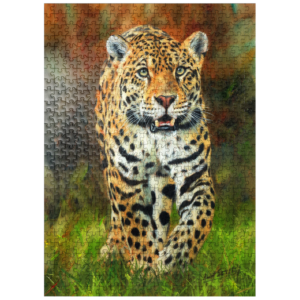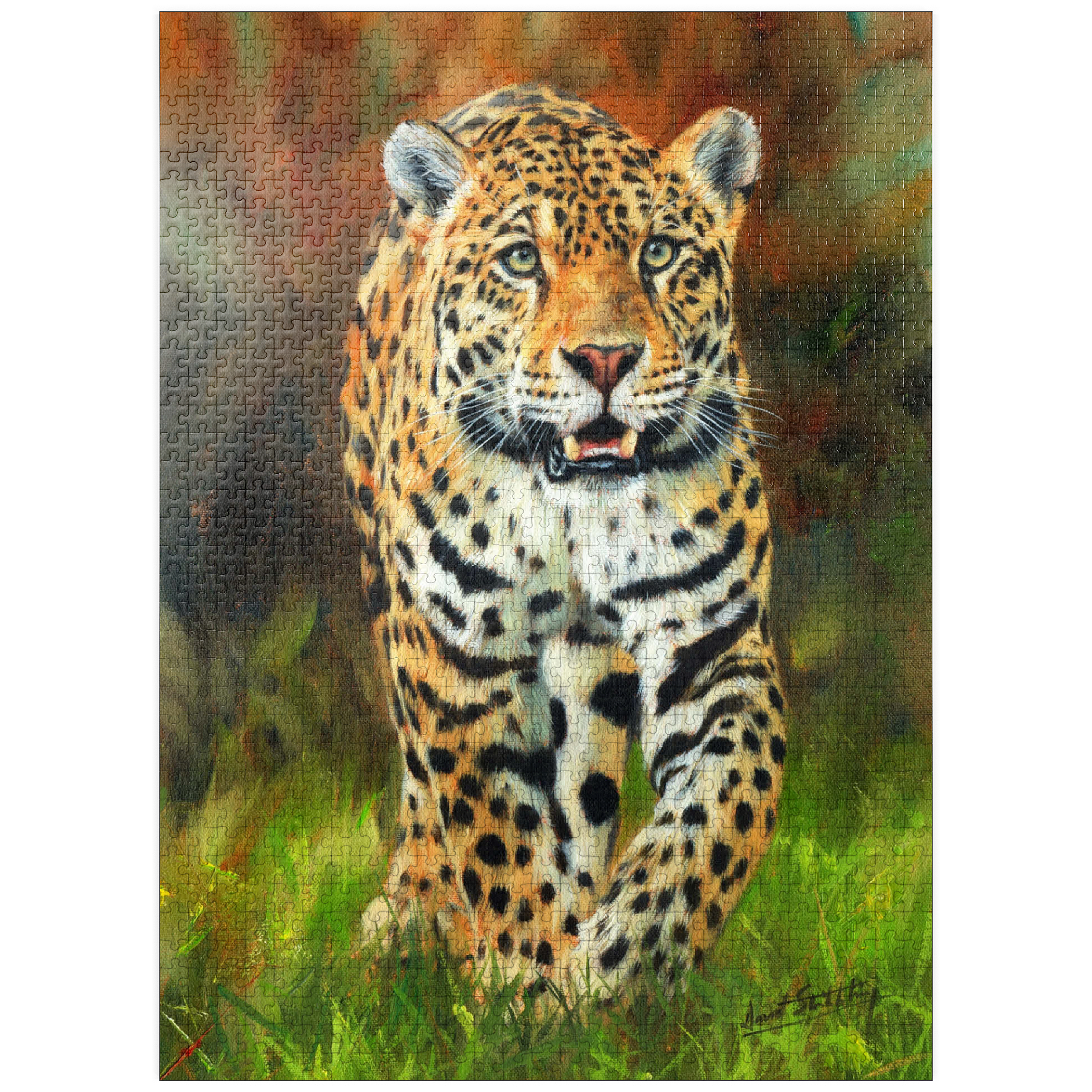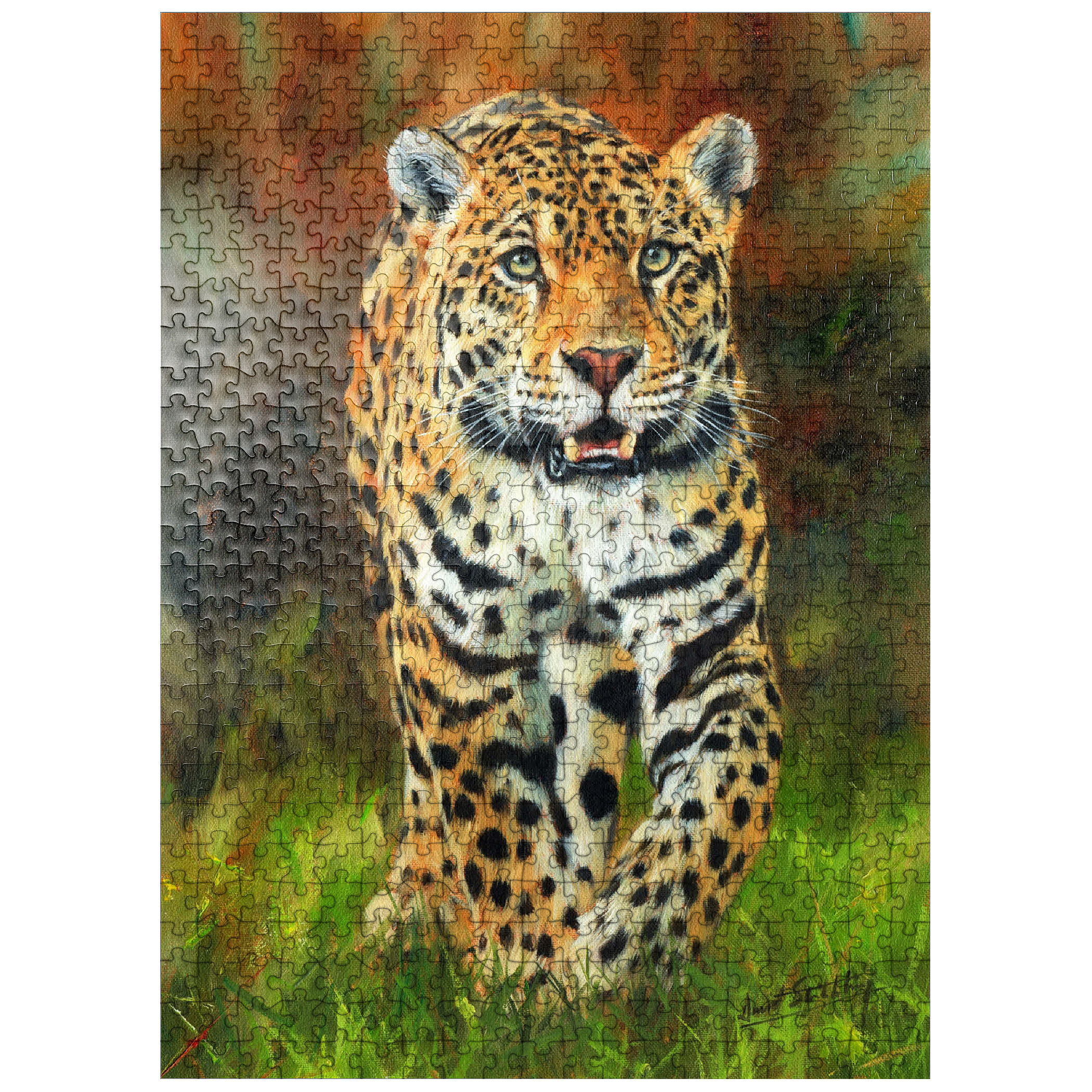 A captivating portrait of a leopard moving gracefully through lush green grass, its striking golden coat patterned with dark rosettes. The intense gaze and slightly open mouth capture the feline's strength, alertness, and elegance. The soft focus of the autumnal background enhances the vivid details of the leopard's fur, making this artwork a stunning tribute to the beauty and power of this magnificent predator in its natural habitat.