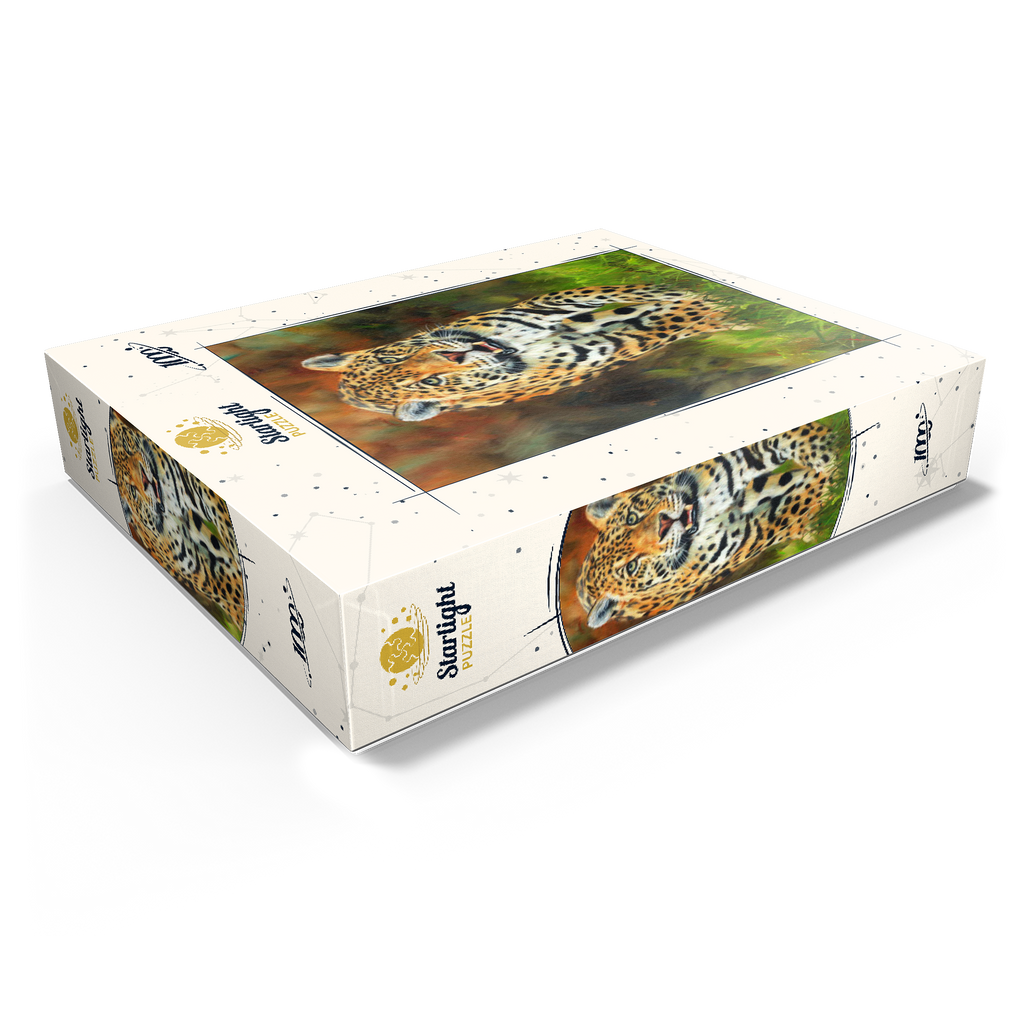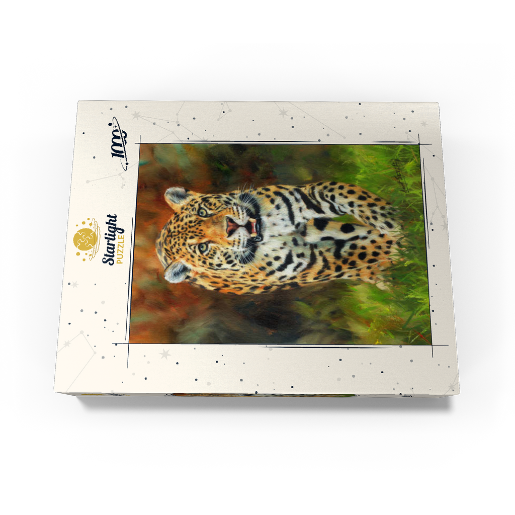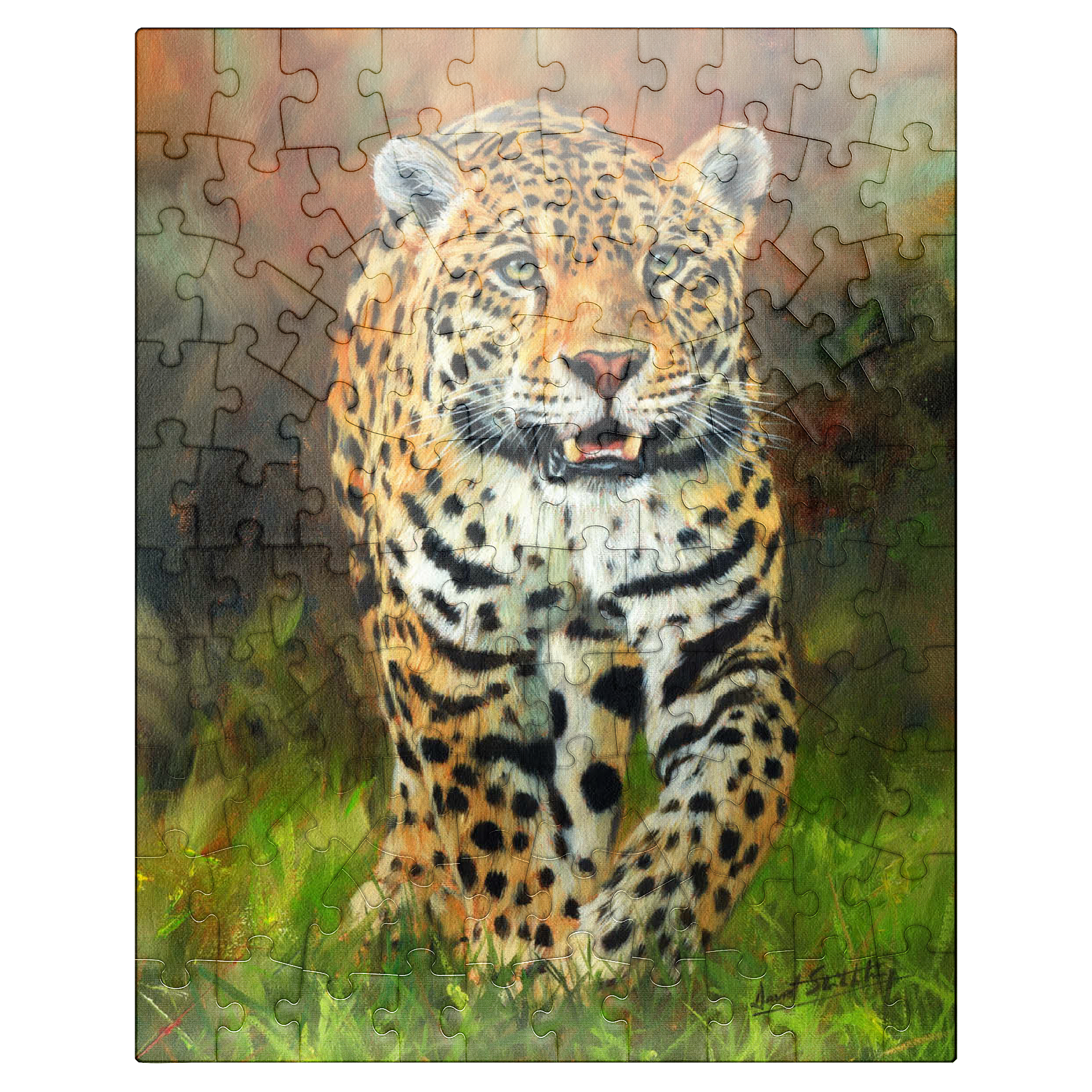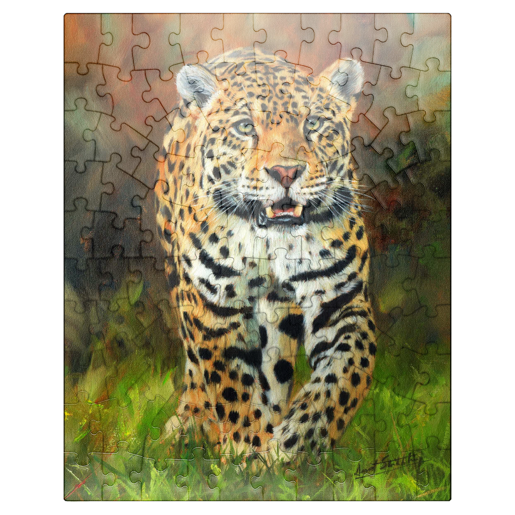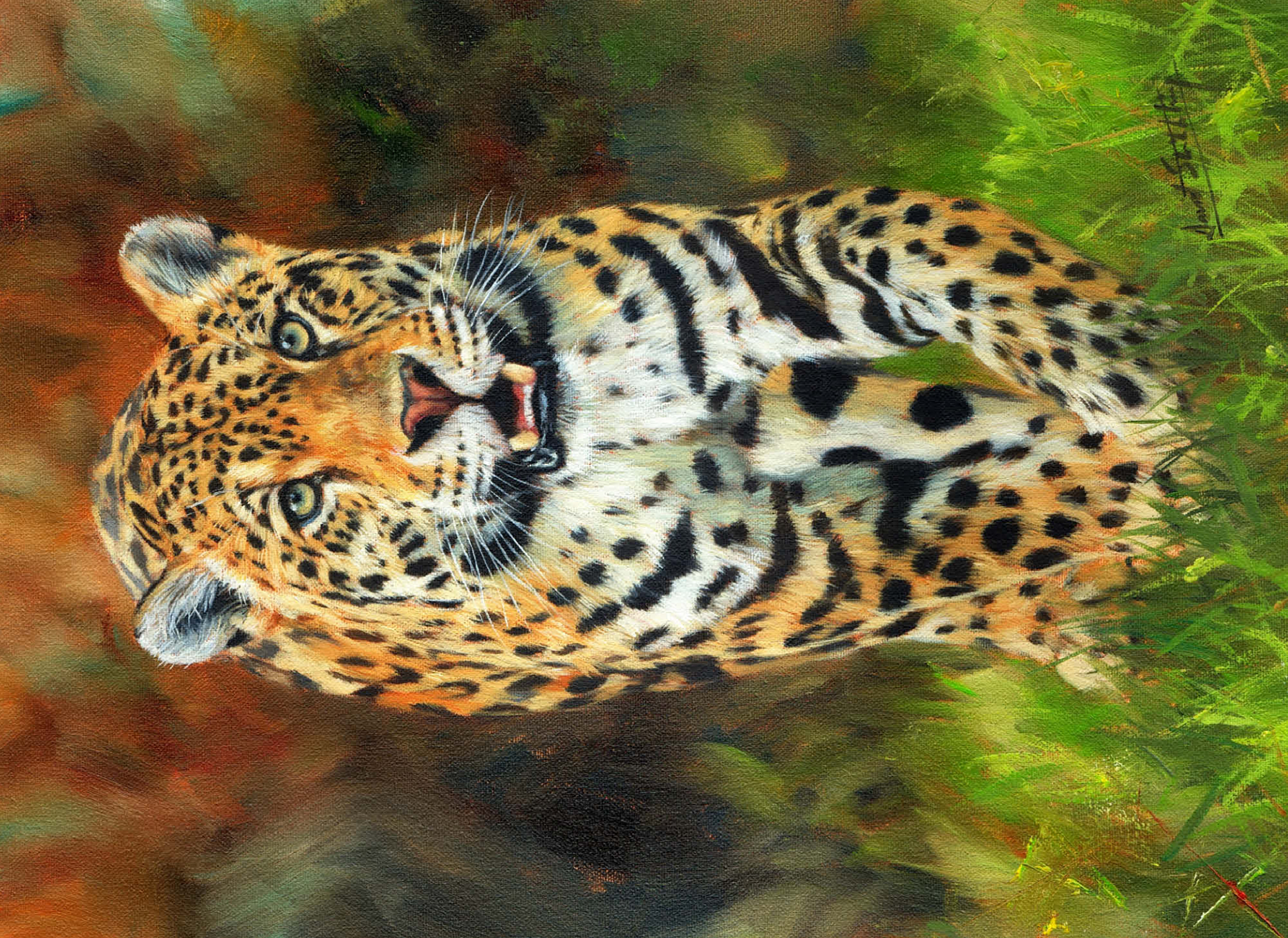 A captivating portrait of a leopard moving gracefully through lush green grass, its striking golden coat patterned with dark rosettes. The intense gaze and slightly open mouth capture the feline's strength, alertness, and elegance. The soft focus of the autumnal background enhances the vivid details of the leopard's fur, making this artwork a stunning tribute to the beauty and power of this magnificent predator in its natural habitat.
