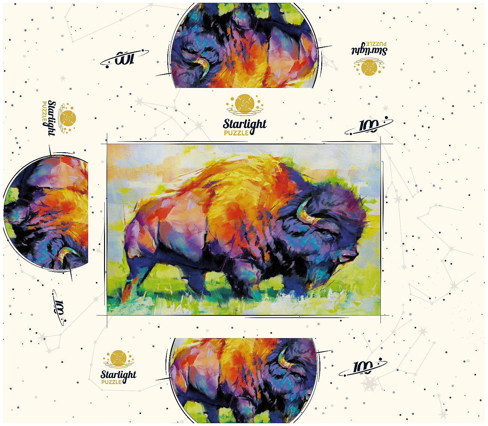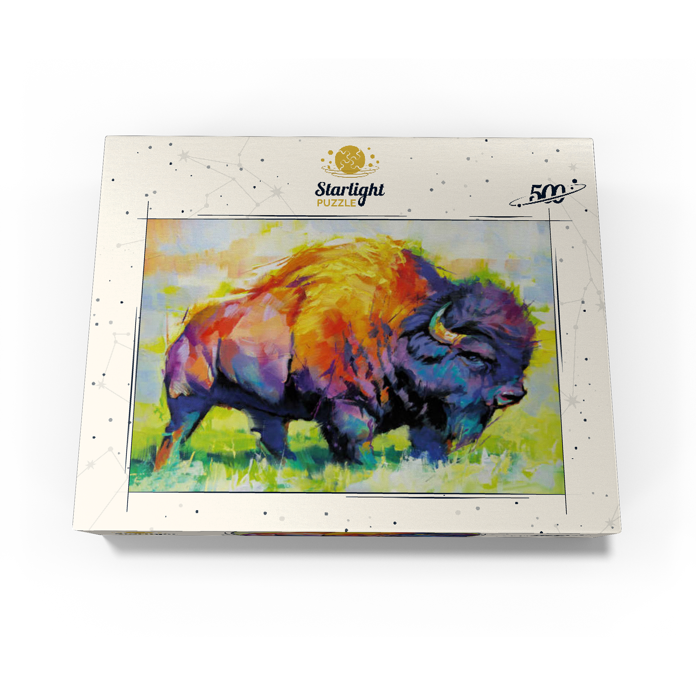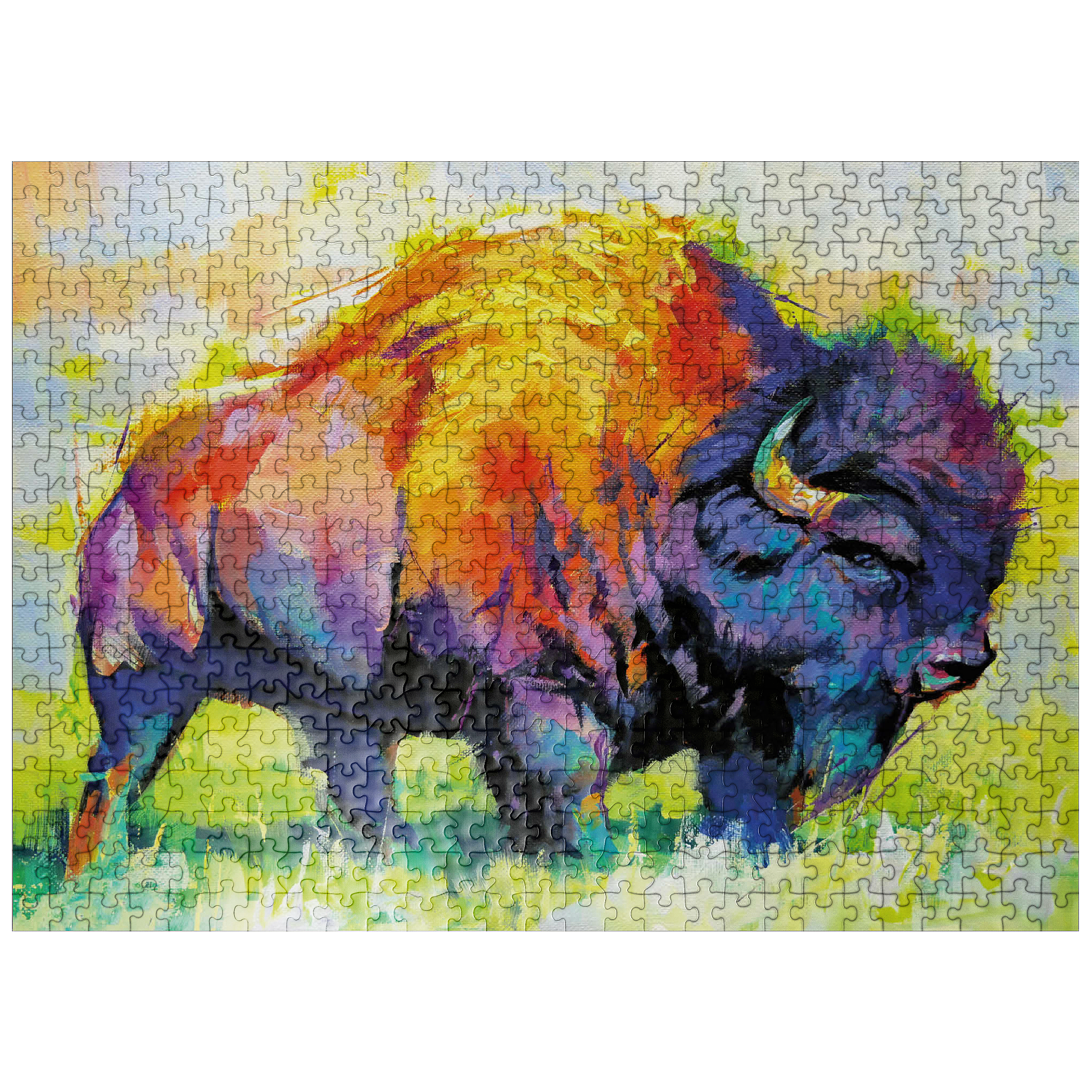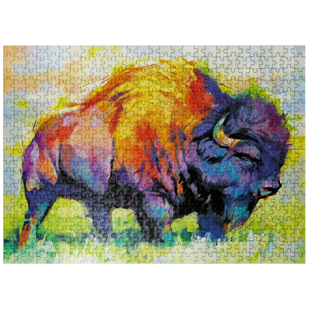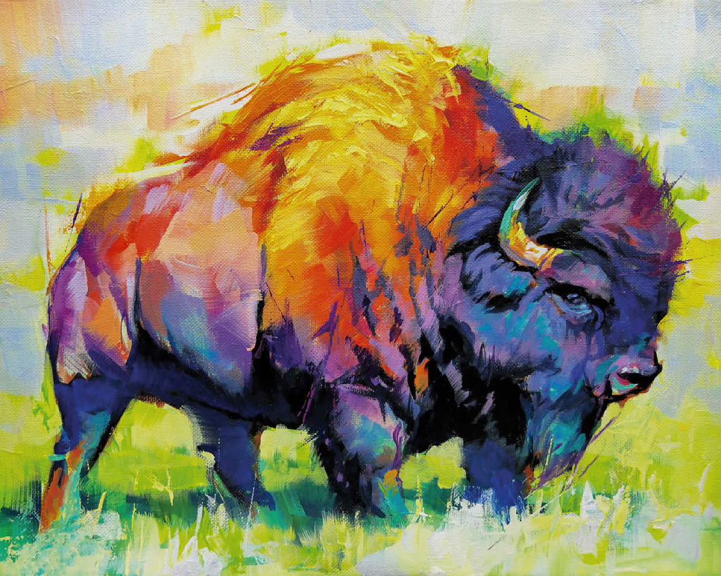 This bold and expressive painting features an American bison portrayed through a vivid blend of abstract colors and dynamic brushwork. The powerful stature of the bison is accentuated with vibrant hues of orange, yellow, purple, and teal, creating an energetic contrast against a soft green and blue background. The artwork captures the spirit and strength of this iconic North American animal while infusing it with a modern artistic twist. A perfect choice for lovers of wildlife and contemporary expressionism.