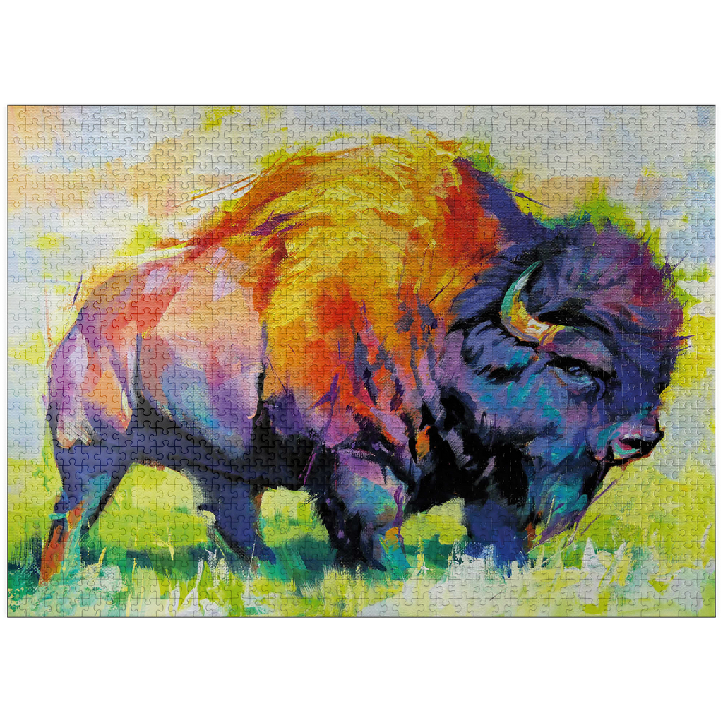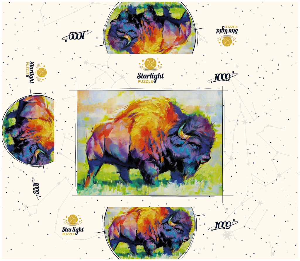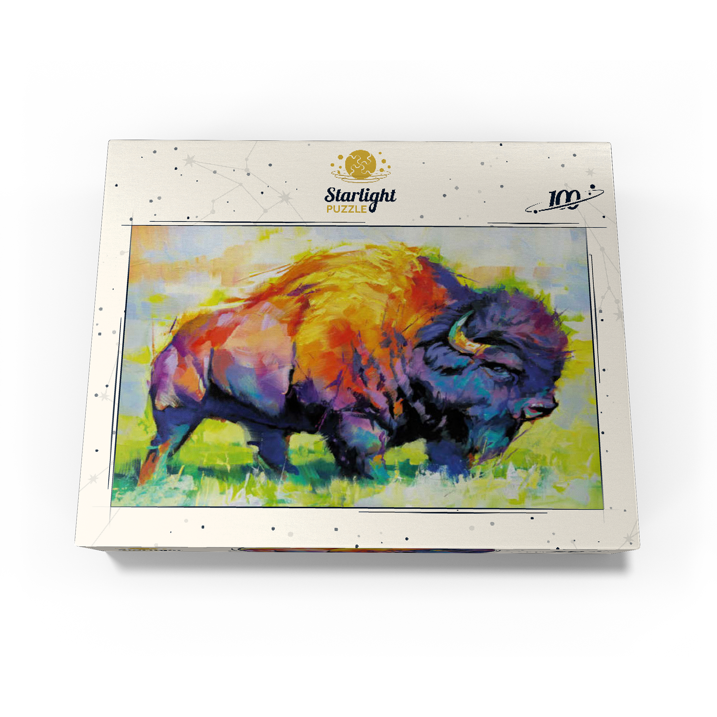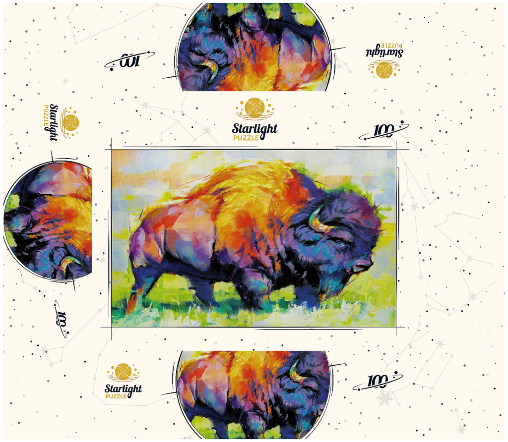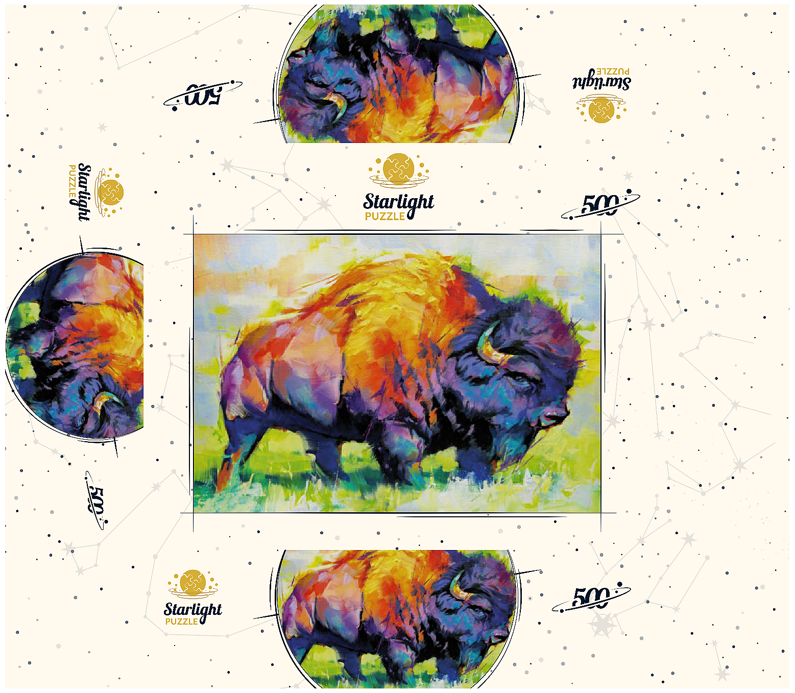This bold and expressive painting features an American bison portrayed through a vivid blend of abstract colors and dynamic brushwork. The powerful stature of the bison is accentuated with vibrant hues of orange, yellow, purple, and teal, creating an energetic contrast against a soft green and blue background. The artwork captures the spirit and strength of this iconic North American animal while infusing it with a modern artistic twist. A perfect choice for lovers of wildlife and contemporary expressionism.
