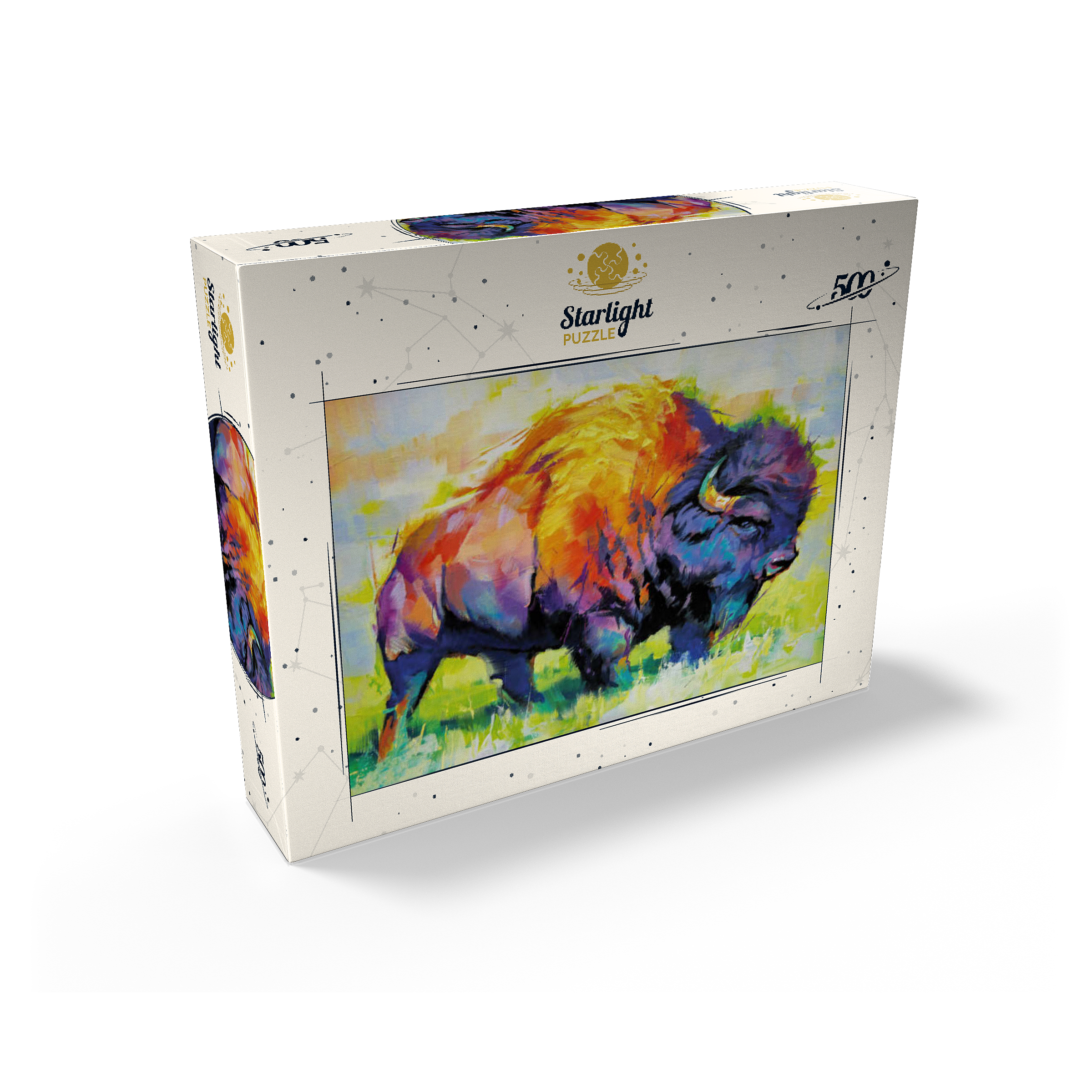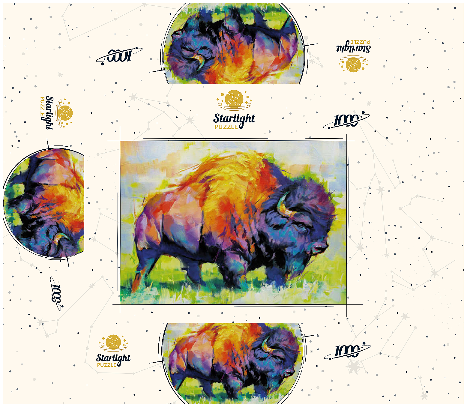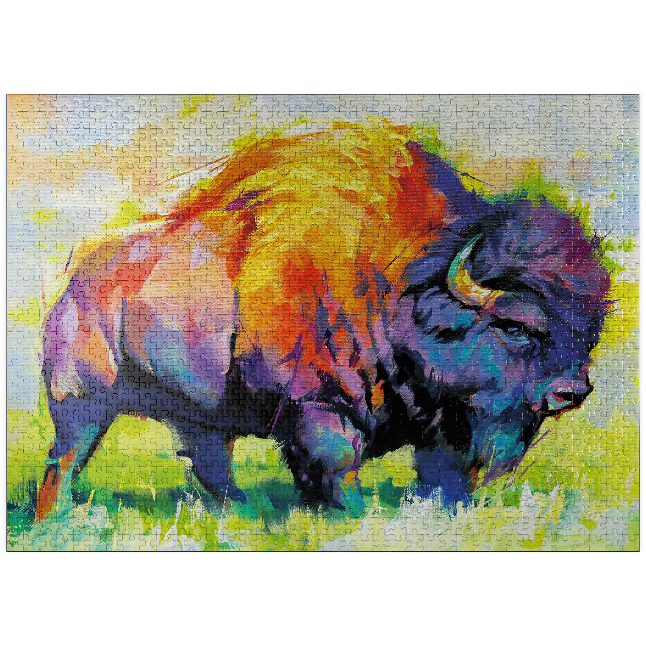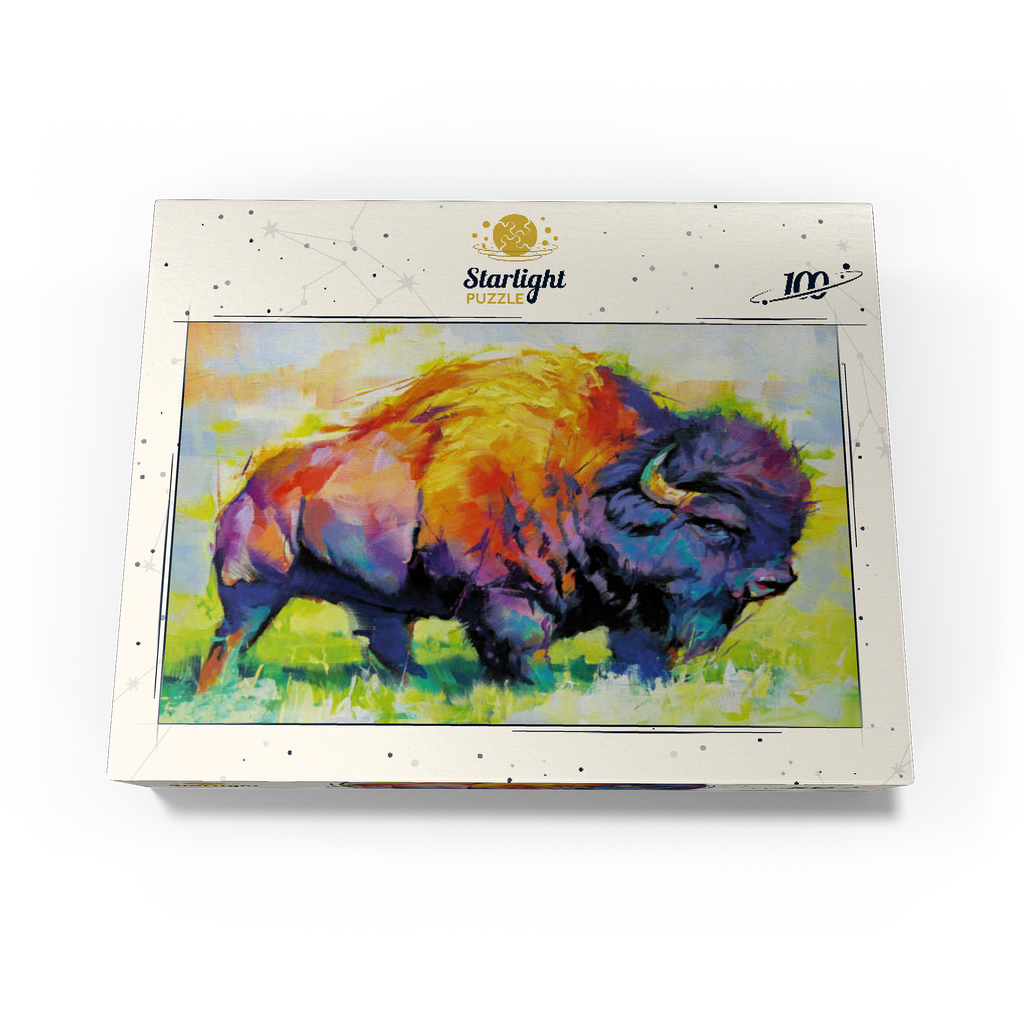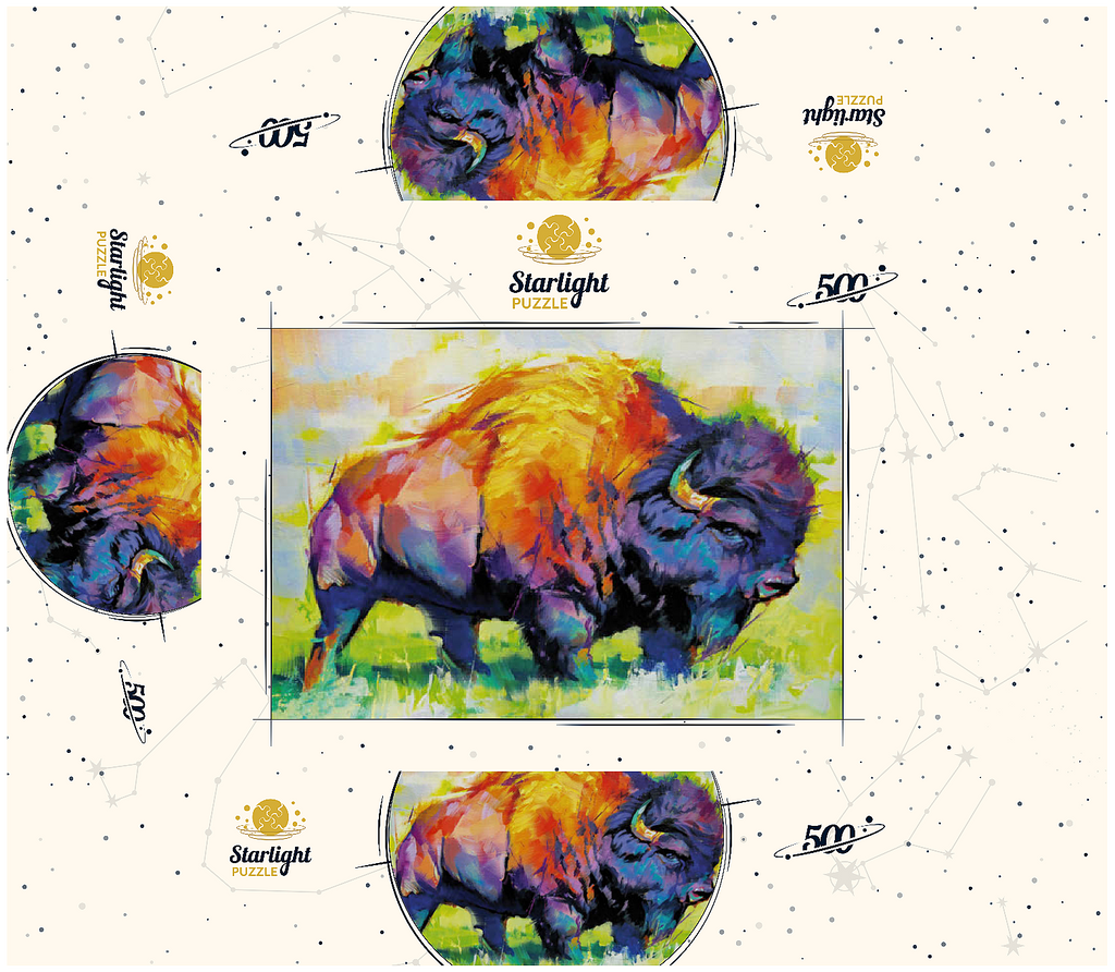 This bold and expressive painting features an American bison portrayed through a vivid blend of abstract colors and dynamic brushwork. The powerful stature of the bison is accentuated with vibrant hues of orange, yellow, purple, and teal, creating an energetic contrast against a soft green and blue background. The artwork captures the spirit and strength of this iconic North American animal while infusing it with a modern artistic twist. A perfect choice for lovers of wildlife and contemporary expressionism.