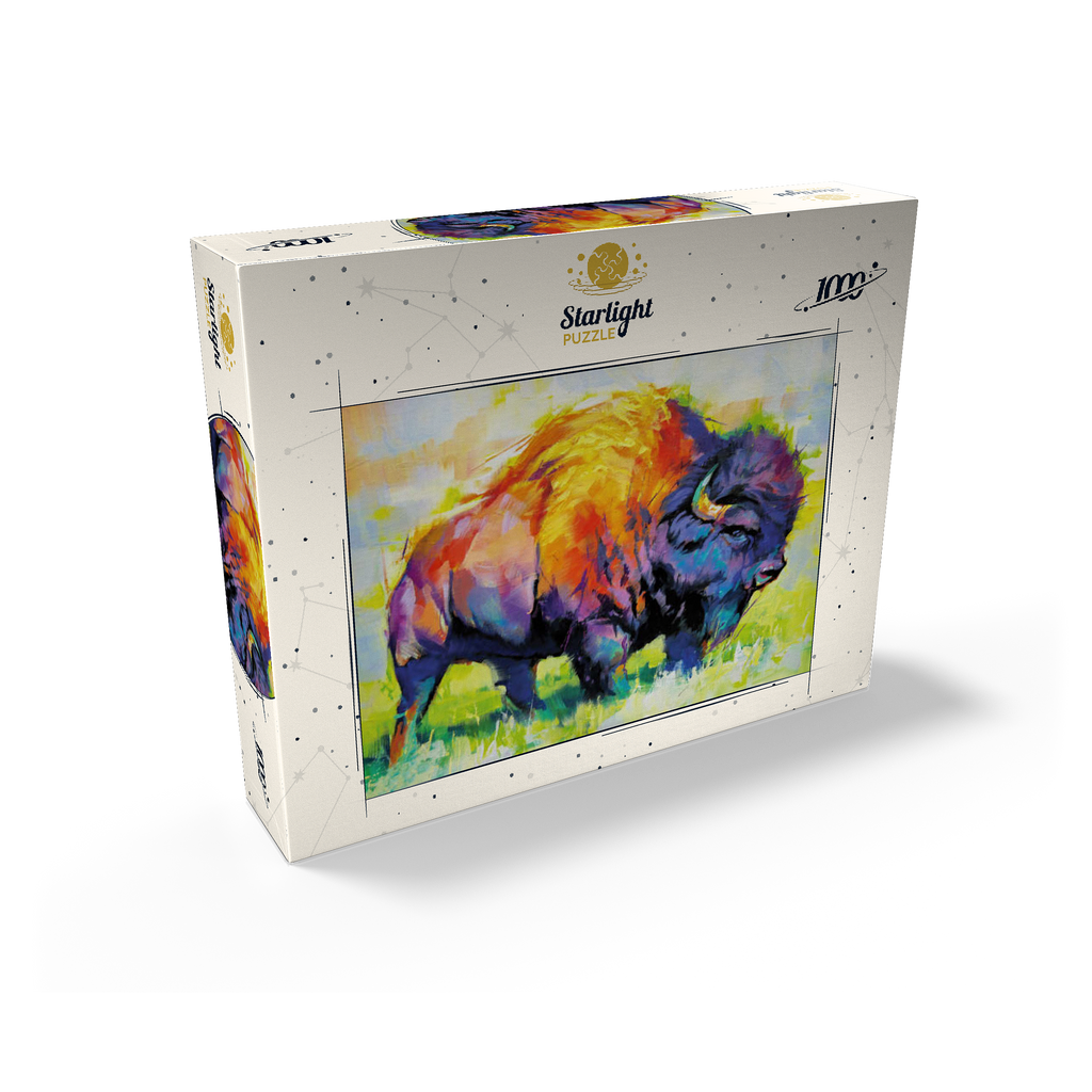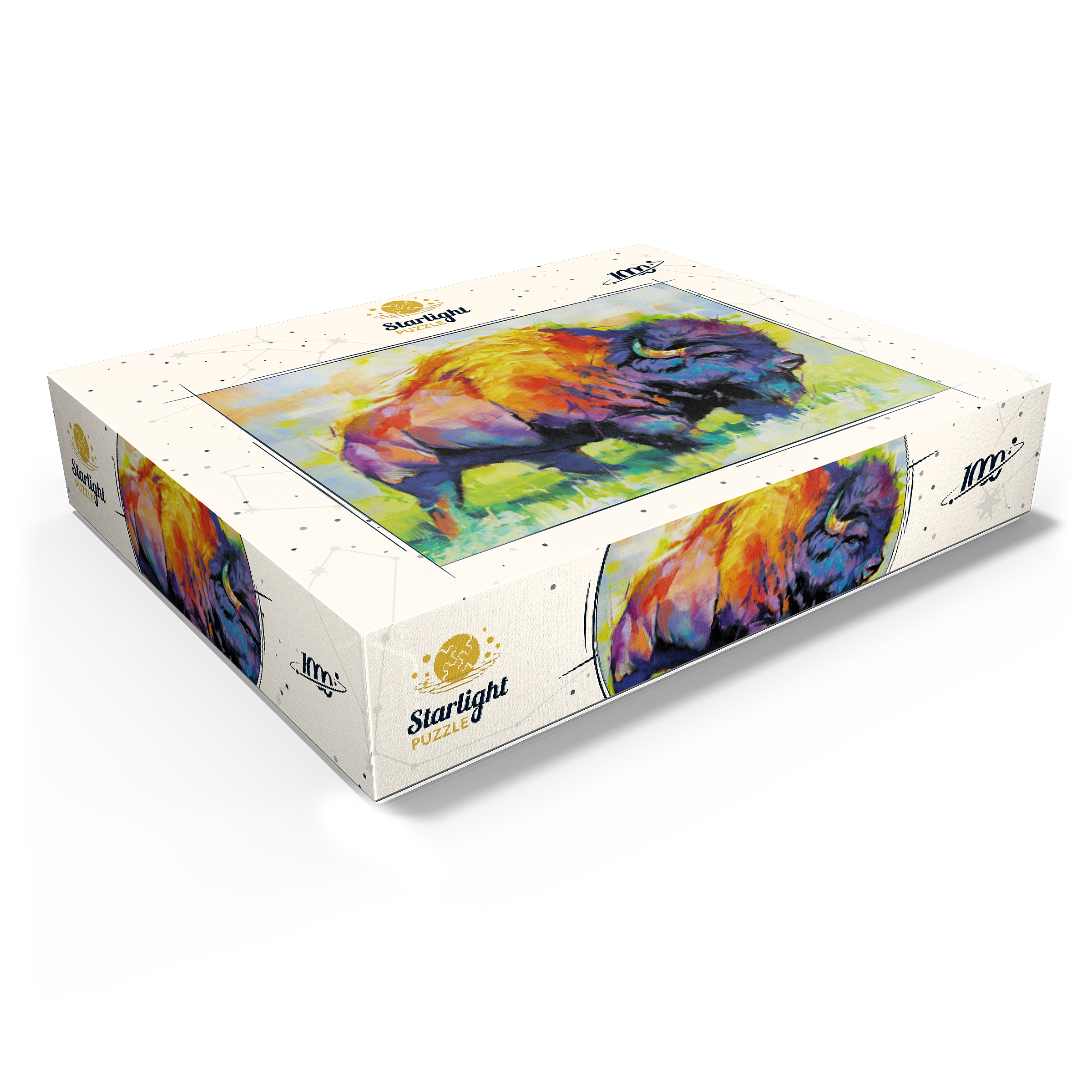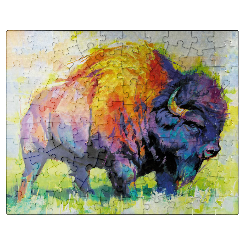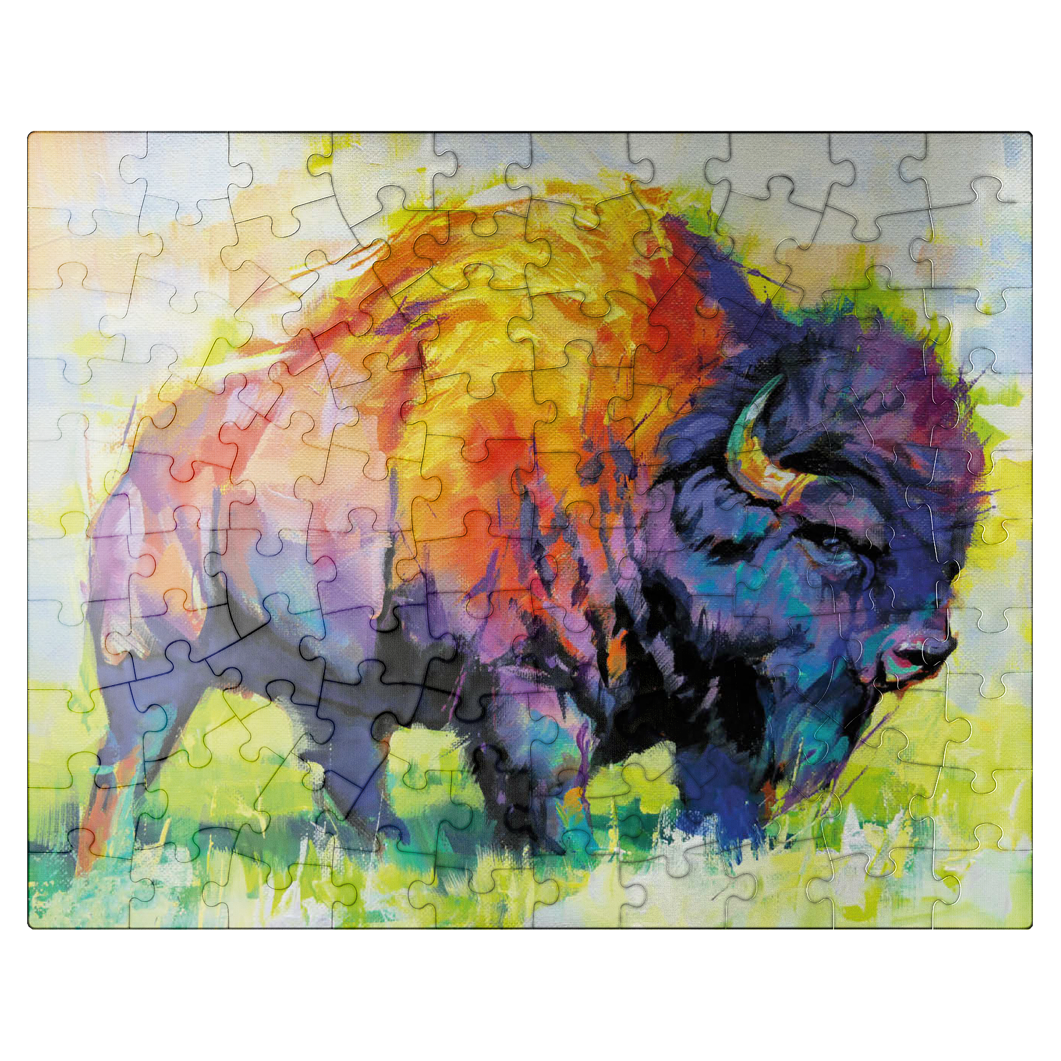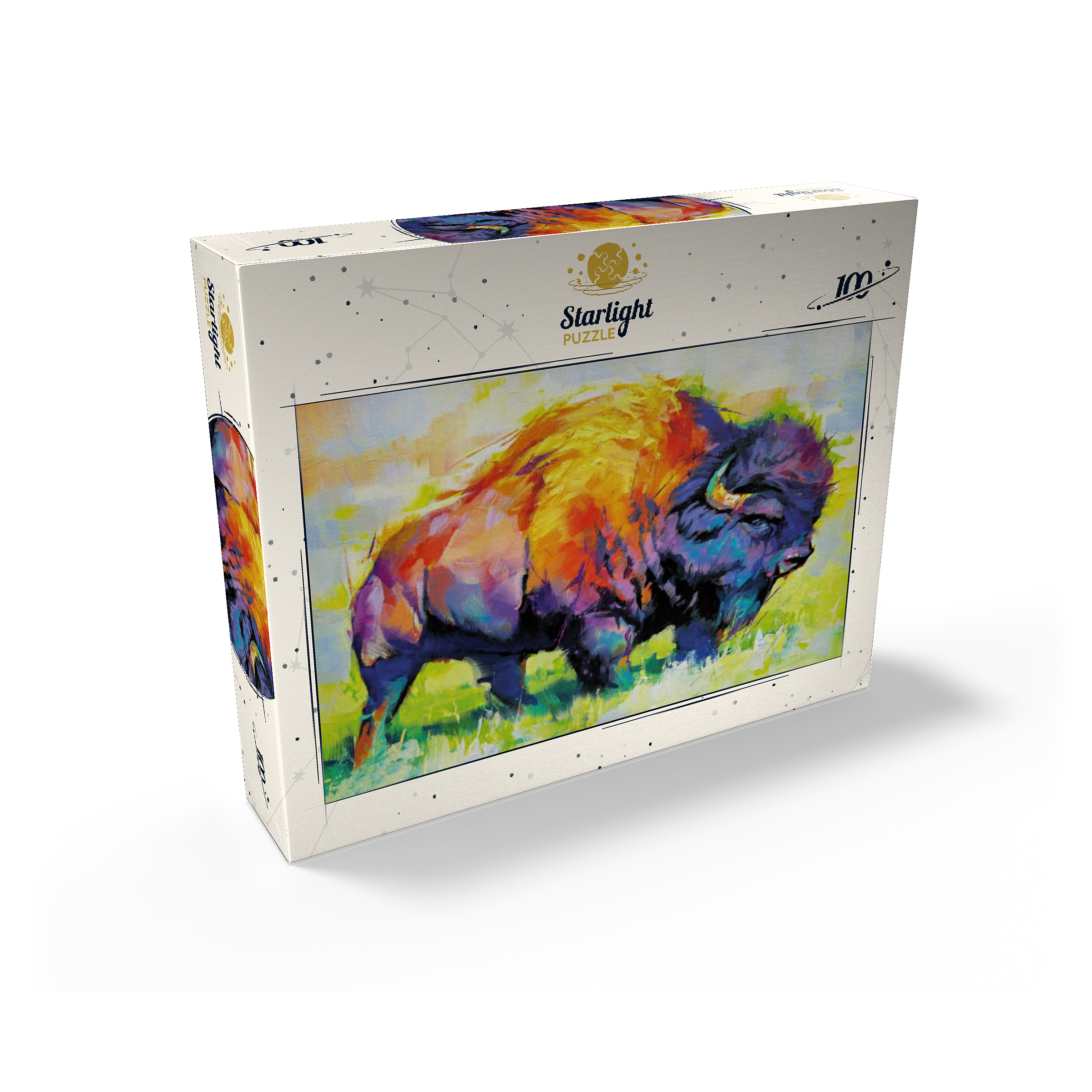 This bold and expressive painting features an American bison portrayed through a vivid blend of abstract colors and dynamic brushwork. The powerful stature of the bison is accentuated with vibrant hues of orange, yellow, purple, and teal, creating an energetic contrast against a soft green and blue background. The artwork captures the spirit and strength of this iconic North American animal while infusing it with a modern artistic twist. A perfect choice for lovers of wildlife and contemporary expressionism.