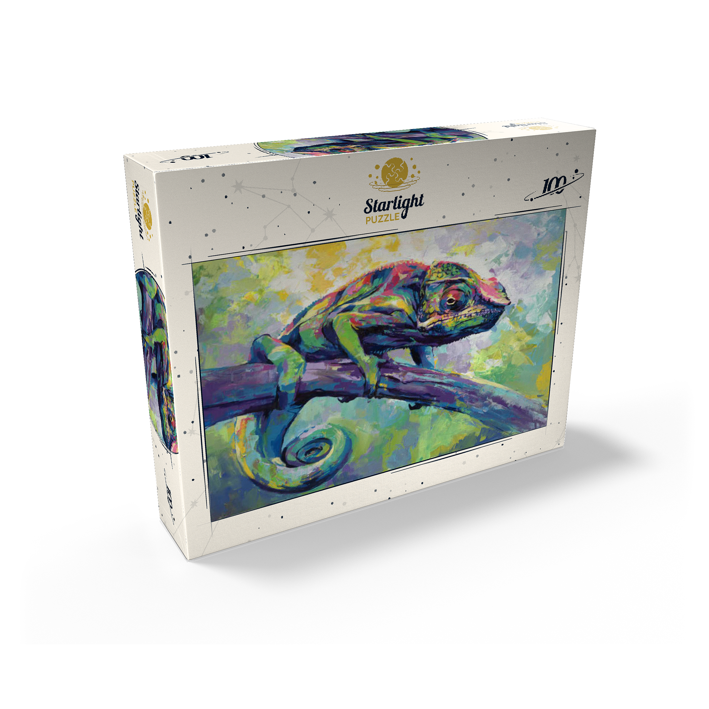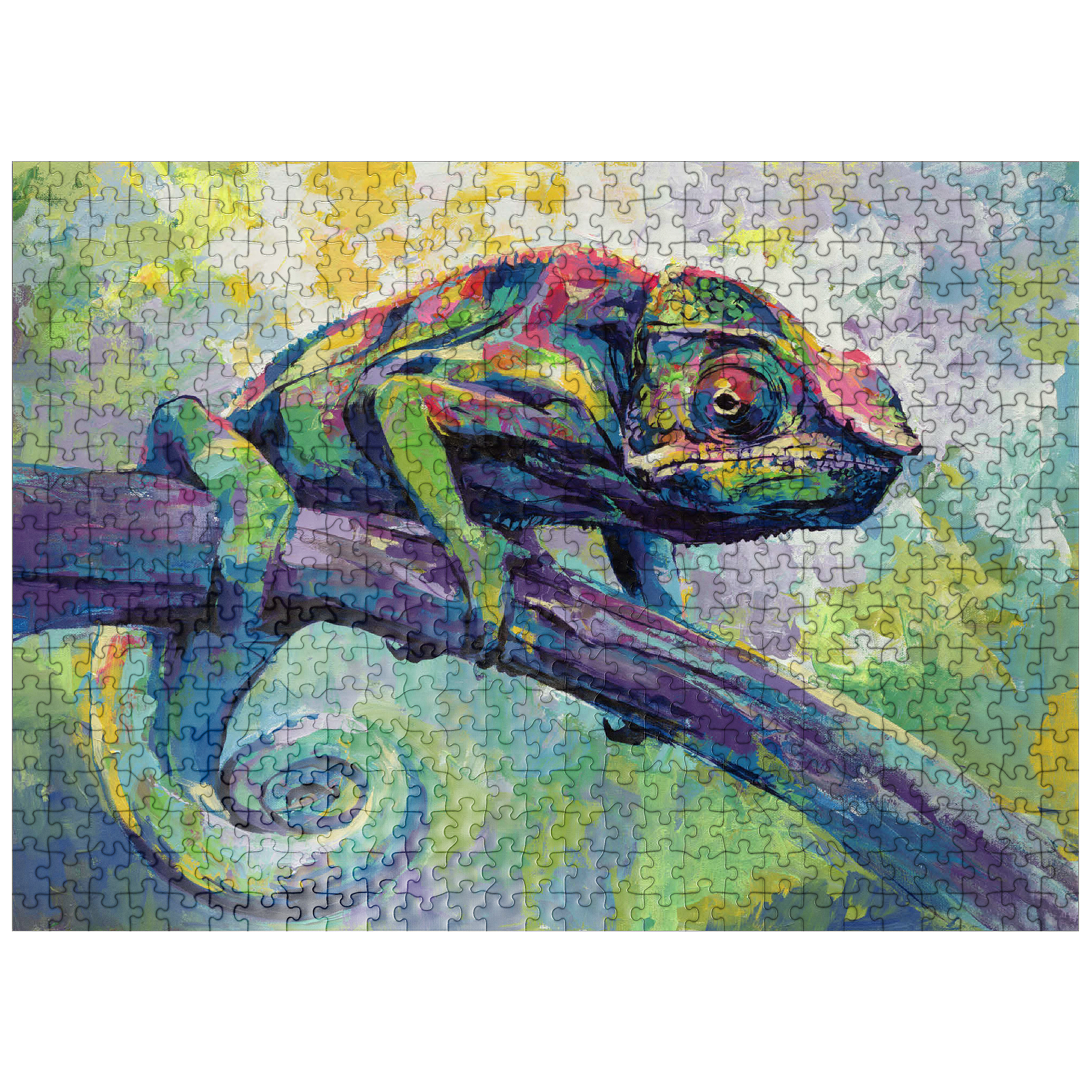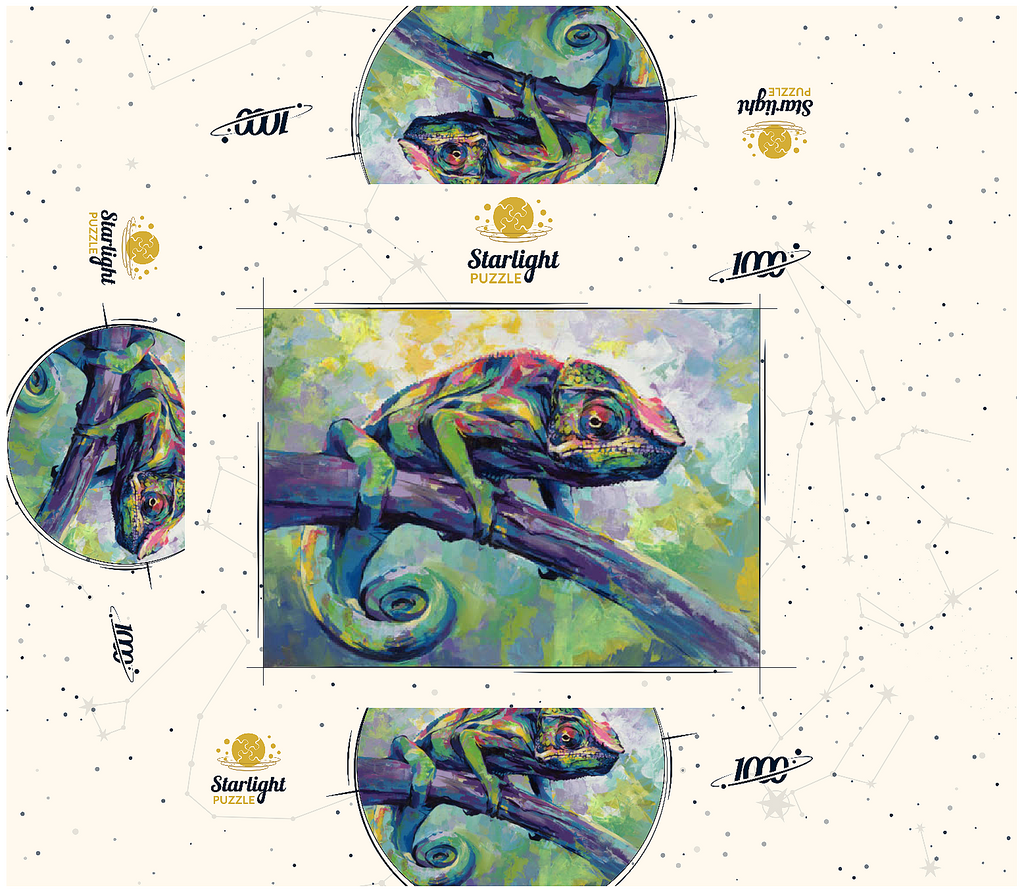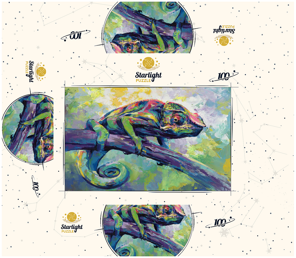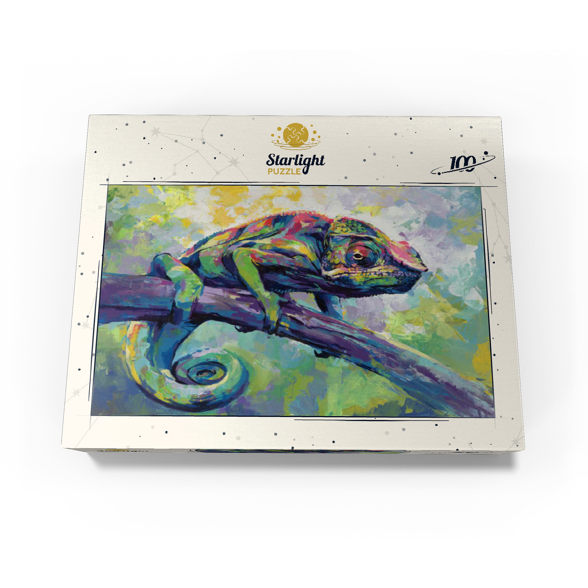This expressive painting captures a Panther Chameleon in its full chromatic glory, perched gracefully on a curved tree branch. The artwork is alive with a dynamic blend of colors-vivid greens, blues, purples, and pinks-reflecting the creature's natural ability to blend into its surroundings while standing out in artistic form. The textured brushstrokes and impressionistic background of foliage and light give the scene a vibrant energy, emphasizing the exotic and captivating beauty of this remarkable reptile. A perfect homage to one of nature's most fascinating masters of disguise.