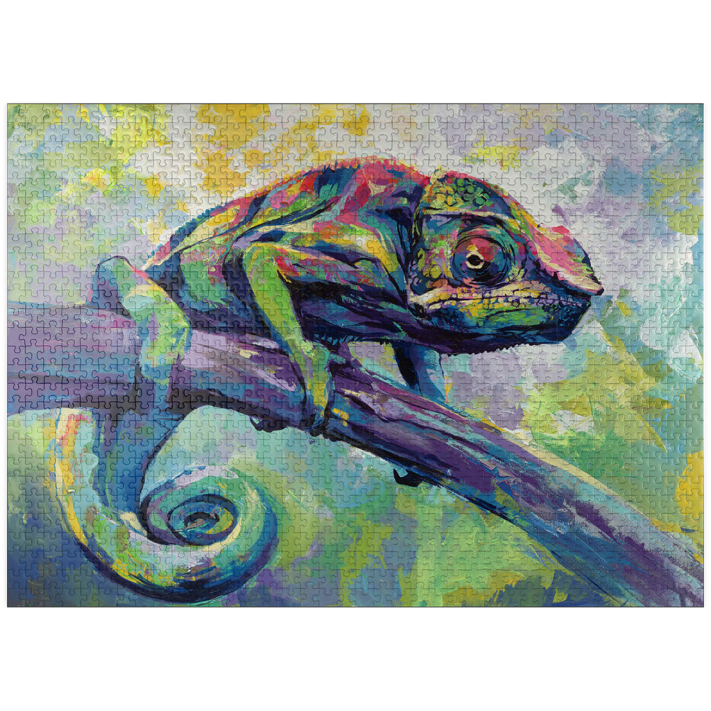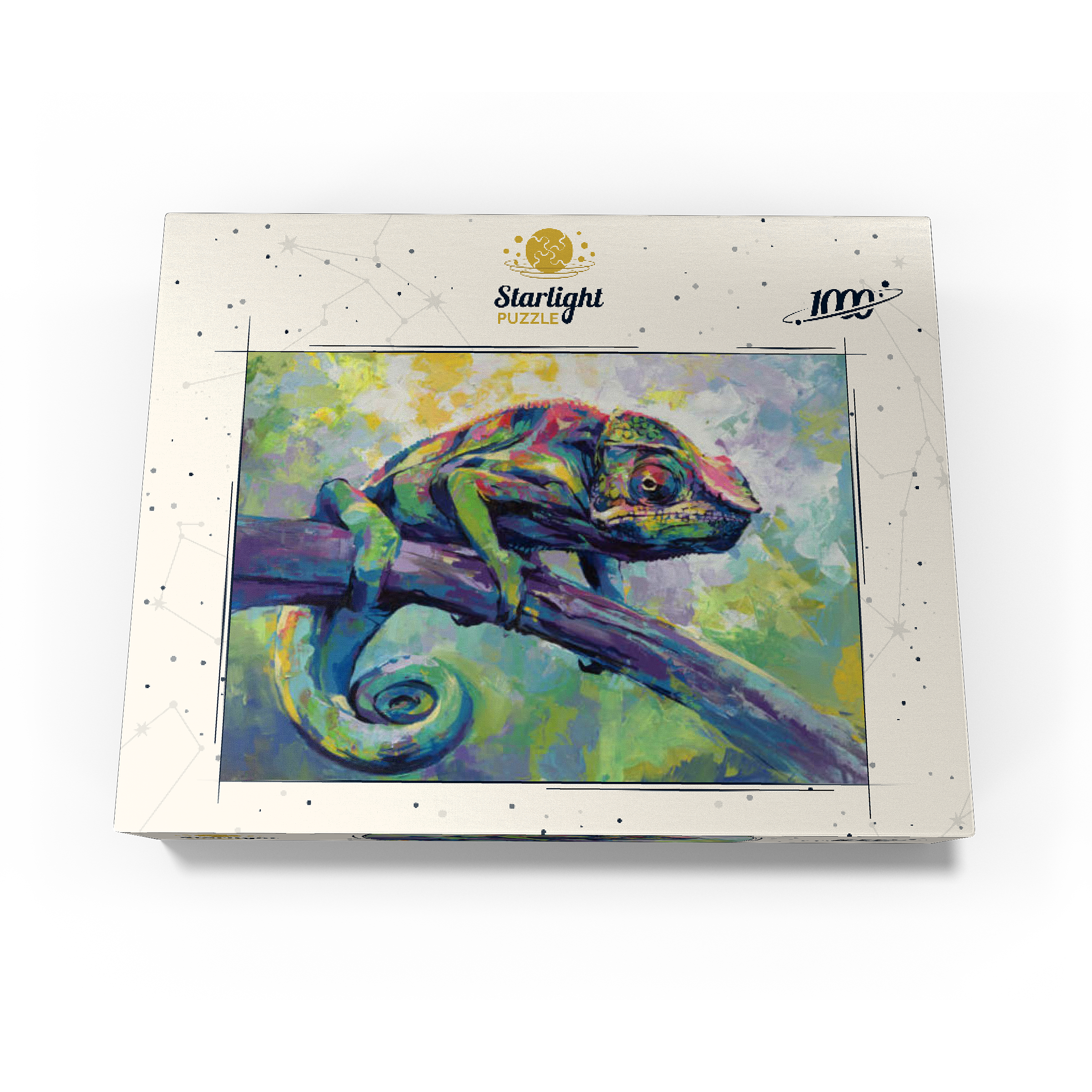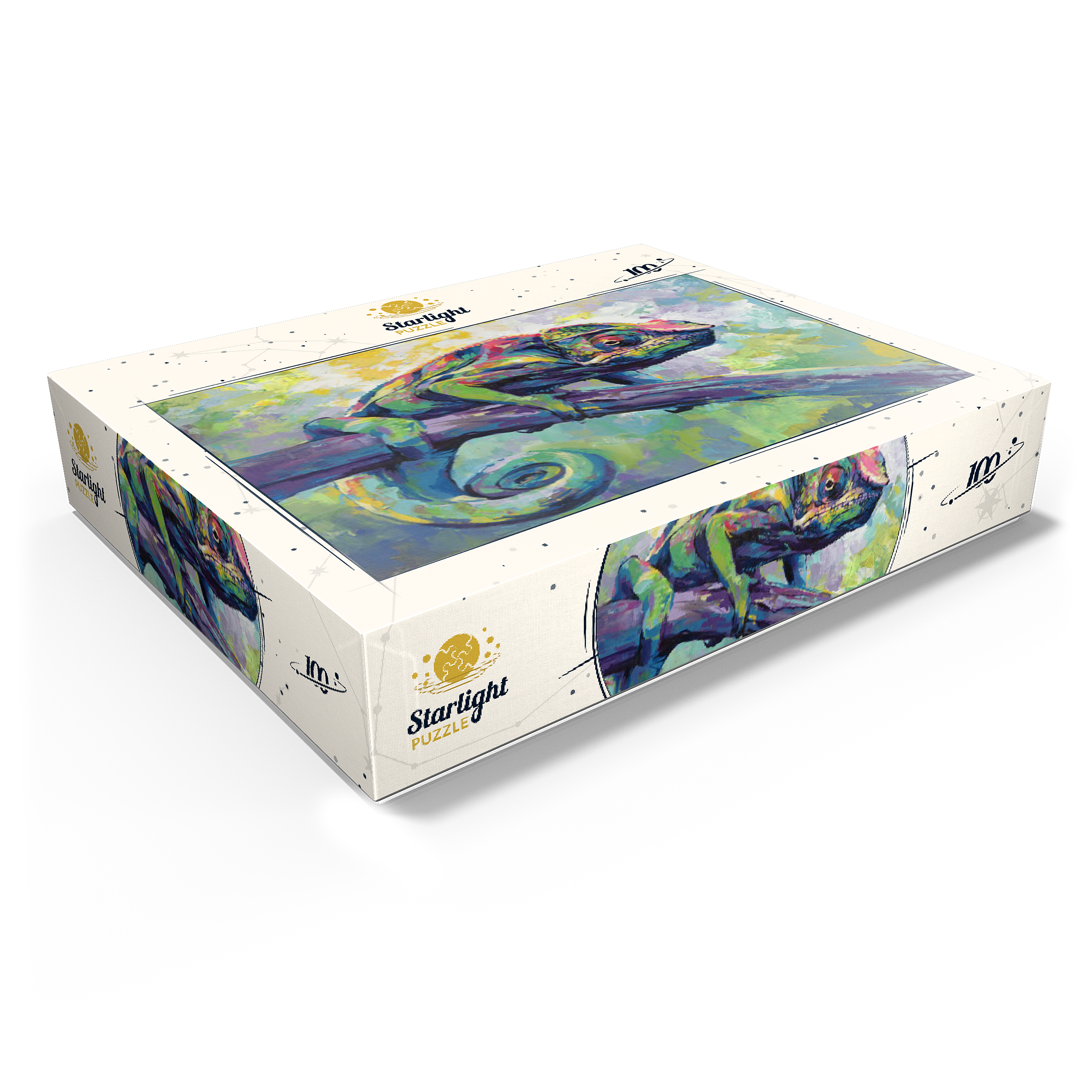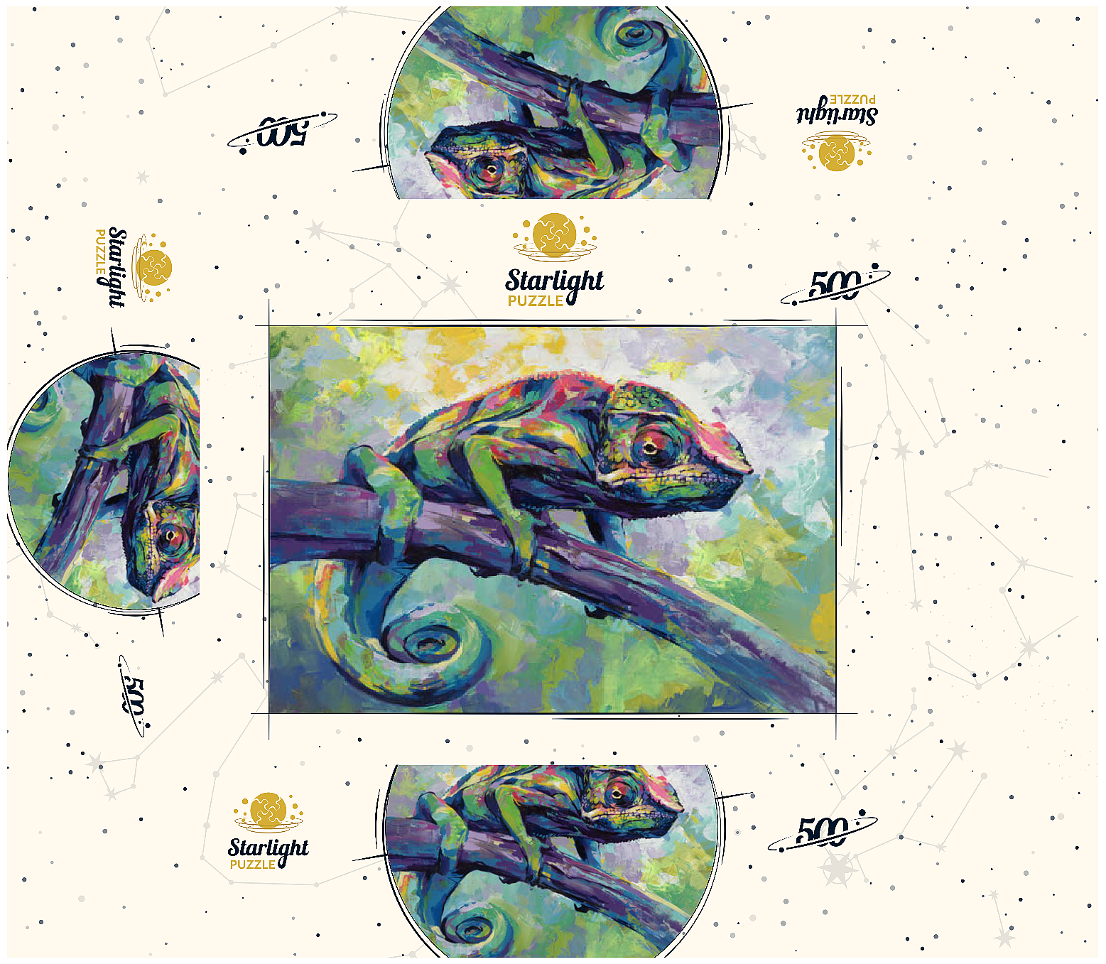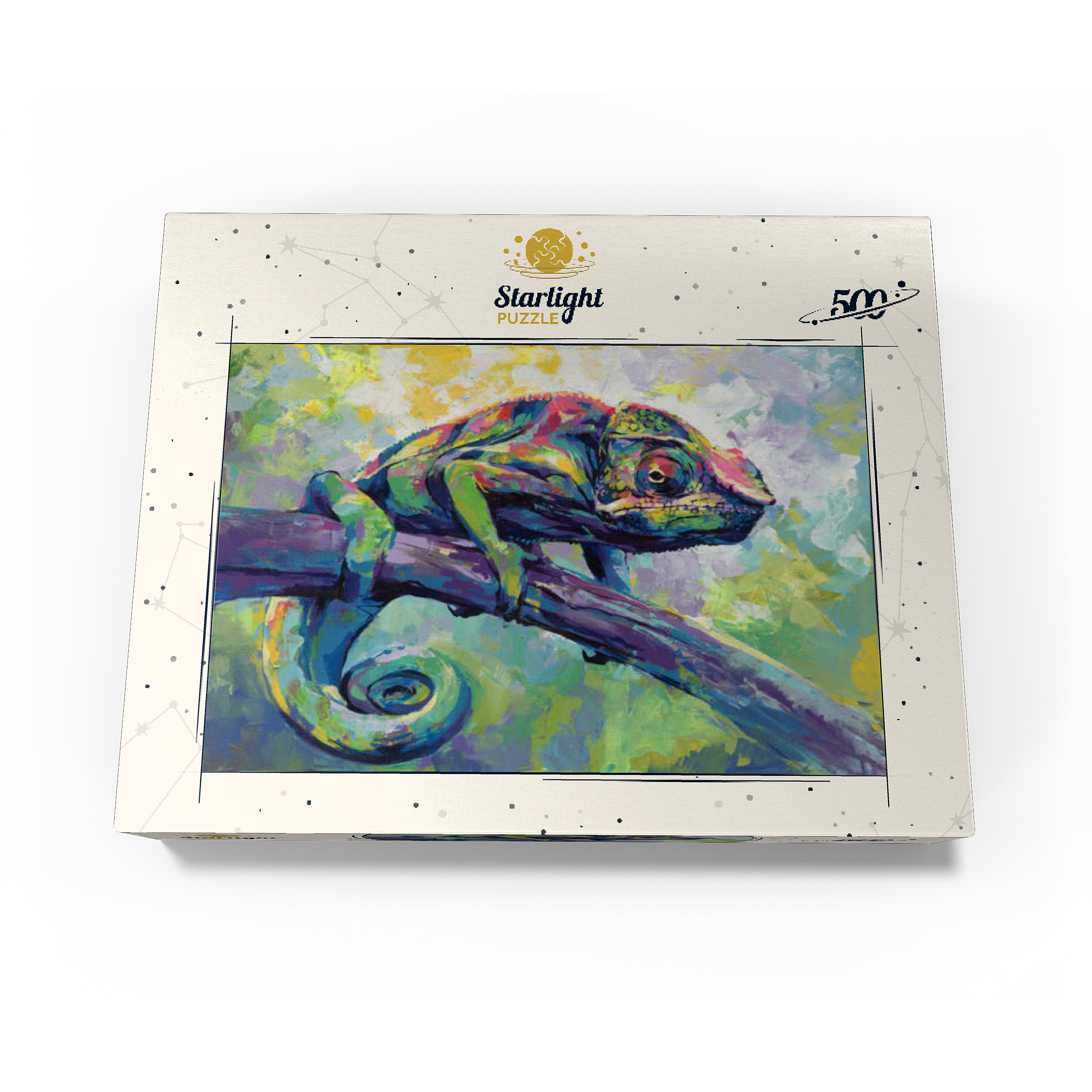 This expressive painting captures a Panther Chameleon in its full chromatic glory, perched gracefully on a curved tree branch. The artwork is alive with a dynamic blend of colors-vivid greens, blues, purples, and pinks-reflecting the creature's natural ability to blend into its surroundings while standing out in artistic form. The textured brushstrokes and impressionistic background of foliage and light give the scene a vibrant energy, emphasizing the exotic and captivating beauty of this remarkable reptile. A perfect homage to one of nature's most fascinating masters of disguise.