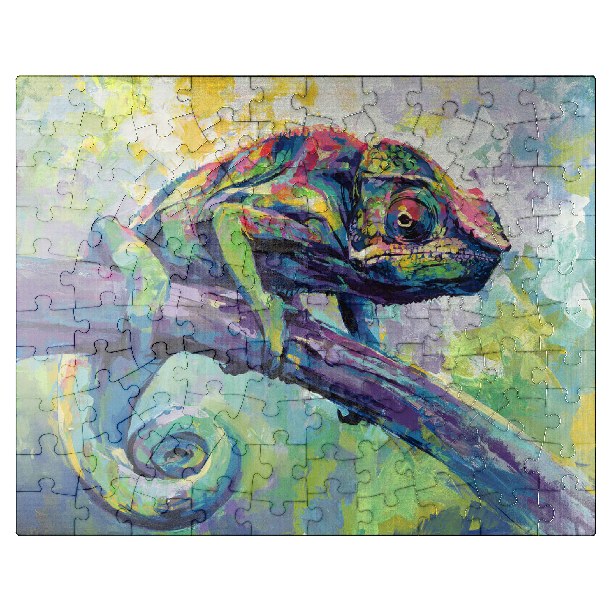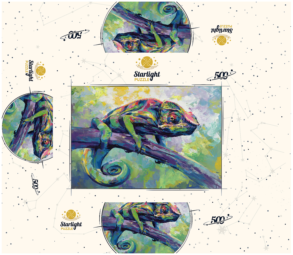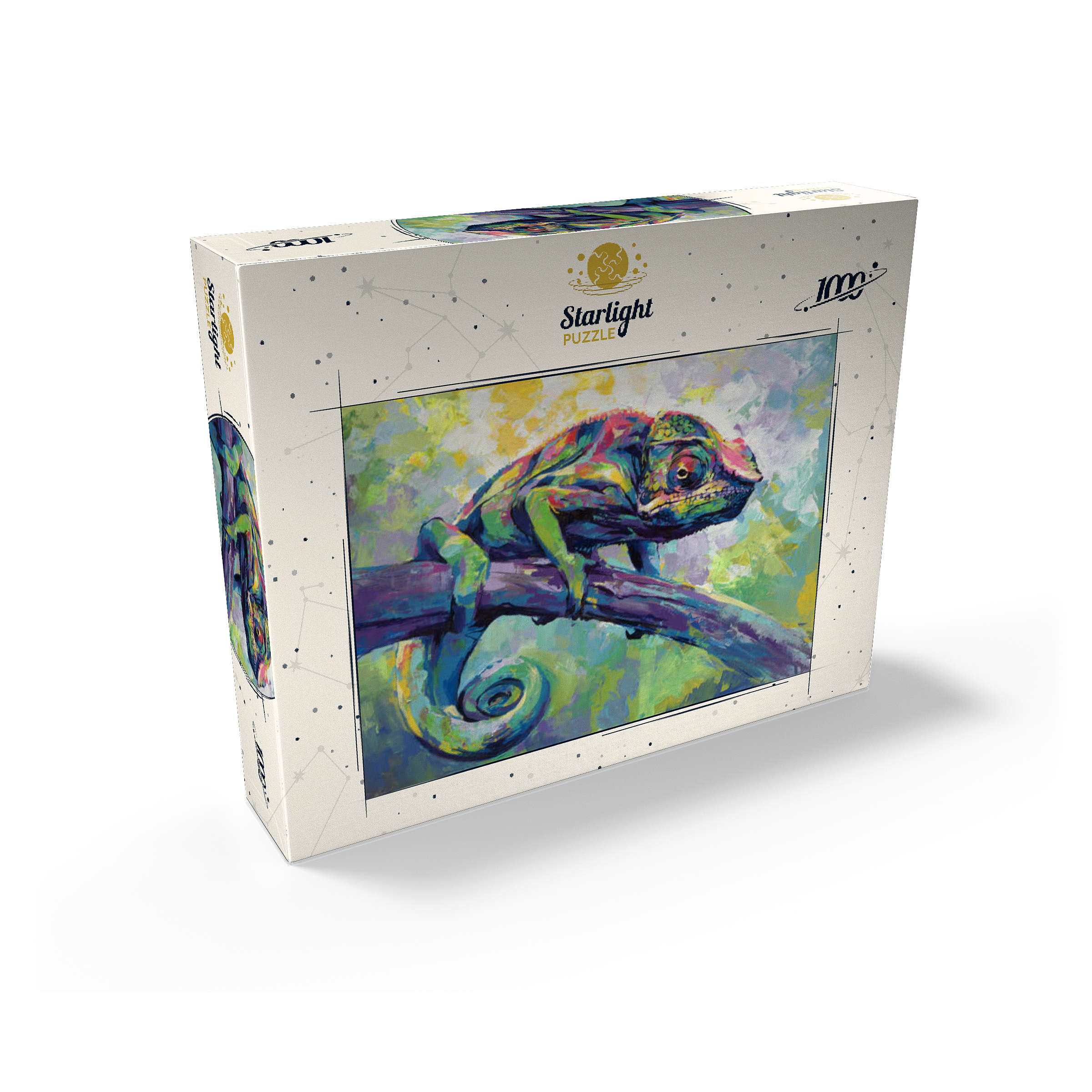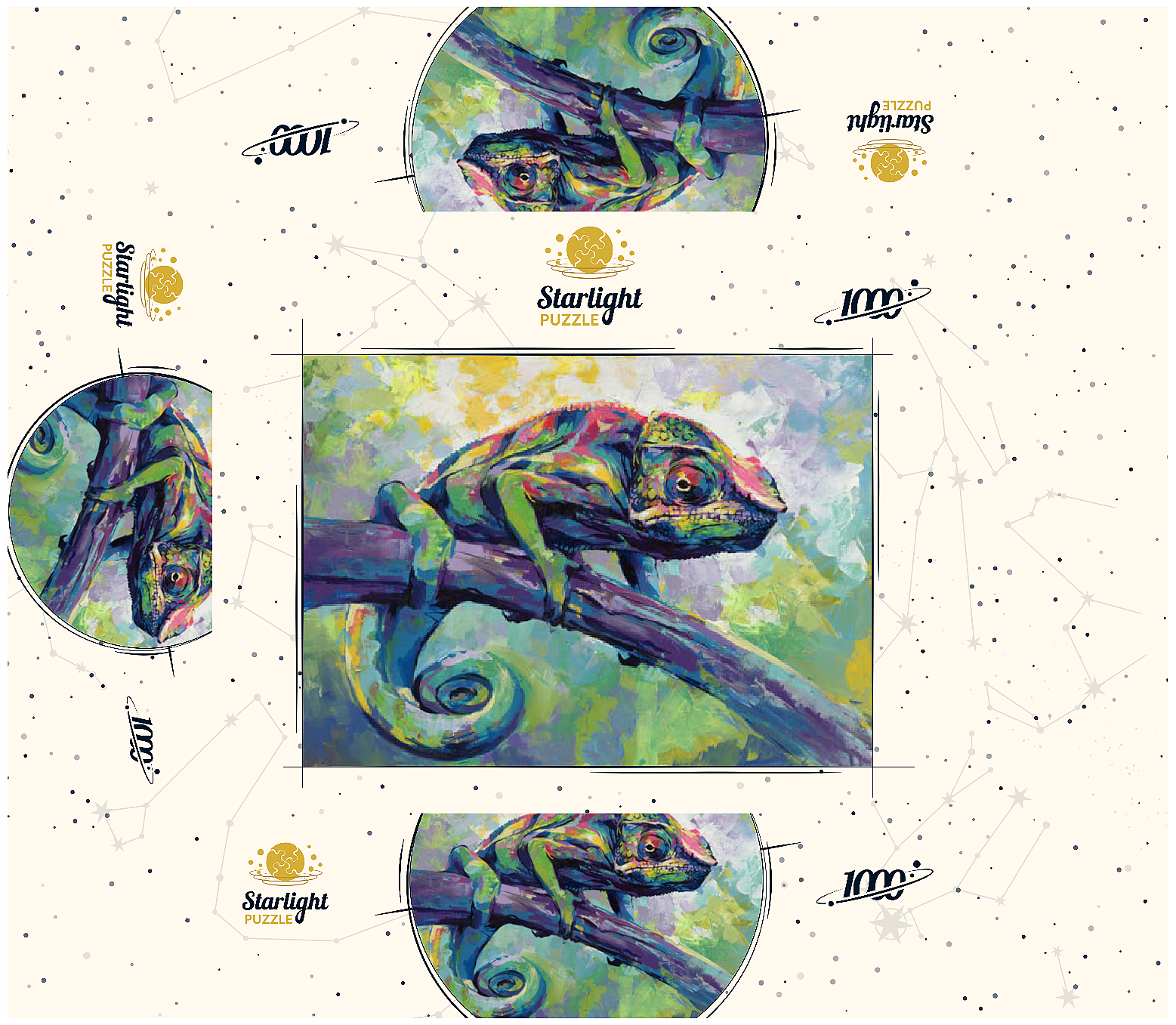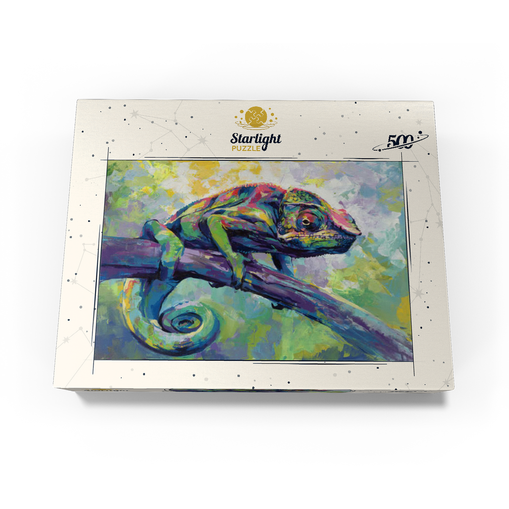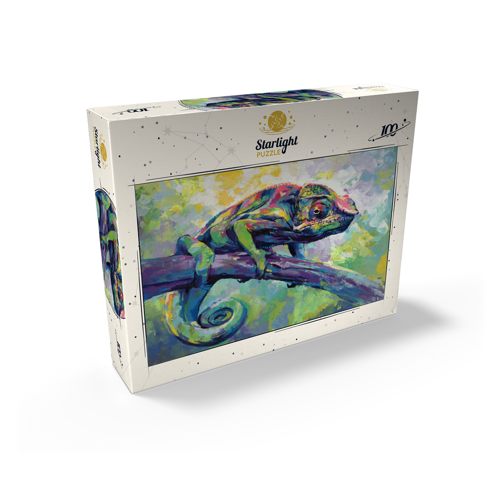 This expressive painting captures a Panther Chameleon in its full chromatic glory, perched gracefully on a curved tree branch. The artwork is alive with a dynamic blend of colors-vivid greens, blues, purples, and pinks-reflecting the creature's natural ability to blend into its surroundings while standing out in artistic form. The textured brushstrokes and impressionistic background of foliage and light give the scene a vibrant energy, emphasizing the exotic and captivating beauty of this remarkable reptile. A perfect homage to one of nature's most fascinating masters of disguise.