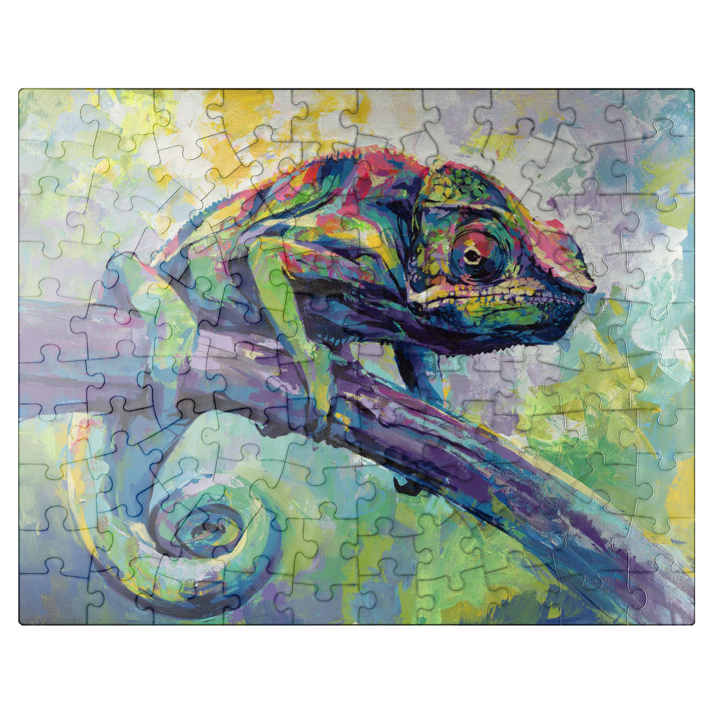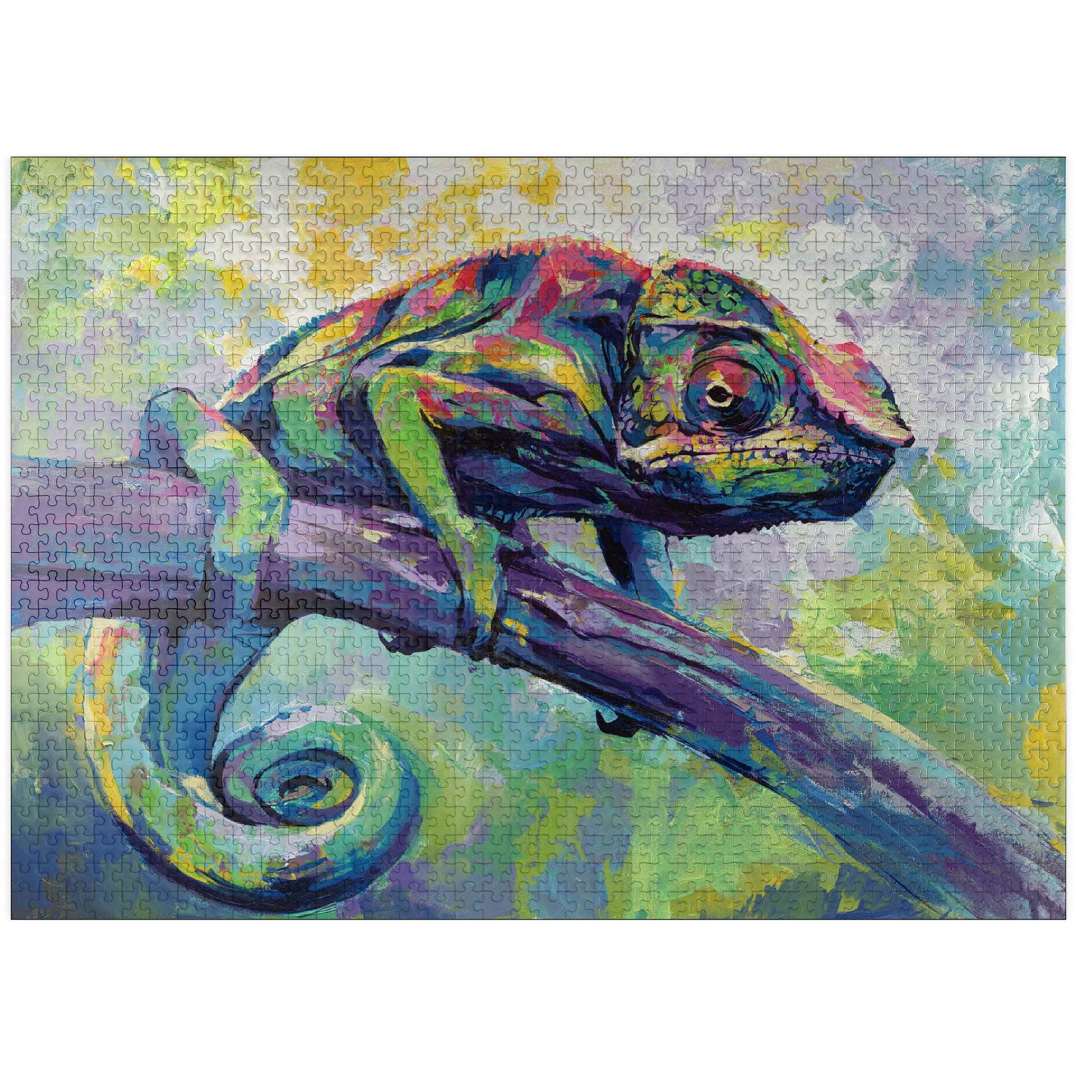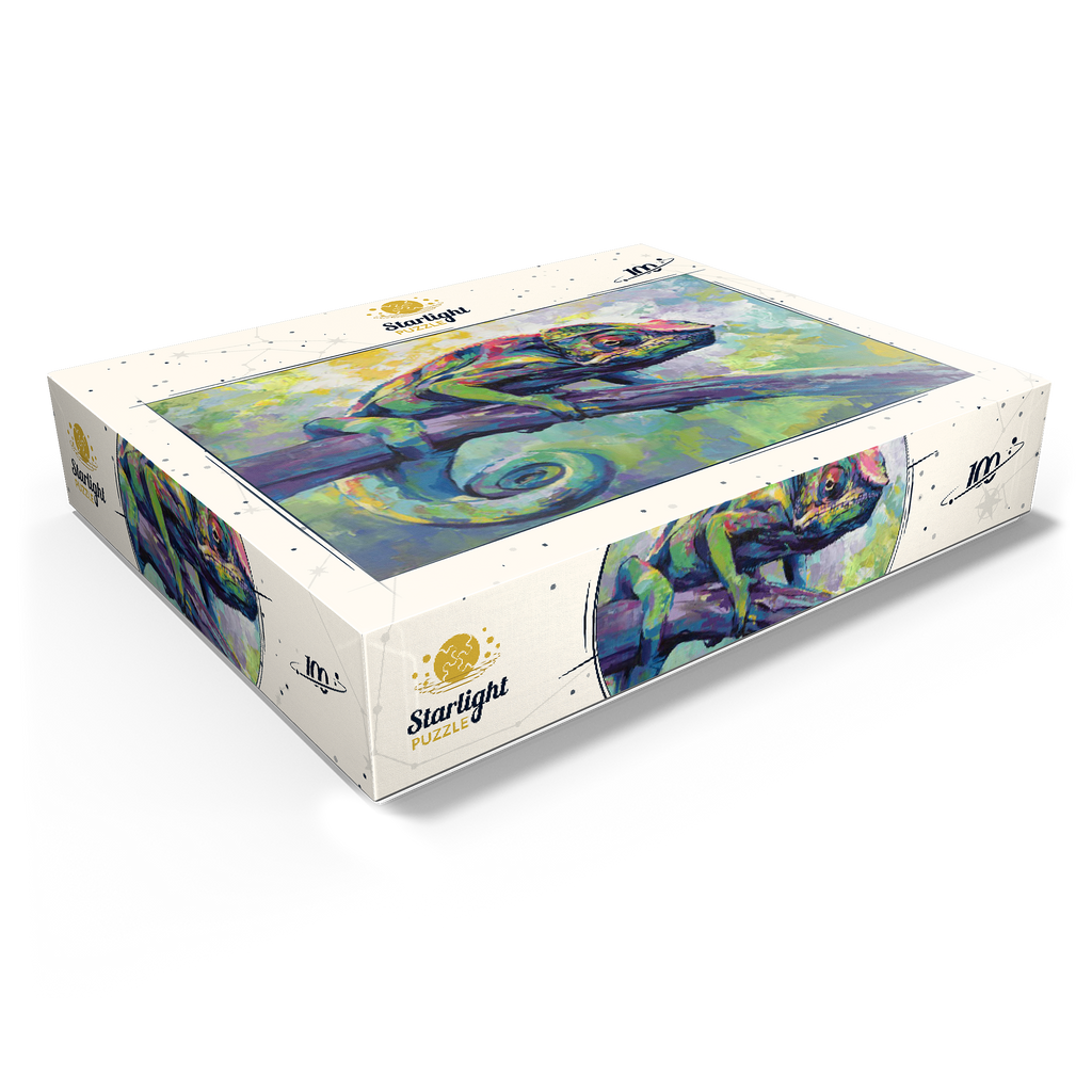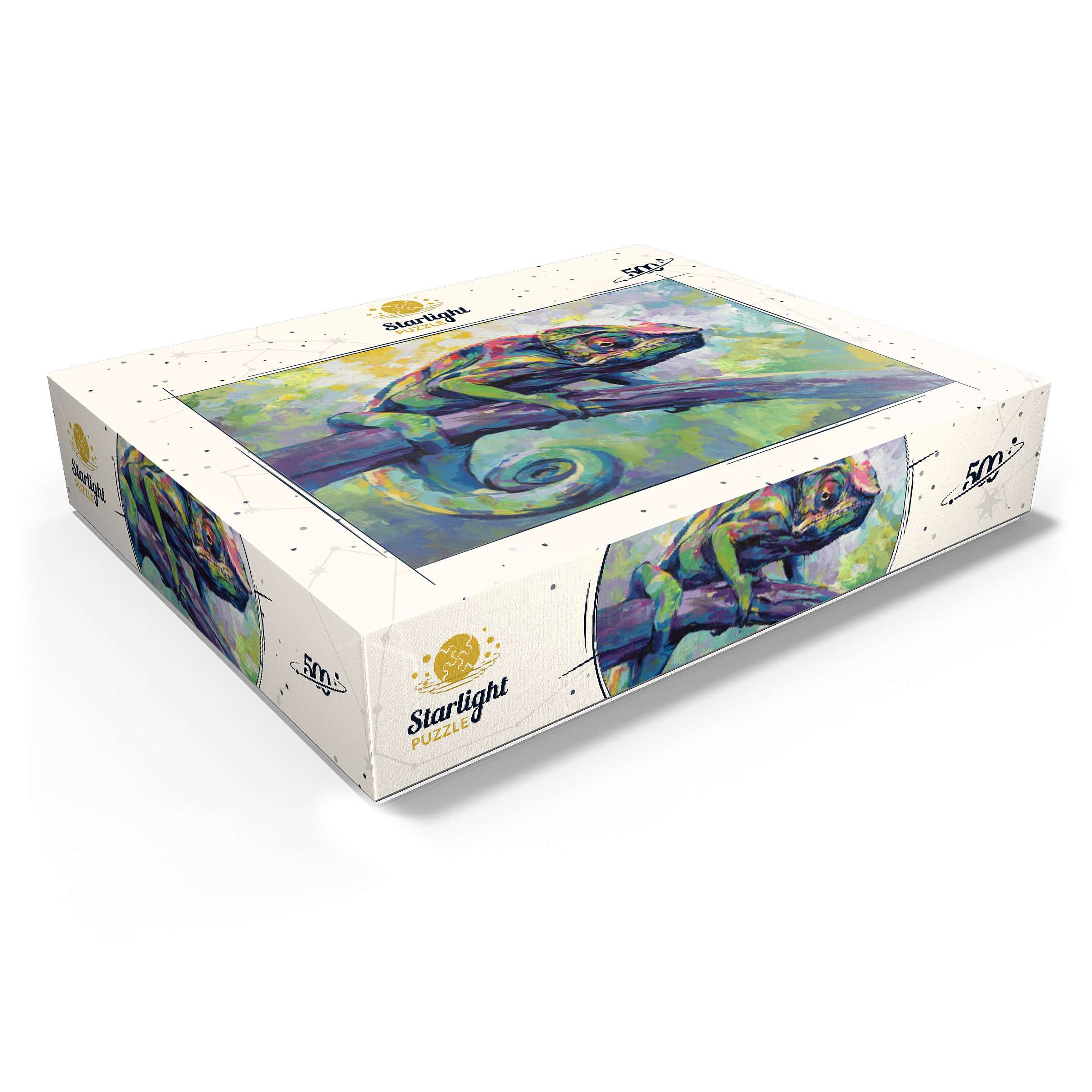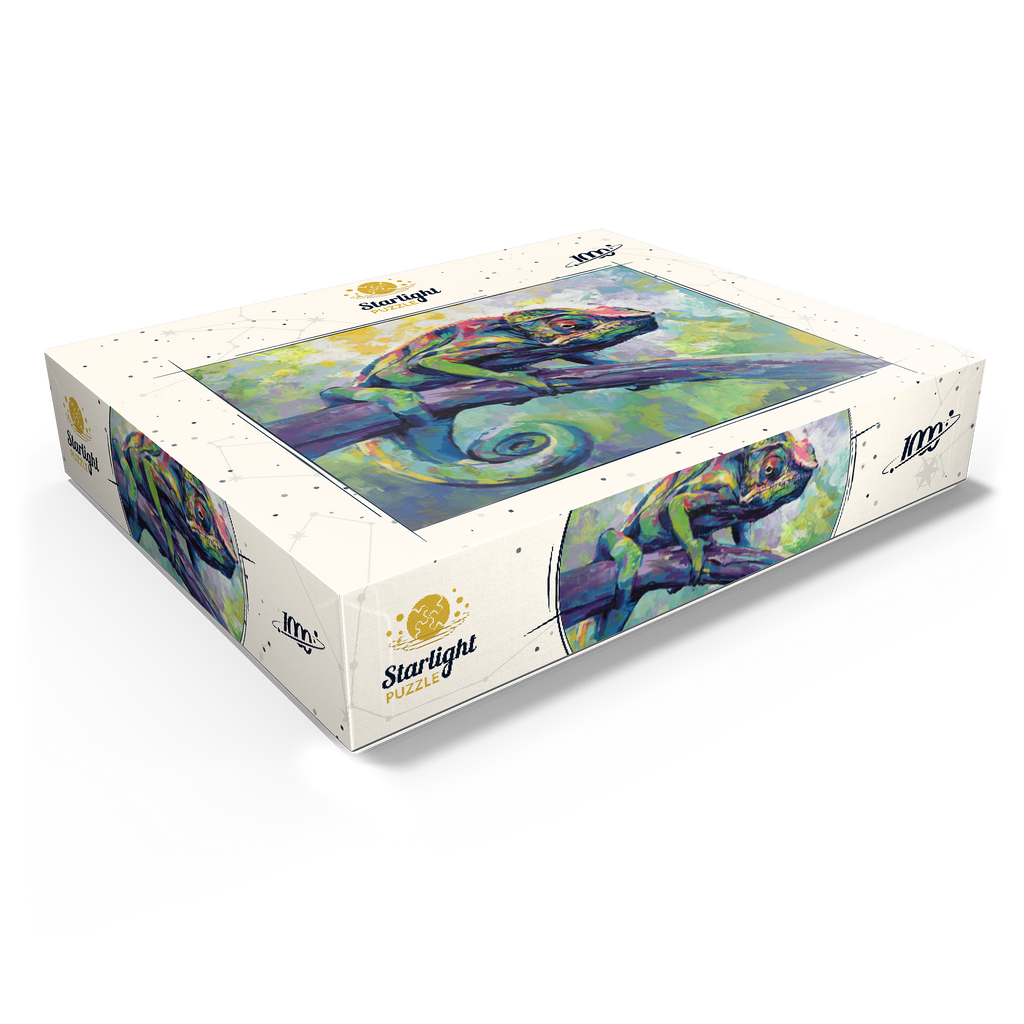 This expressive painting captures a Panther Chameleon in its full chromatic glory, perched gracefully on a curved tree branch. The artwork is alive with a dynamic blend of colors-vivid greens, blues, purples, and pinks-reflecting the creature's natural ability to blend into its surroundings while standing out in artistic form. The textured brushstrokes and impressionistic background of foliage and light give the scene a vibrant energy, emphasizing the exotic and captivating beauty of this remarkable reptile. A perfect homage to one of nature's most fascinating masters of disguise.