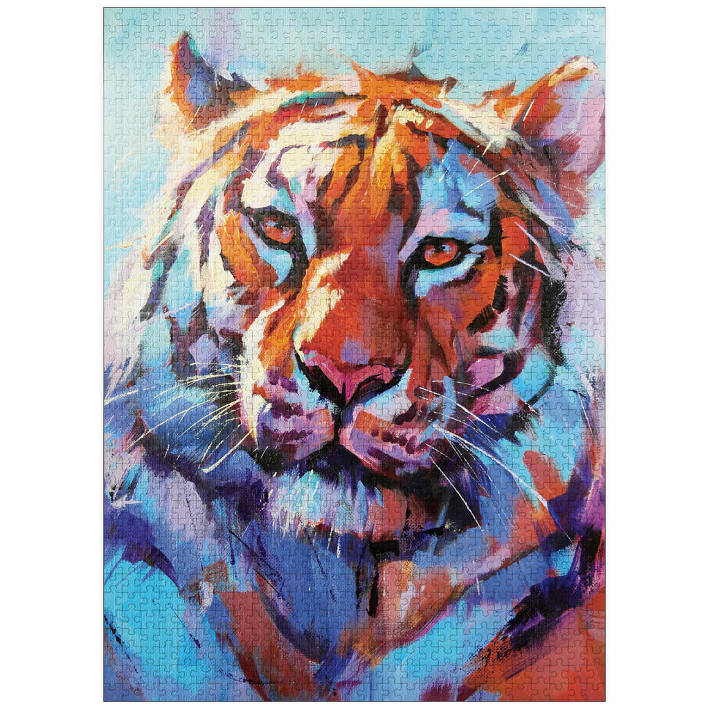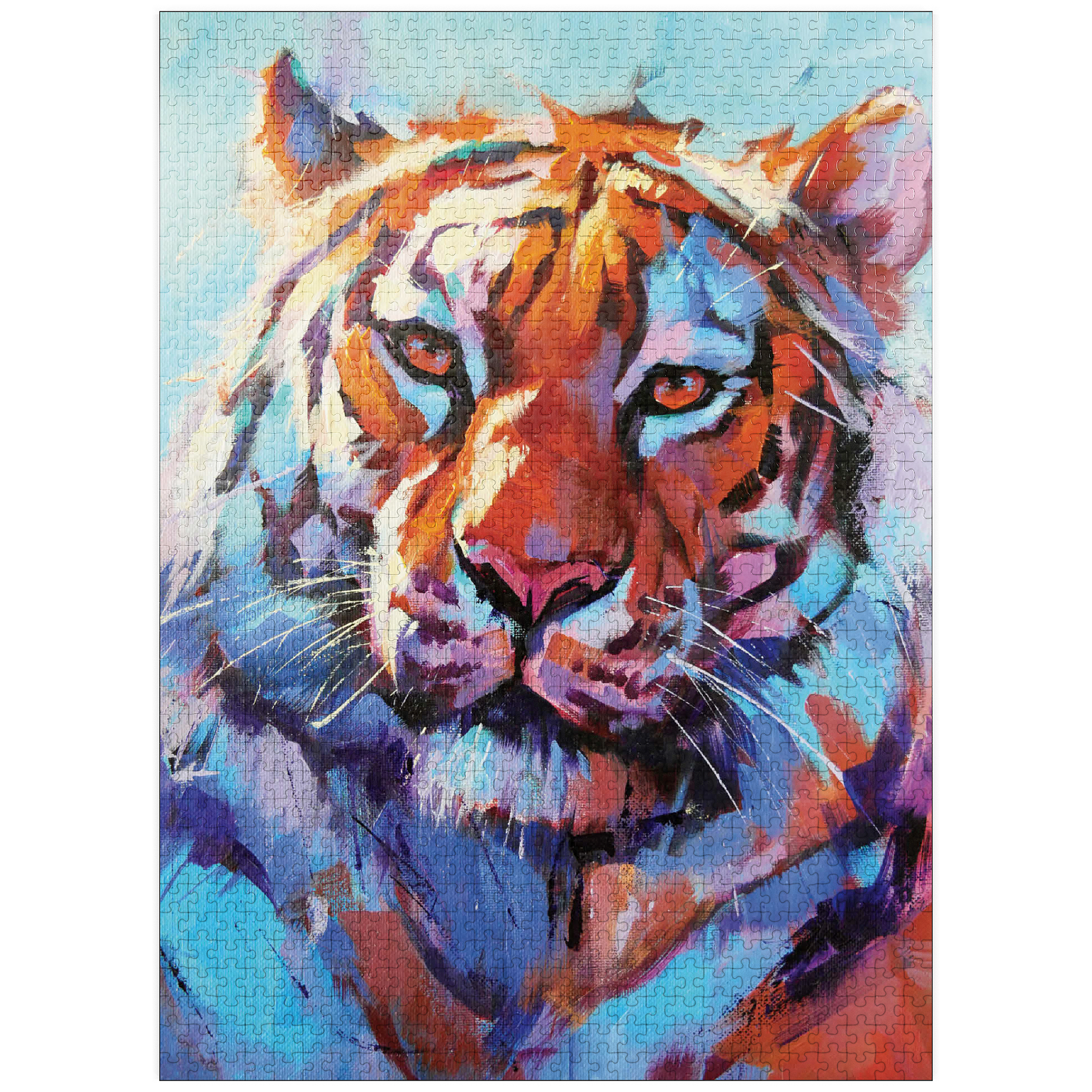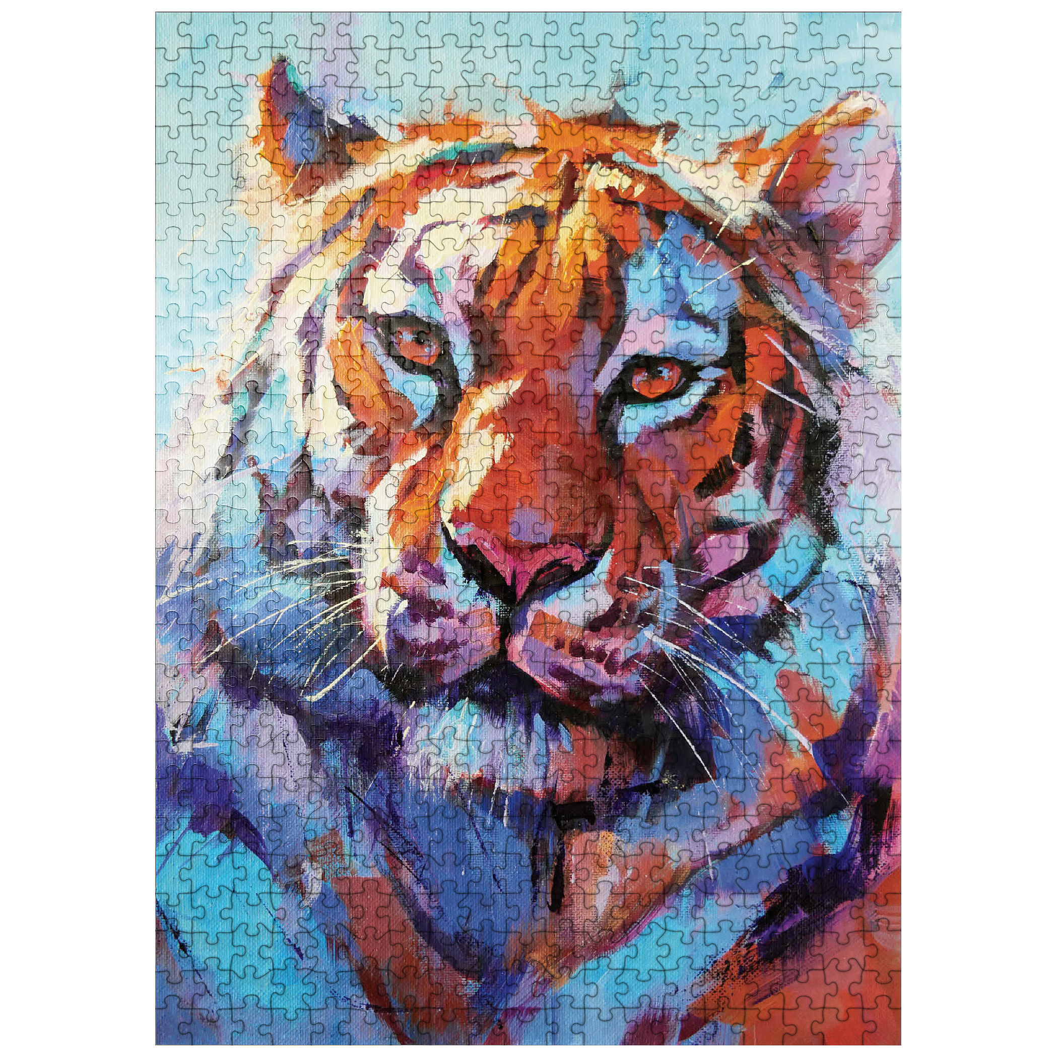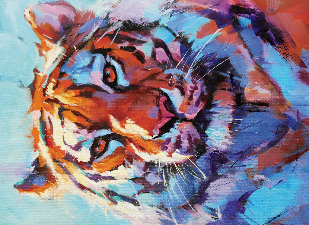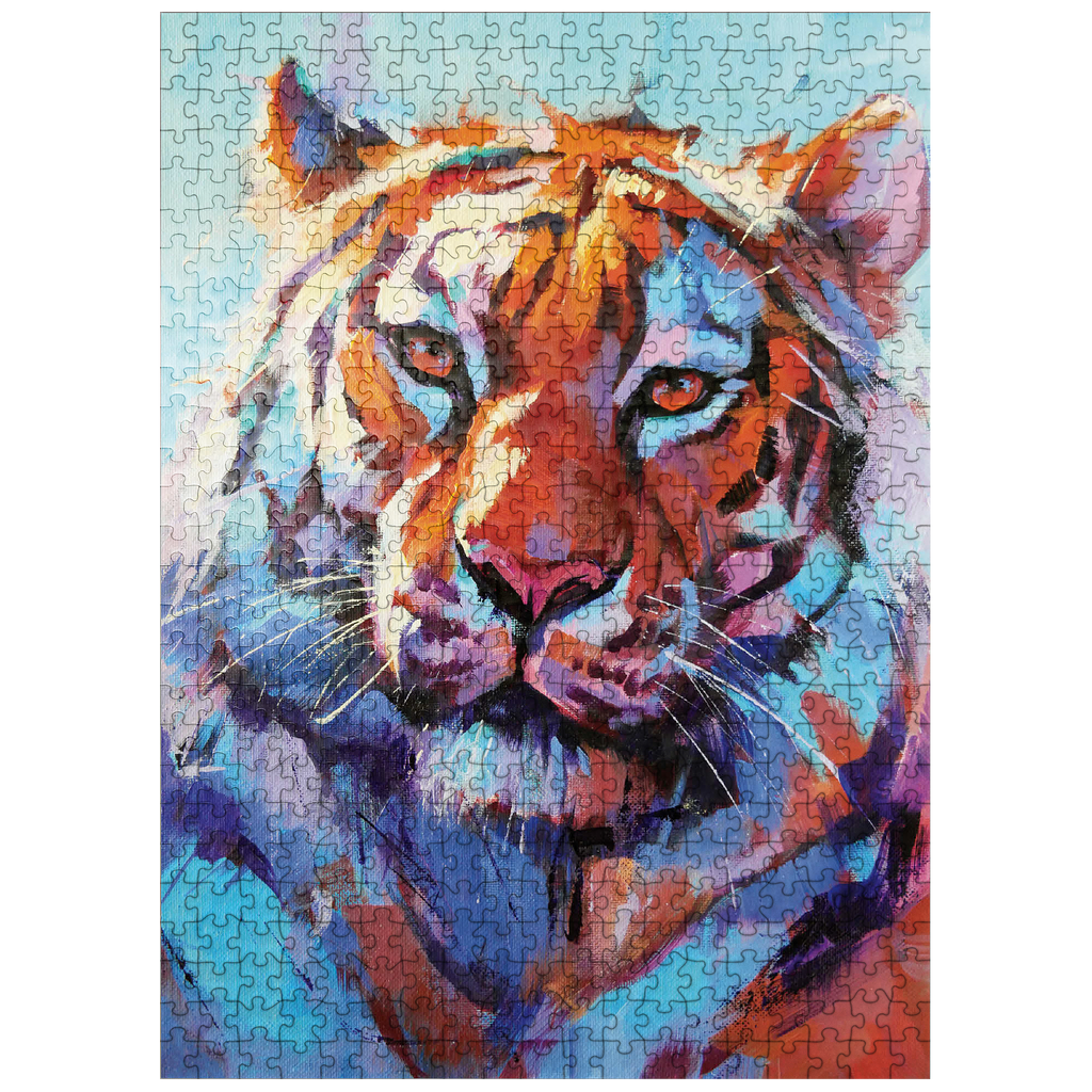 This dynamic expressionist painting captures the raw majesty of a Bengal tiger through bold brushstrokes and an electric color palette. The artwork blends fiery oranges and reds with cool blues and purples, highlighting the tiger's intense gaze and iconic striped coat. The textured composition and abstract background add depth and movement, making the tiger appear both powerful and ethereal. A striking representation of wildlife and strength, perfect for lovers of big cats and contemporary art alike.