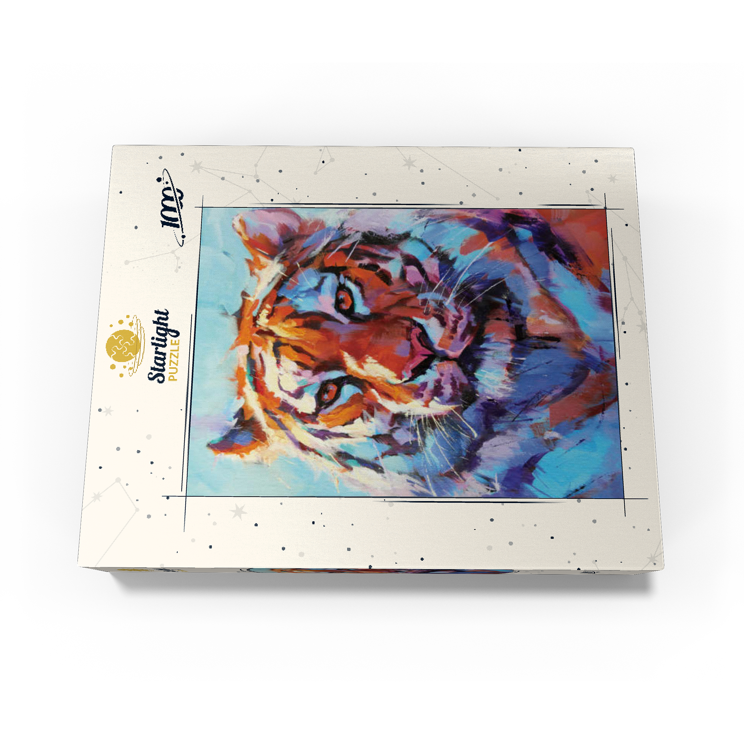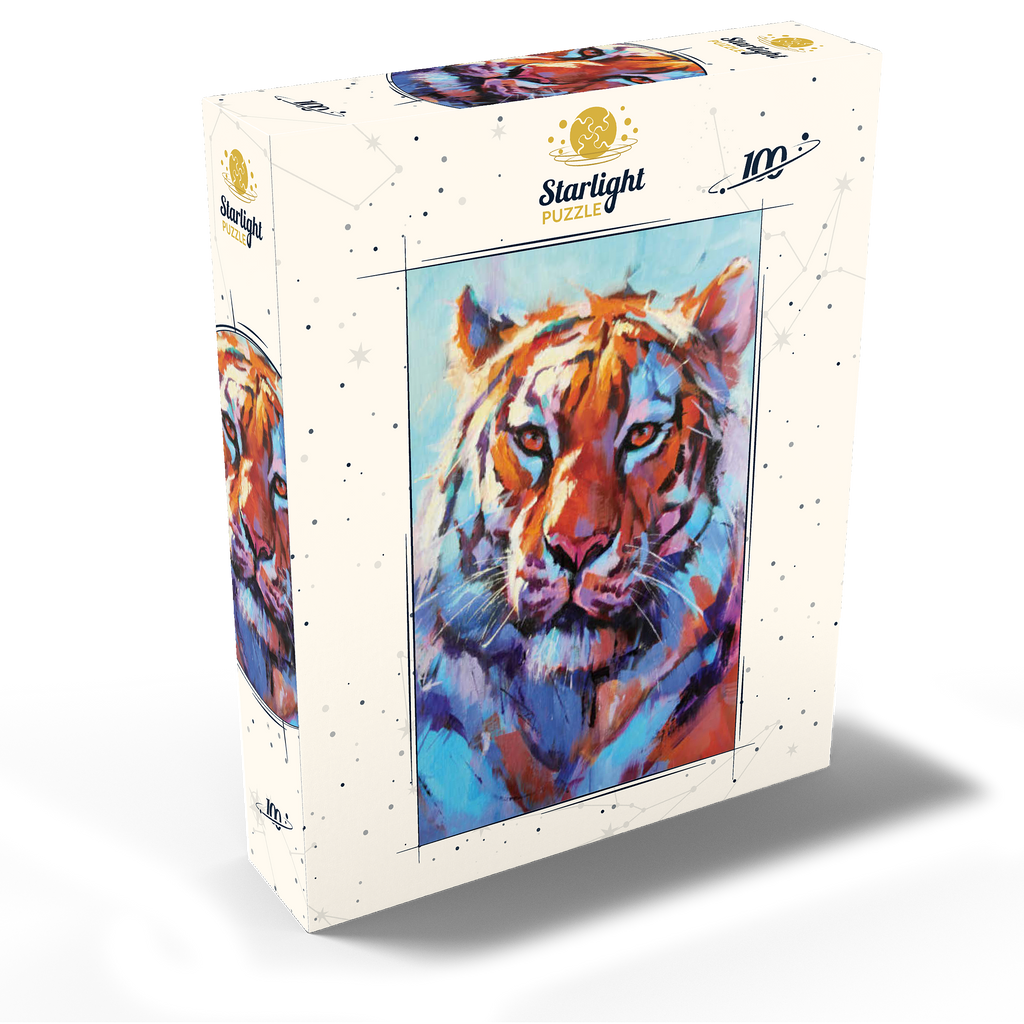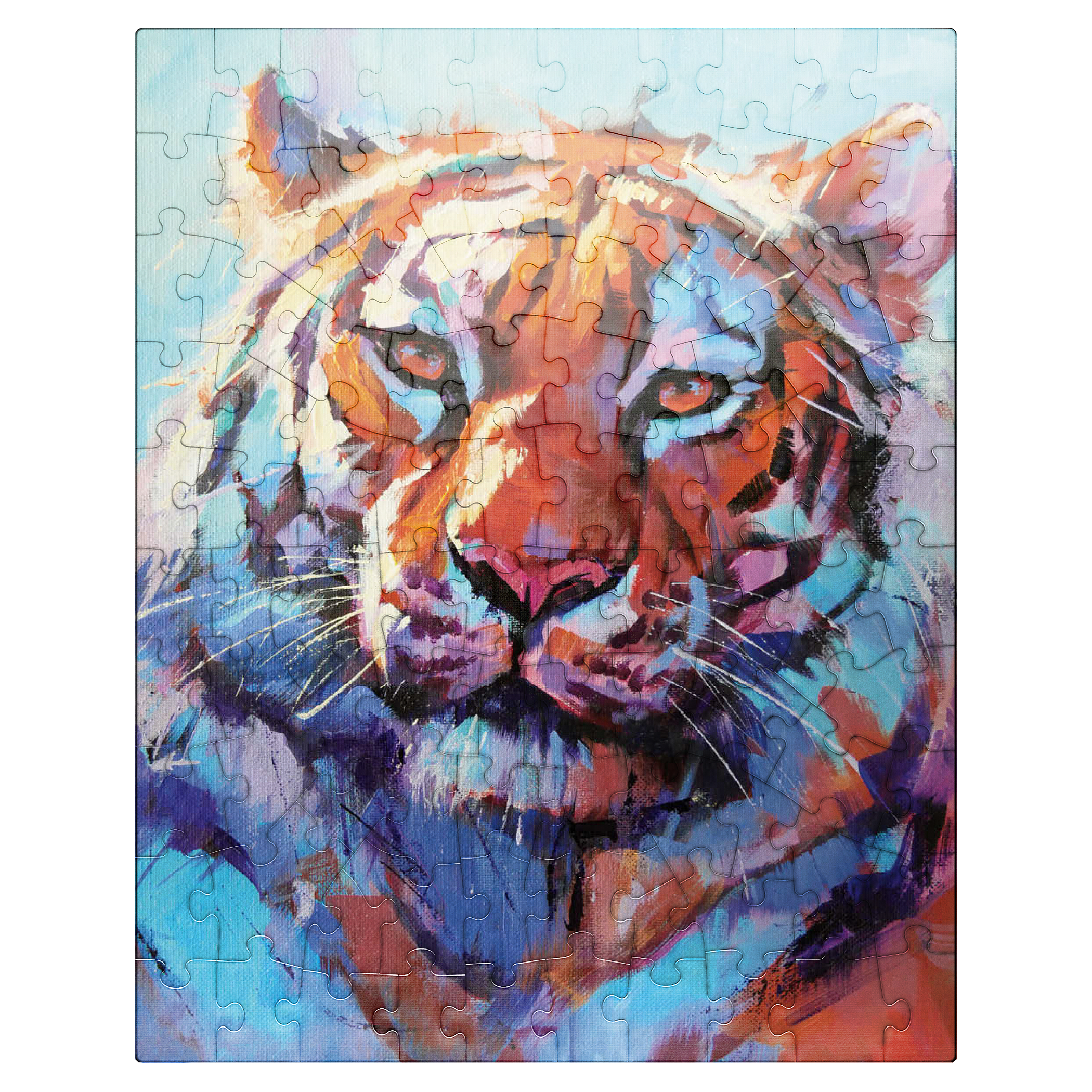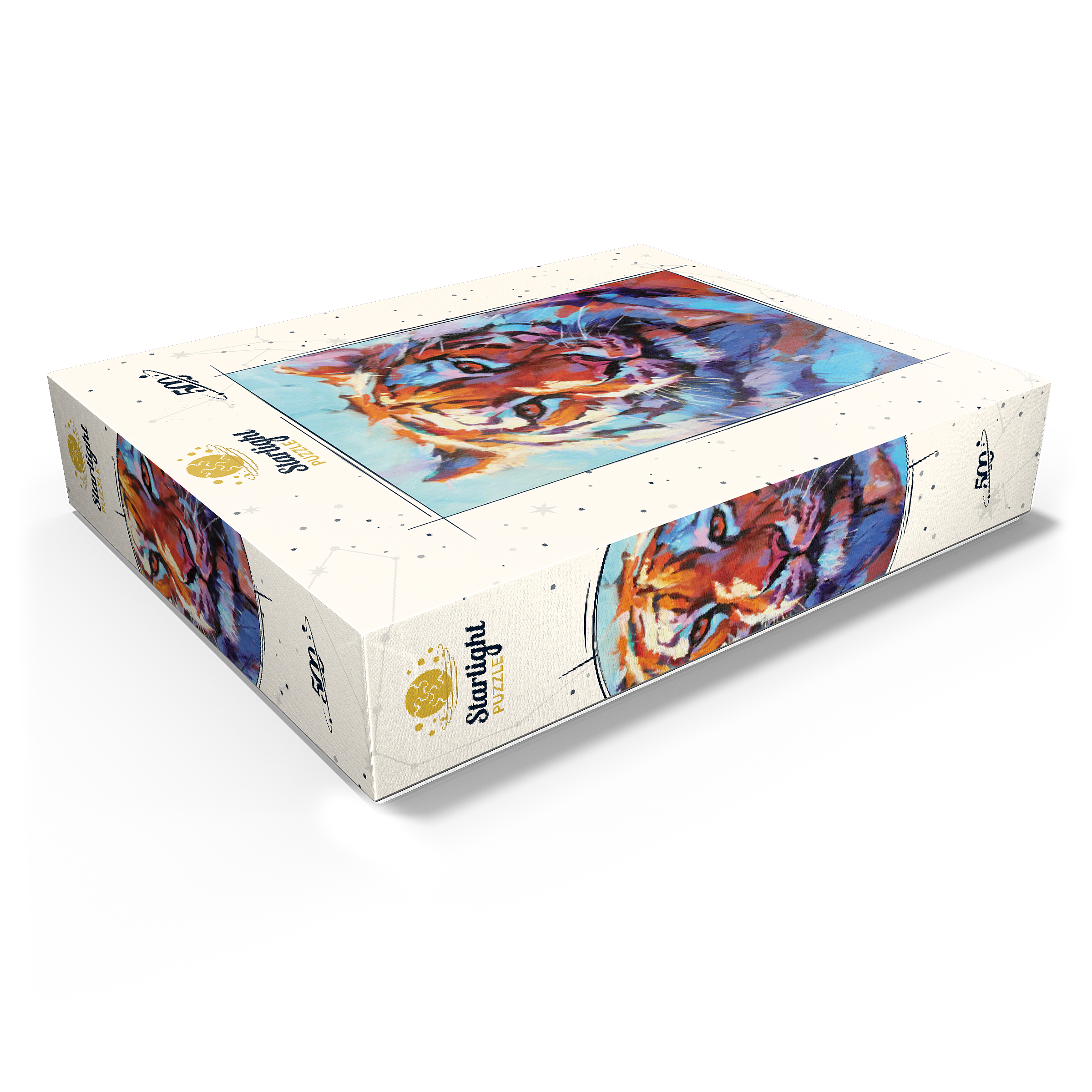 This dynamic expressionist painting captures the raw majesty of a Bengal tiger through bold brushstrokes and an electric color palette. The artwork blends fiery oranges and reds with cool blues and purples, highlighting the tiger's intense gaze and iconic striped coat. The textured composition and abstract background add depth and movement, making the tiger appear both powerful and ethereal. A striking representation of wildlife and strength, perfect for lovers of big cats and contemporary art alike.