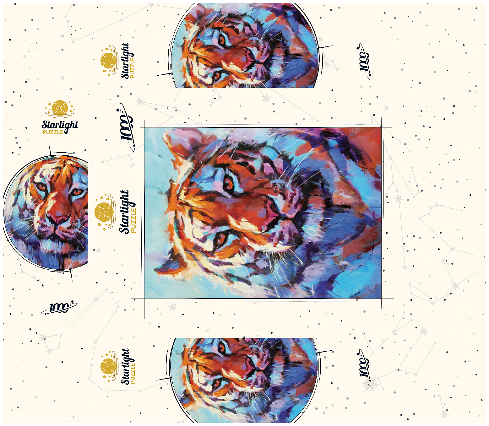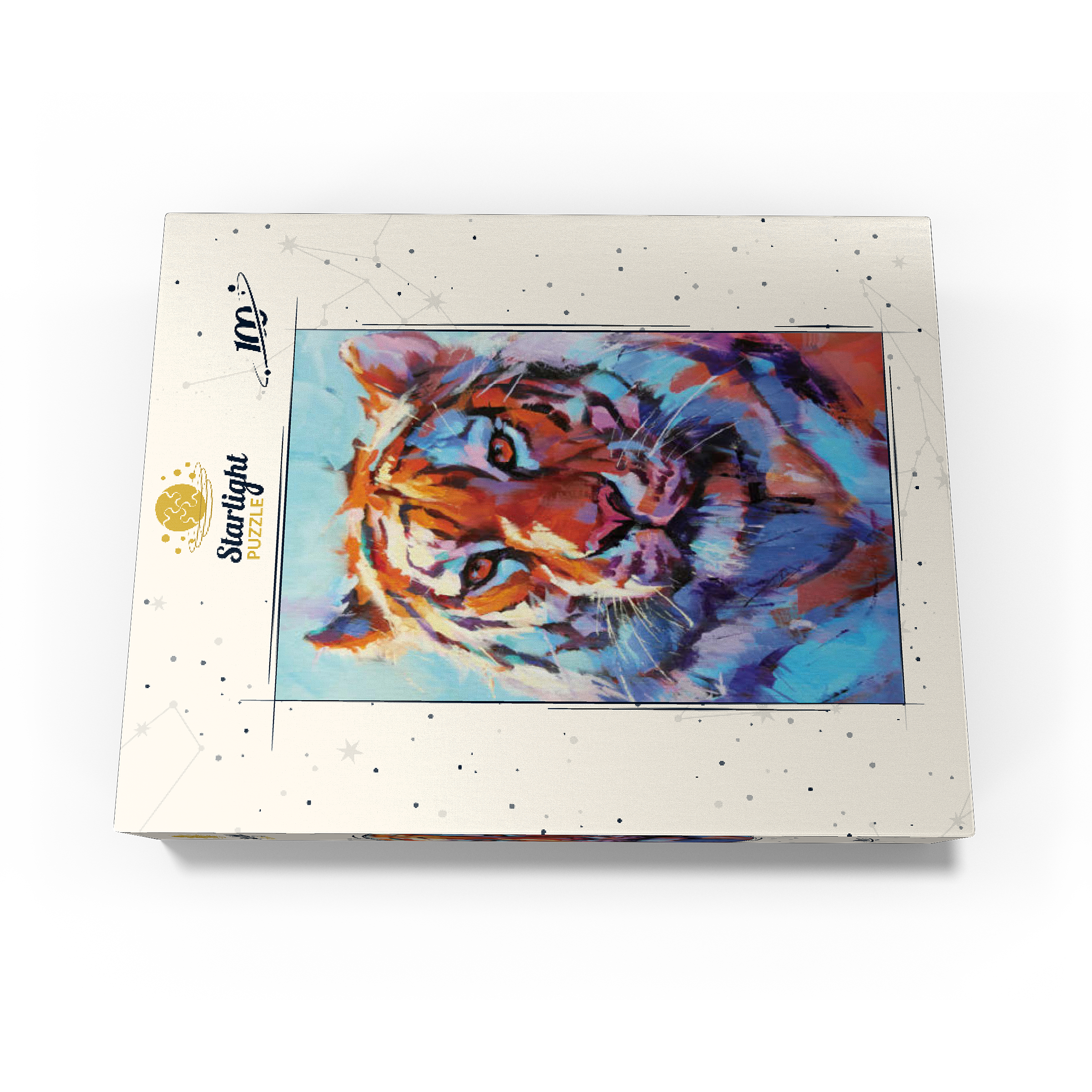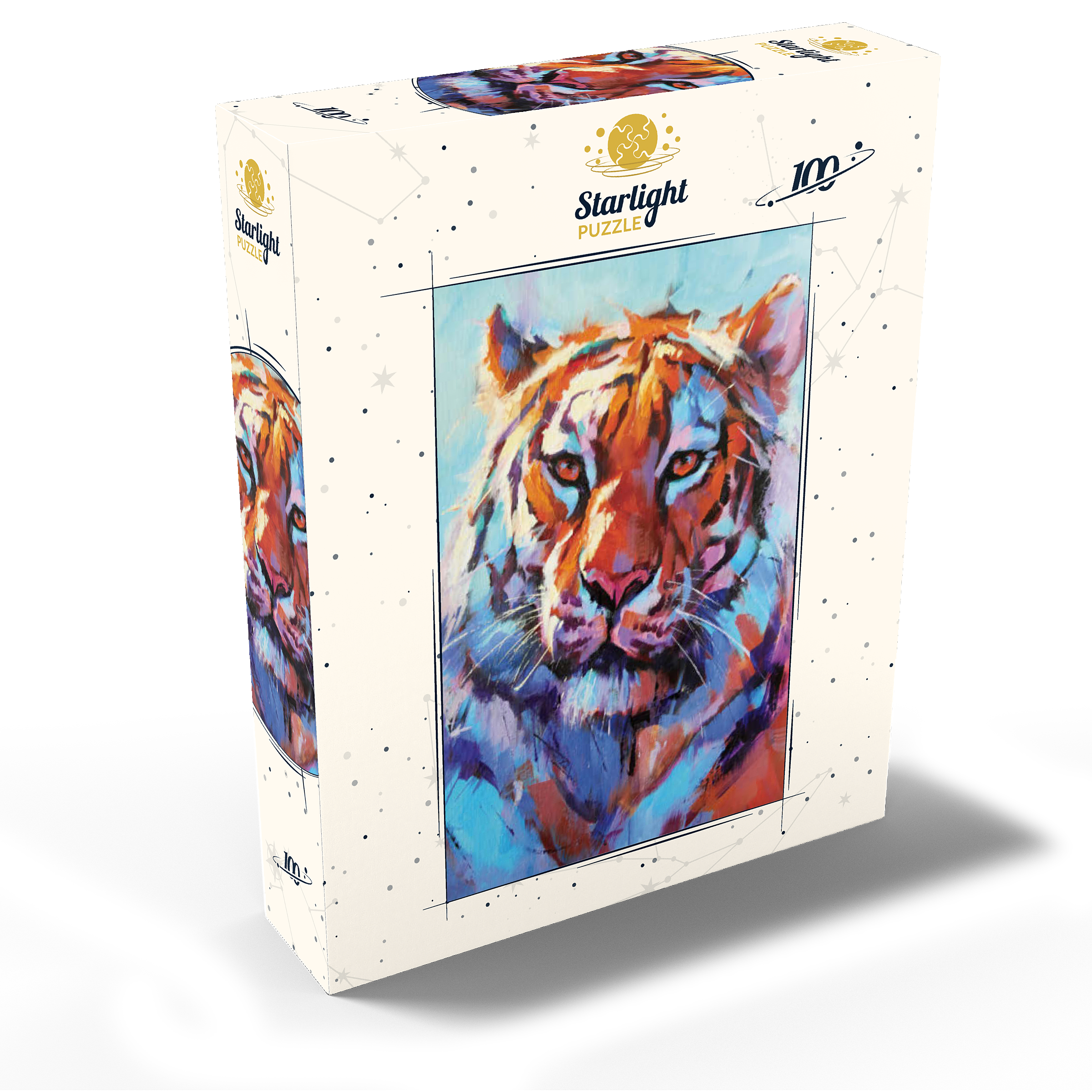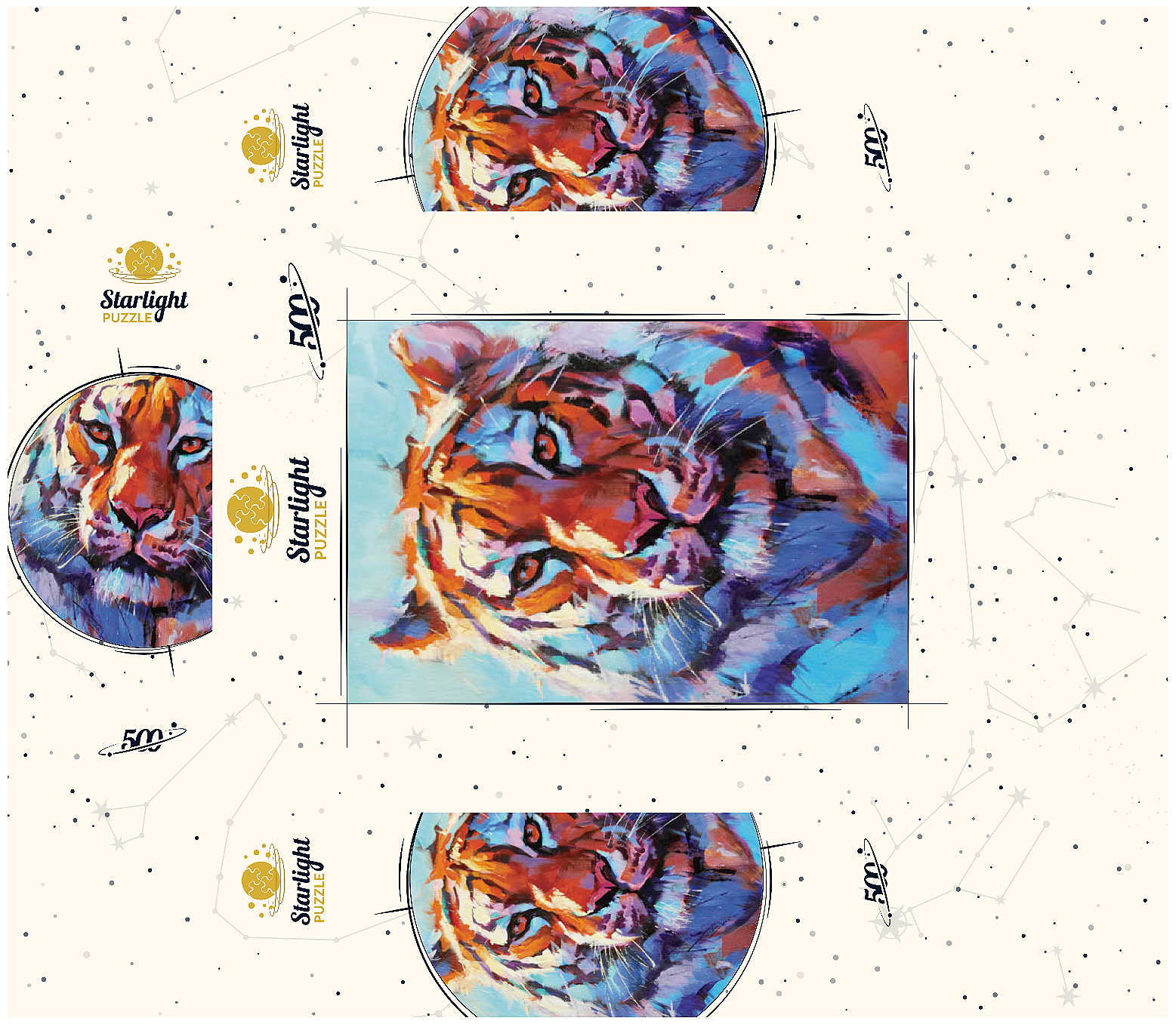 This dynamic expressionist painting captures the raw majesty of a Bengal tiger through bold brushstrokes and an electric color palette. The artwork blends fiery oranges and reds with cool blues and purples, highlighting the tiger's intense gaze and iconic striped coat. The textured composition and abstract background add depth and movement, making the tiger appear both powerful and ethereal. A striking representation of wildlife and strength, perfect for lovers of big cats and contemporary art alike.