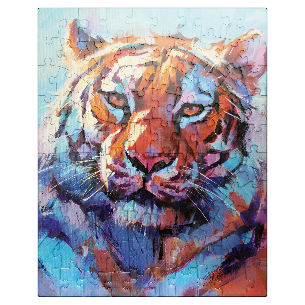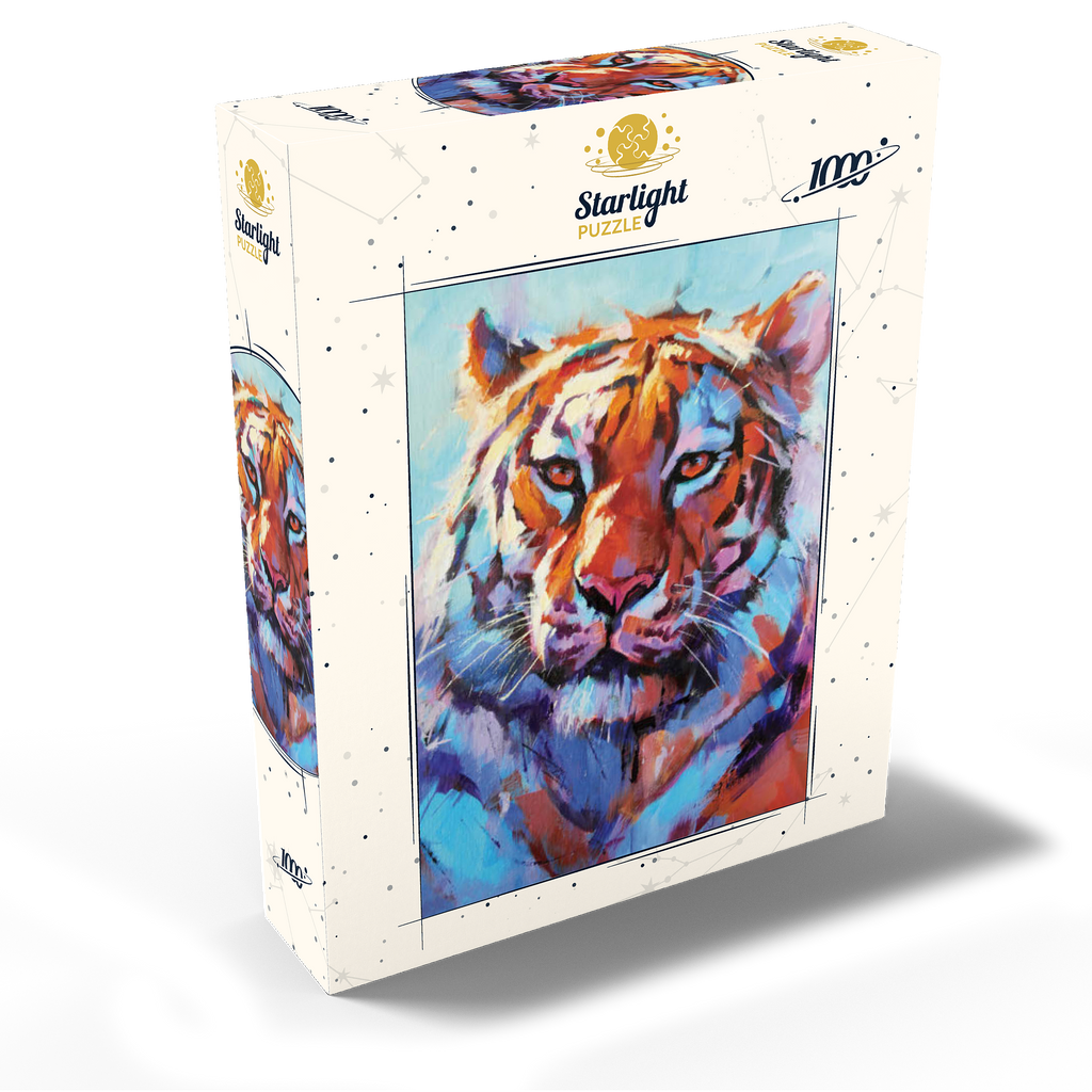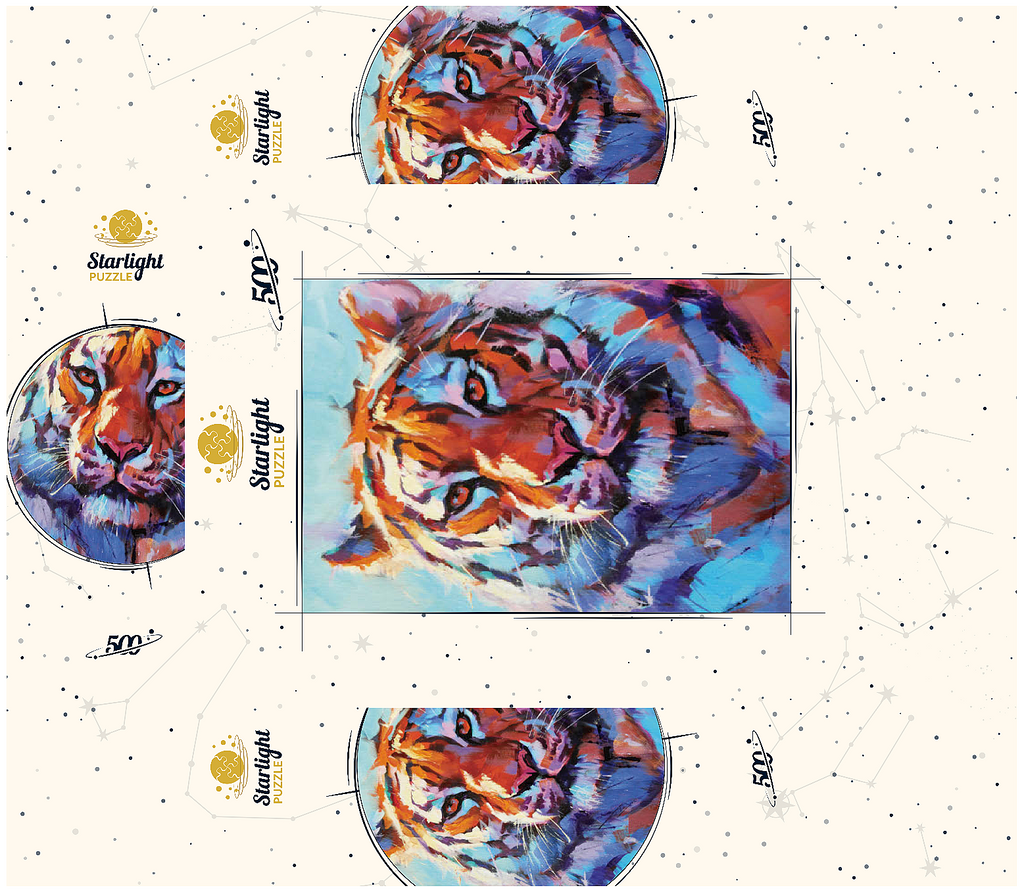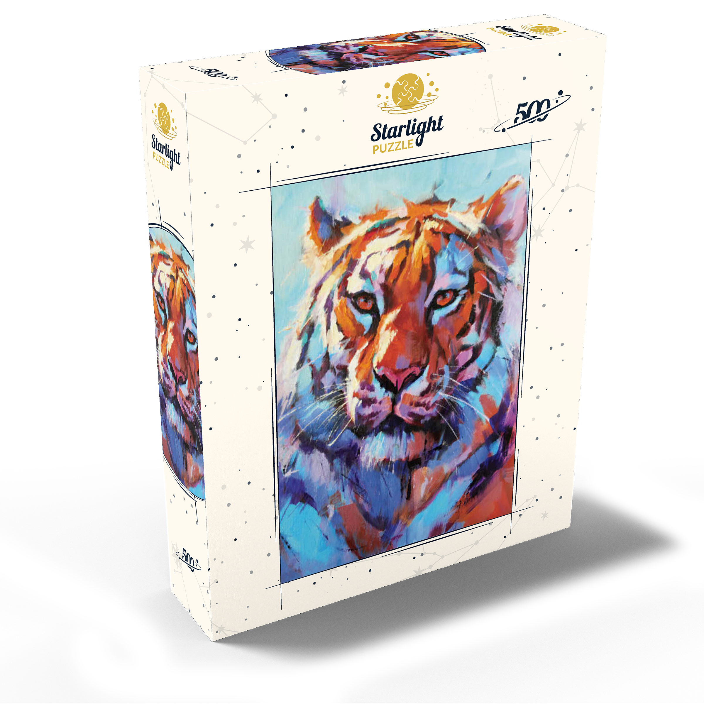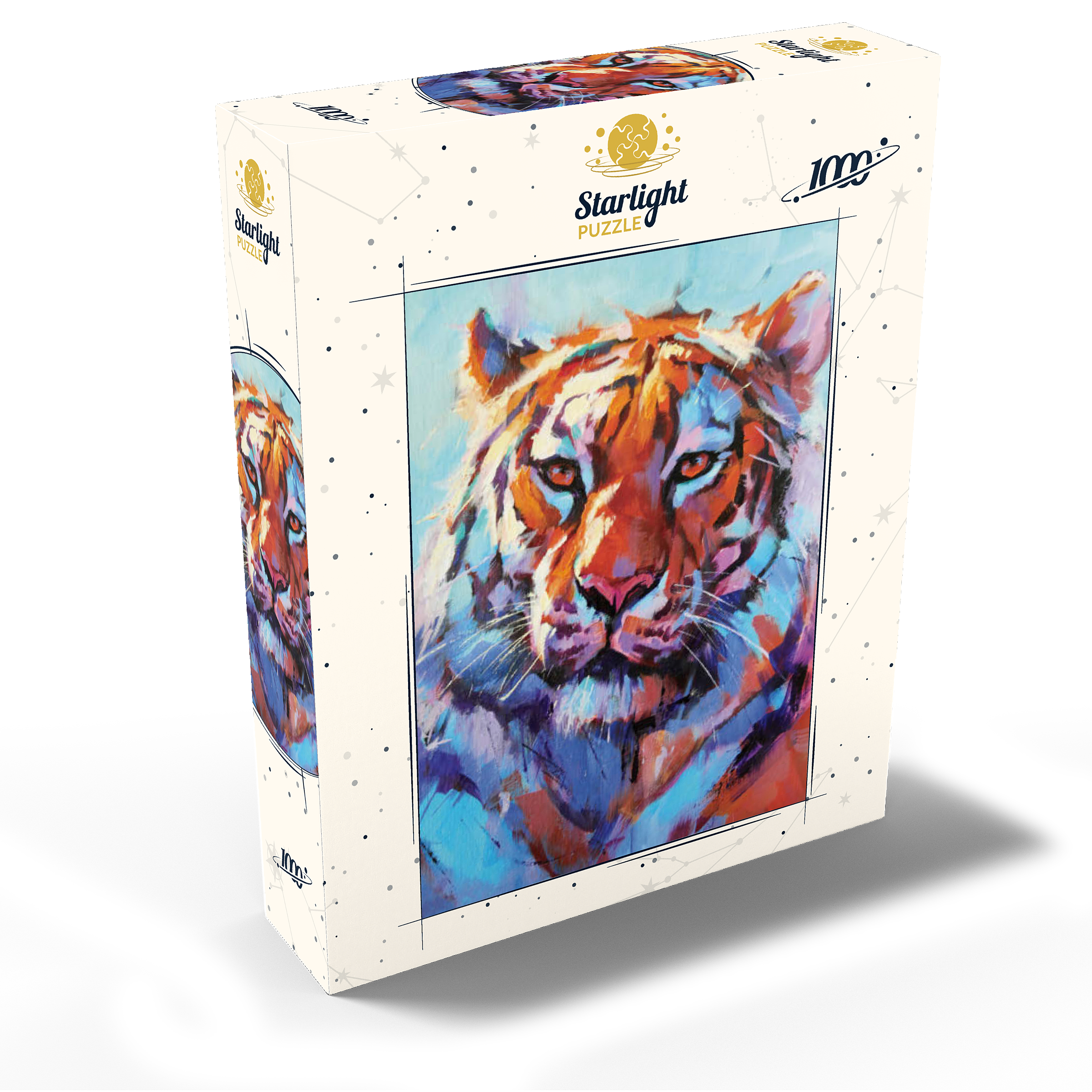 This dynamic expressionist painting captures the raw majesty of a Bengal tiger through bold brushstrokes and an electric color palette. The artwork blends fiery oranges and reds with cool blues and purples, highlighting the tiger's intense gaze and iconic striped coat. The textured composition and abstract background add depth and movement, making the tiger appear both powerful and ethereal. A striking representation of wildlife and strength, perfect for lovers of big cats and contemporary art alike.