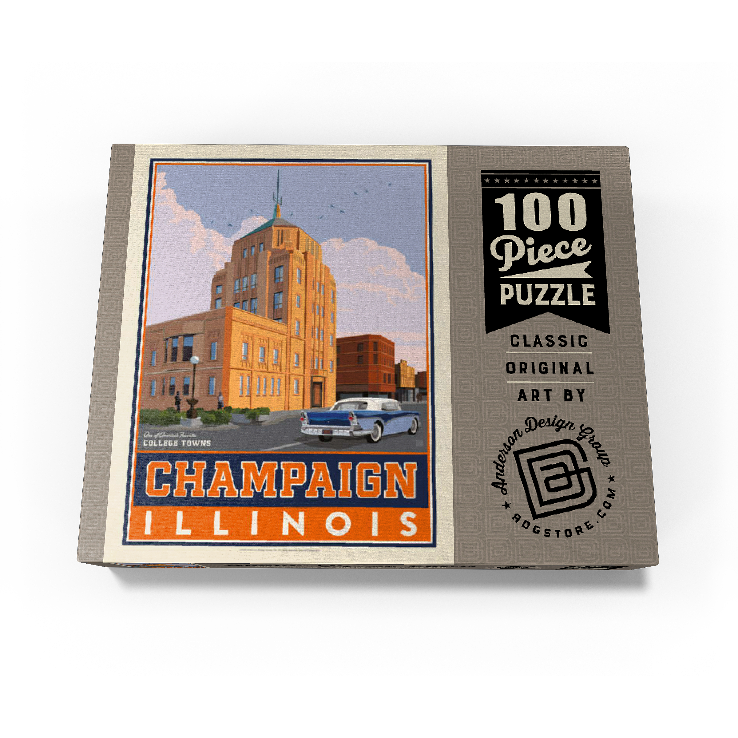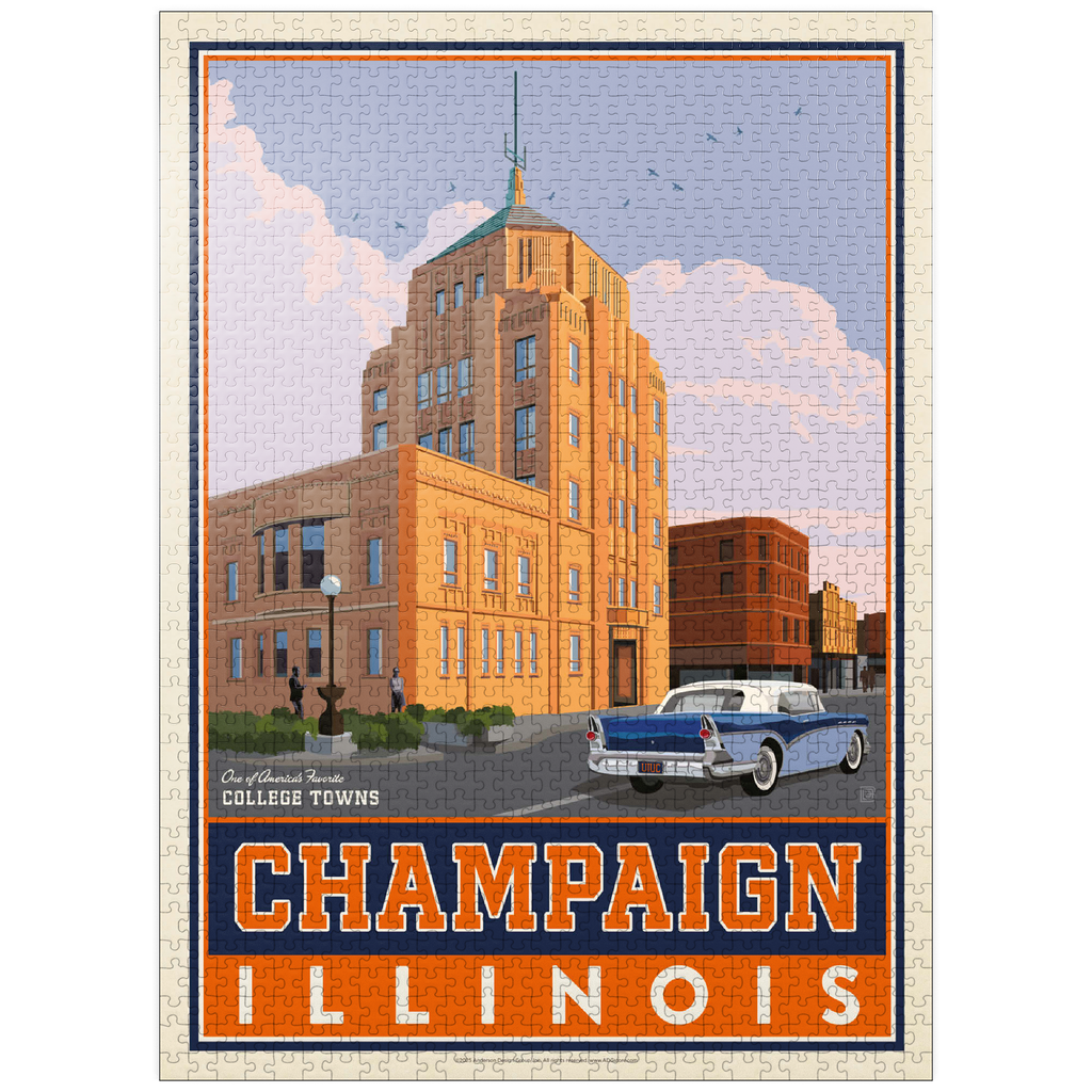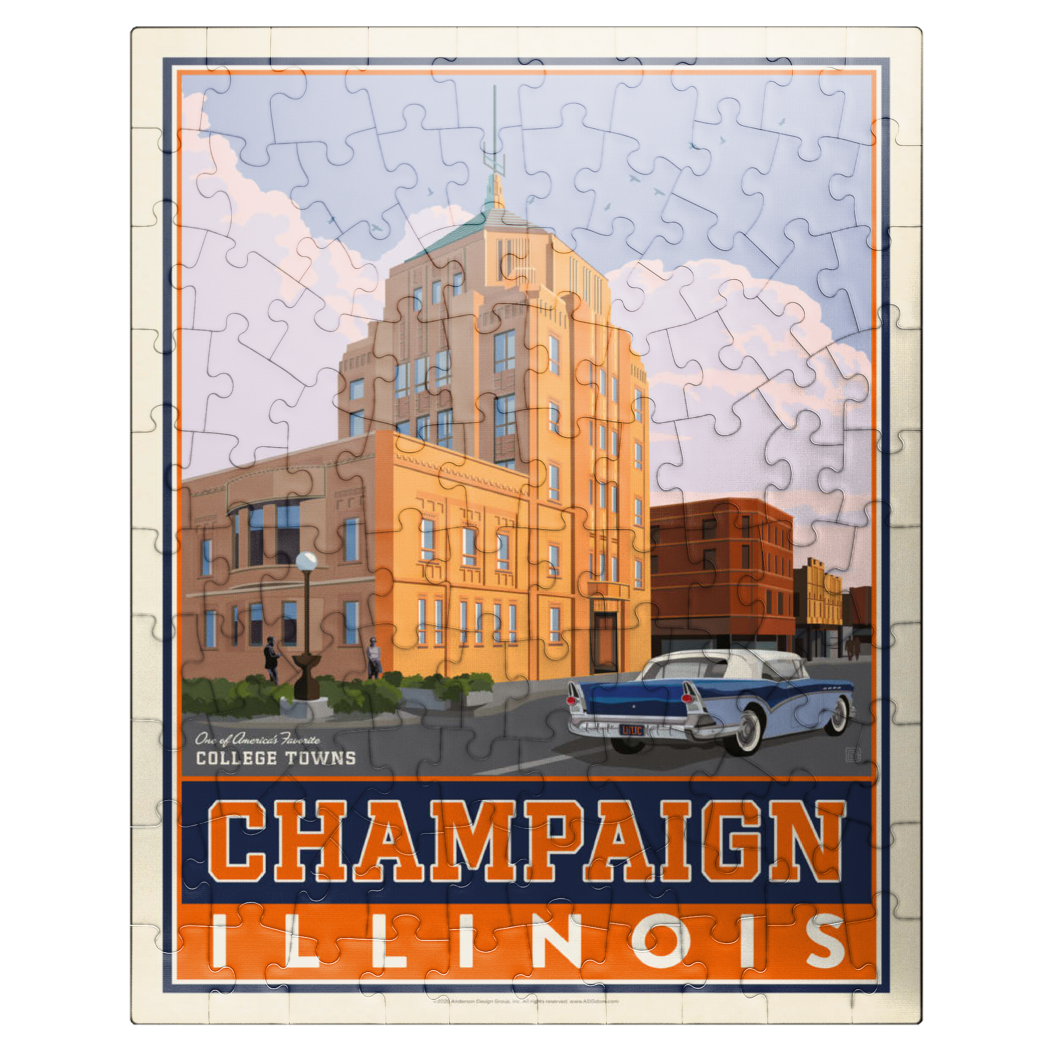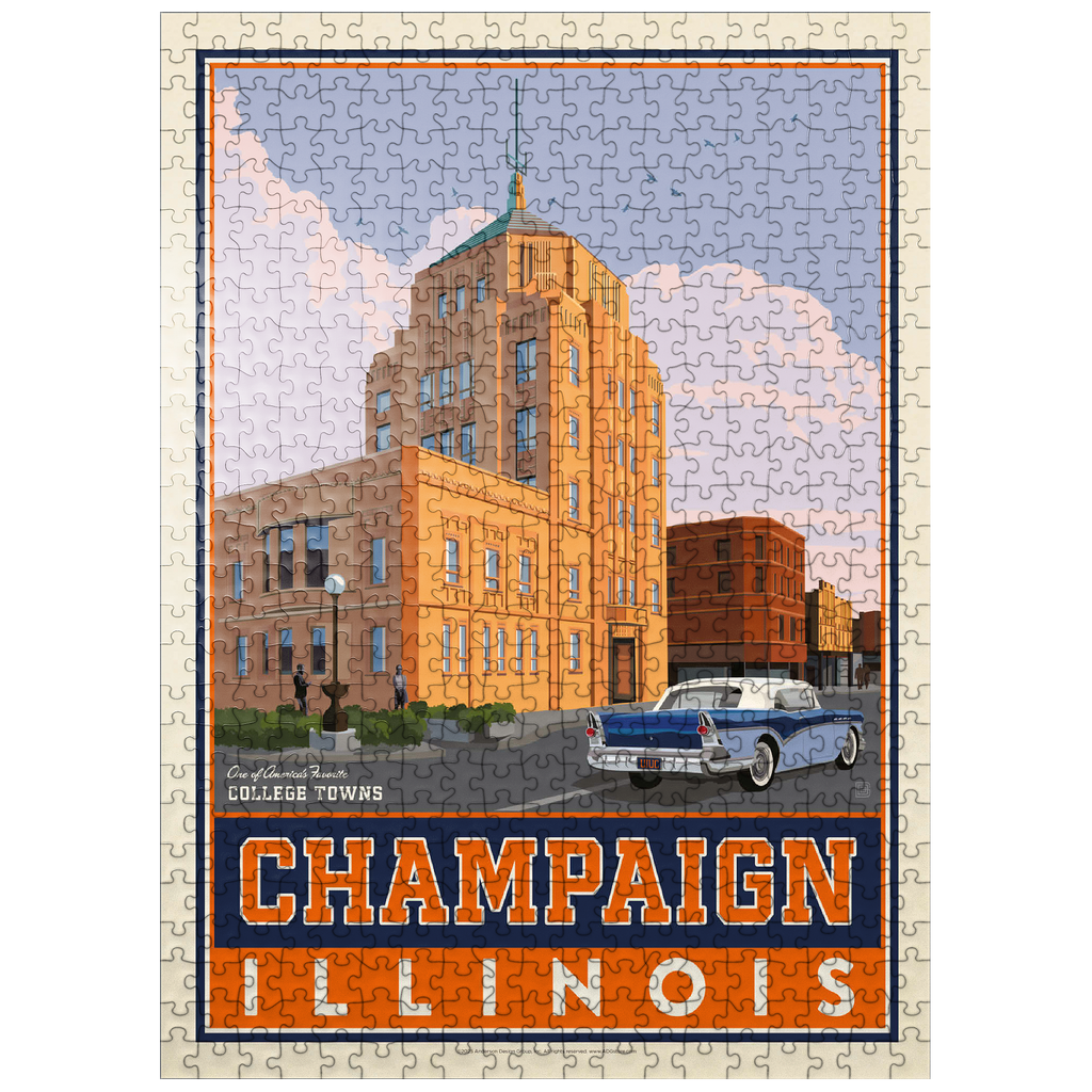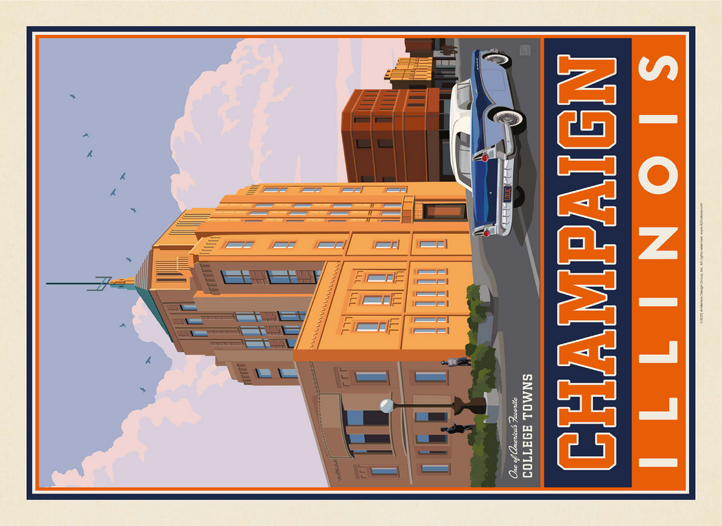 Champaign, Illinois is depicted in a vibrant city scene showcasing its distinctive Art Deco architecture under a clear Midwestern sky. The warm tones of the historic downtown building contrast beautifully with the soft pastel clouds above, while a classic vintage car adds a nostalgic touch to the streetscape. This depiction highlights Champaign's charm as one of America's favorite college towns, known for its blend of academic energy, historic design, and modern culture. The artwork captures the spirit of the city's urban core, reflecting both its architectural heritage and lively community atmosphere.